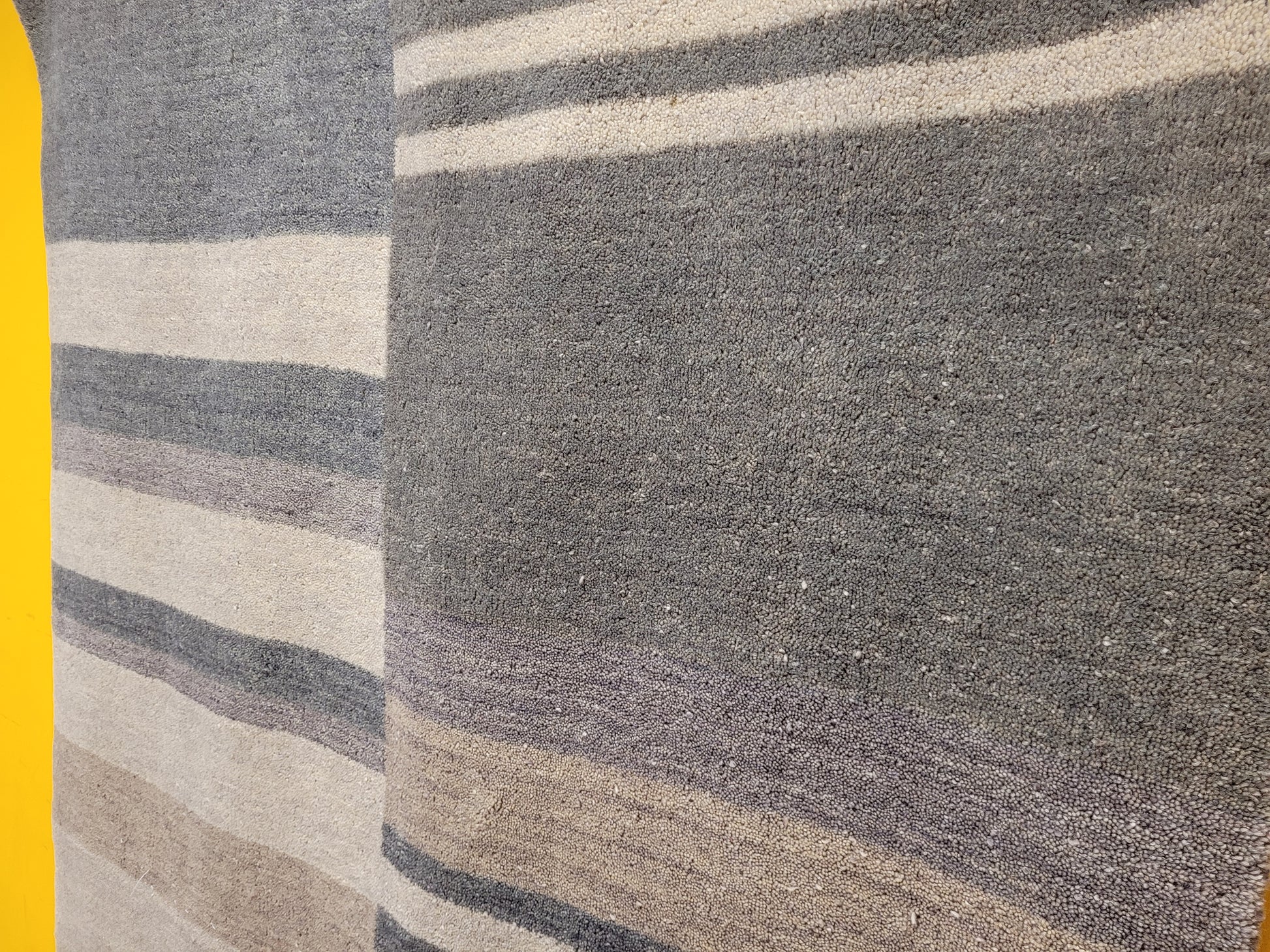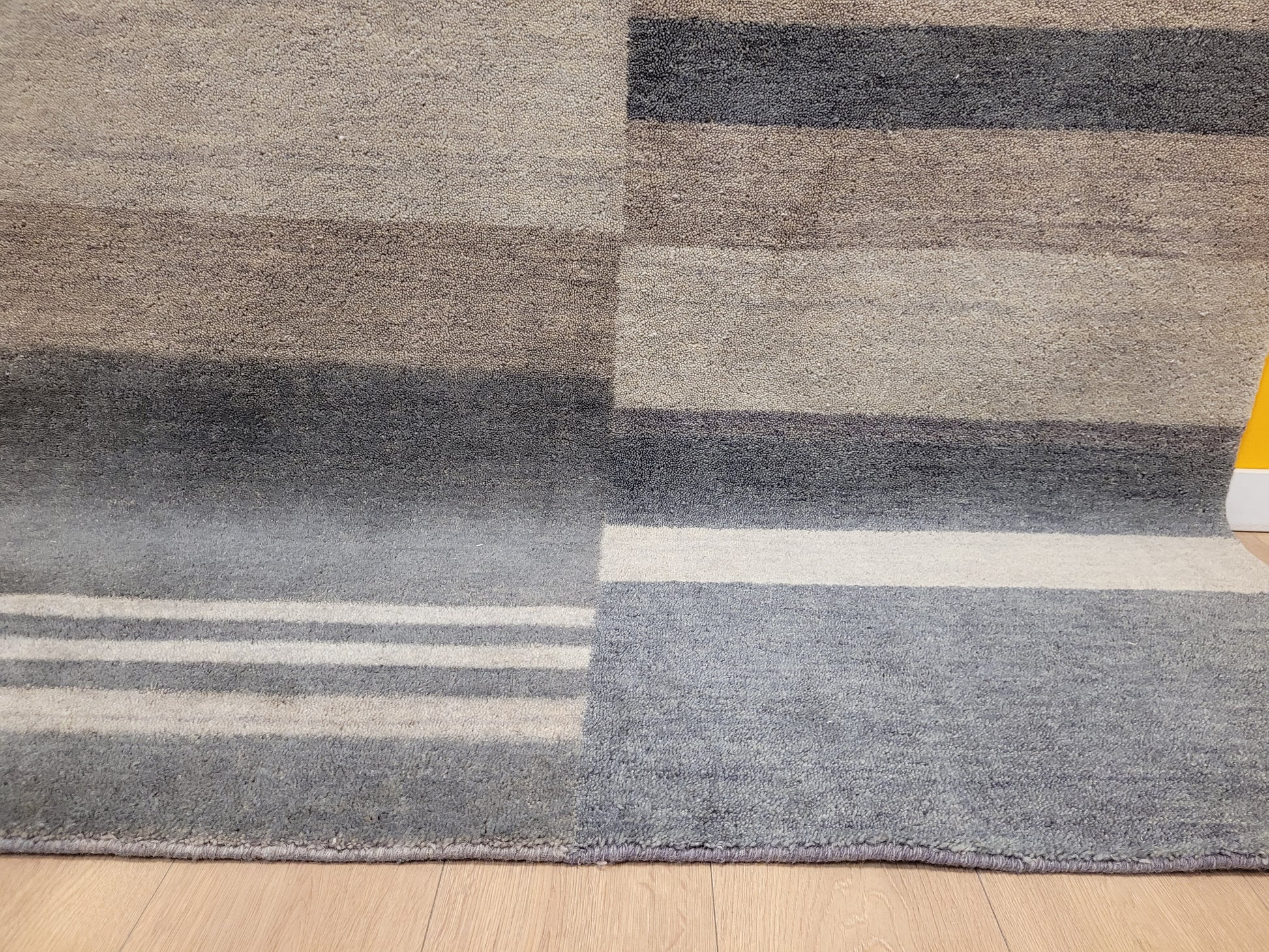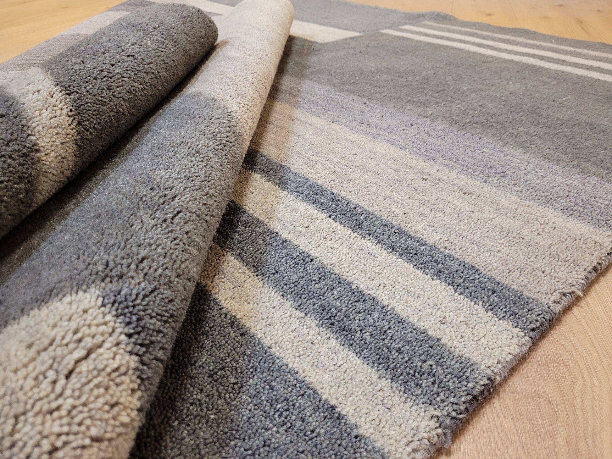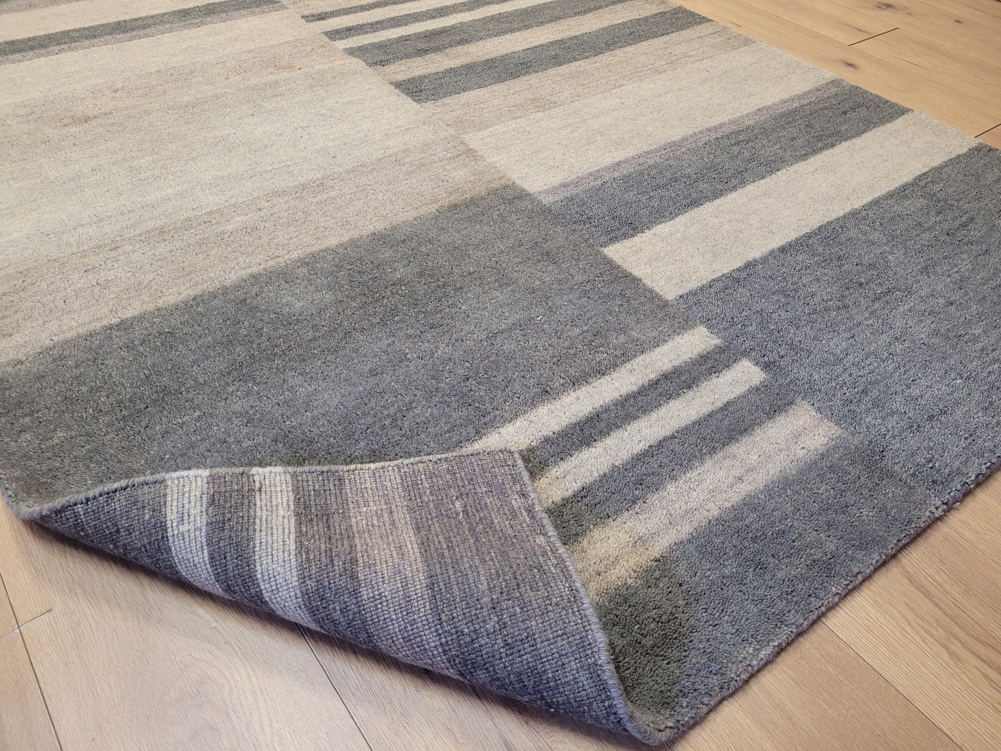 angeboten wird ein stilvoller Gabbeh Teppich aus reiner Schurwolle. Das moderne Design besticht durch eine Kombination aus breiten und schmalen Streifen in harmonischen Grau- und Beigetönen, die dem Teppich eine ruhige und zugleich zeitgemäße Ausstrahlung verleihen.