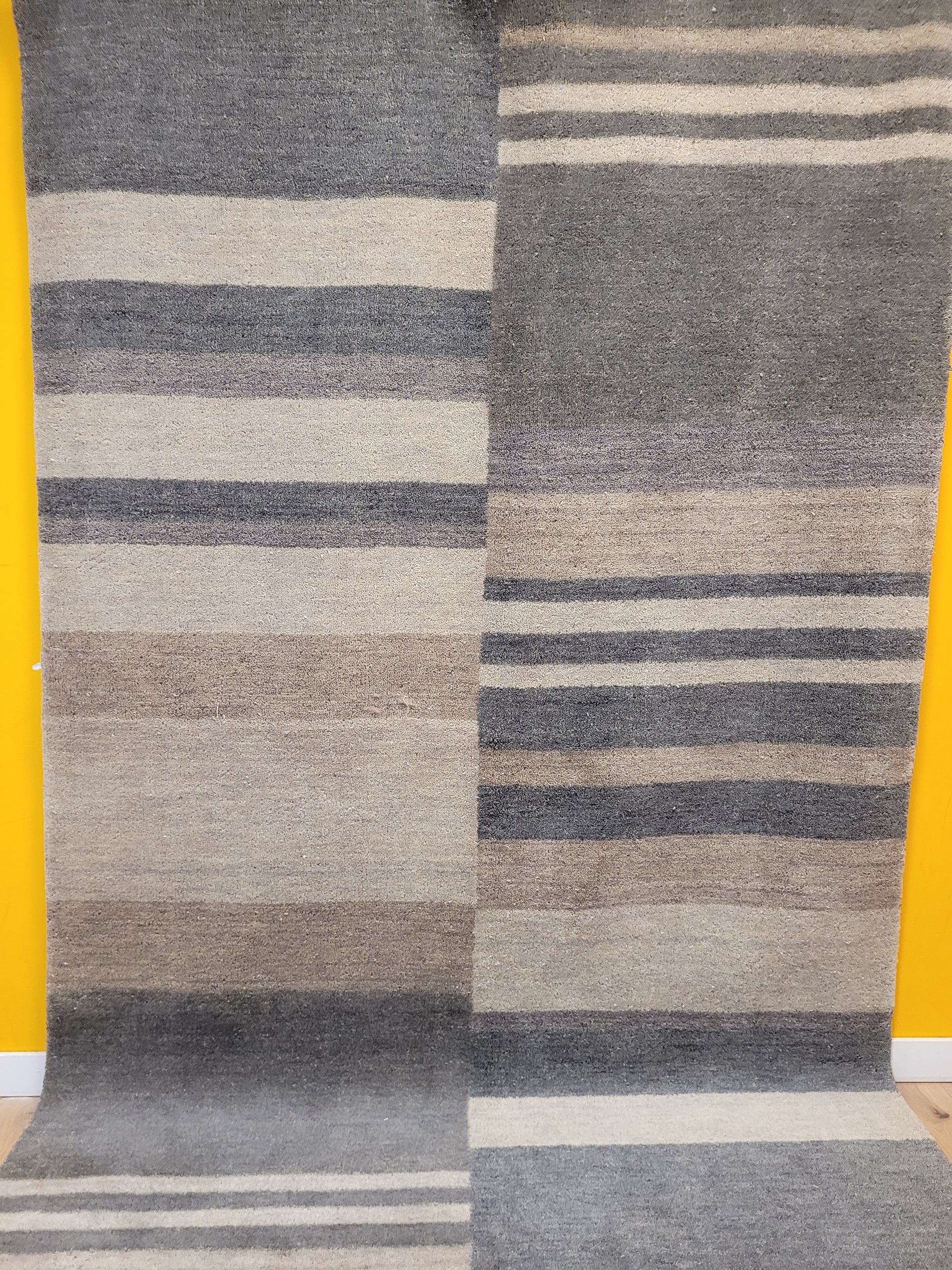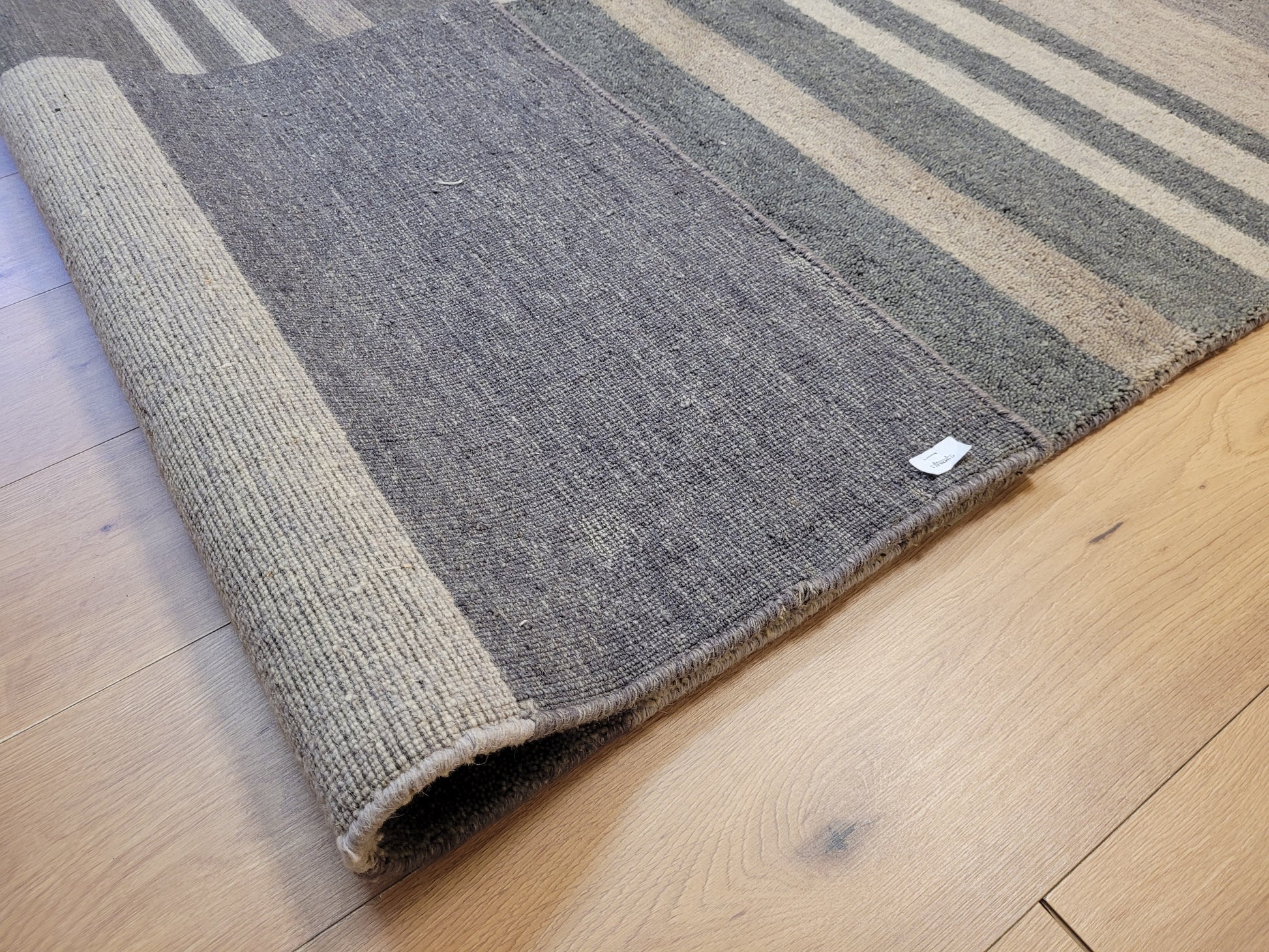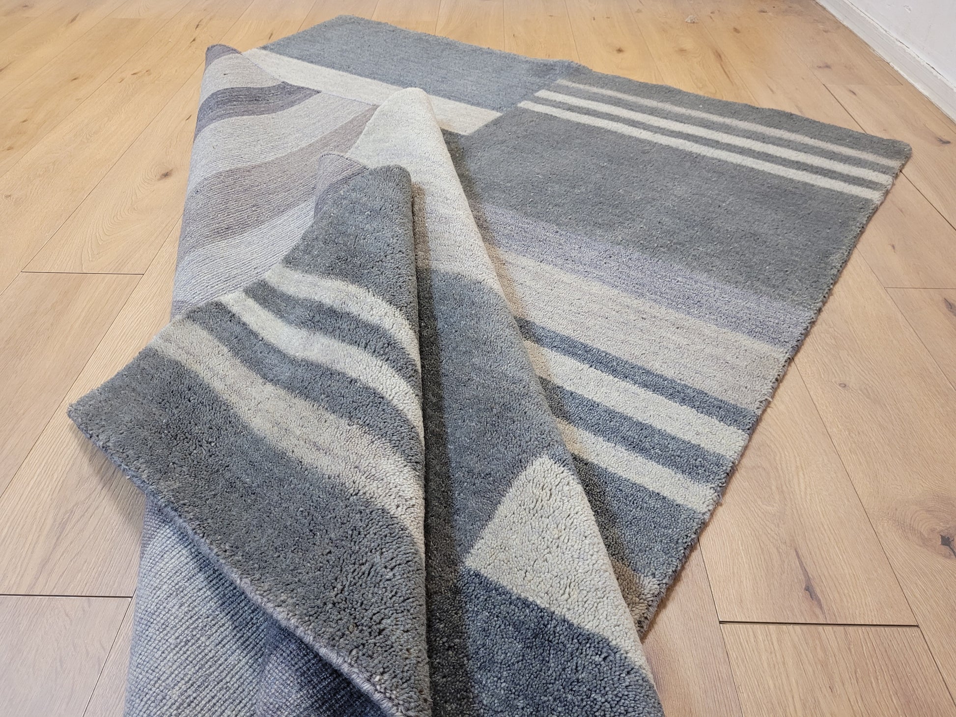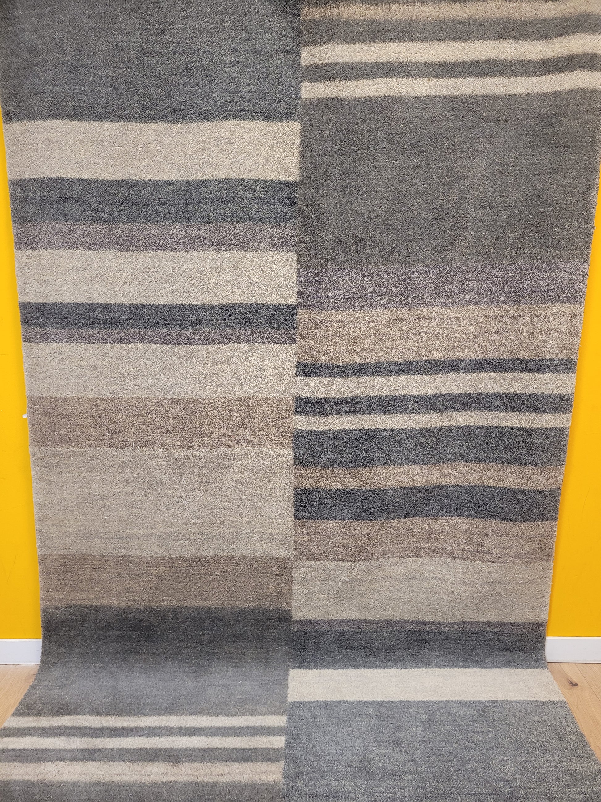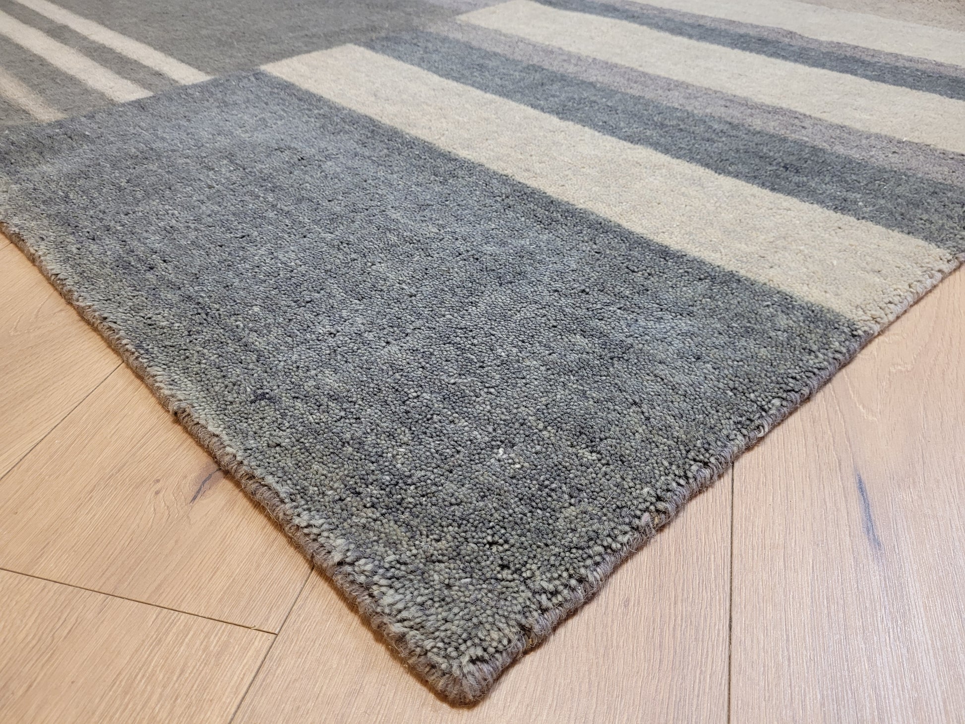 angeboten wird ein stilvoller Gabbeh Teppich aus reiner Schurwolle. Das moderne Design besticht durch eine Kombination aus breiten und schmalen Streifen in harmonischen Grau- und Beigetönen, die dem Teppich eine ruhige und zugleich zeitgemäße Ausstrahlung verleihen.