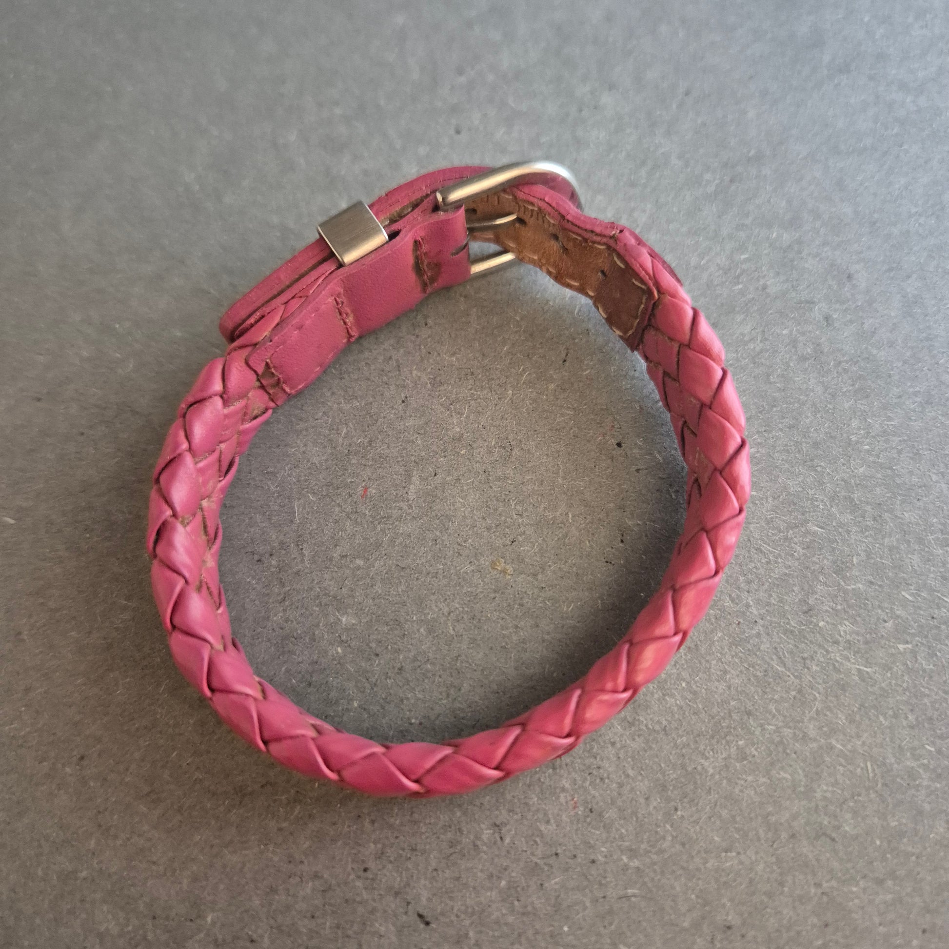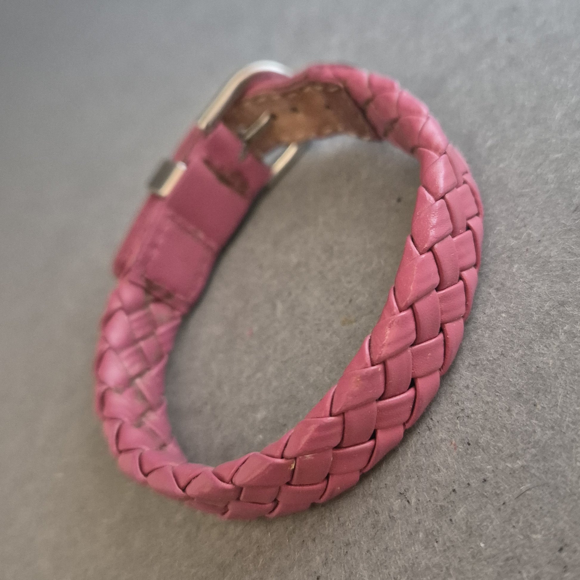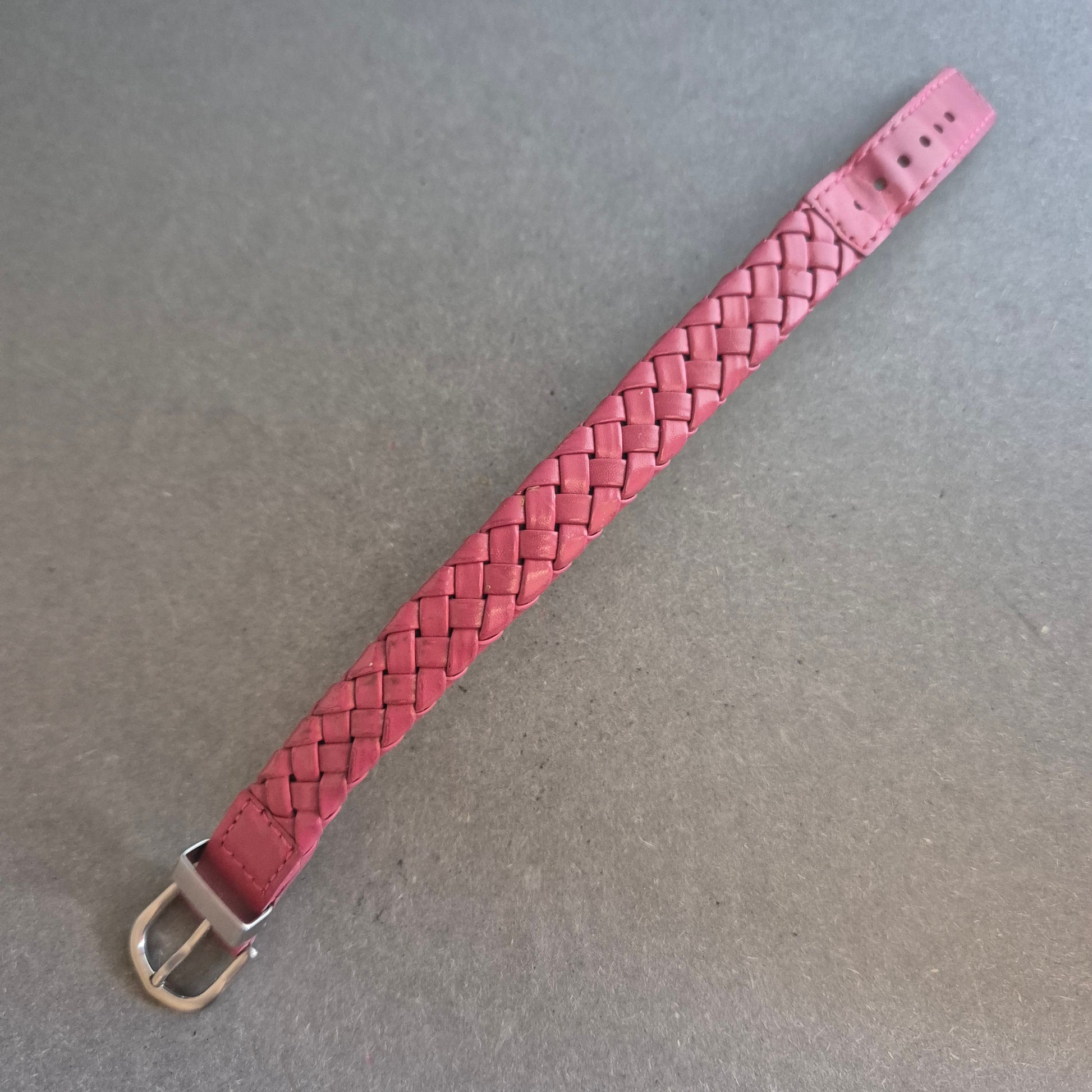 Dieses geflochtene Armband aus pinkfarbenem Leder setzt modische Akzente mit einem Hauch von Retro-Charme. Der klassische Dornverschluss ermöglicht individuelle Anpassung an das Handgelenk und sorgt für sicheren Halt. Perfekt geeignet für einen lässigen Alltagslook oder als farbenfroher Kontrast zu minimalistischen Outfits.