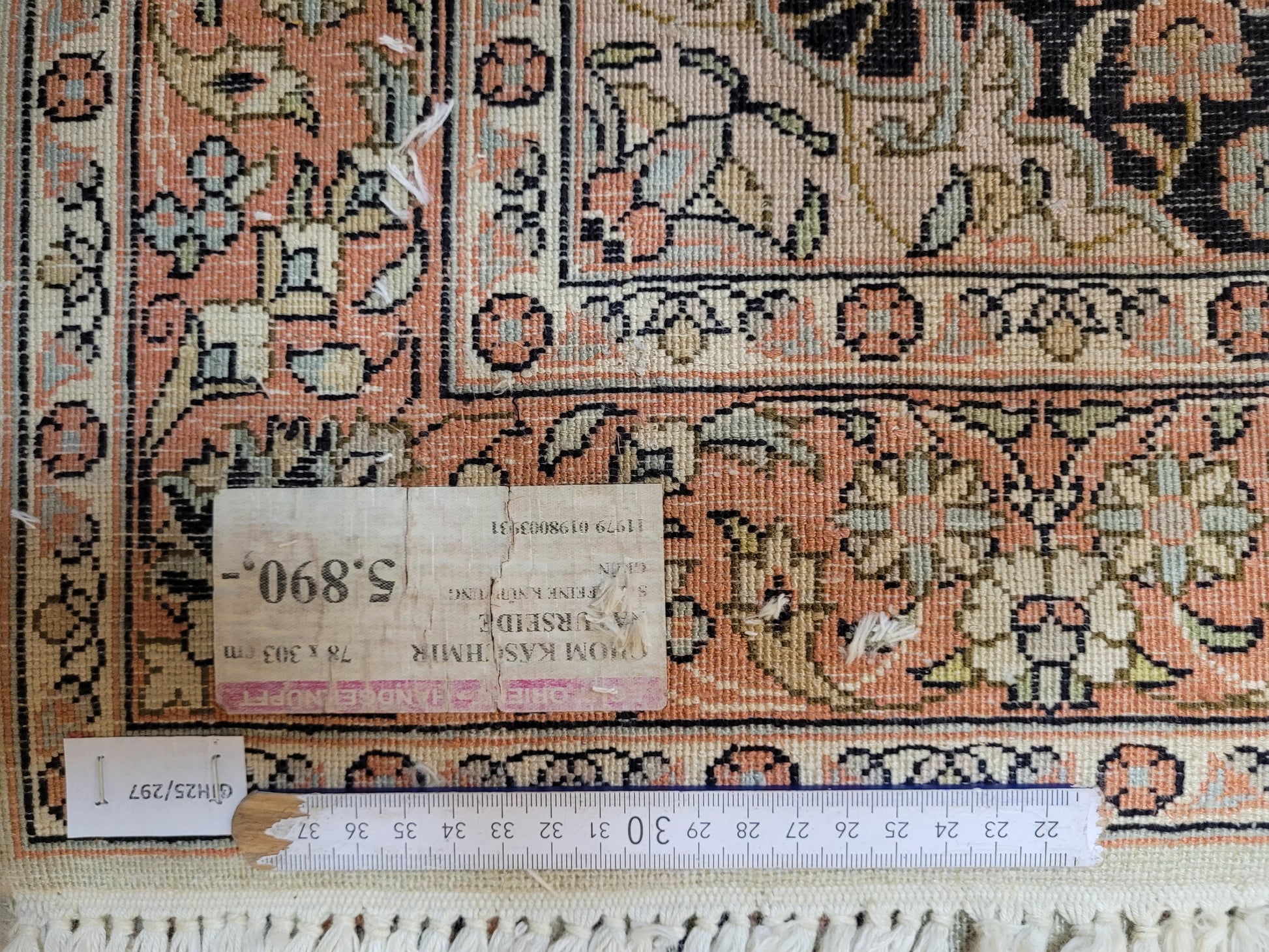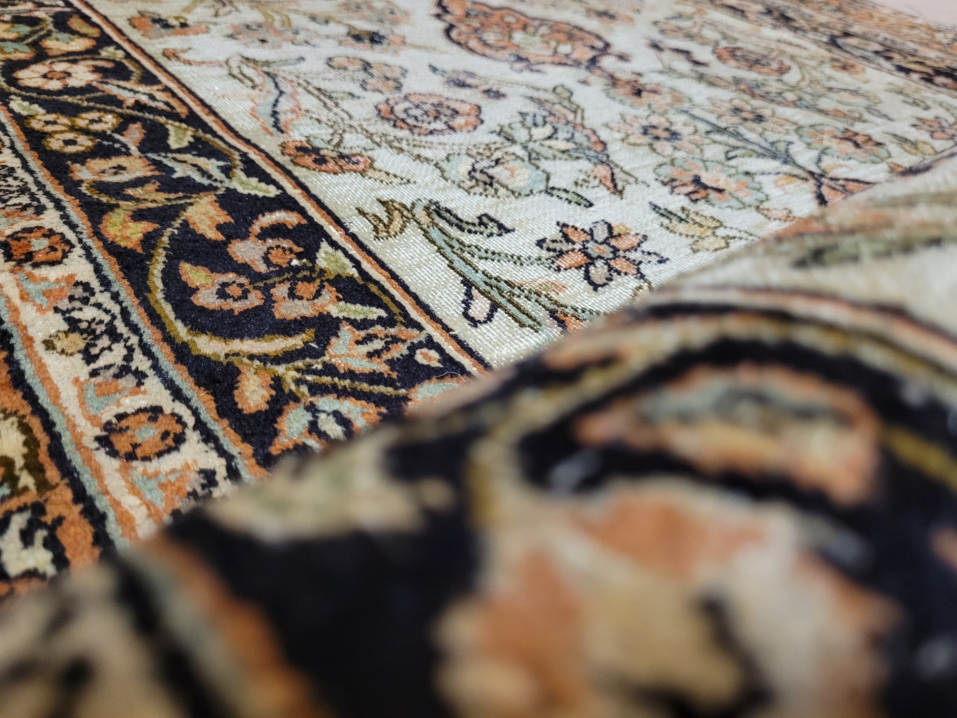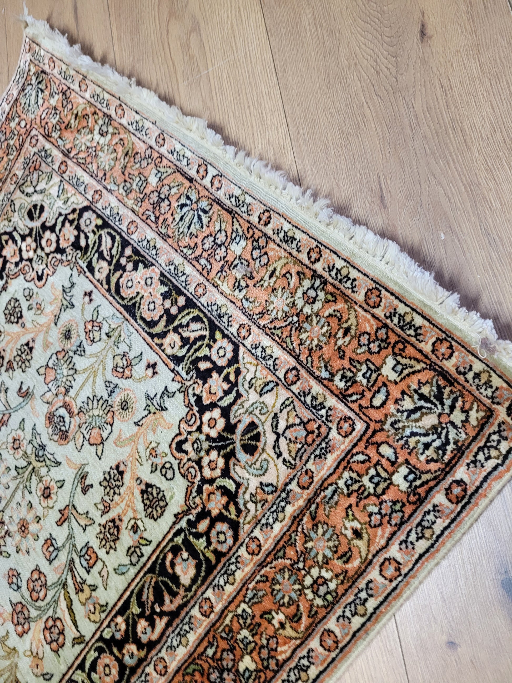 angeboten wird ein klassischer Ghom Läufer aus feiner Seide auf Baumwolle, handgeknüpft in detailreicher Ausführung. Das elegante Mittelfeld zeigt ein zentrales Medaillon, umgeben von zarten Ranken und stilisierten Blütenmotiven. Die warme Farbkomposition aus Apricot, Creme, Schwarz und hellem Grün verleiht dem Teppich eine edle und zugleich harmonische Ausstrahlung.
