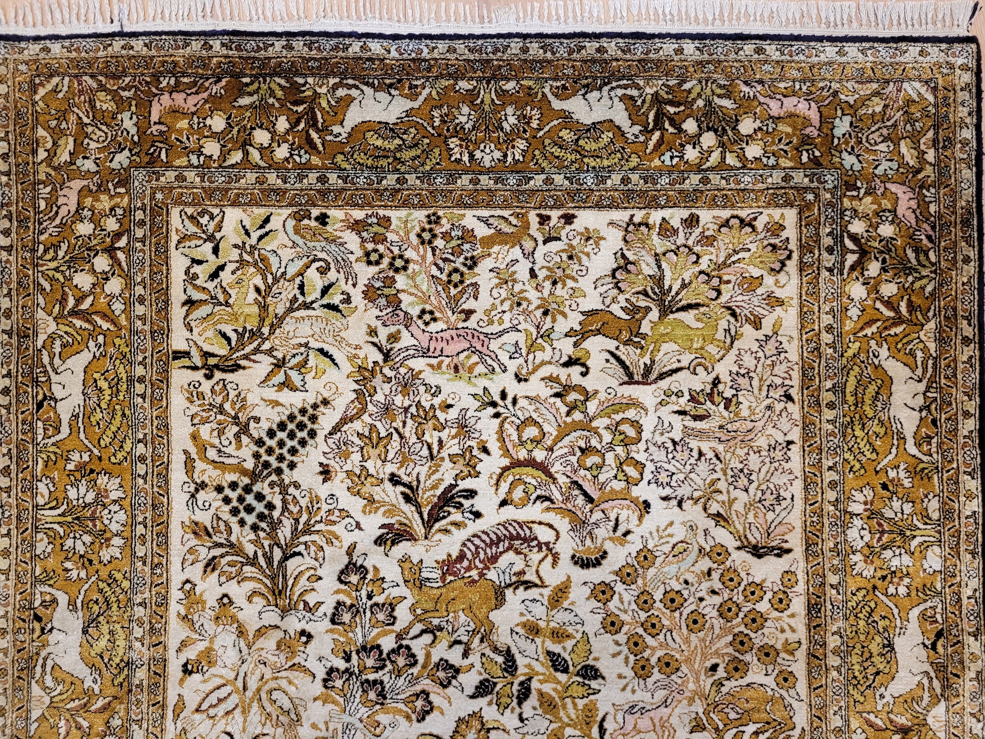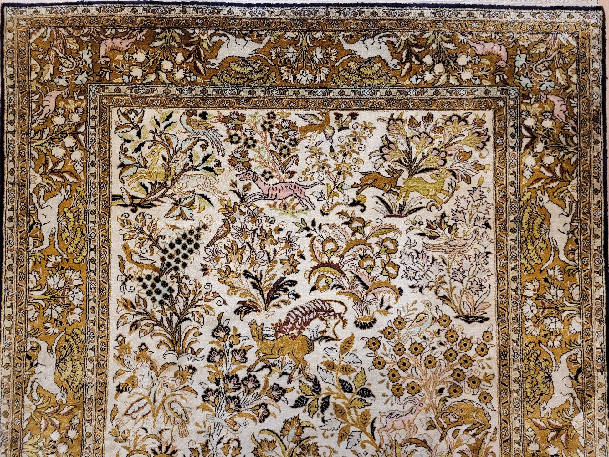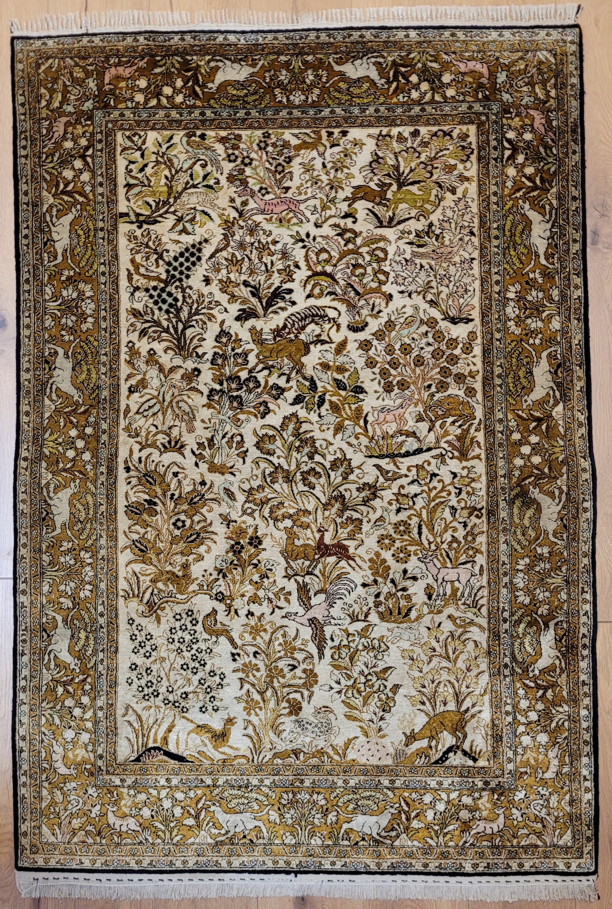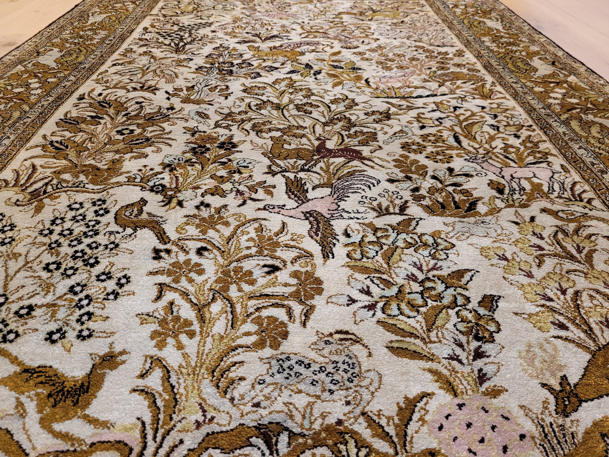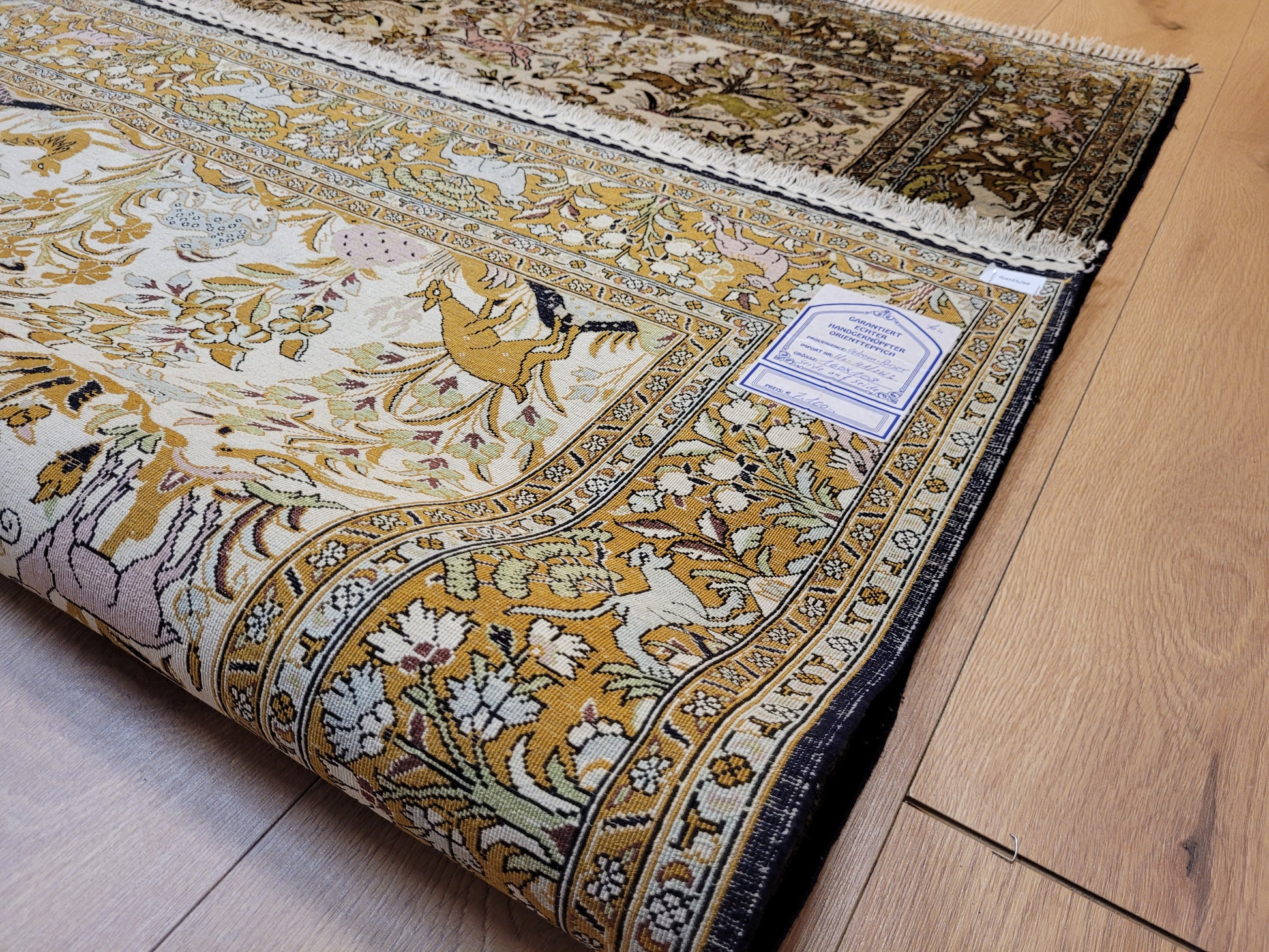 angeboten wird ein edler Ghom Teppich aus reiner Seide auf Seide, handgeknüpft in besonders feiner Ausführung. Das detailreiche Motiv zeigt einen Paradiesgarten mit üppiger Blütenfülle, Vögeln, Rehen und weiteren Tieren, kunstvoll eingebettet in ein harmonisches florales Arrangement.