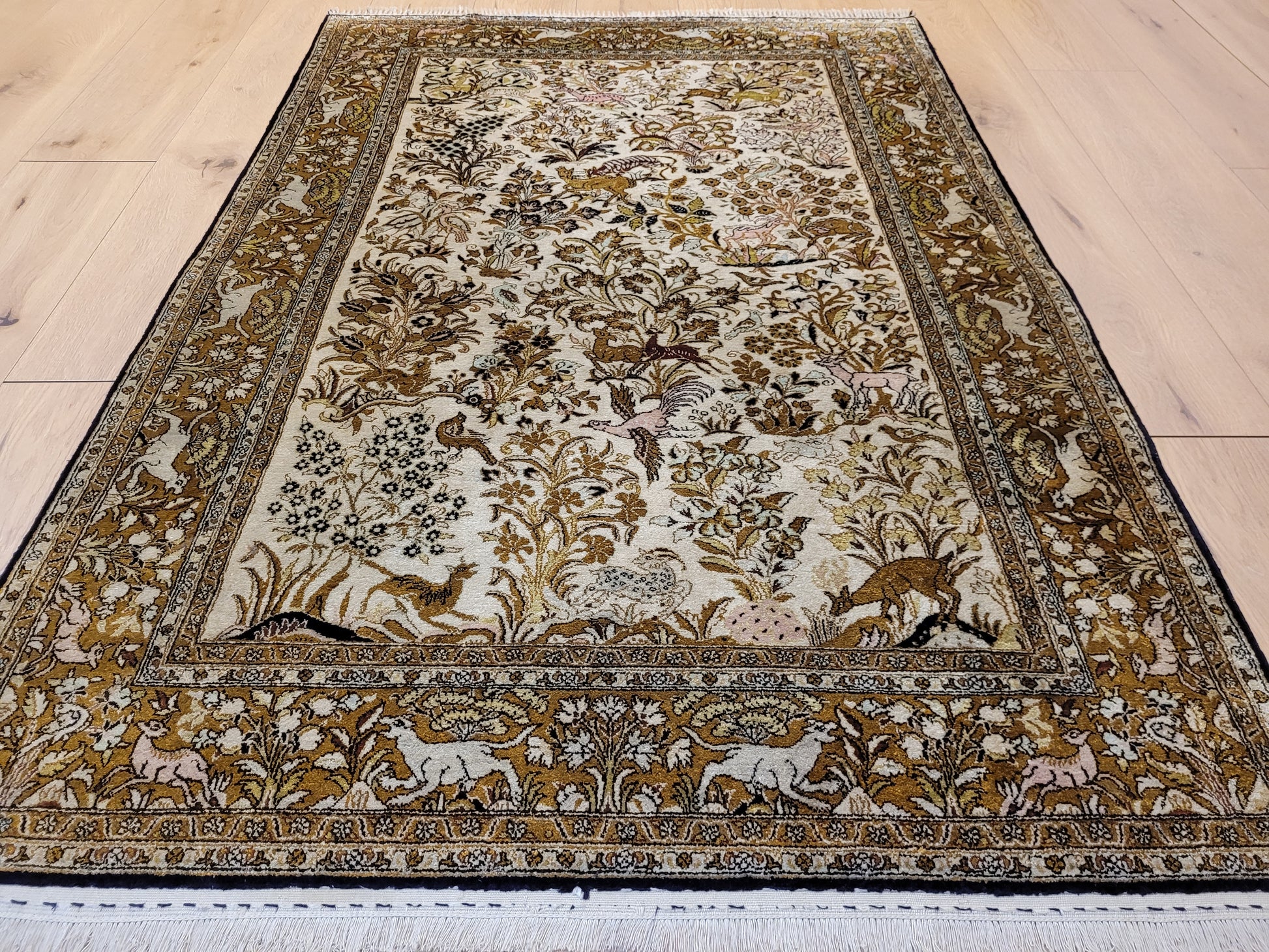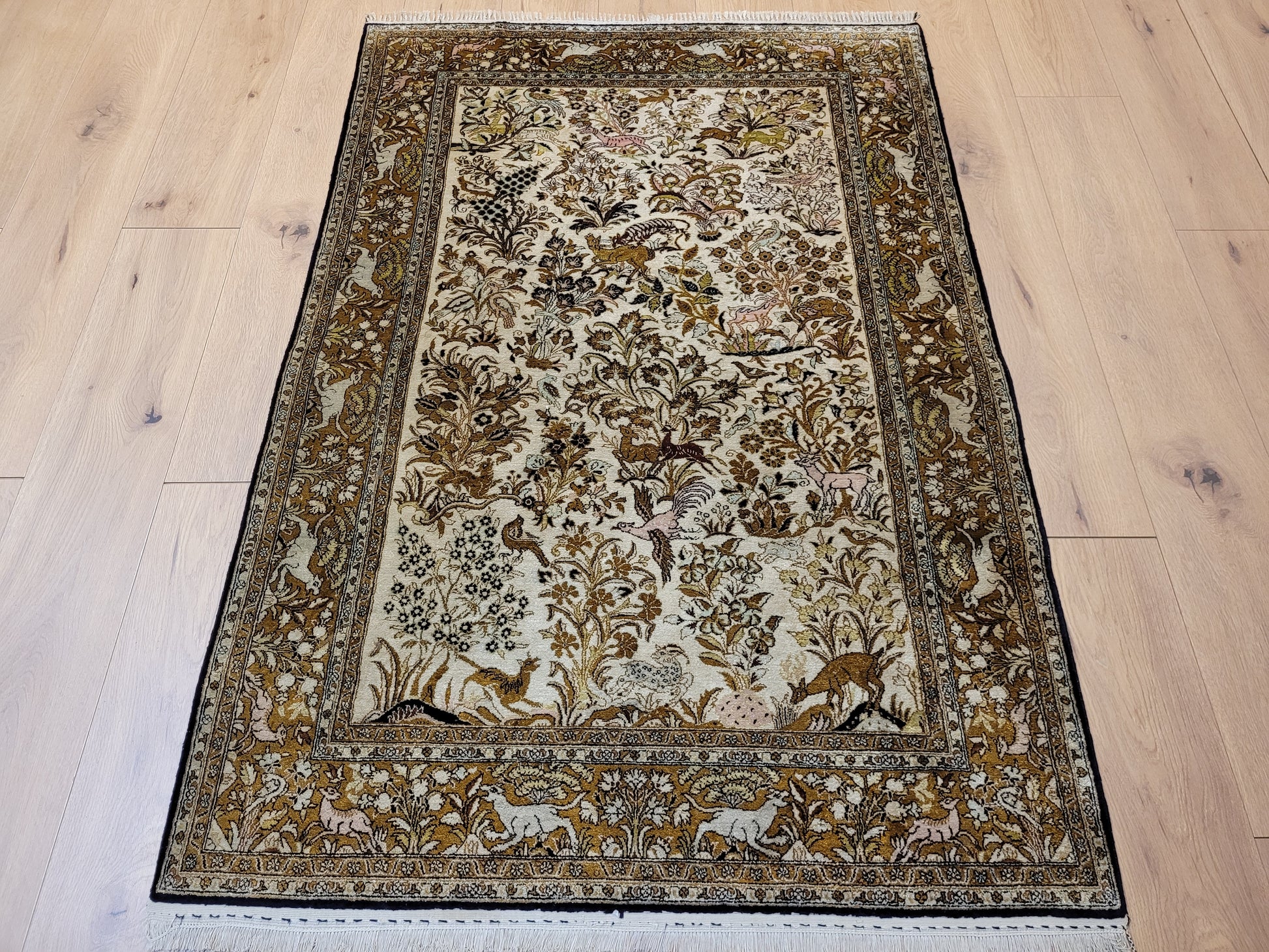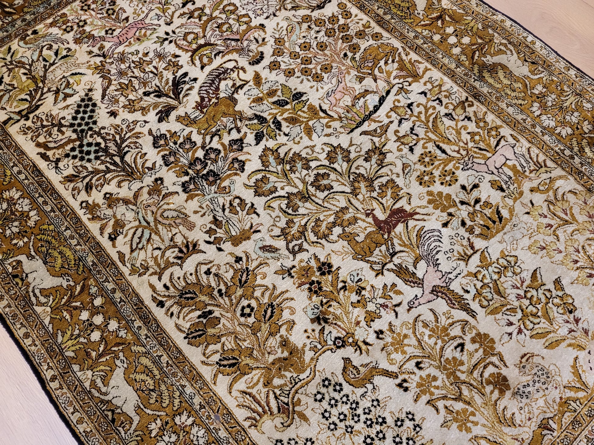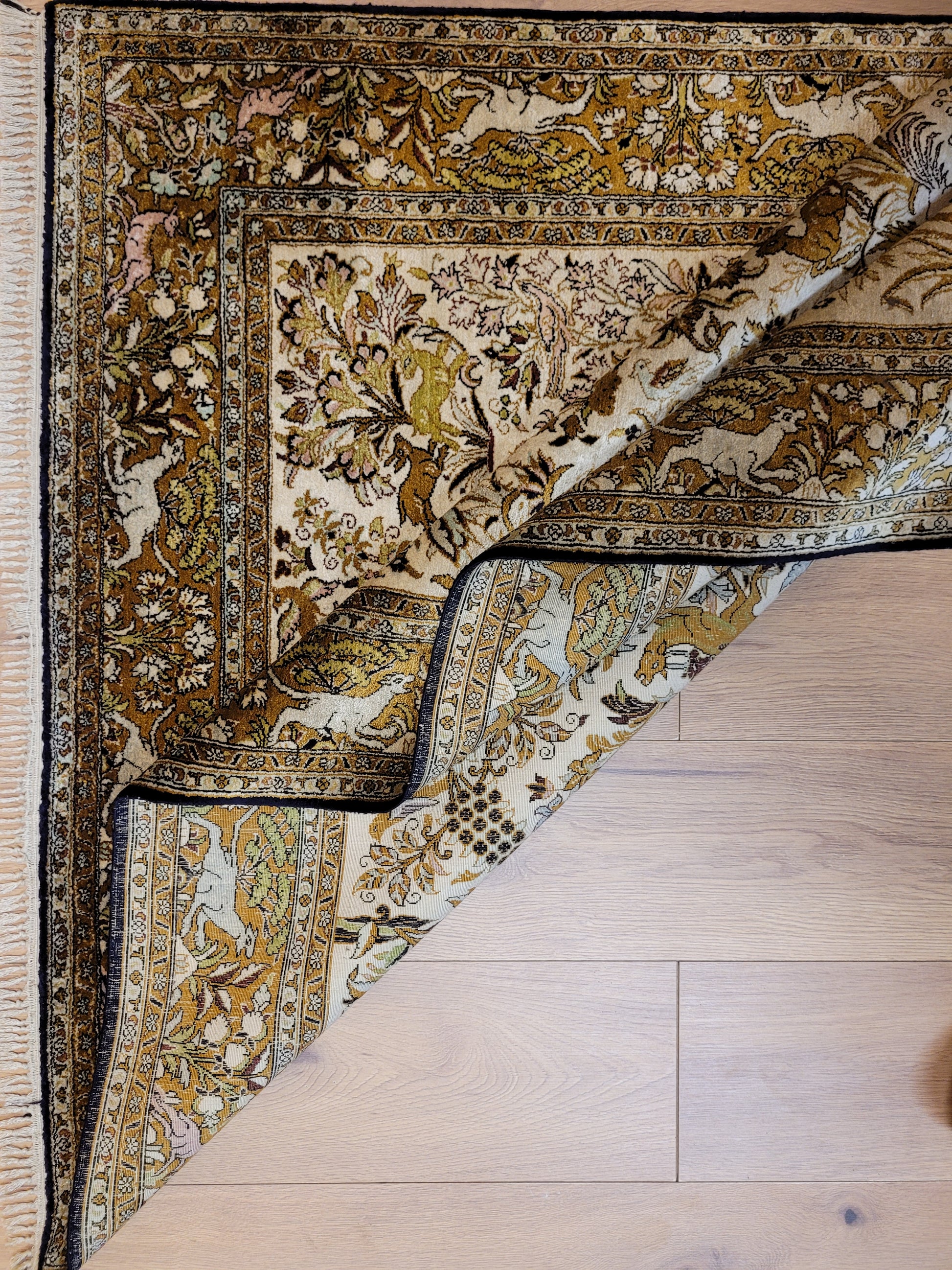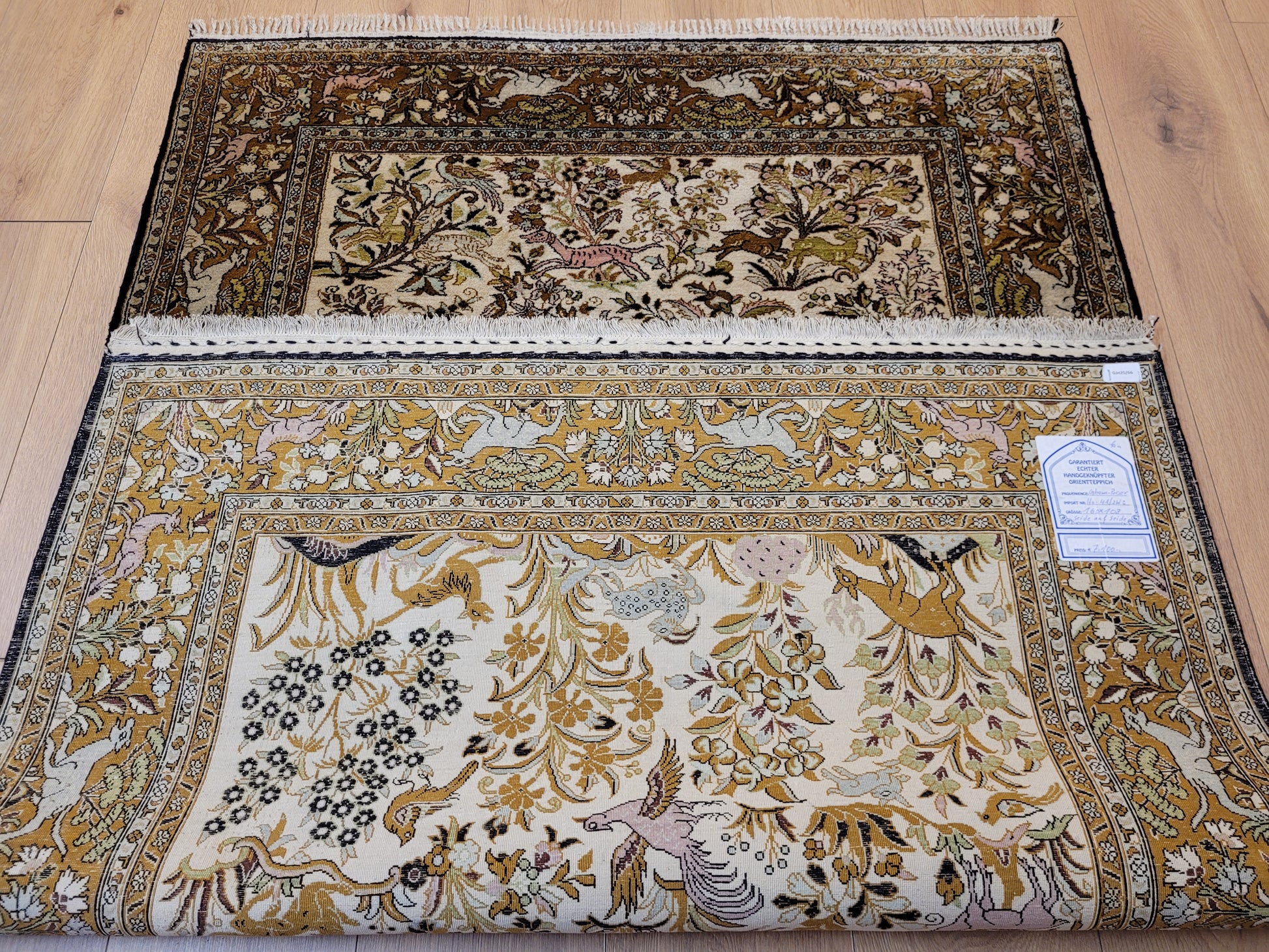 angeboten wird ein edler Ghom Teppich aus reiner Seide auf Seide, handgeknüpft in besonders feiner Ausführung. Das detailreiche Motiv zeigt einen Paradiesgarten mit üppiger Blütenfülle, Vögeln, Rehen und weiteren Tieren, kunstvoll eingebettet in ein harmonisches florales Arrangement.