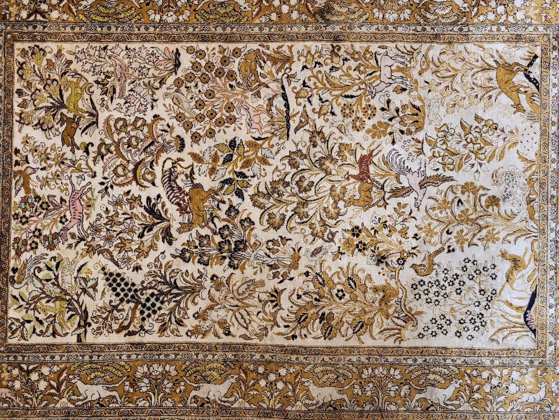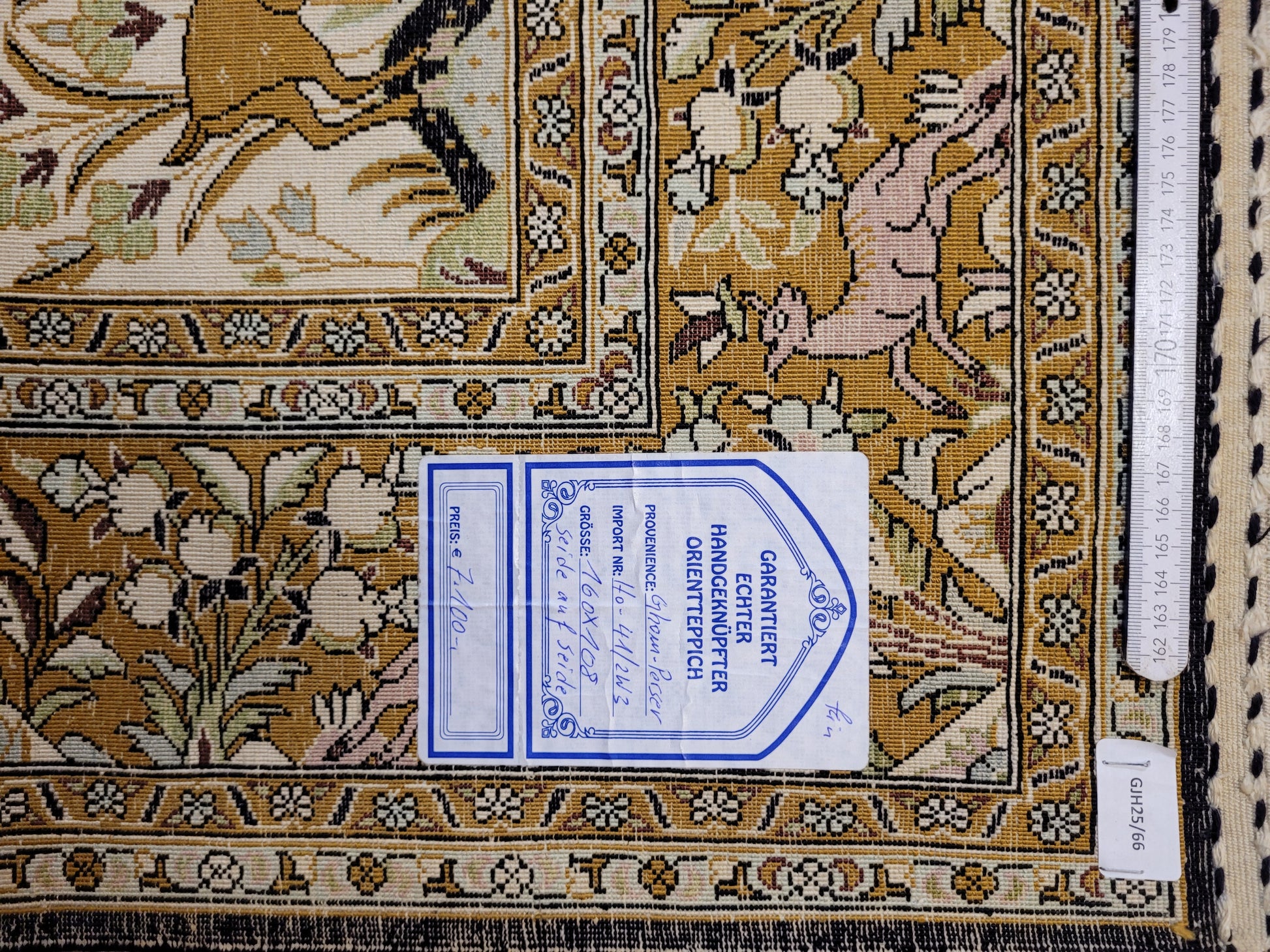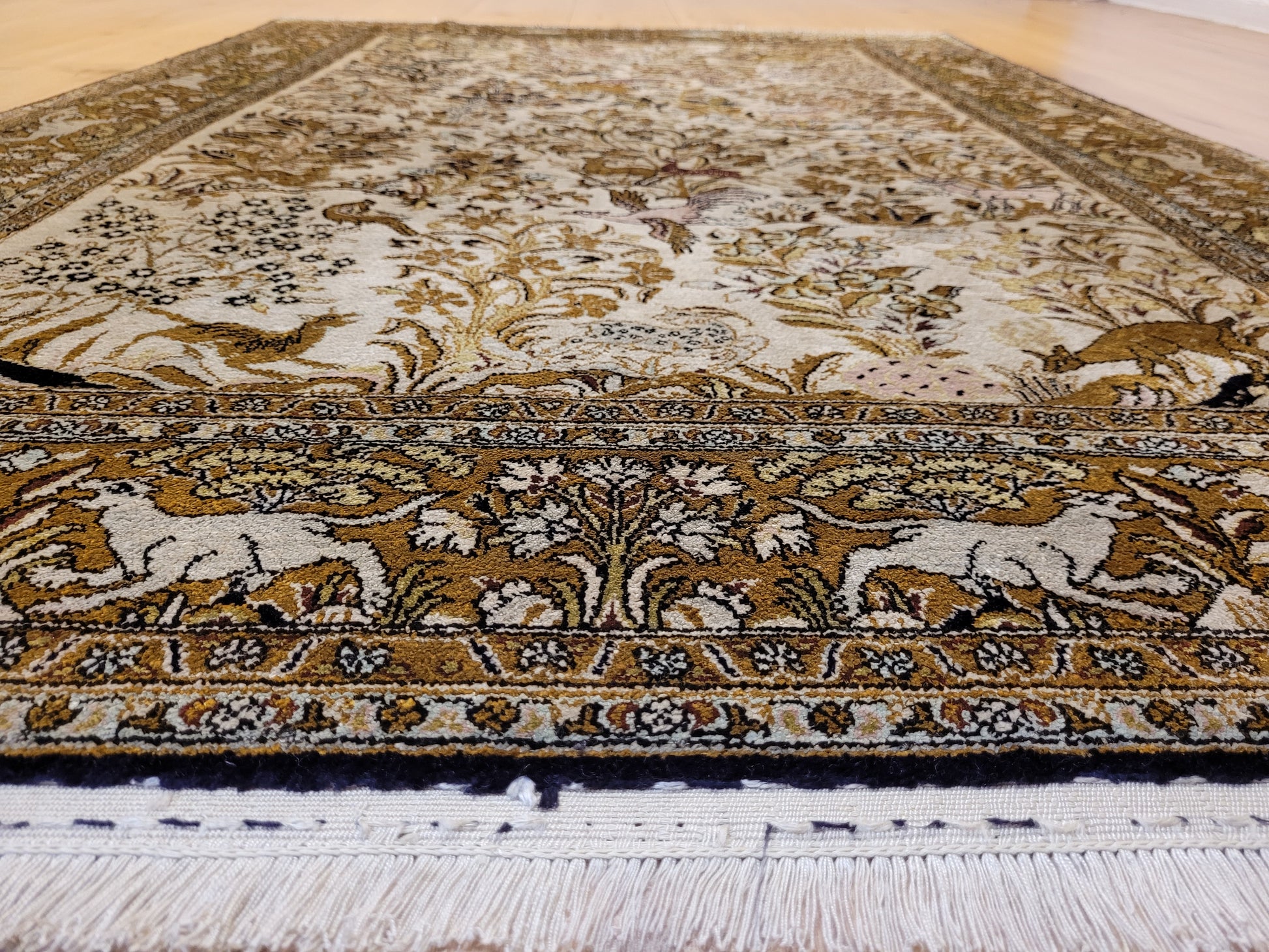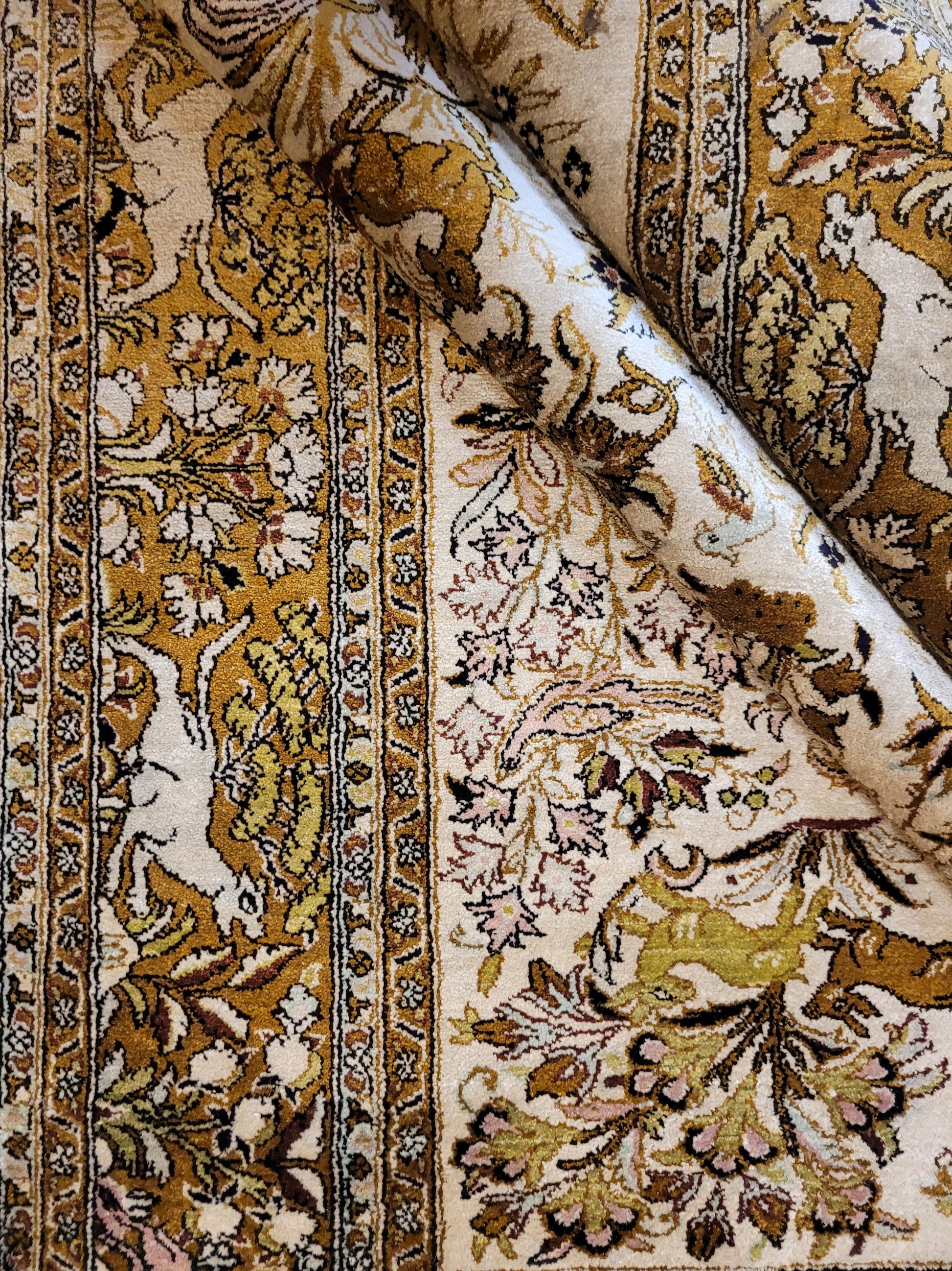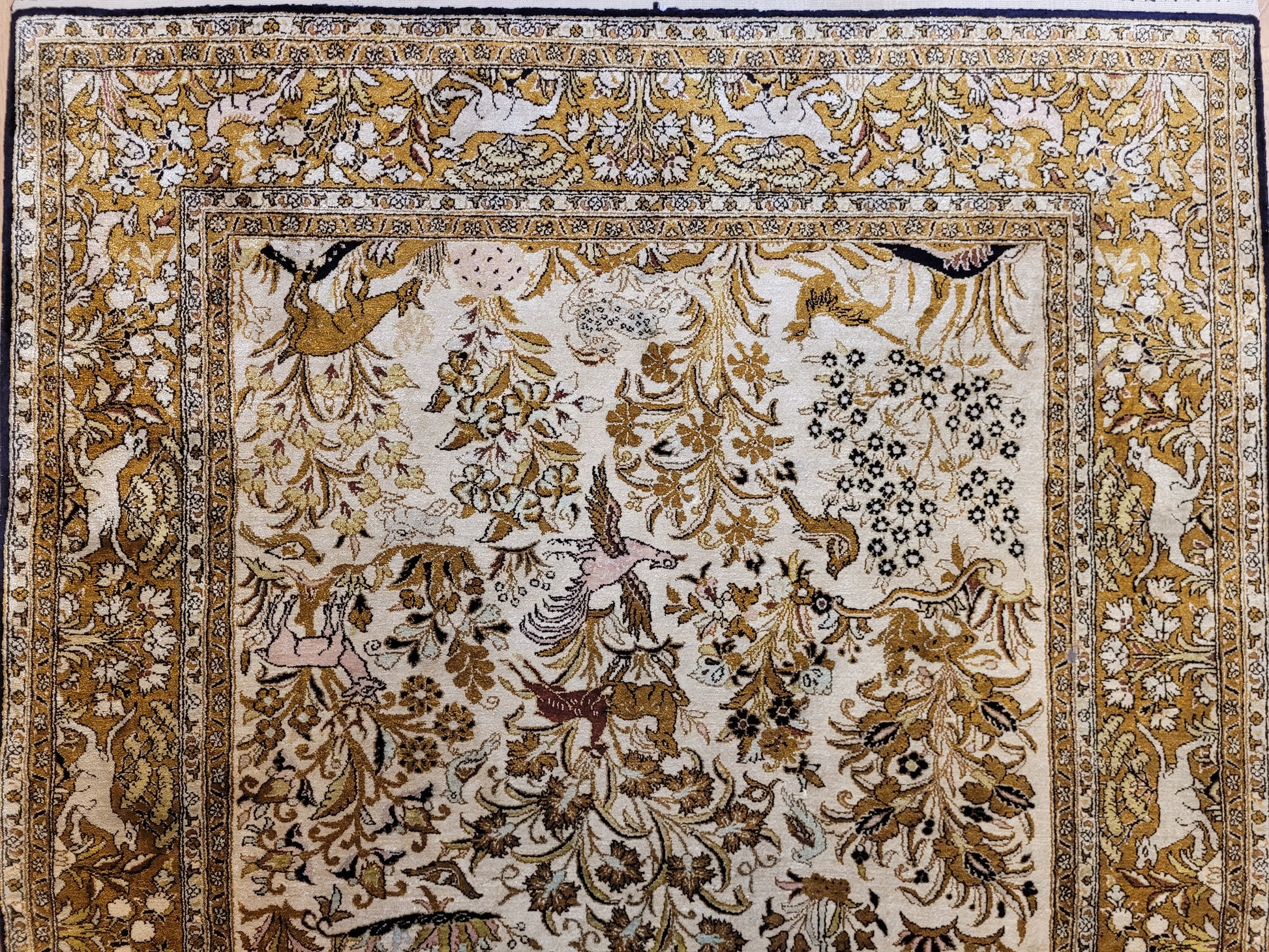 angeboten wird ein edler Ghom Teppich aus reiner Seide auf Seide, handgeknüpft in besonders feiner Ausführung. Das detailreiche Motiv zeigt einen Paradiesgarten mit üppiger Blütenfülle, Vögeln, Rehen und weiteren Tieren, kunstvoll eingebettet in ein harmonisches florales Arrangement.