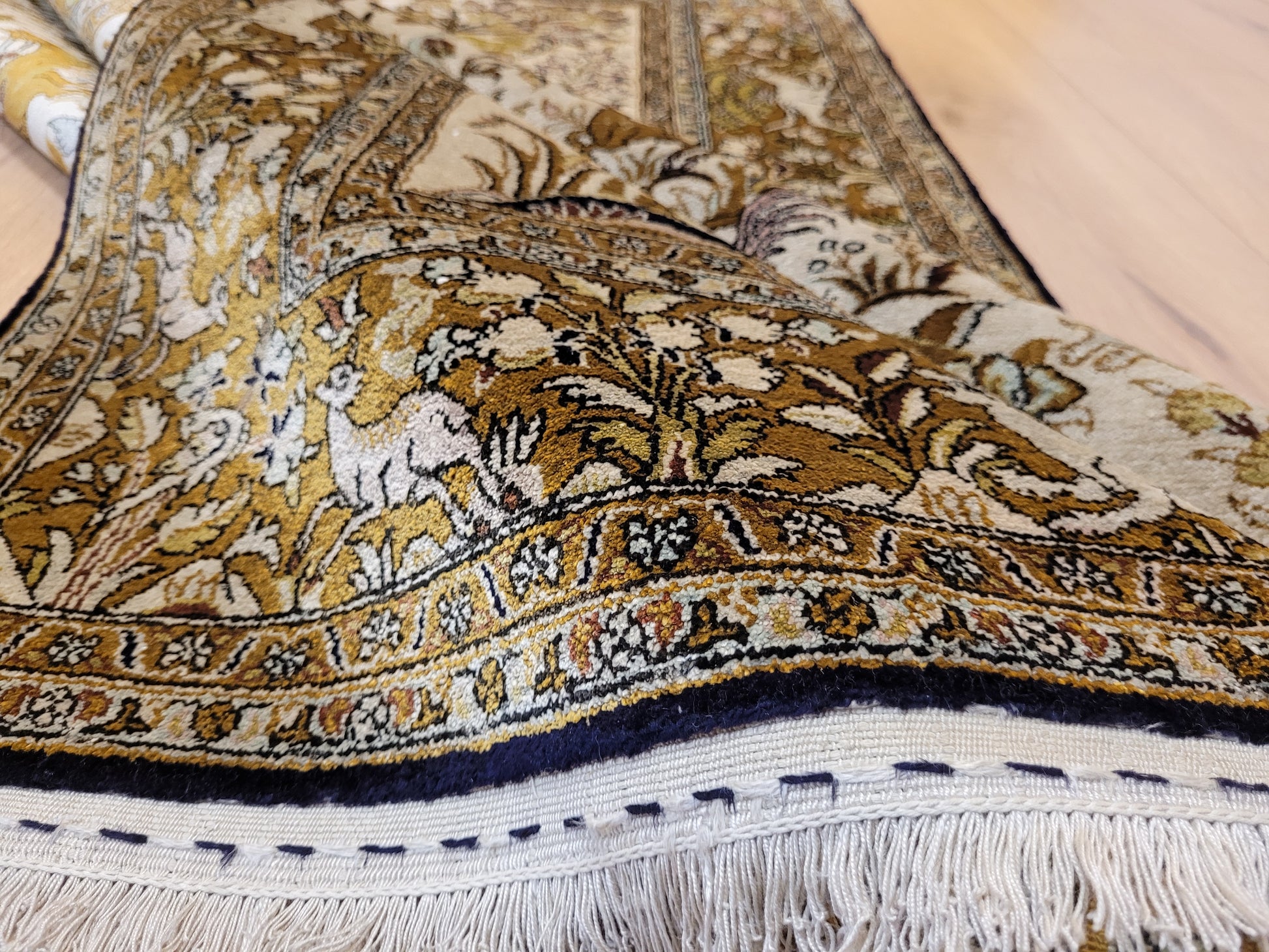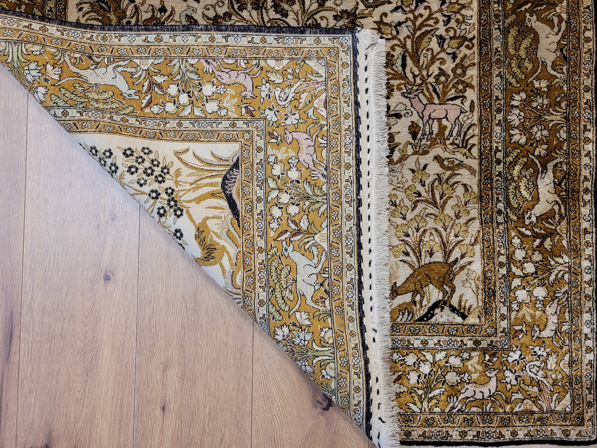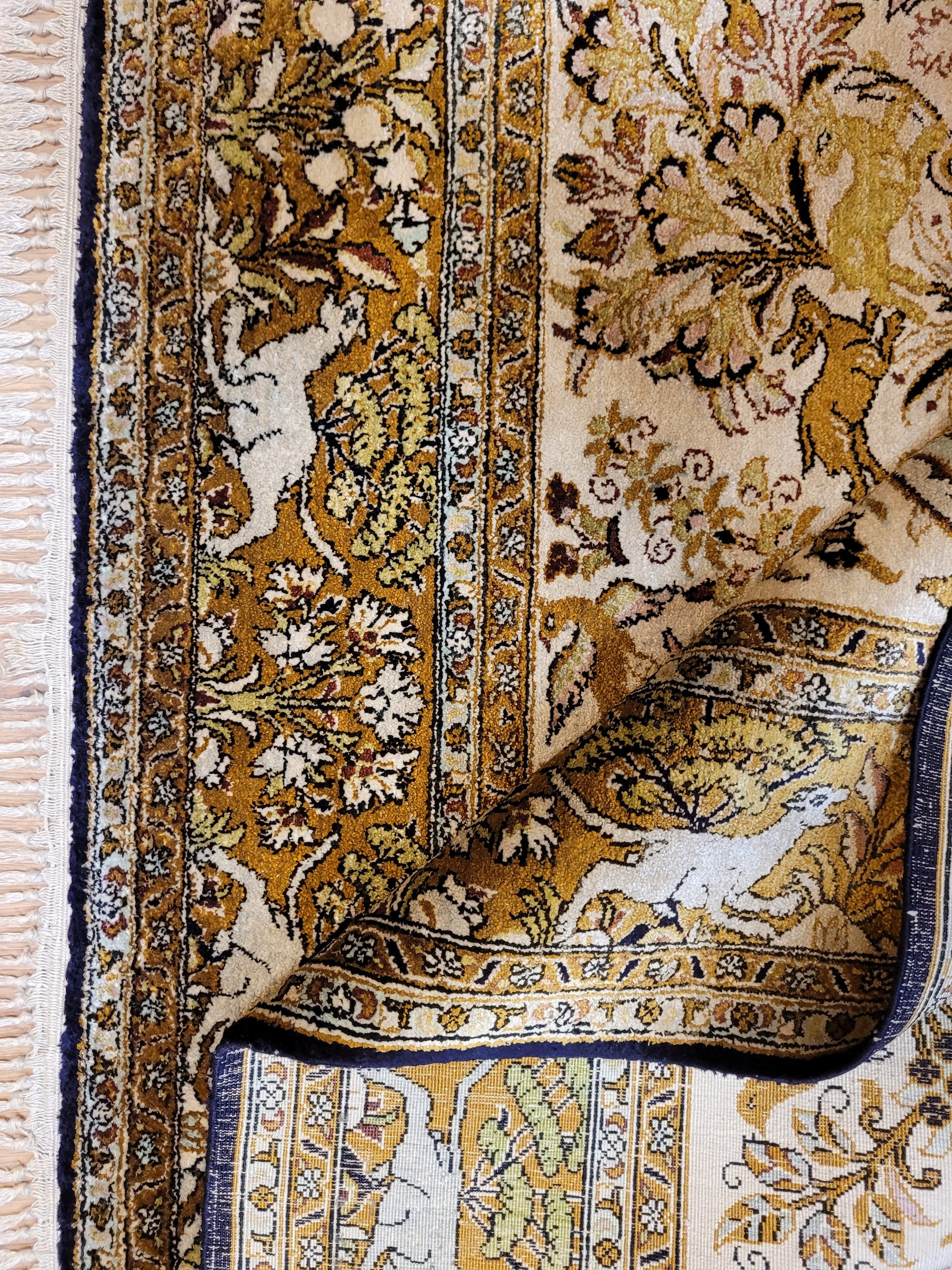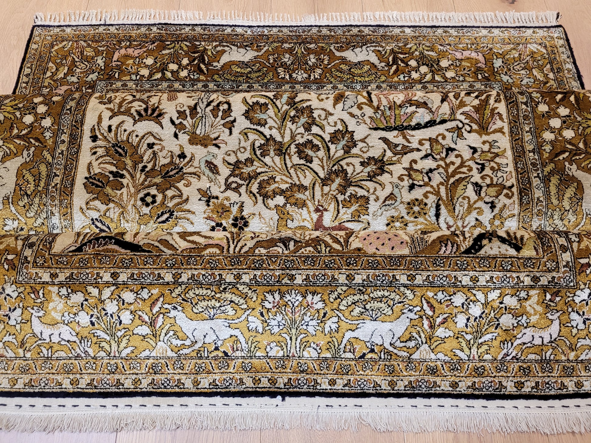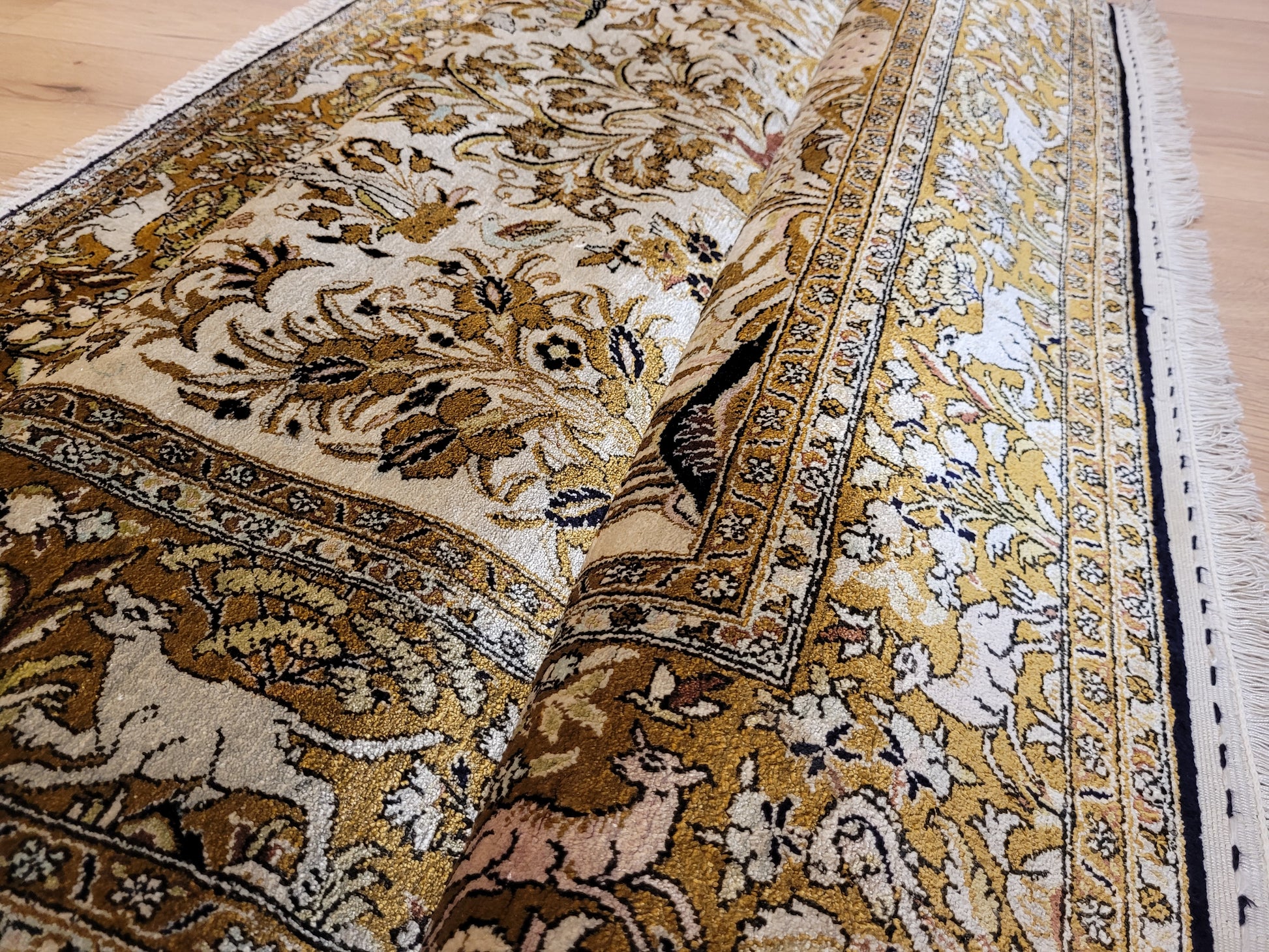 angeboten wird ein edler Ghom Teppich aus reiner Seide auf Seide, handgeknüpft in besonders feiner Ausführung. Das detailreiche Motiv zeigt einen Paradiesgarten mit üppiger Blütenfülle, Vögeln, Rehen und weiteren Tieren, kunstvoll eingebettet in ein harmonisches florales Arrangement.
