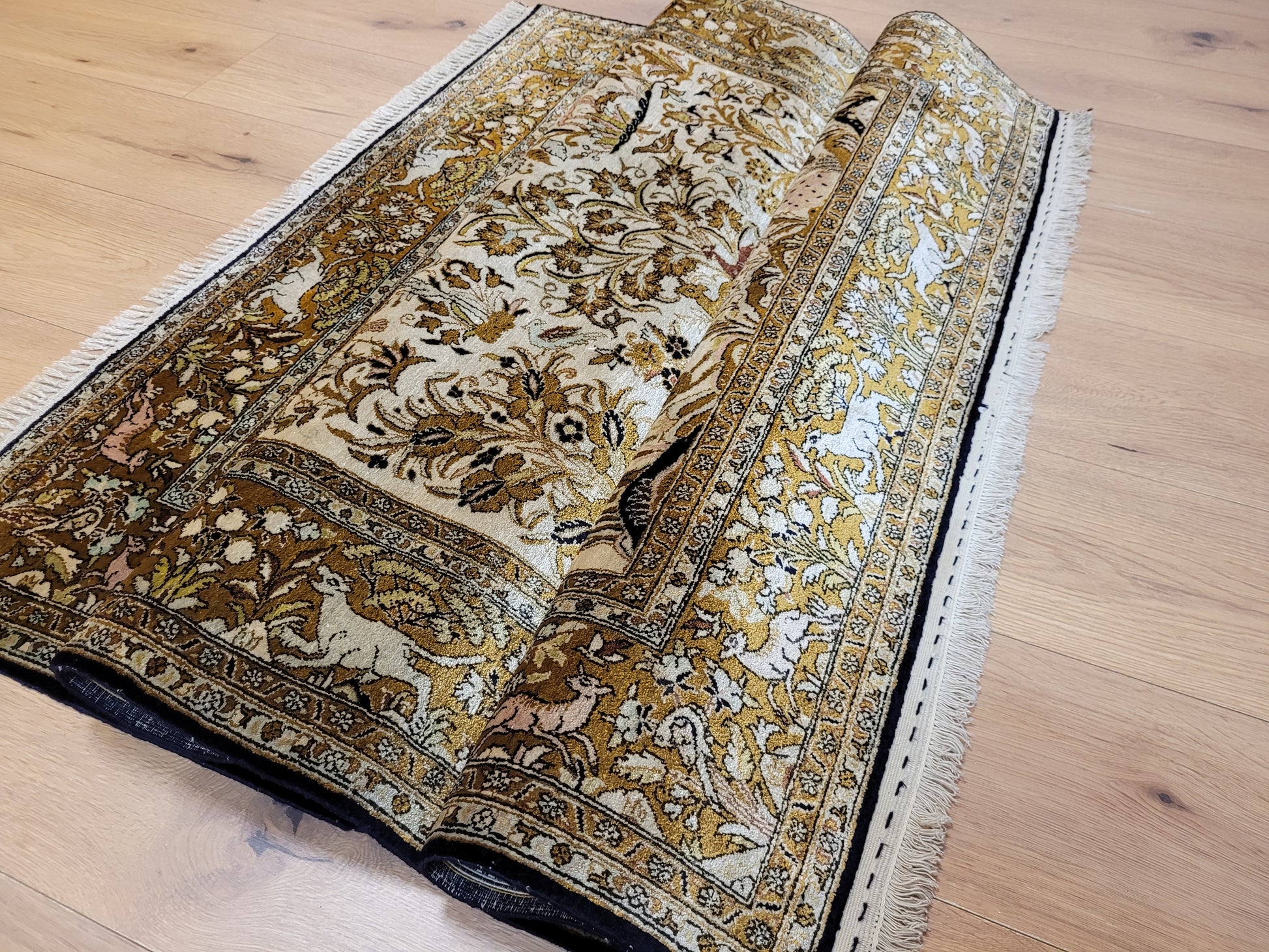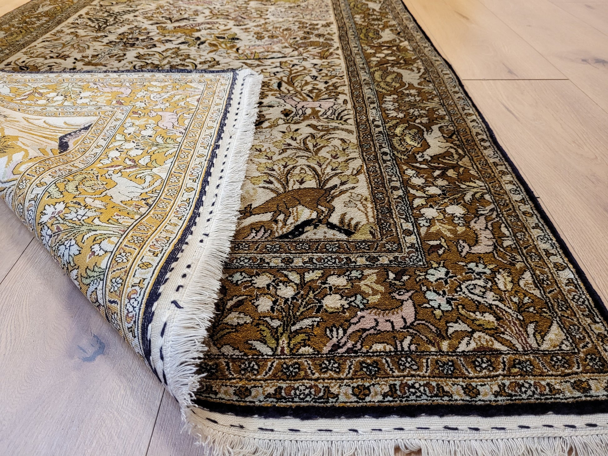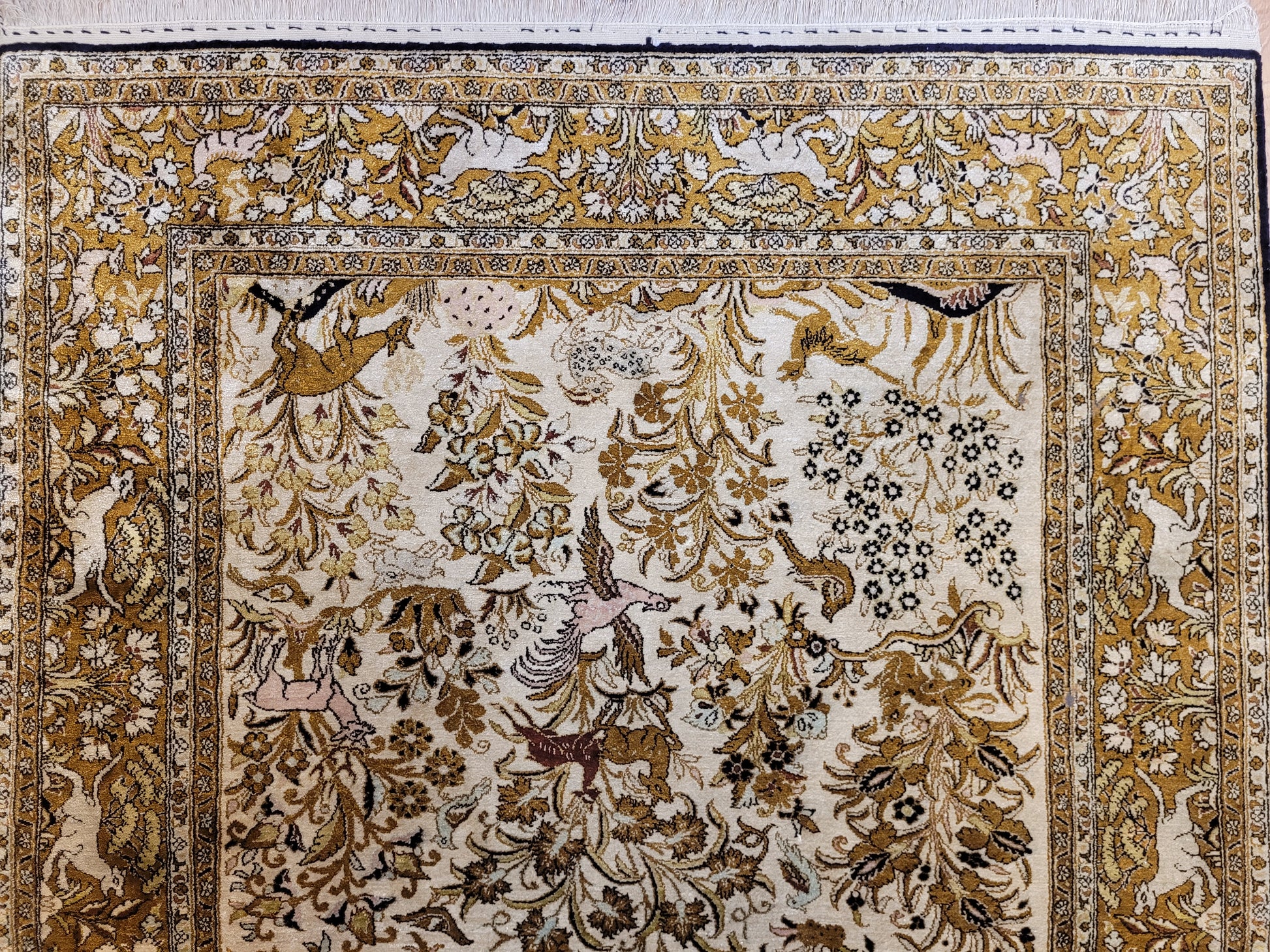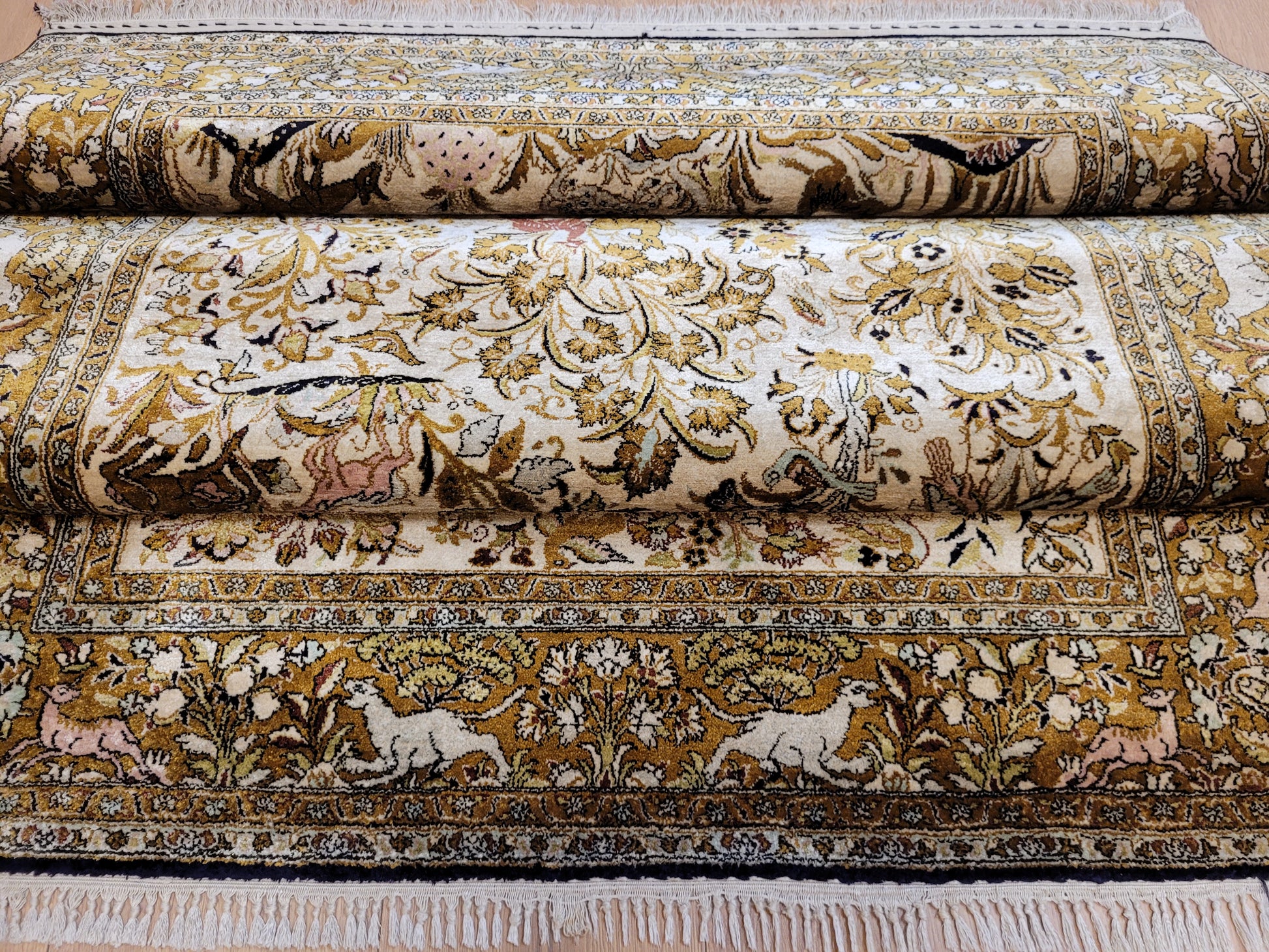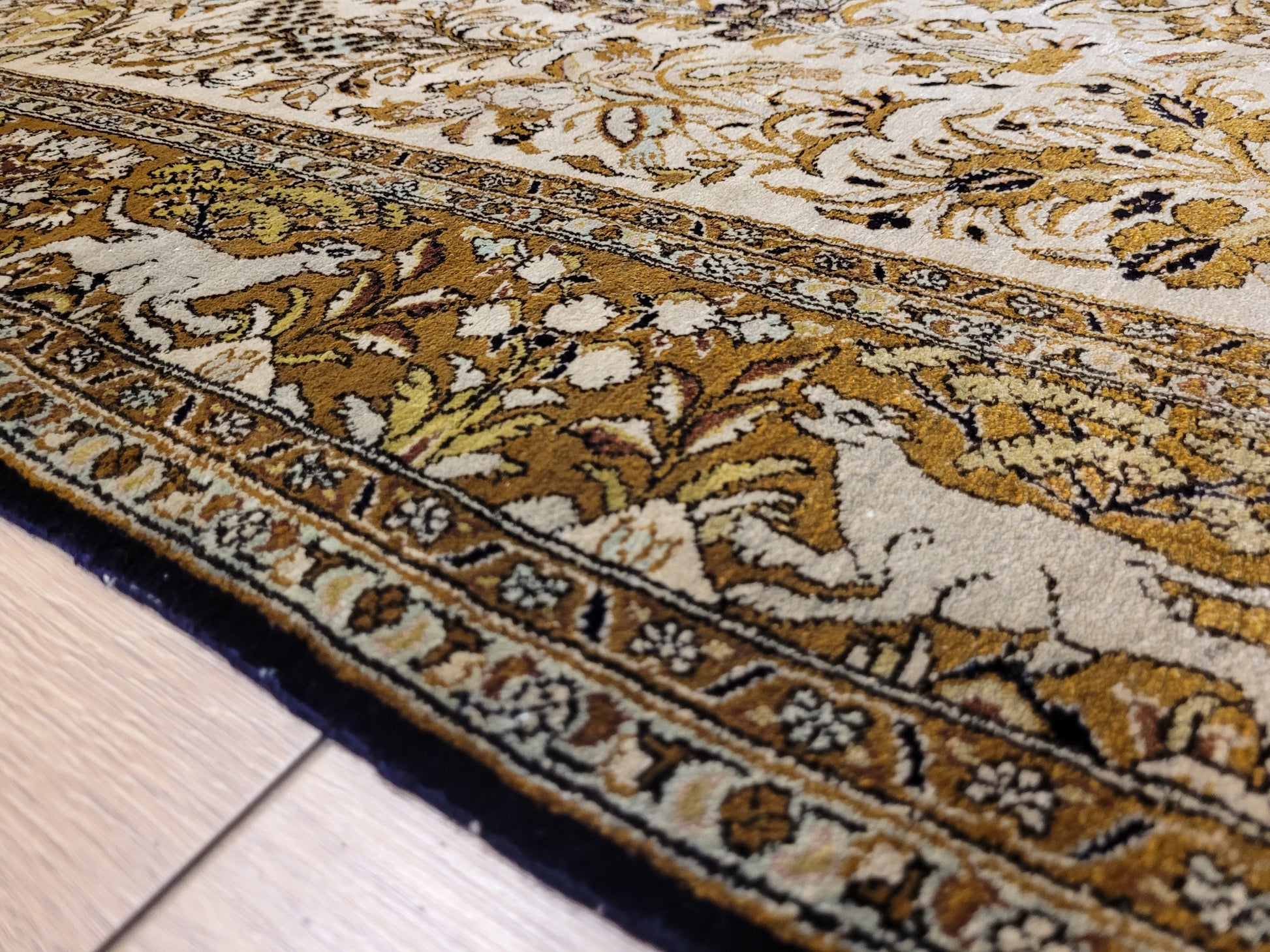 angeboten wird ein edler Ghom Teppich aus reiner Seide auf Seide, handgeknüpft in besonders feiner Ausführung. Das detailreiche Motiv zeigt einen Paradiesgarten mit üppiger Blütenfülle, Vögeln, Rehen und weiteren Tieren, kunstvoll eingebettet in ein harmonisches florales Arrangement.