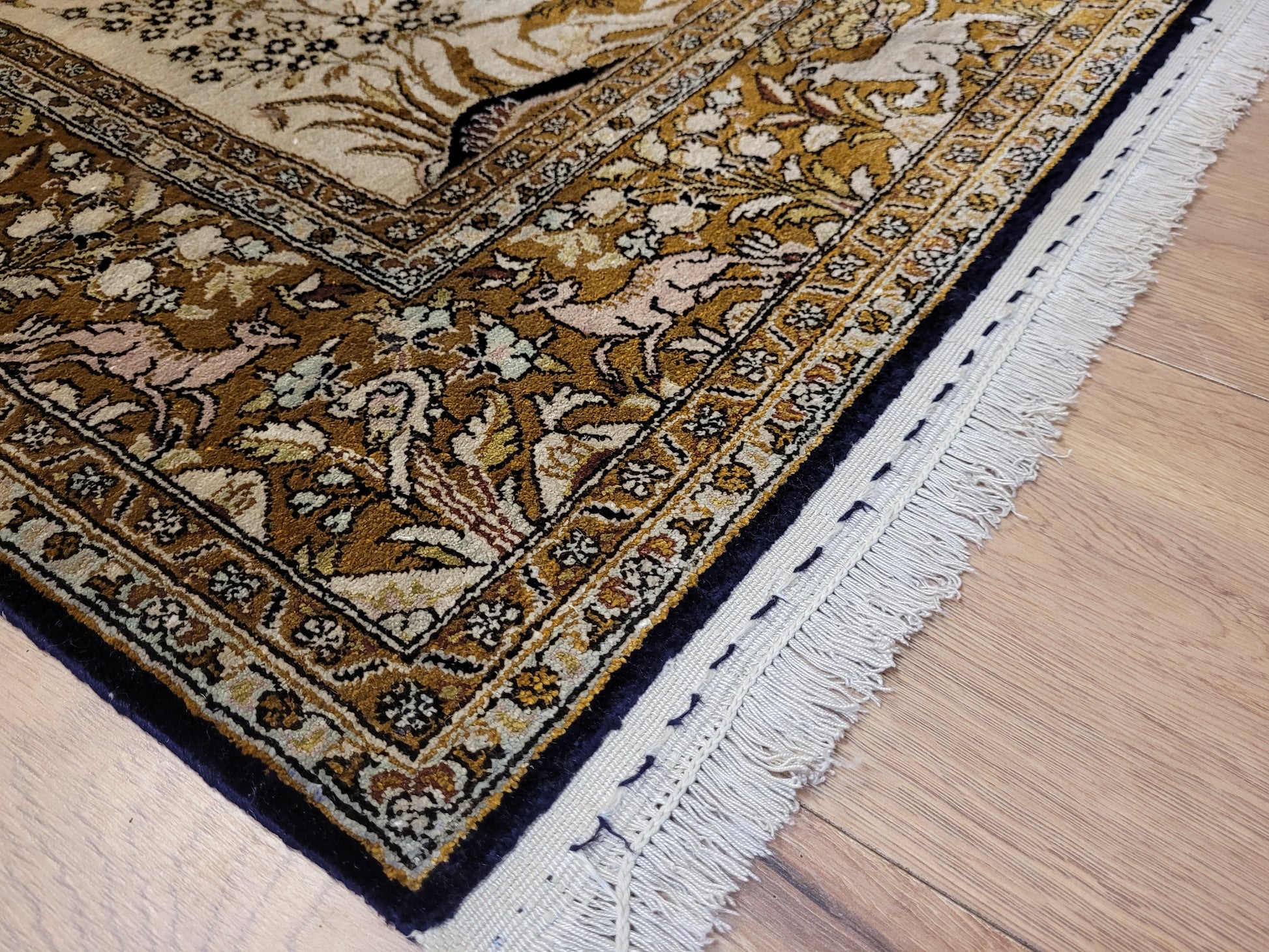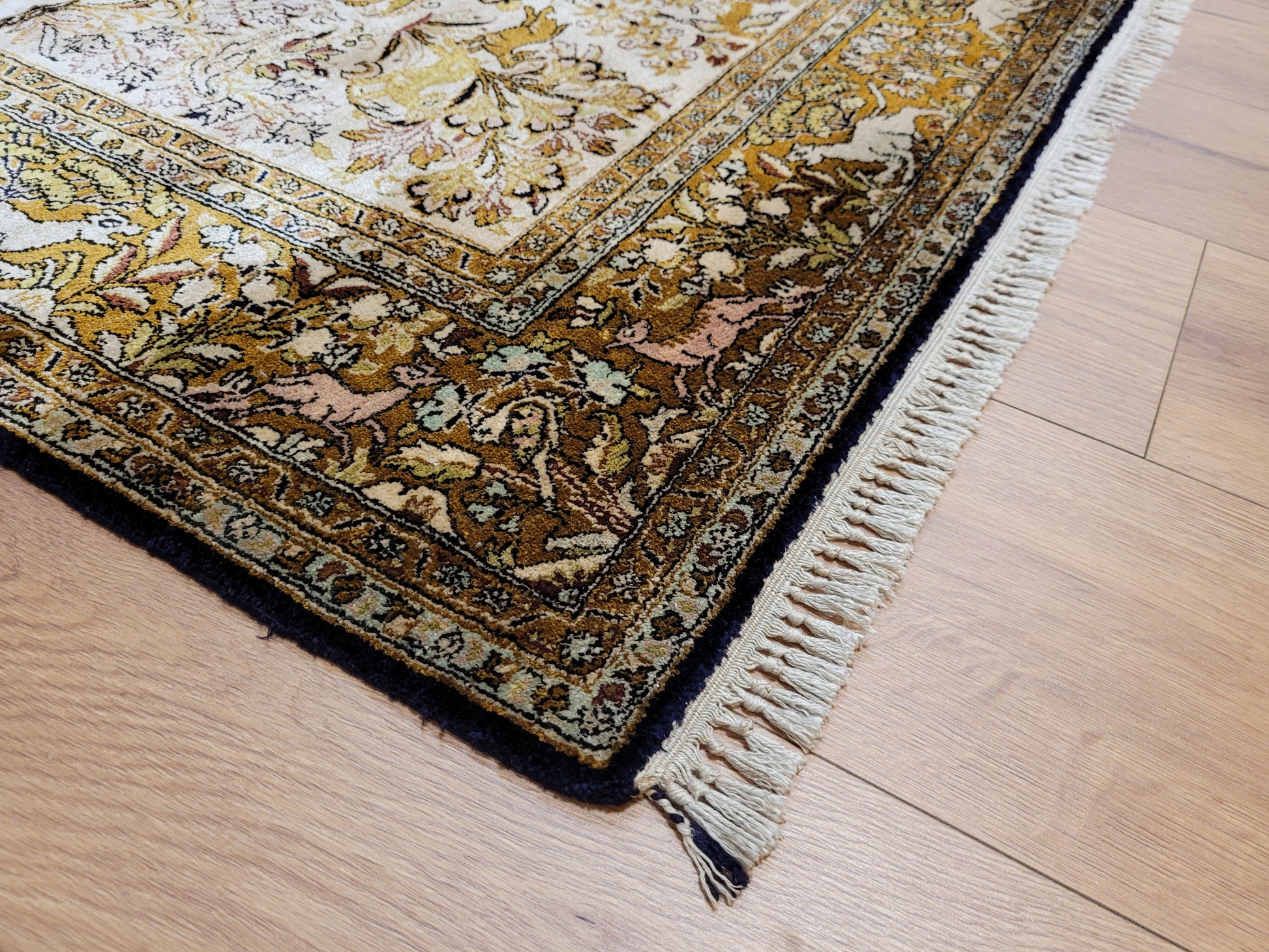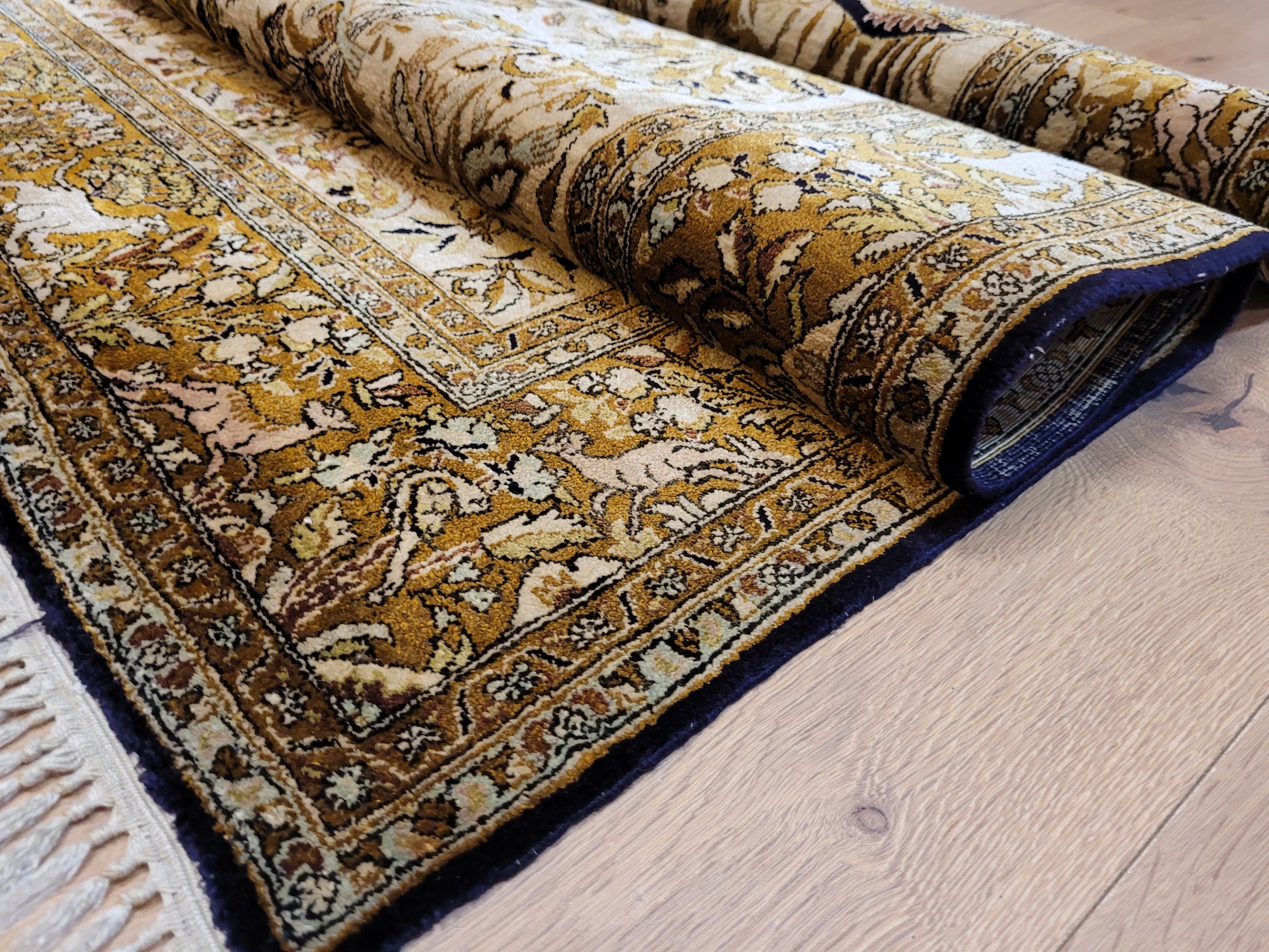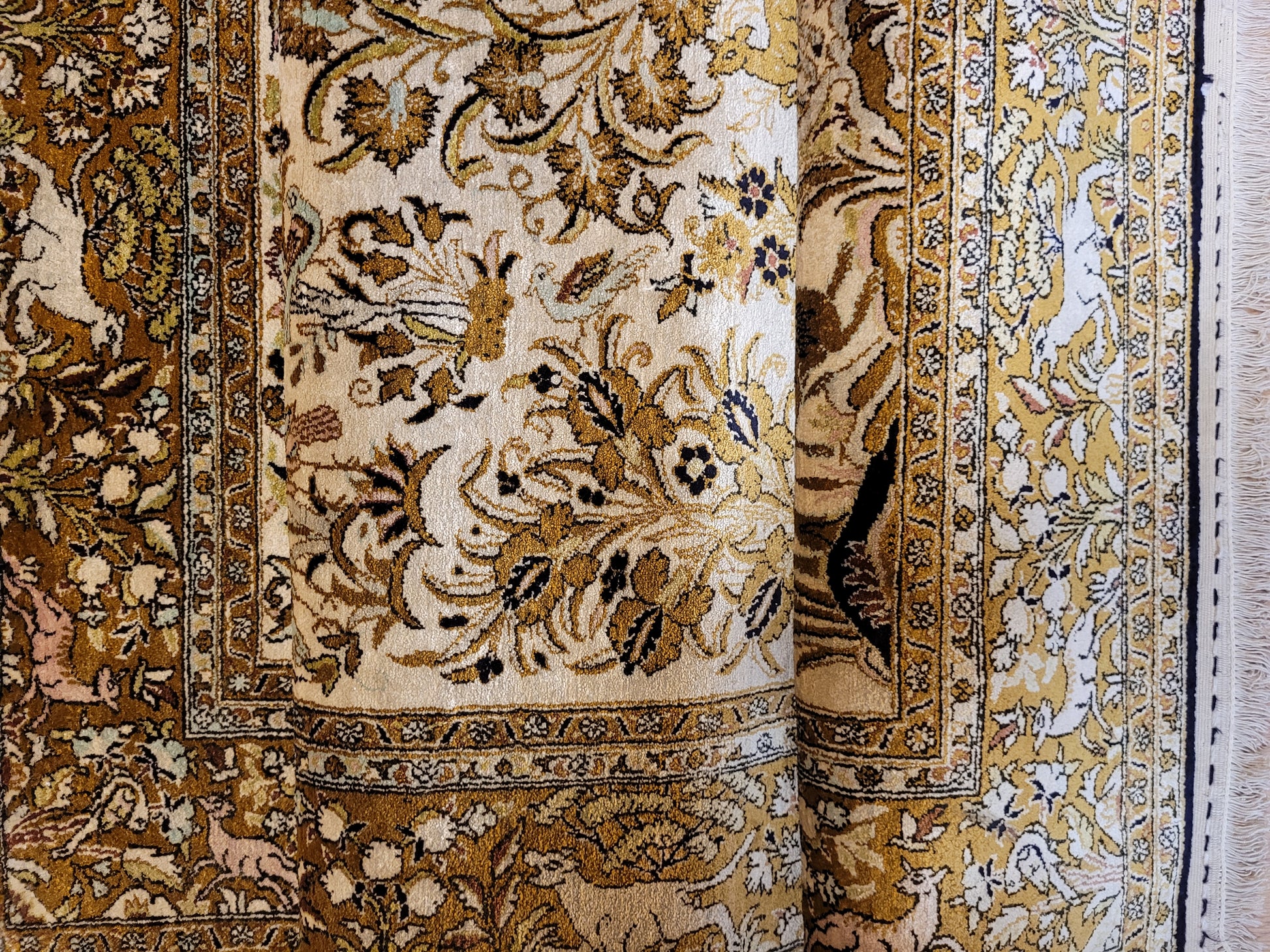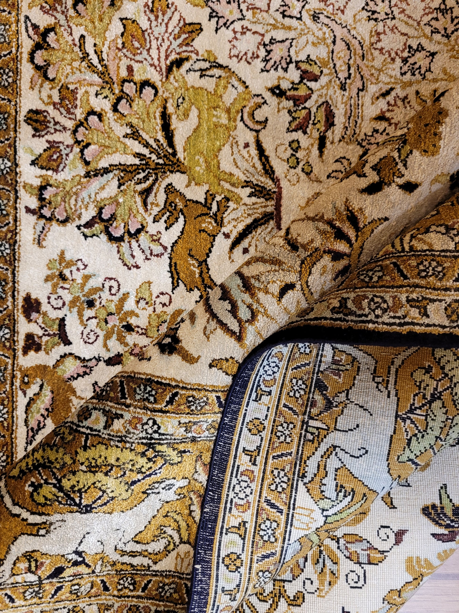 angeboten wird ein edler Ghom Teppich aus reiner Seide auf Seide, handgeknüpft in besonders feiner Ausführung. Das detailreiche Motiv zeigt einen Paradiesgarten mit üppiger Blütenfülle, Vögeln, Rehen und weiteren Tieren, kunstvoll eingebettet in ein harmonisches florales Arrangement.