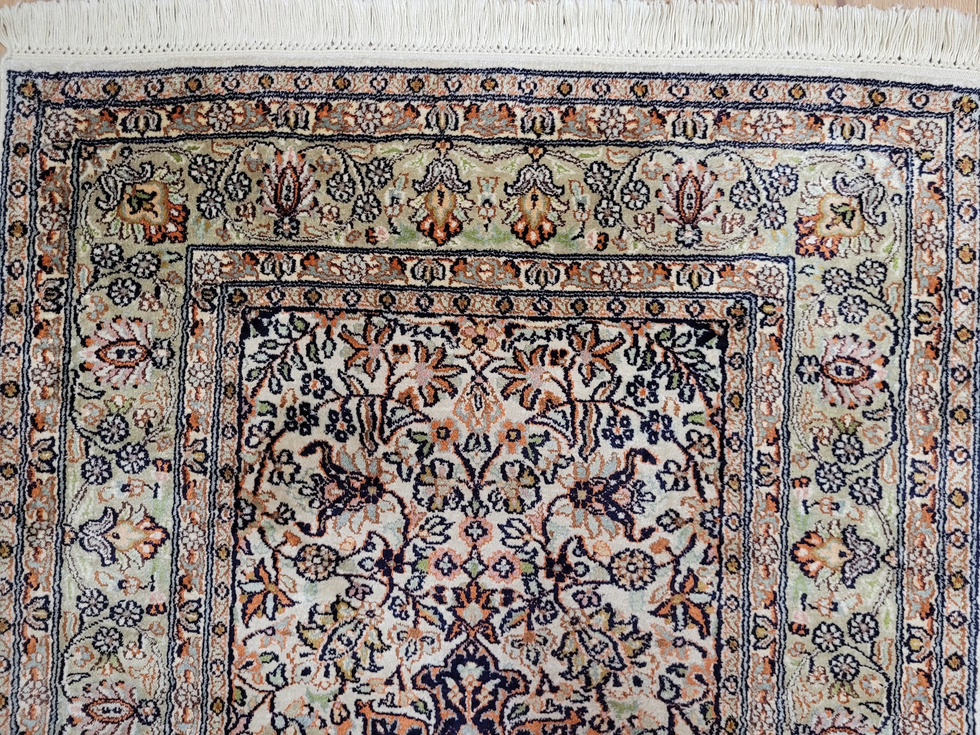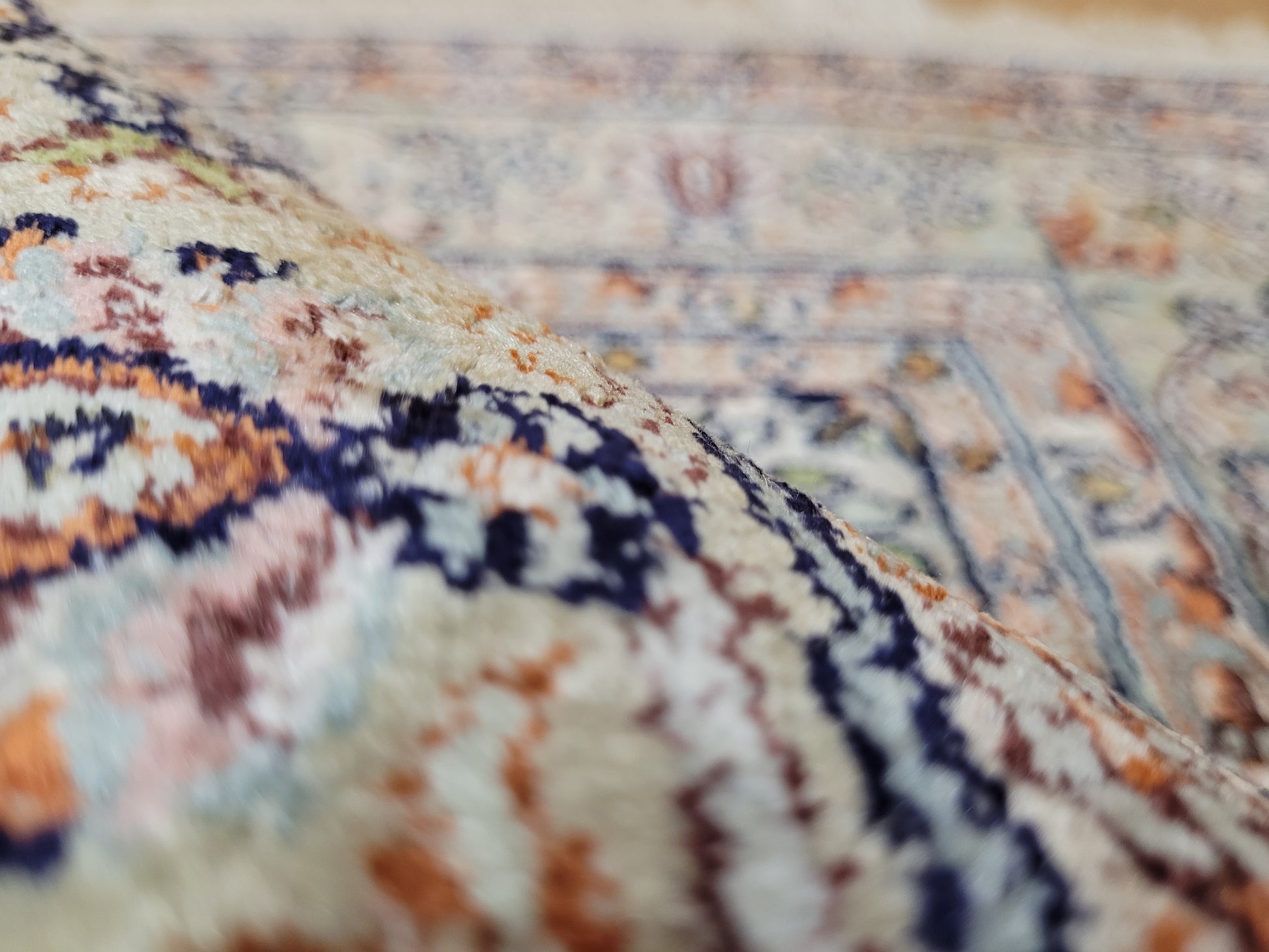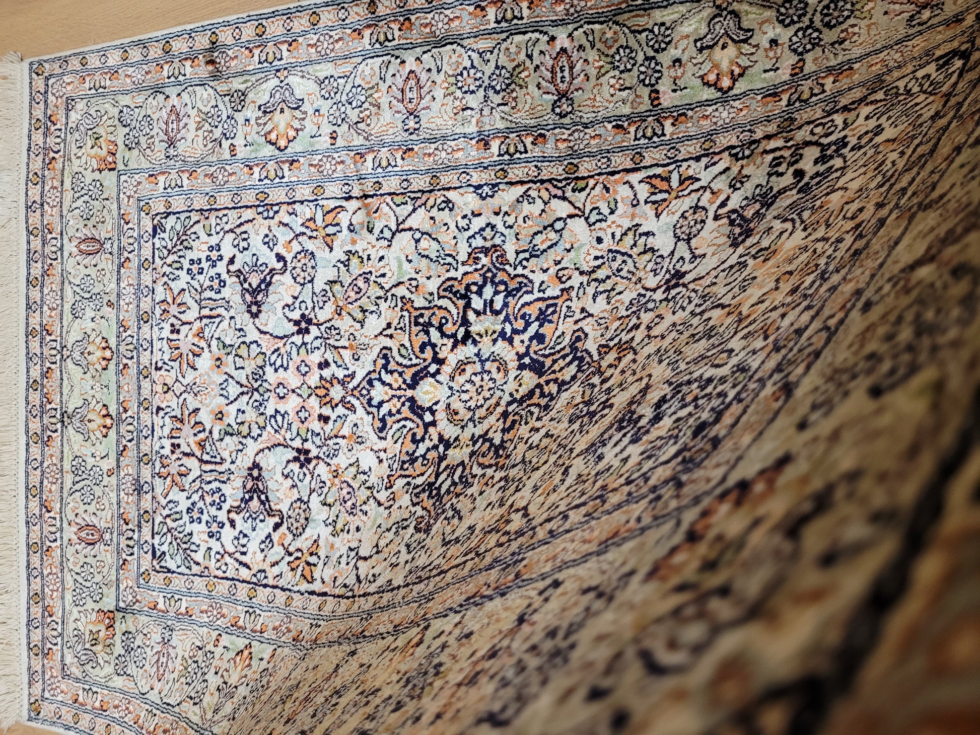 angeboten wird ein eleganter Ghom Seidenteppich, handgeknüpft aus reiner Seide in feinster Qualität. Das Design zeigt ein zentrales florales Medaillon auf hellem Fond, umgeben von filigranen Blütenranken und kunstvoll gestalteten Eckmotiven. Die sanfte Farbgebung in Pastelltönen – mit Apricot, Mintgrün, Hellblau und Dunkelblau – verleiht diesem Teppich eine edle, harmonische Wirkung.