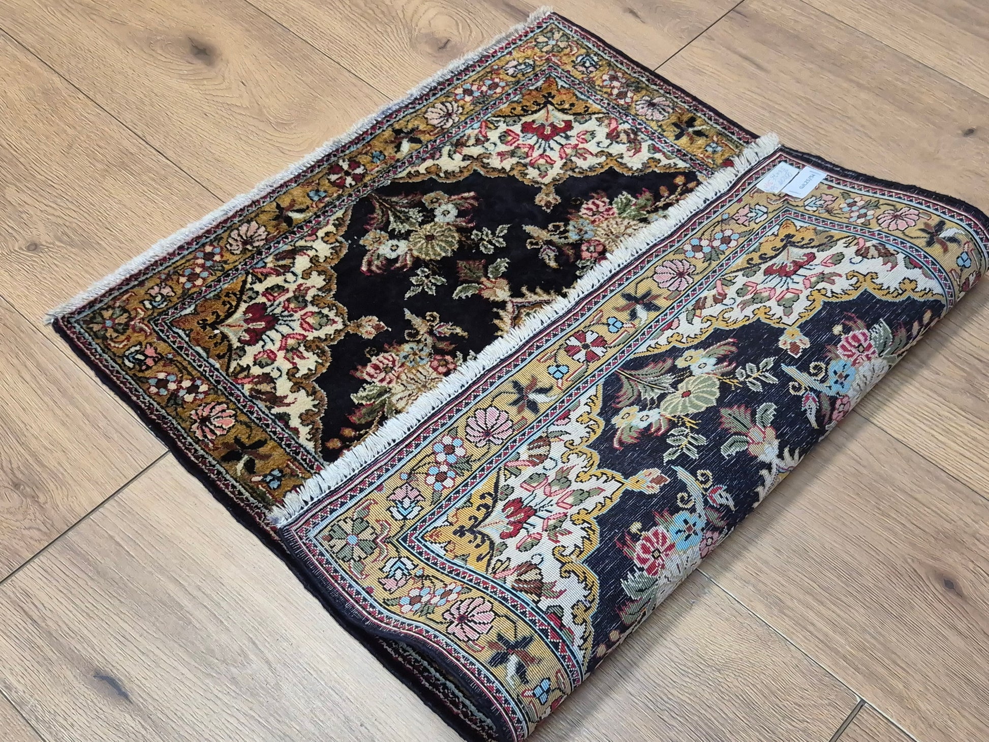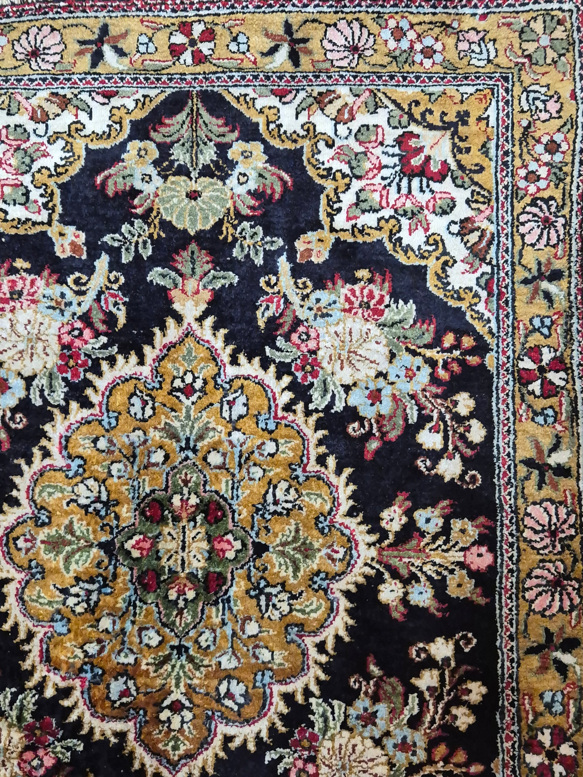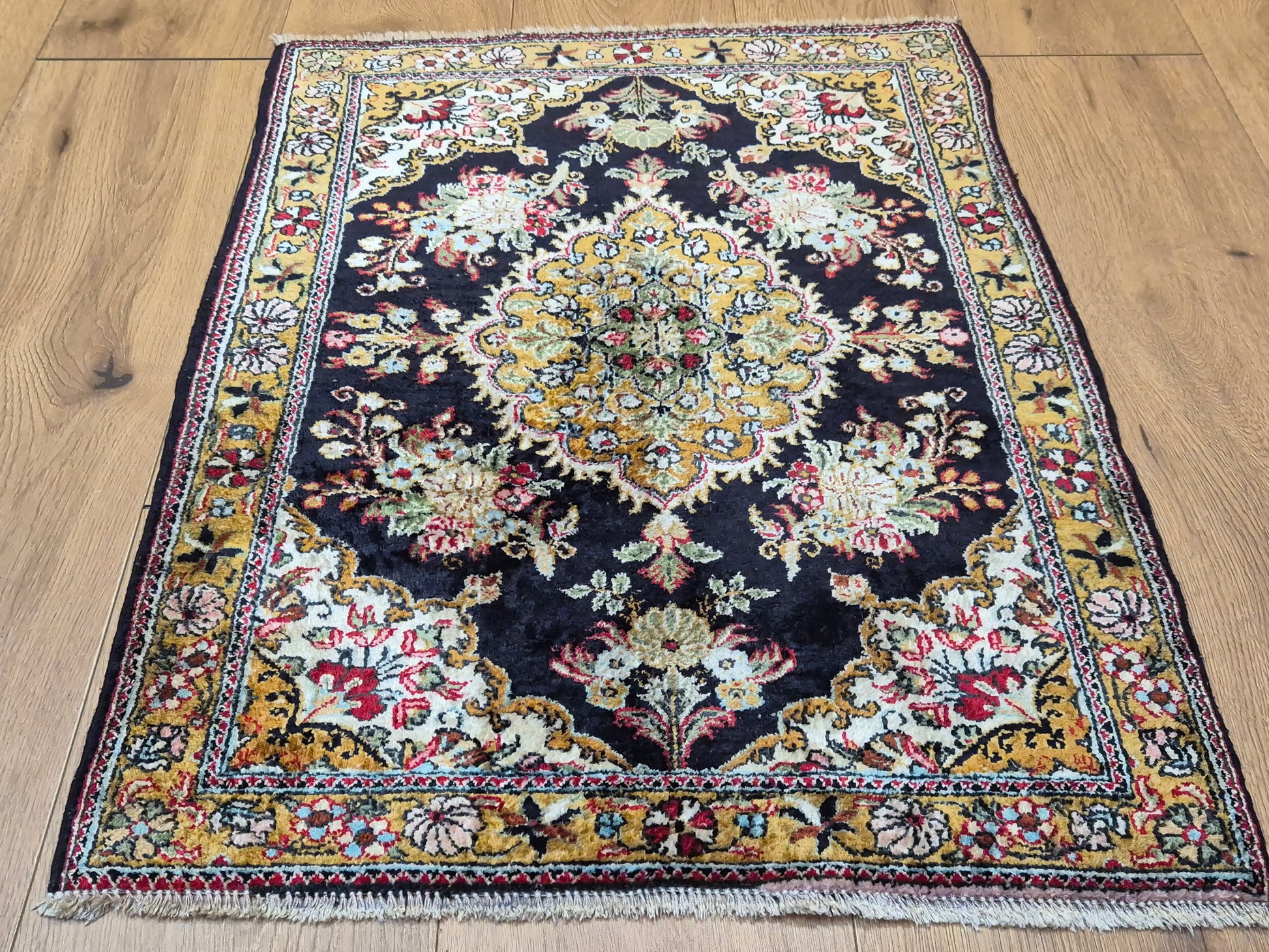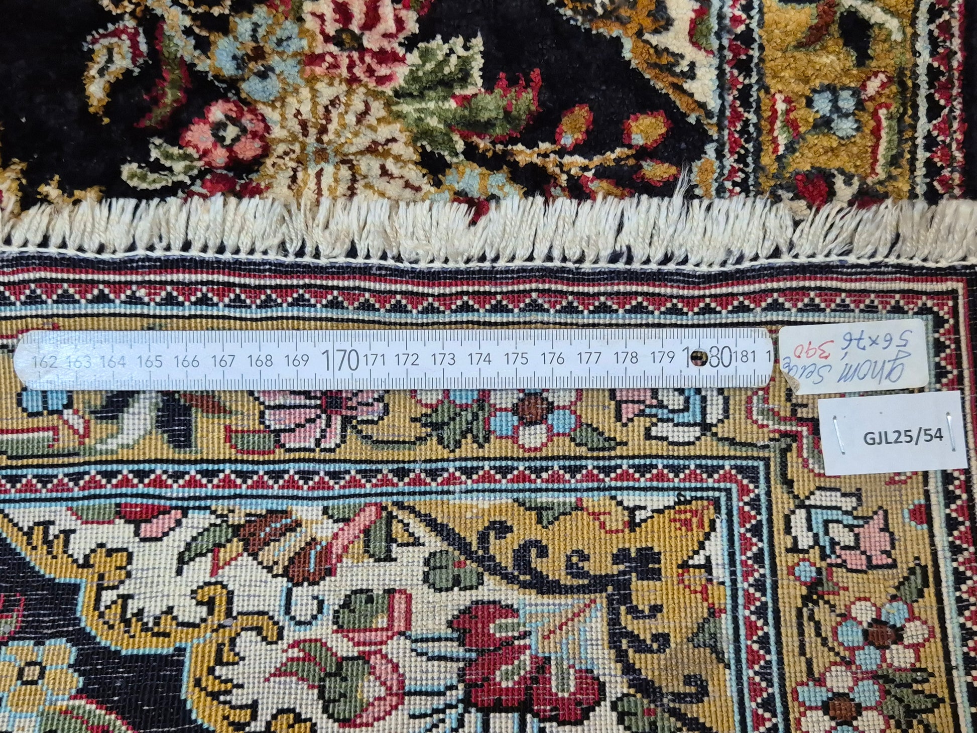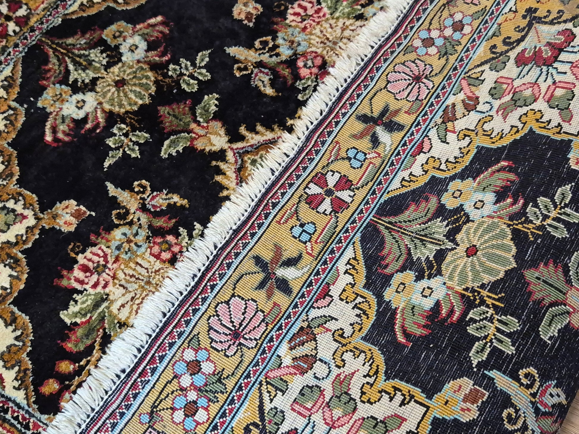 angeboten wird ein edler Ghom Teppich aus reiner Seide, handgeknüpft in feiner Ausführung. Im Zentrum befindet sich ein reich verziertes Medaillon in goldenen Tönen, das von einem tiefschwarzen Fond umgeben ist. Um das Medaillon ranken sich florale Blütenarrangements in harmonischer Farbvielfalt, ergänzt durch eine prachtvolle Bordüre mit kunstvollen Blütenmotiven. Durch die feine Knüpfung und den charakteristischen Seidenglanz entfaltet der Teppich eine elegante, luxuriöse Wirkung.