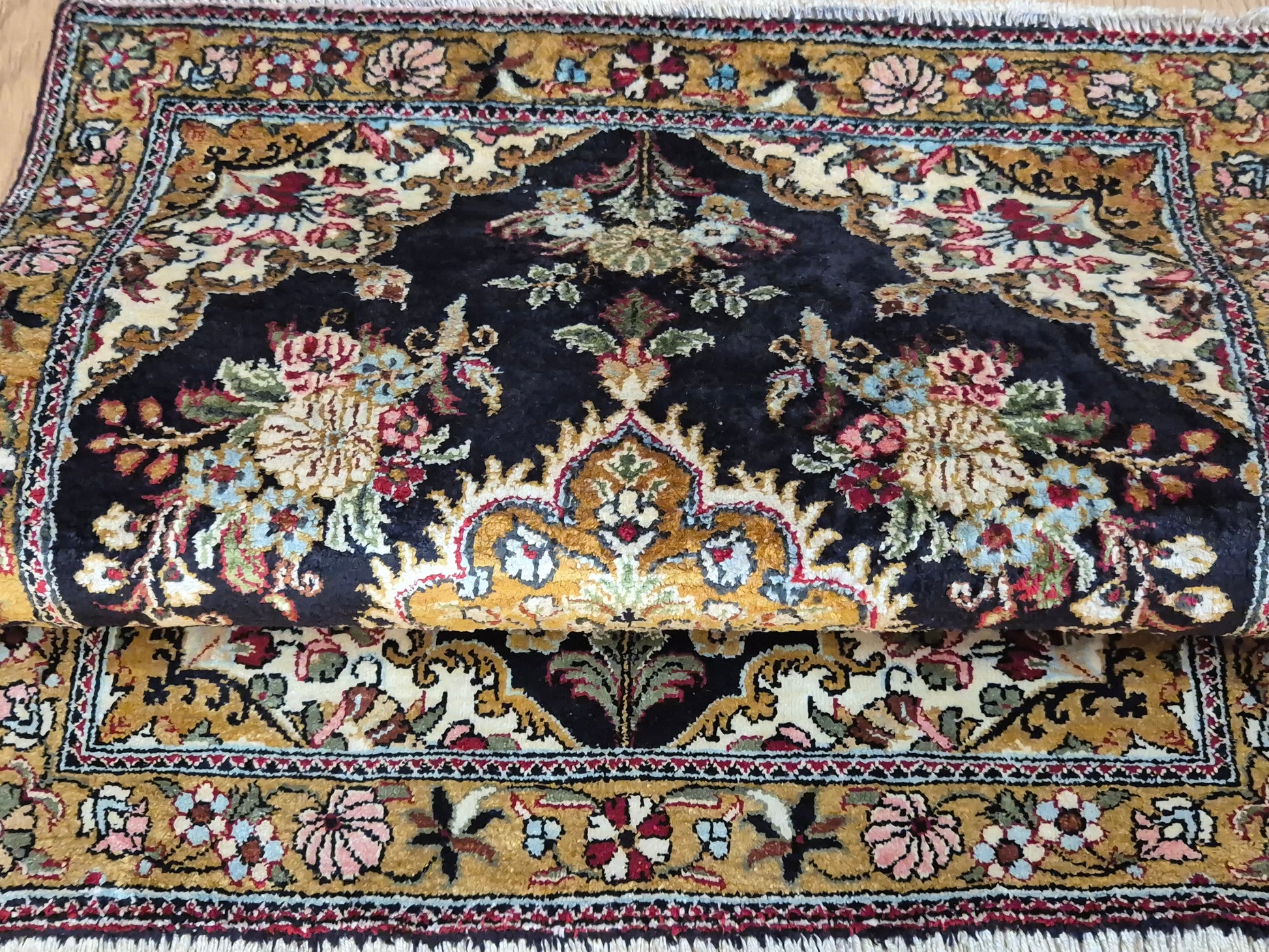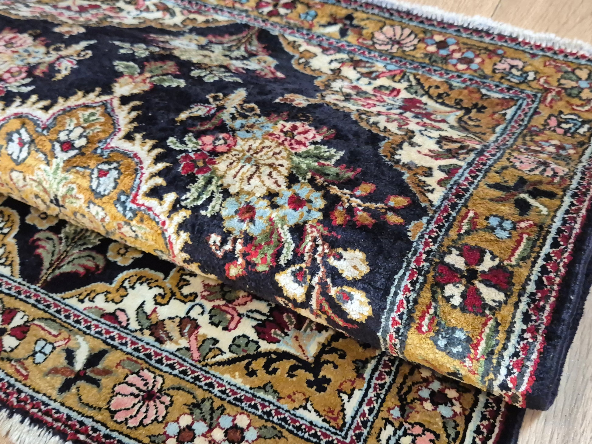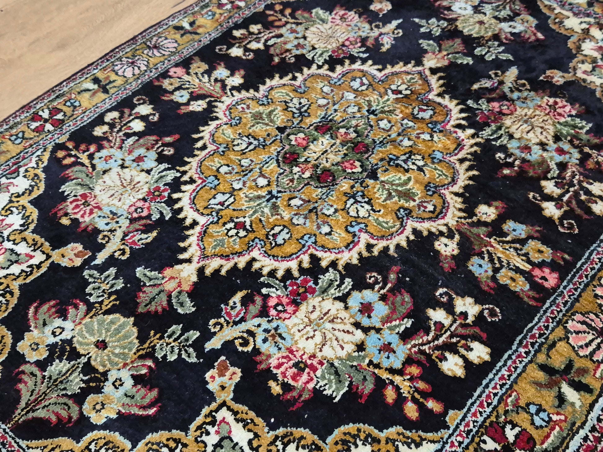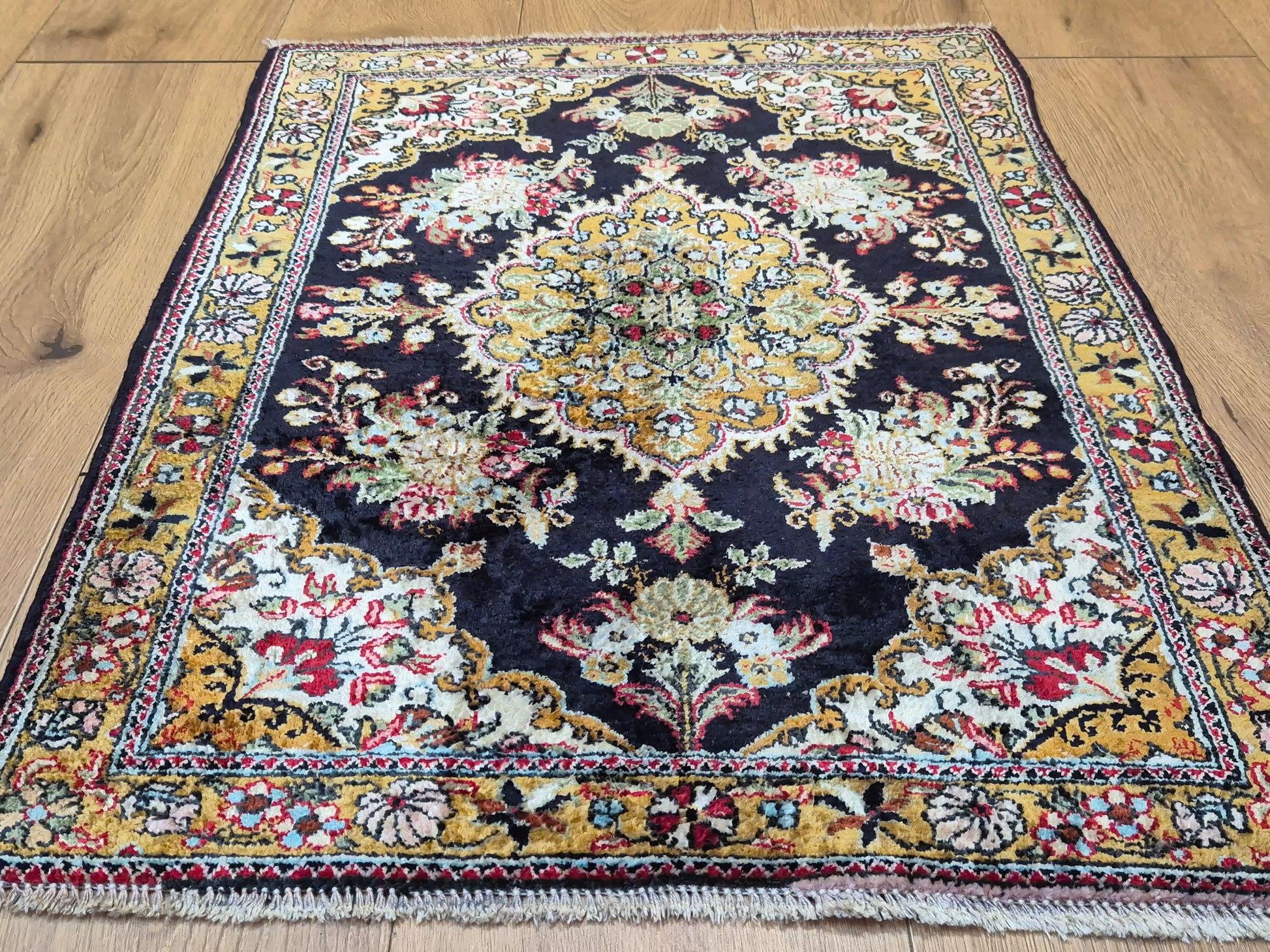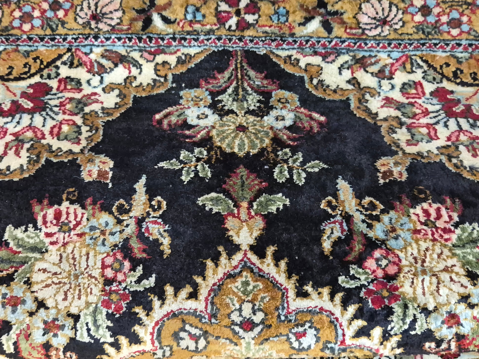 angeboten wird ein edler Ghom Teppich aus reiner Seide, handgeknüpft in feiner Ausführung. Im Zentrum befindet sich ein reich verziertes Medaillon in goldenen Tönen, das von einem tiefschwarzen Fond umgeben ist. Um das Medaillon ranken sich florale Blütenarrangements in harmonischer Farbvielfalt, ergänzt durch eine prachtvolle Bordüre mit kunstvollen Blütenmotiven. Durch die feine Knüpfung und den charakteristischen Seidenglanz entfaltet der Teppich eine elegante, luxuriöse Wirkung.