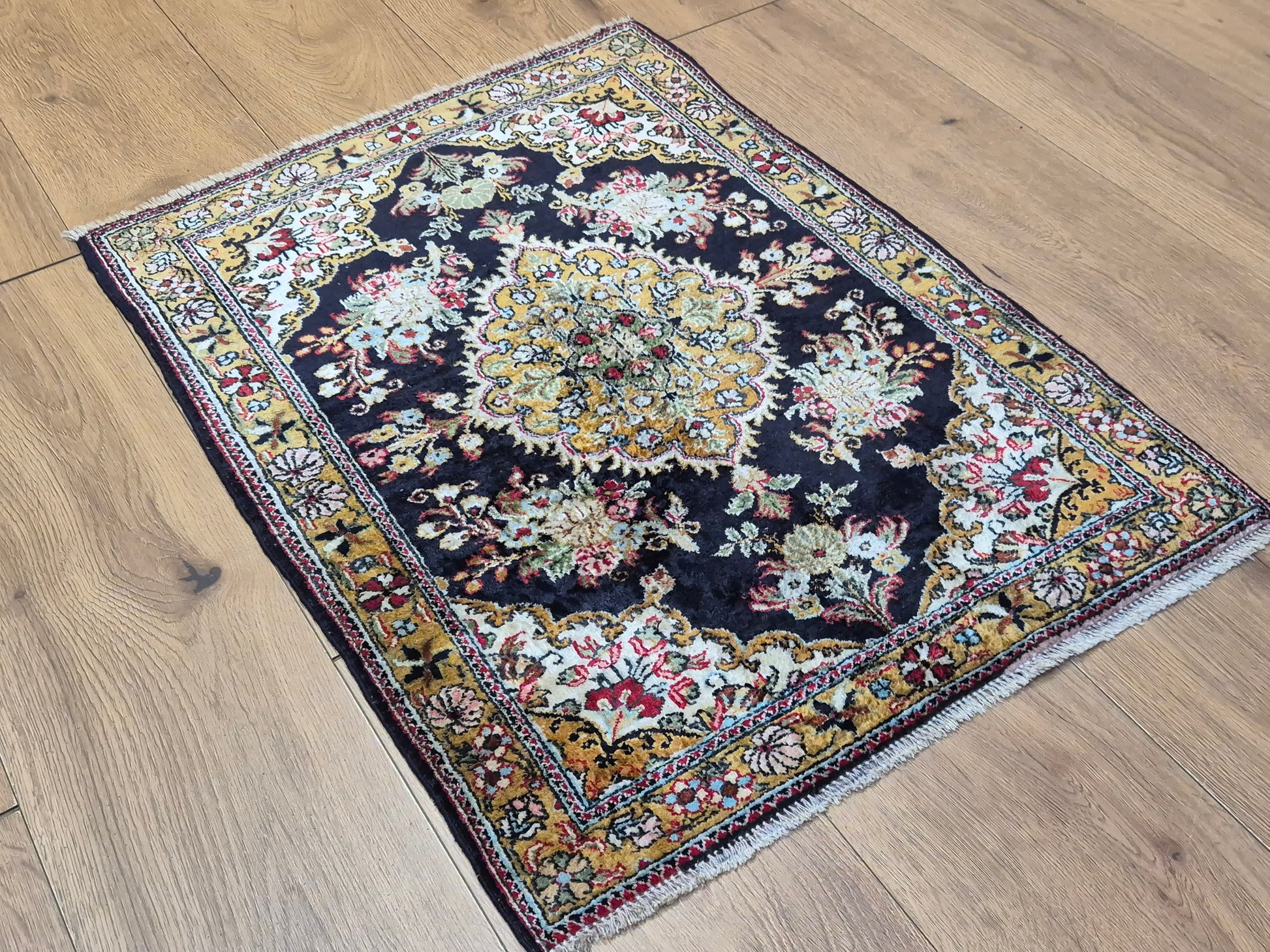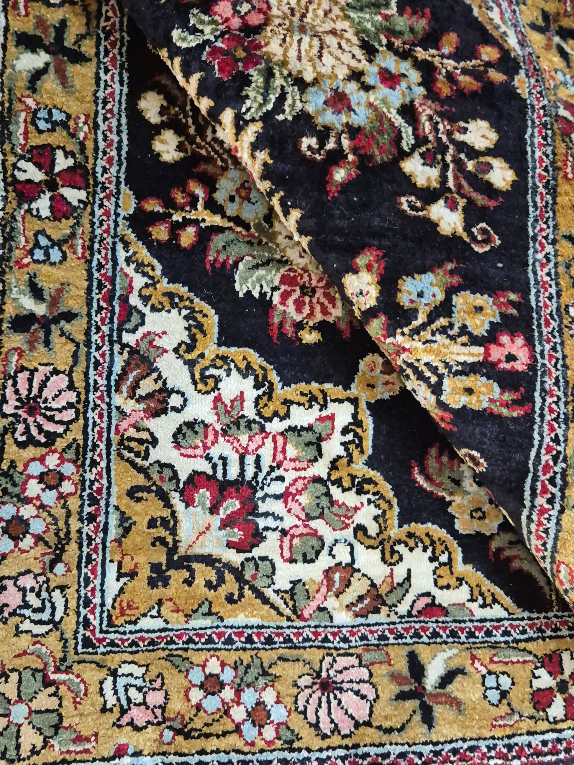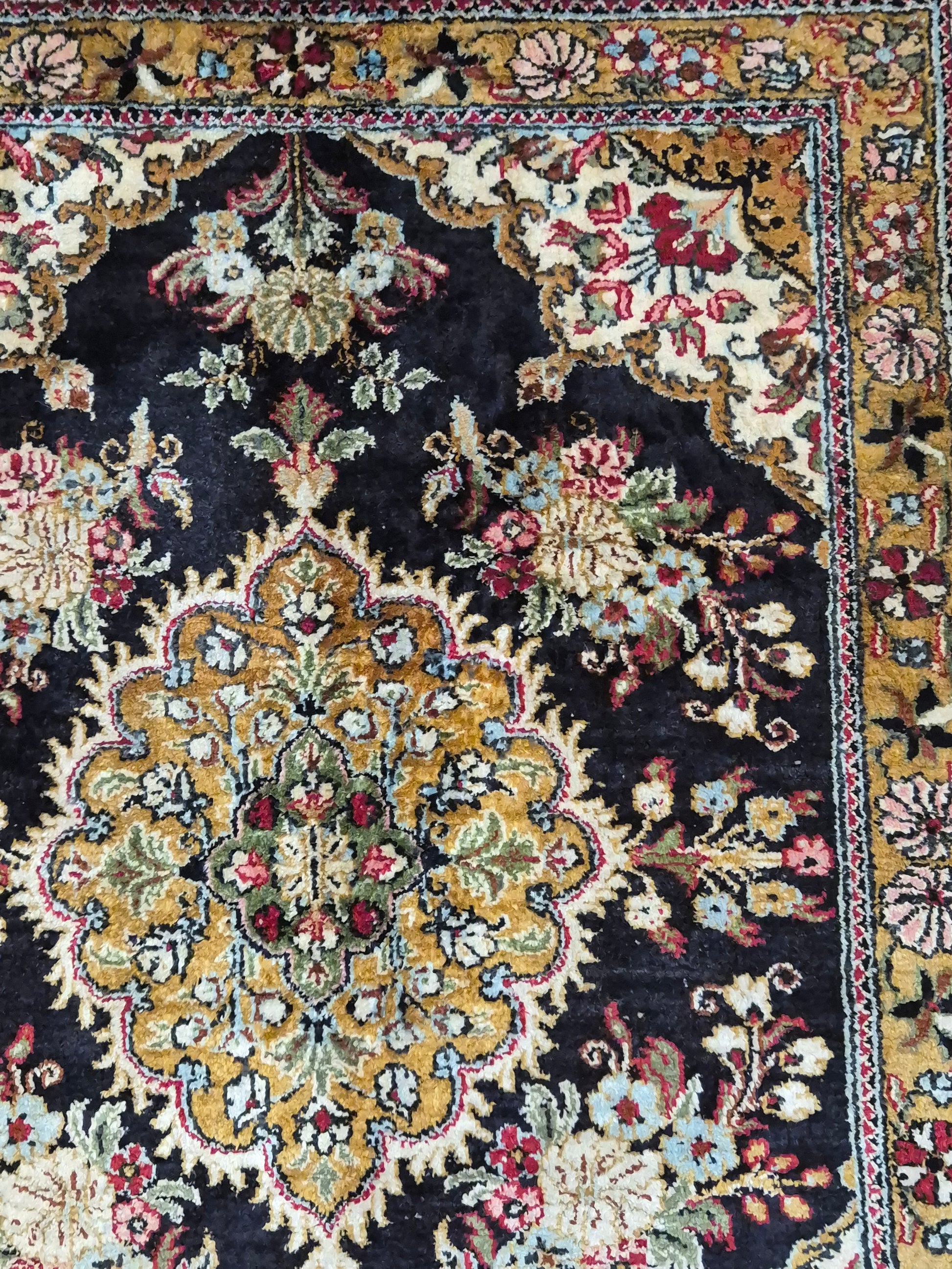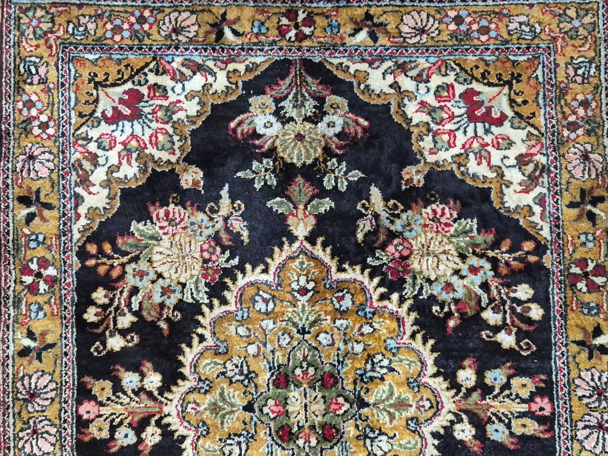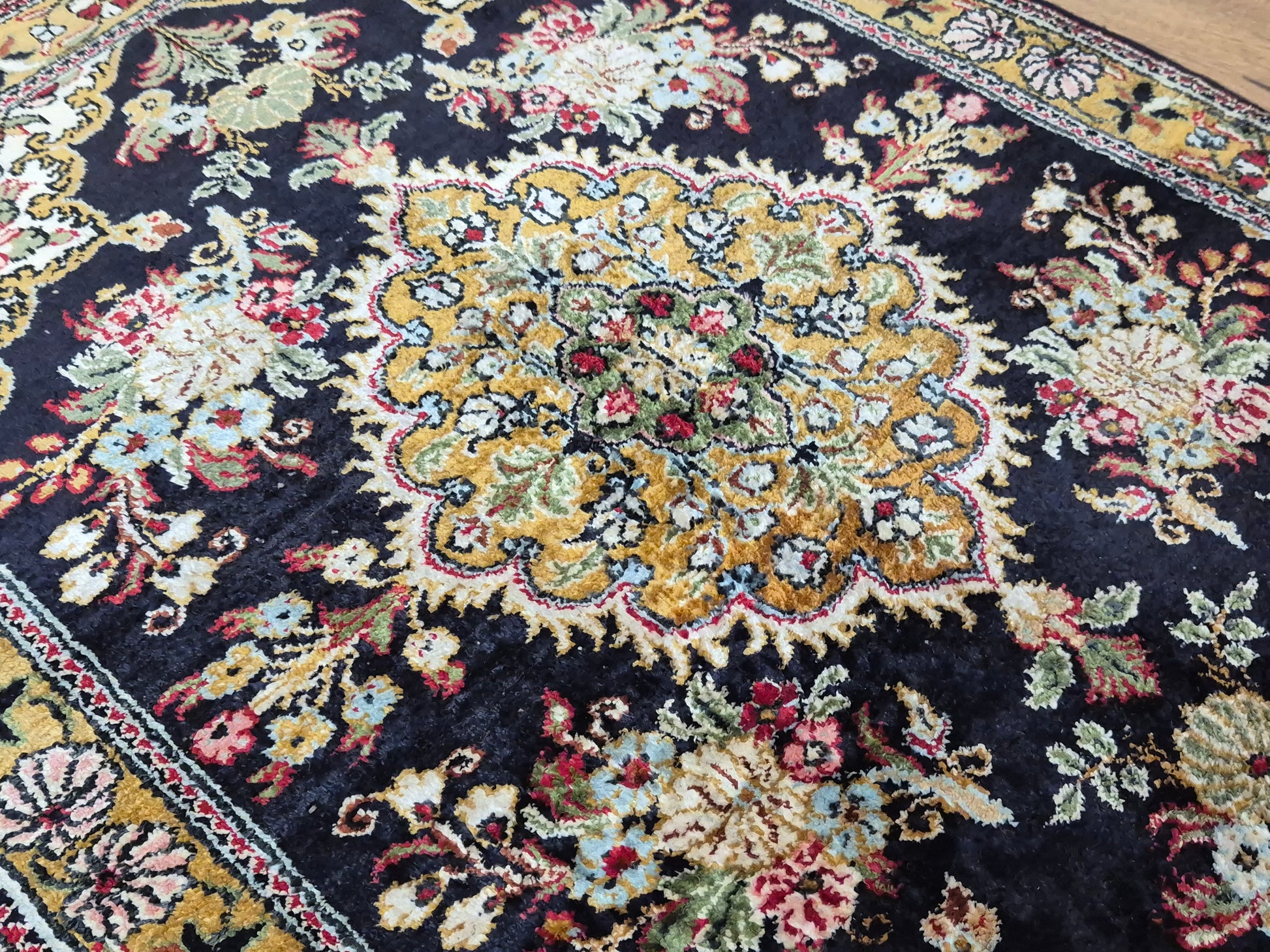 angeboten wird ein edler Ghom Teppich aus reiner Seide, handgeknüpft in feiner Ausführung. Im Zentrum befindet sich ein reich verziertes Medaillon in goldenen Tönen, das von einem tiefschwarzen Fond umgeben ist. Um das Medaillon ranken sich florale Blütenarrangements in harmonischer Farbvielfalt, ergänzt durch eine prachtvolle Bordüre mit kunstvollen Blütenmotiven. Durch die feine Knüpfung und den charakteristischen Seidenglanz entfaltet der Teppich eine elegante, luxuriöse Wirkung.