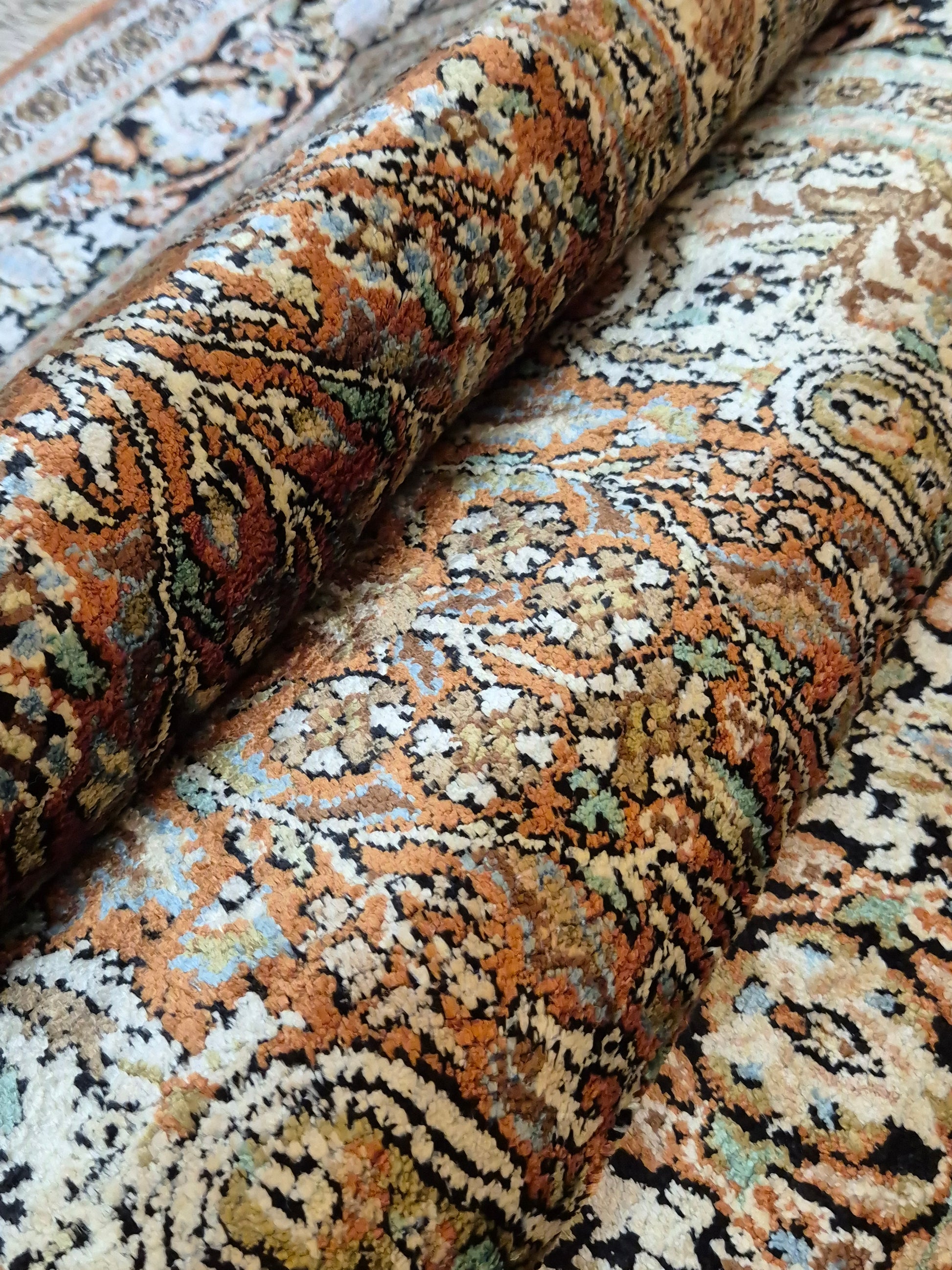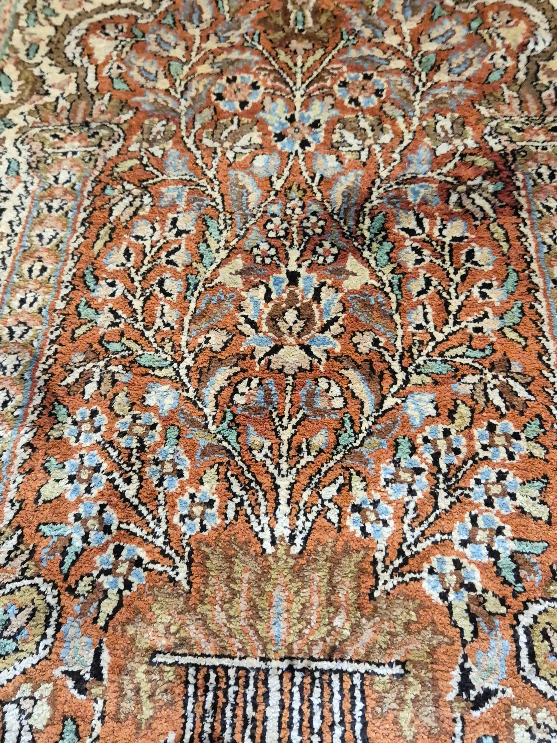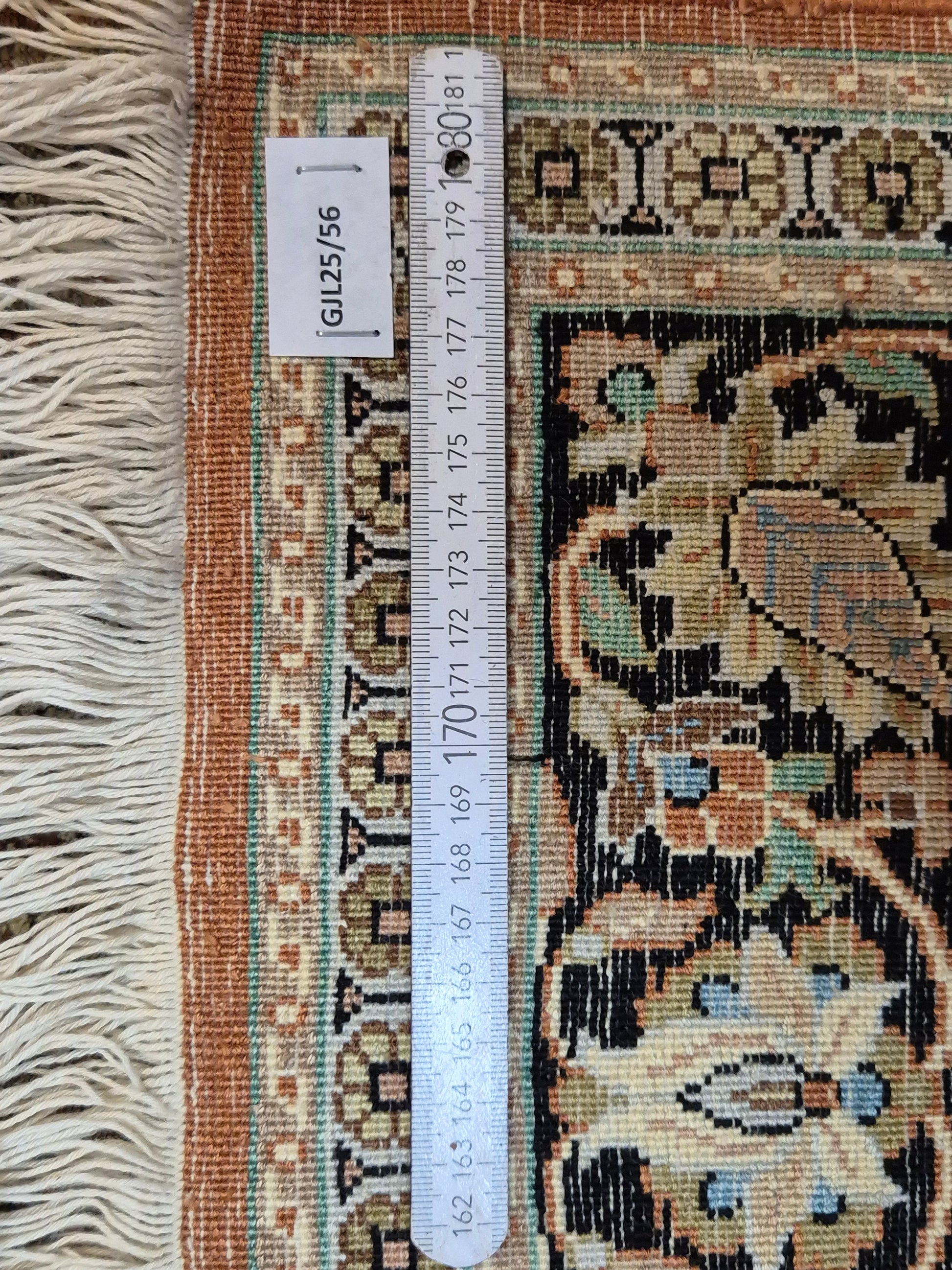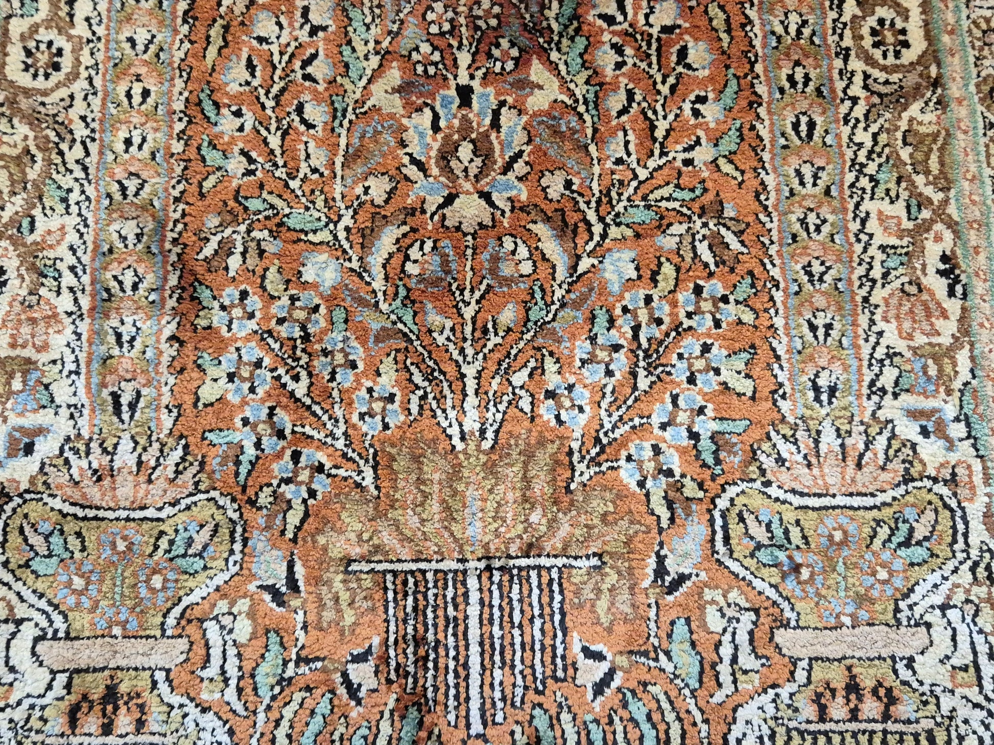 angeboten wird ein kunstvoller Ghom Teppich aus reiner Seide, handgeknüpft in feiner Knüpftechnik. Das zentrale Motiv zeigt den „Lebensbaum“, der sich symmetrisch aus einer Vase heraus emporhebt und sich in reich verzierten Blüten und Ranken entfaltet. Dieses klassische Symbol der Unendlichkeit und des Lebens ist von fein gearbeiteten Bordüren mit floralen Ornamenten umrahmt. Der Seidenglanz und die harmonische Farbgebung verleihen dem Teppich eine edle Ausstrahlung.