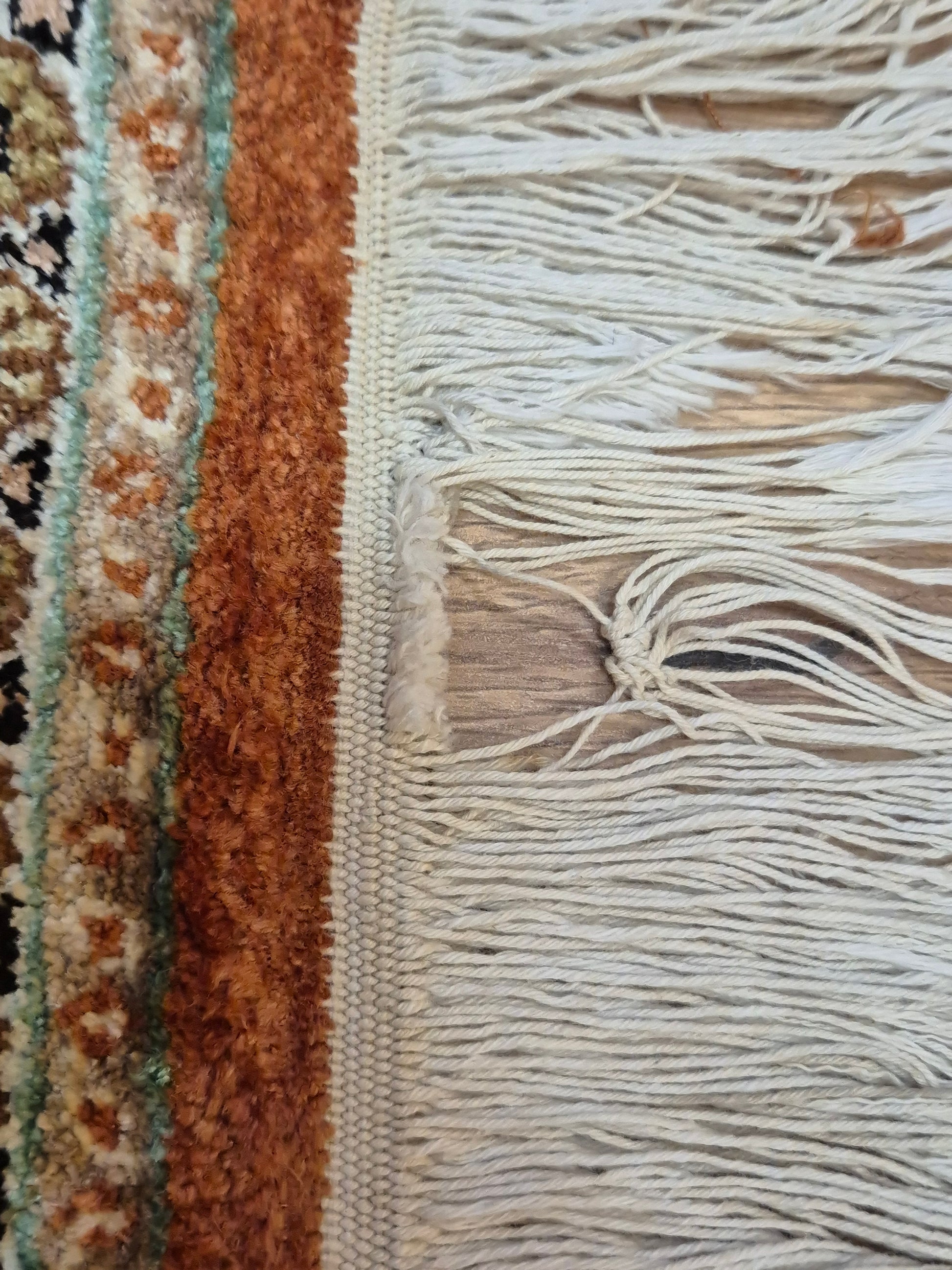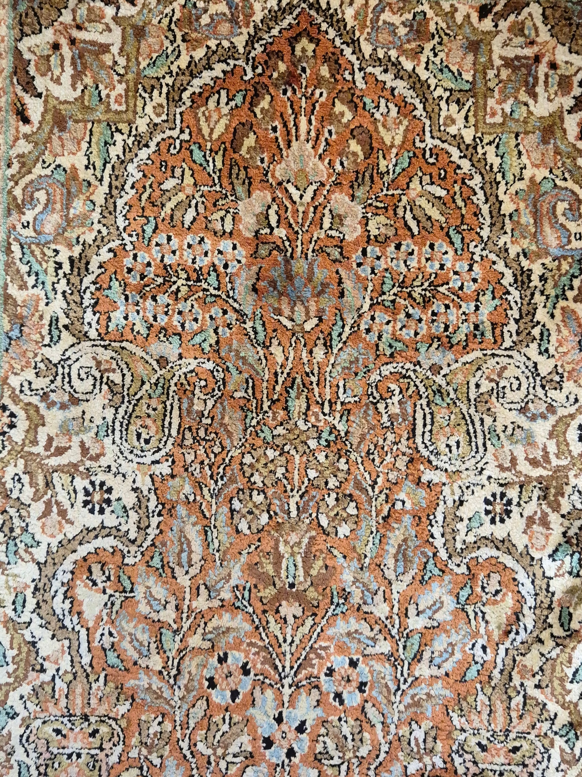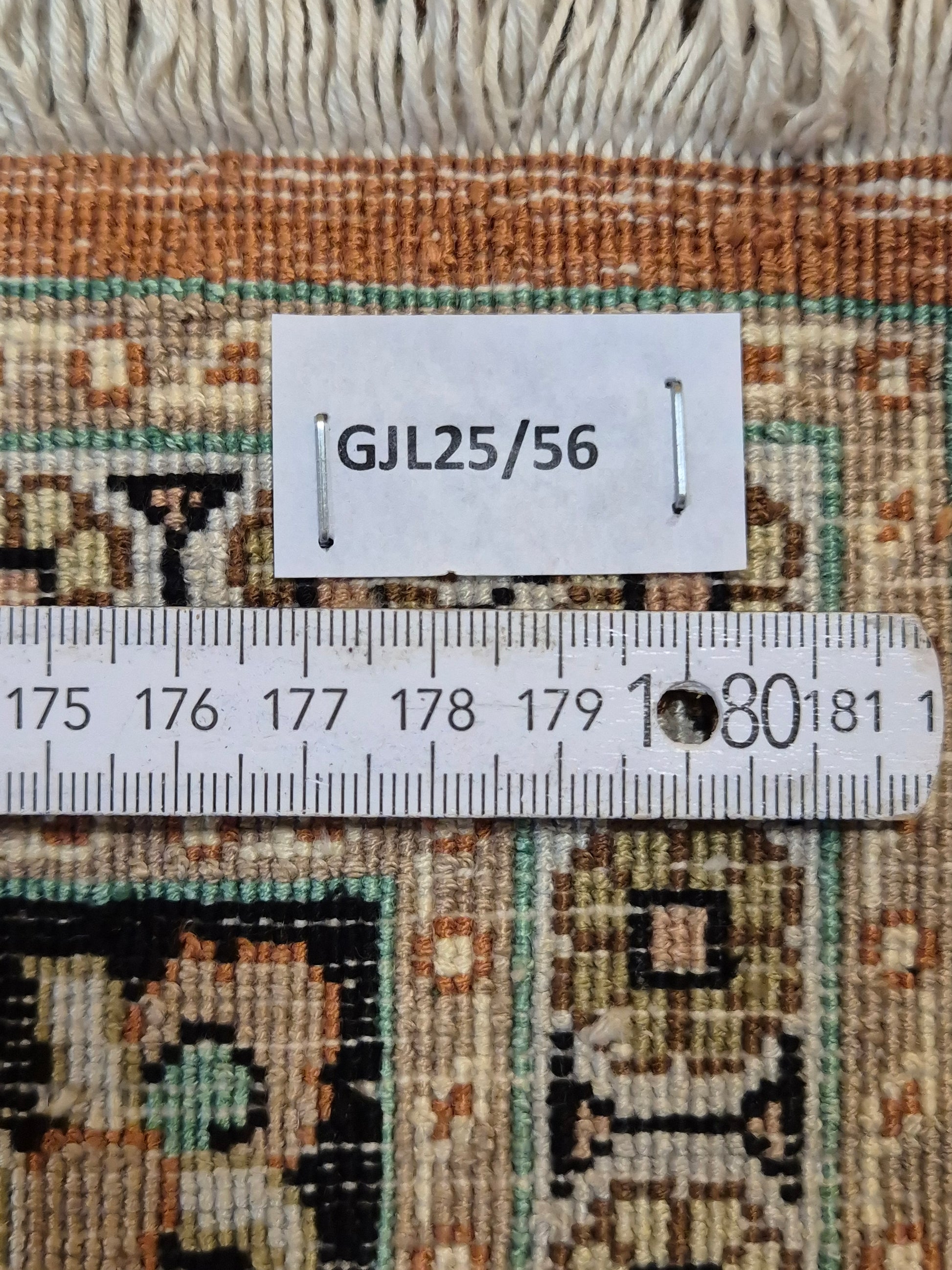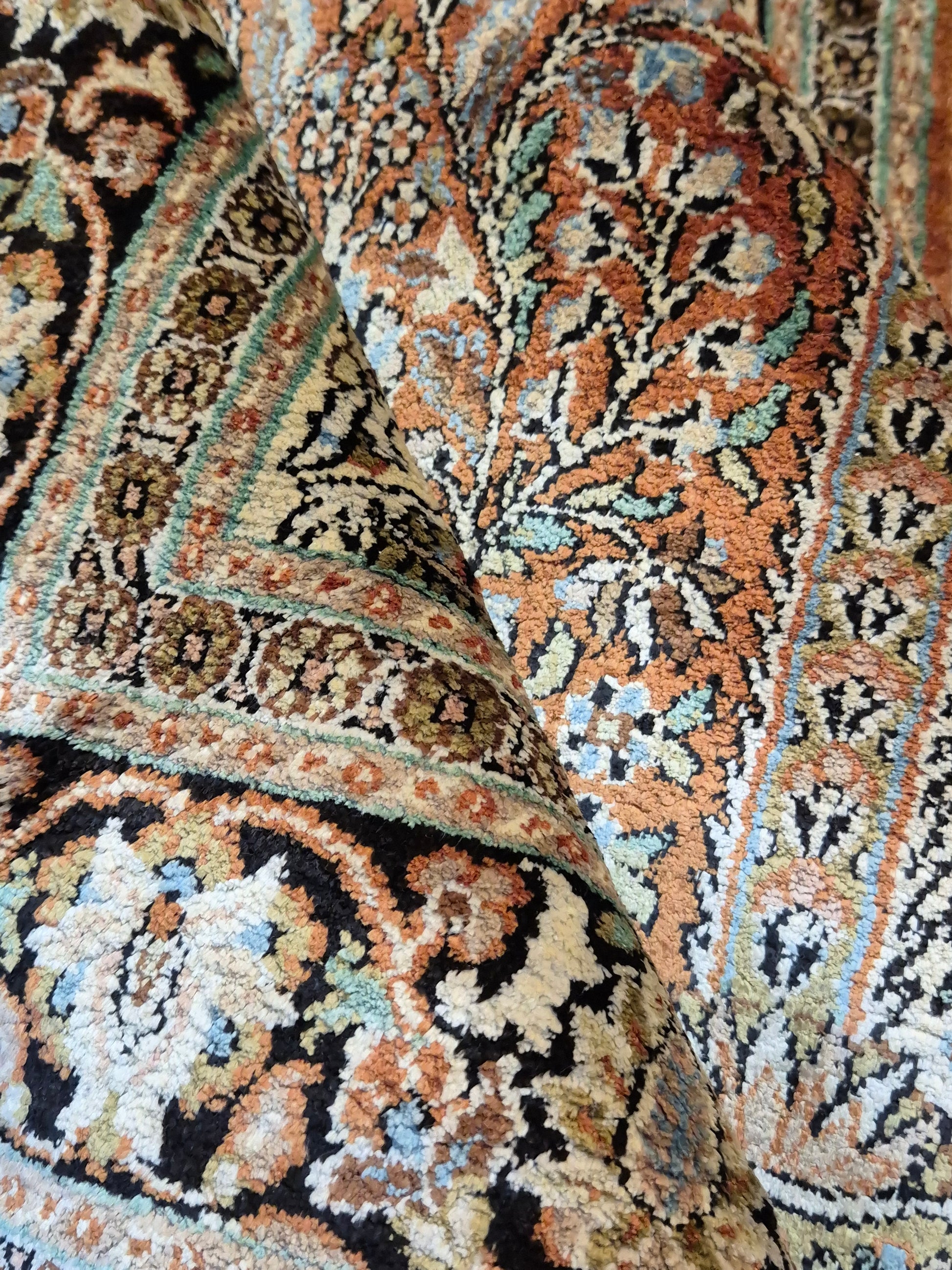 angeboten wird ein kunstvoller Ghom Teppich aus reiner Seide, handgeknüpft in feiner Knüpftechnik. Das zentrale Motiv zeigt den „Lebensbaum“, der sich symmetrisch aus einer Vase heraus emporhebt und sich in reich verzierten Blüten und Ranken entfaltet. Dieses klassische Symbol der Unendlichkeit und des Lebens ist von fein gearbeiteten Bordüren mit floralen Ornamenten umrahmt. Der Seidenglanz und die harmonische Farbgebung verleihen dem Teppich eine edle Ausstrahlung.