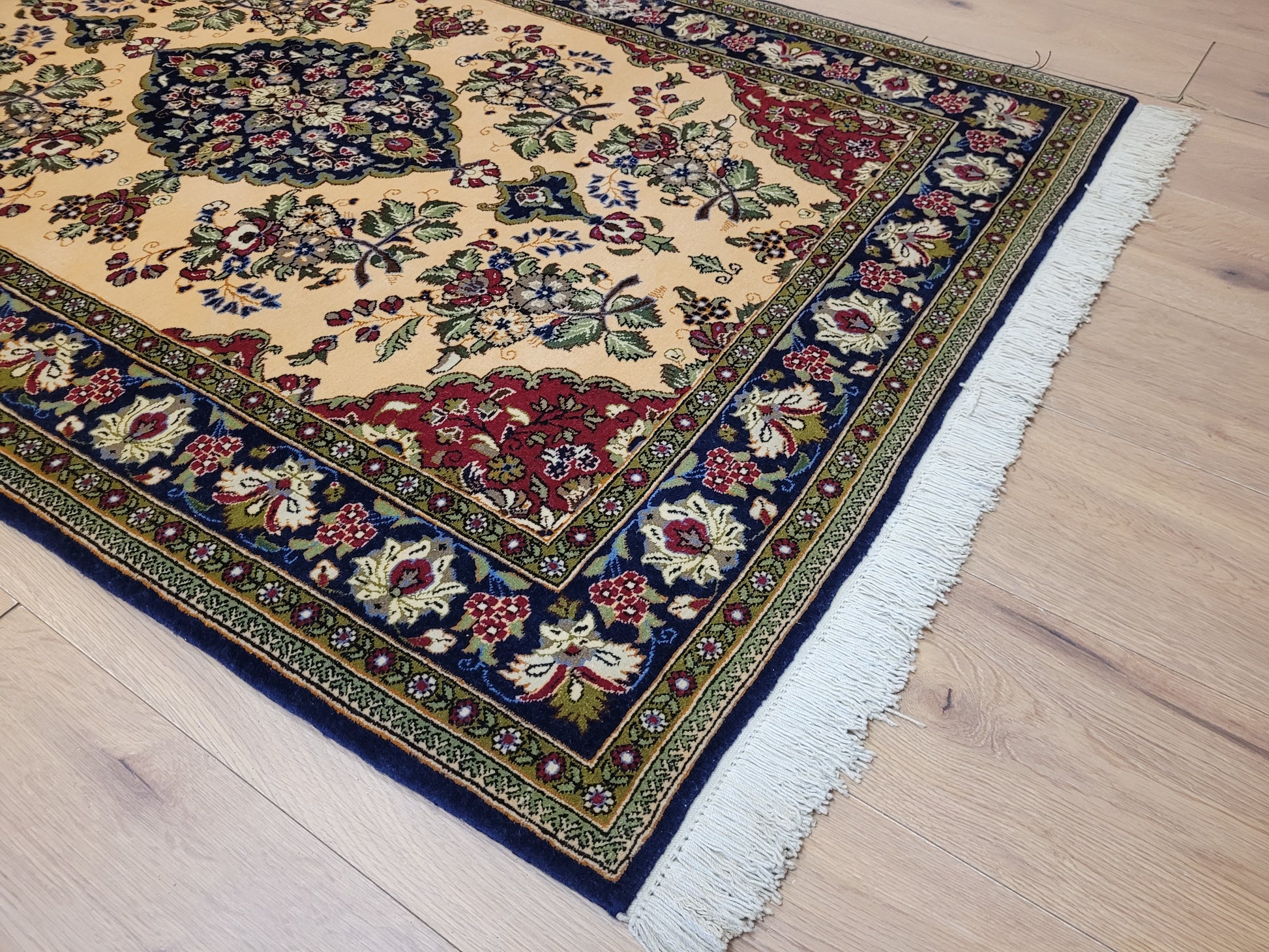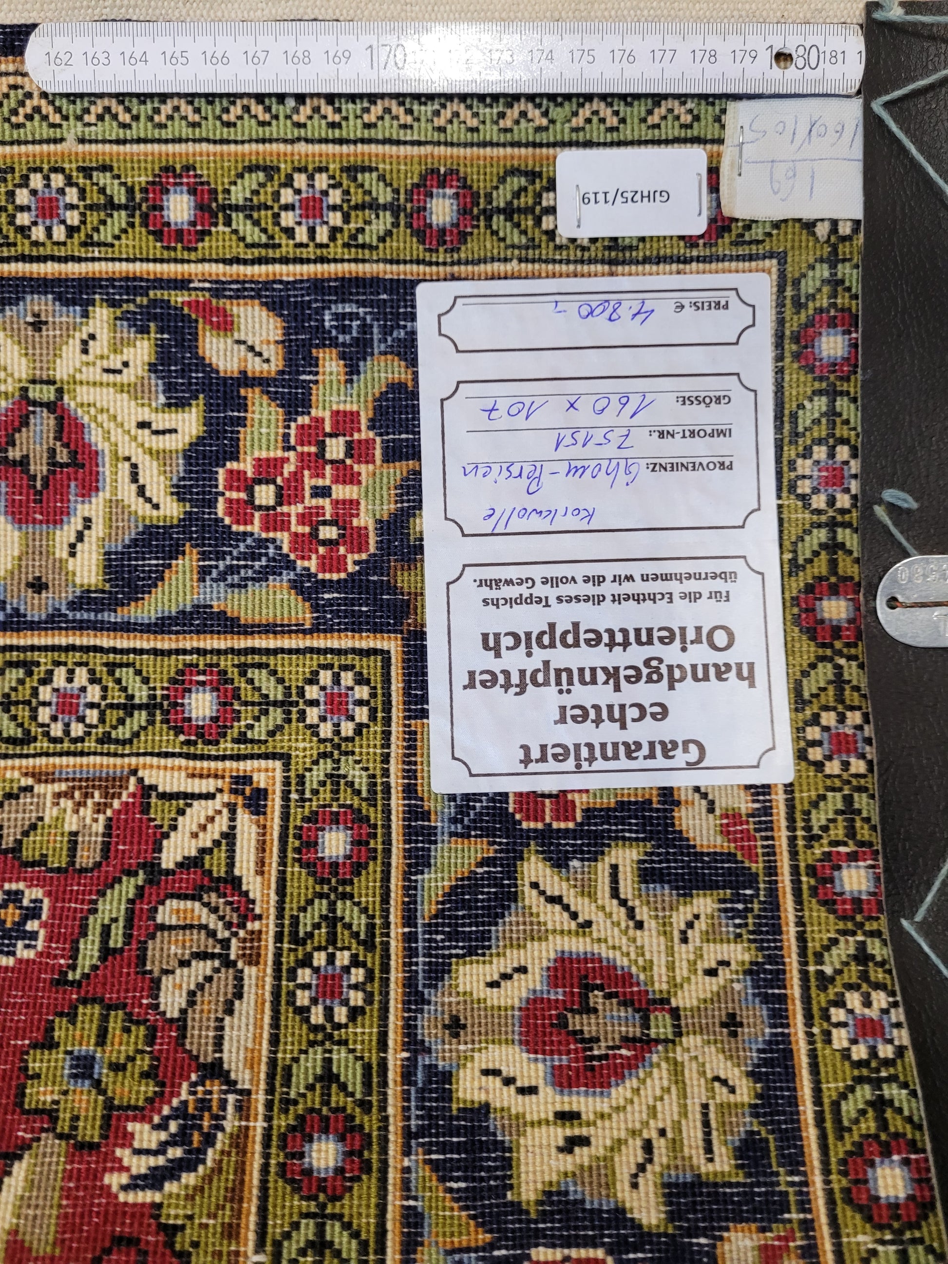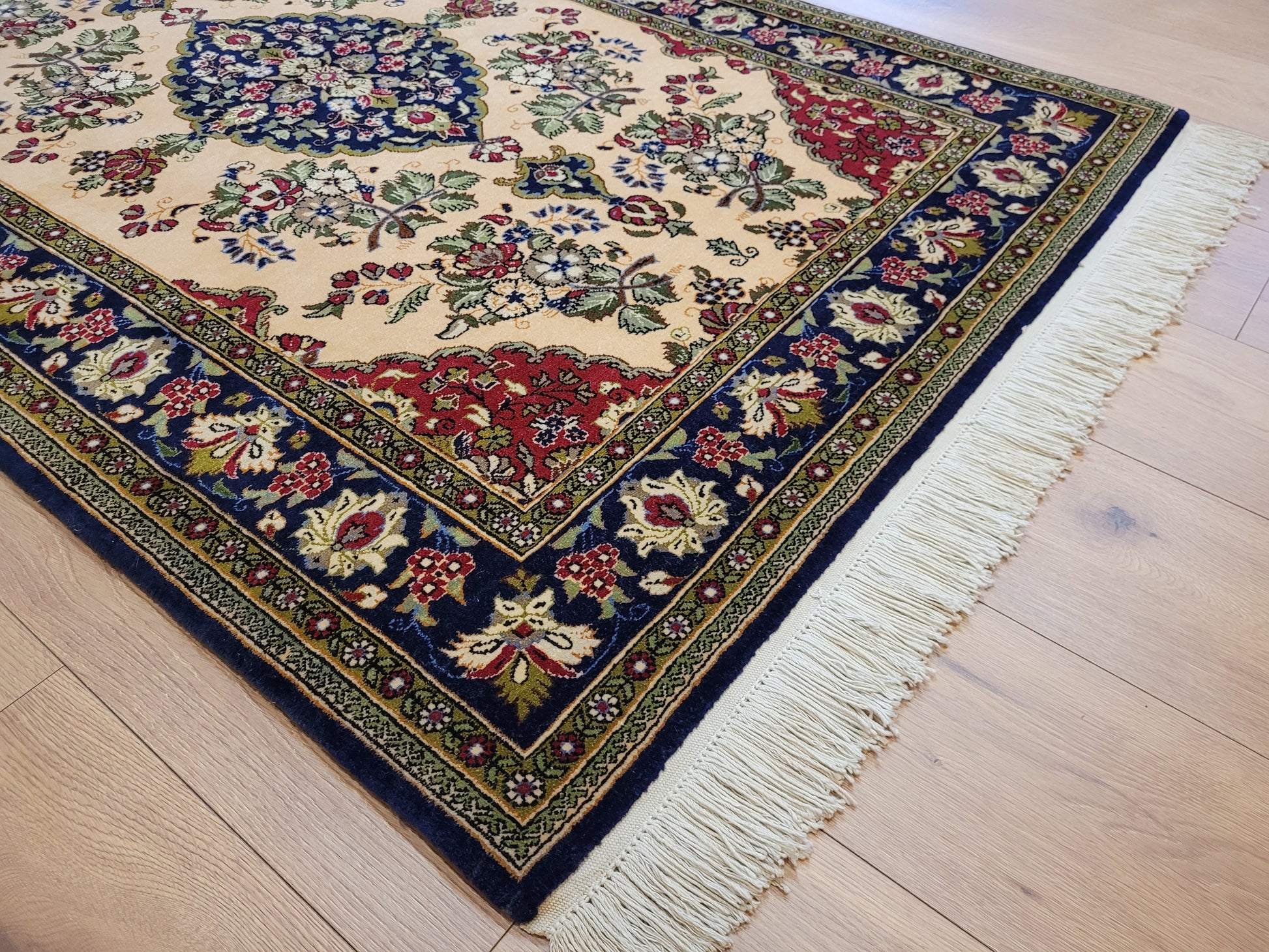 angeboten wird ein klassischer Ghom Teppich aus feiner Korkwolle, handgeknüpft mit hoher Präzision. Das Teppichfeld zeigt ein zentrales Medaillon in dunklem Blau, umgeben von reich verzierten Blüten- und Rankenmotiven. Eckzwickel in Rot und ein floraler Rahmen in Dunkelblau mit filigranen Blütenornamenten vollenden das harmonische Gesamtbild.
