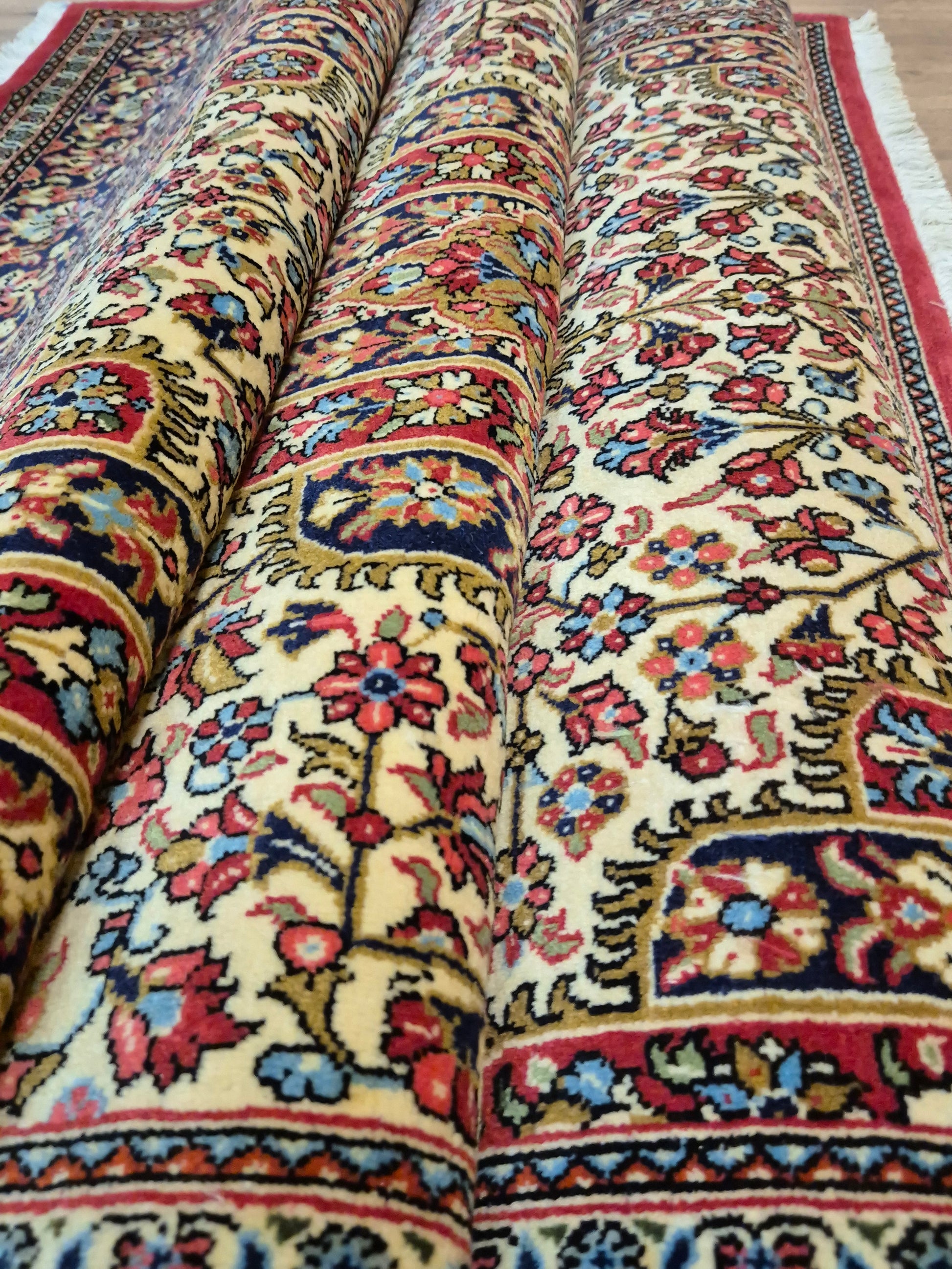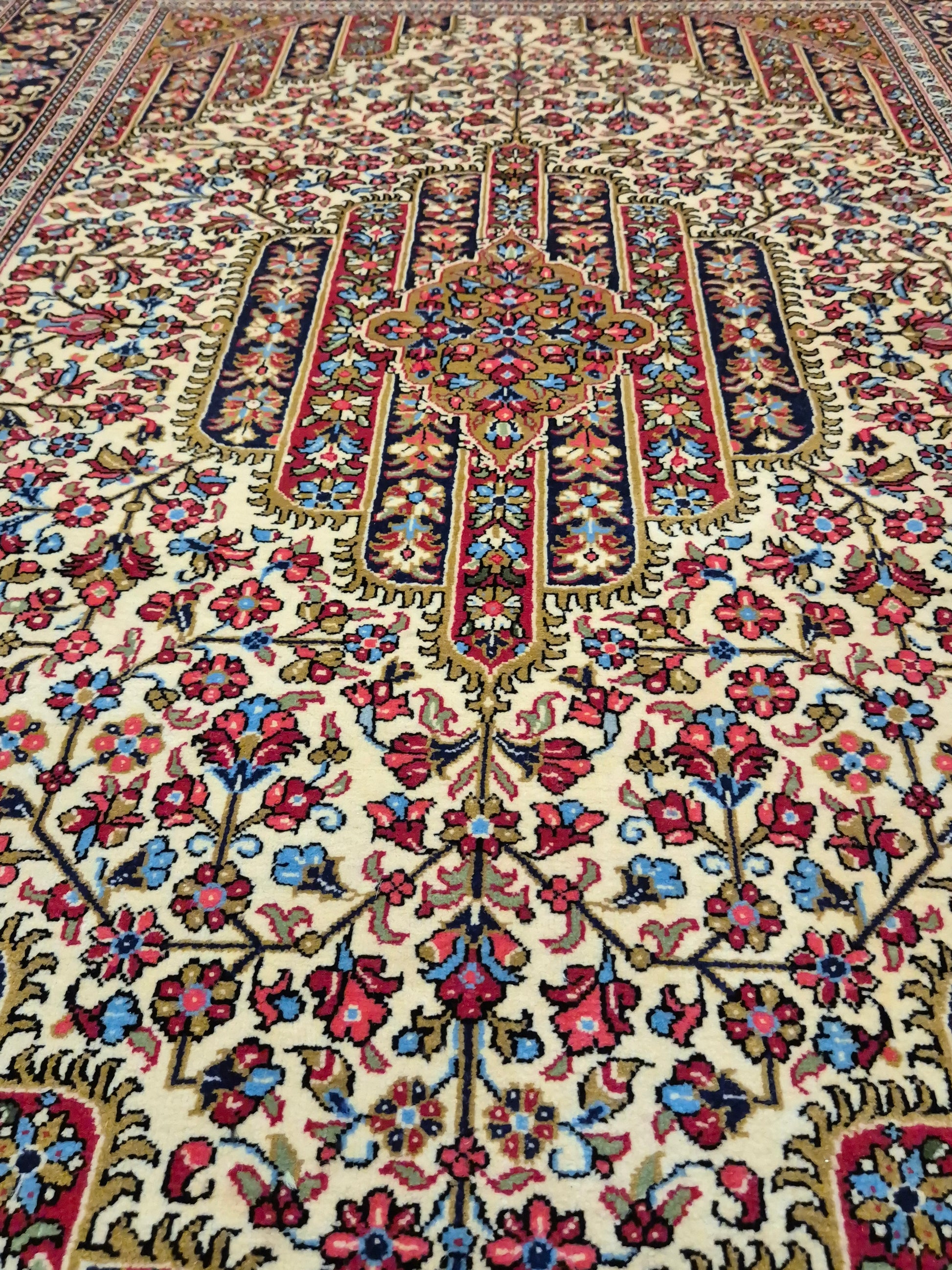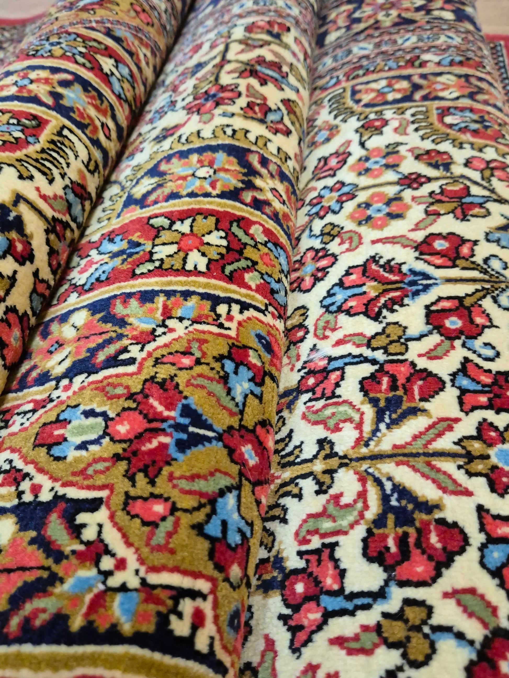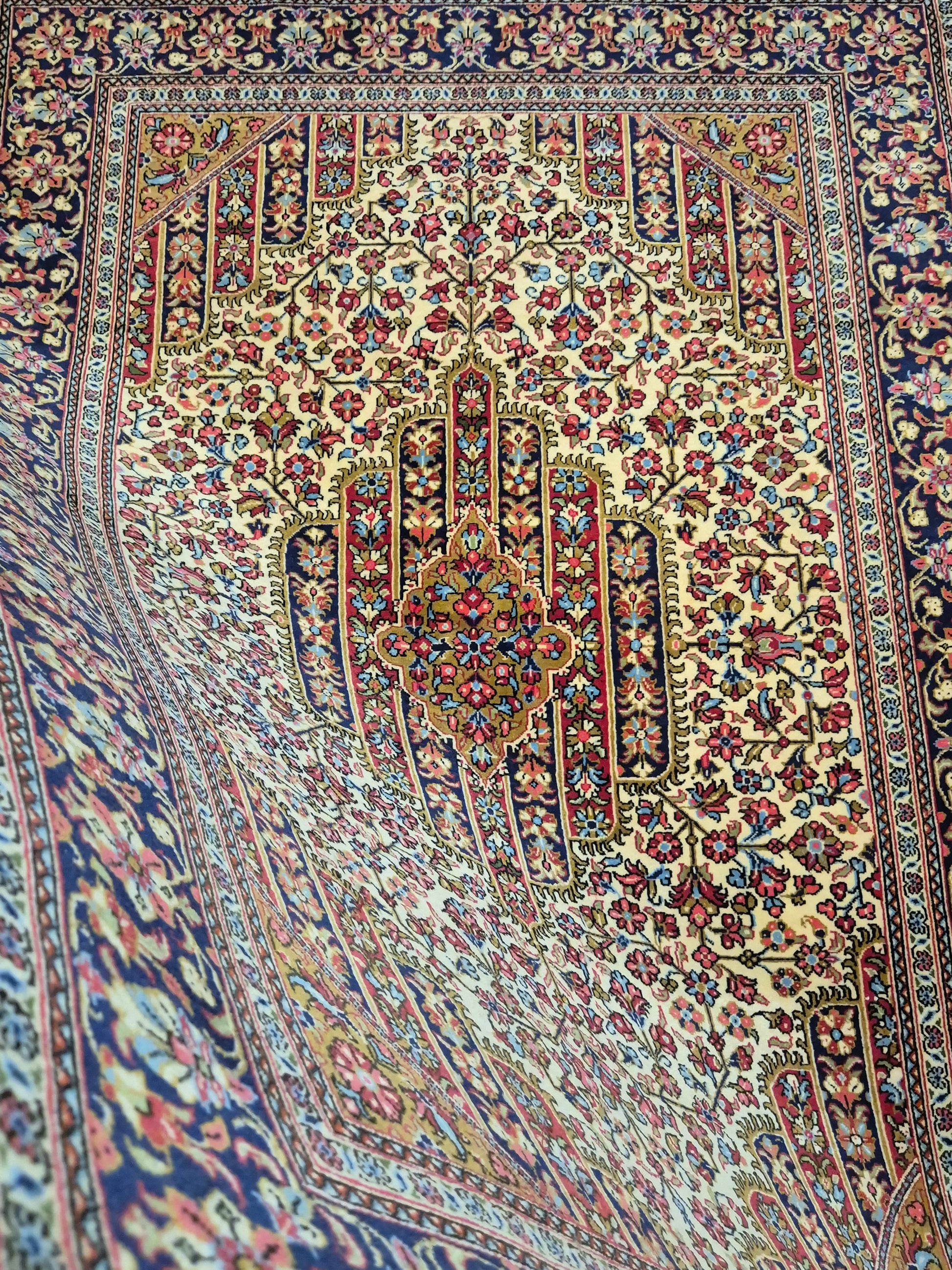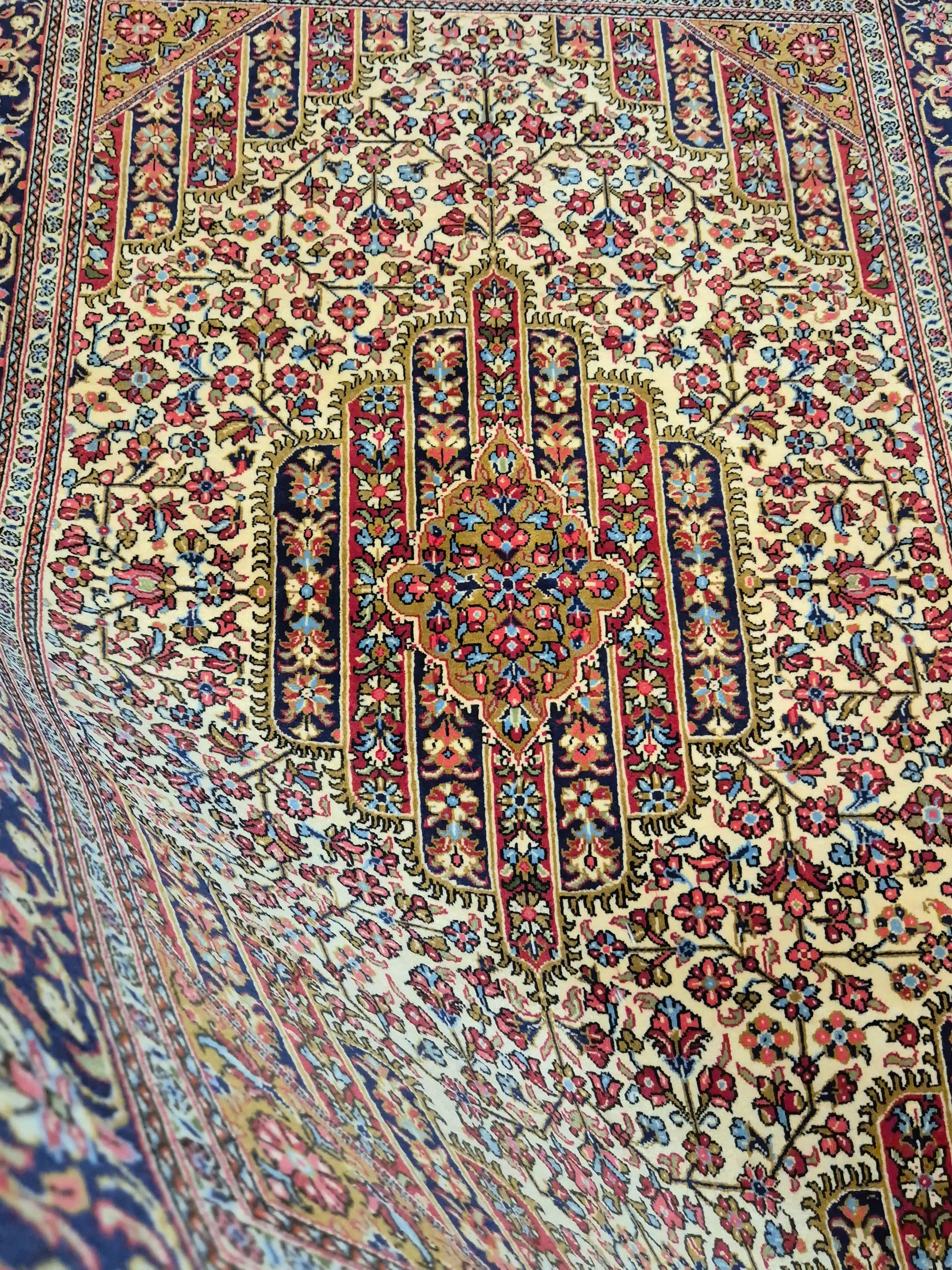 angeboten wird ein edler Ghom Teppich aus feiner Korkwolle, handgeknüpft in detailreicher Ausführung. Das zentrale Medaillon ist floral ausgearbeitet und wird von einem reich geschmückten Fond aus Ranken und Blüten begleitet. Die elegante Komposition aus klarer Symmetrie, kunstvollen Eckzwickeln und einer fein gemusterten Bordüre unterstreicht die meisterhafte Knüpfkunst dieses Teppichs.