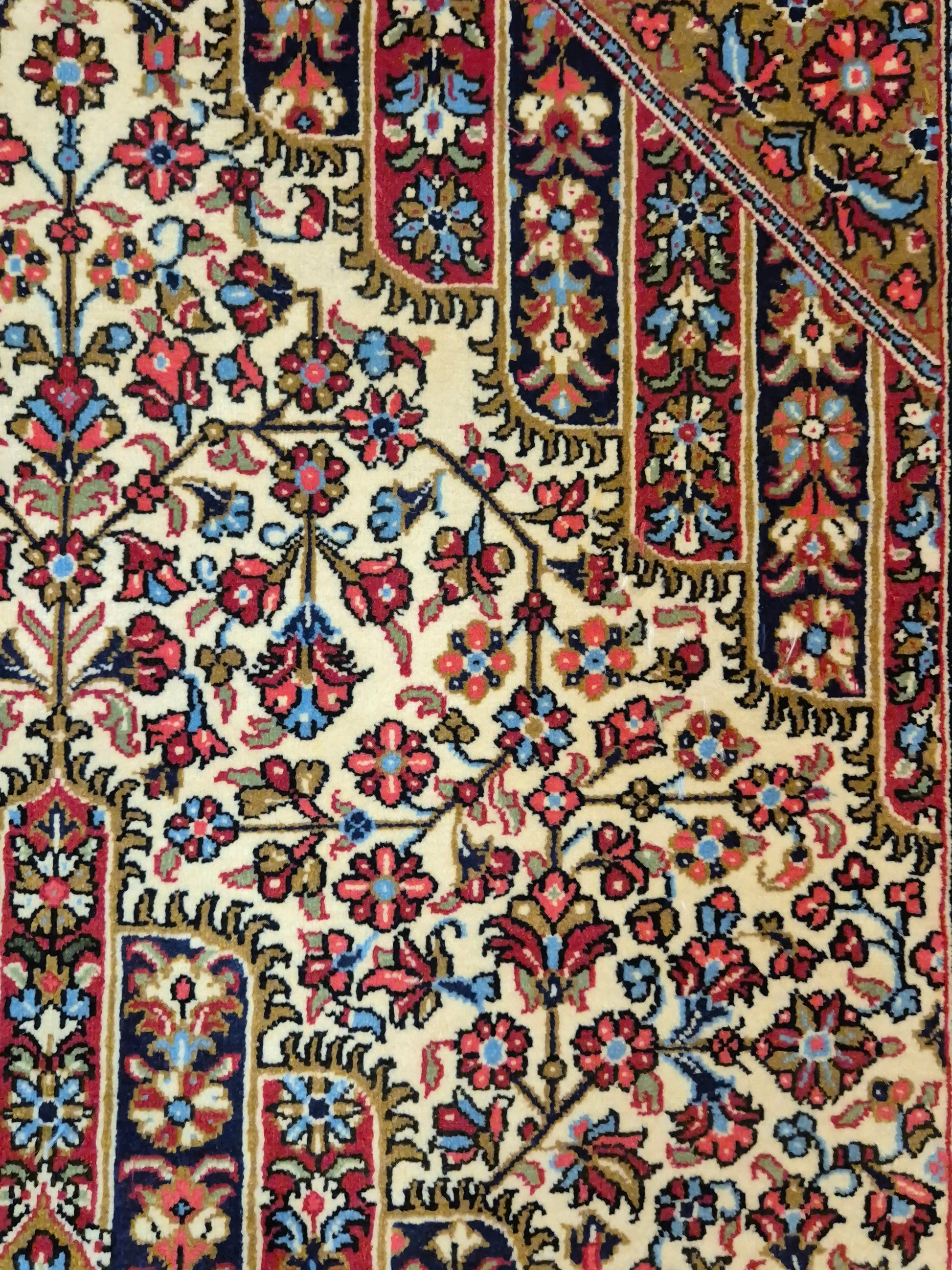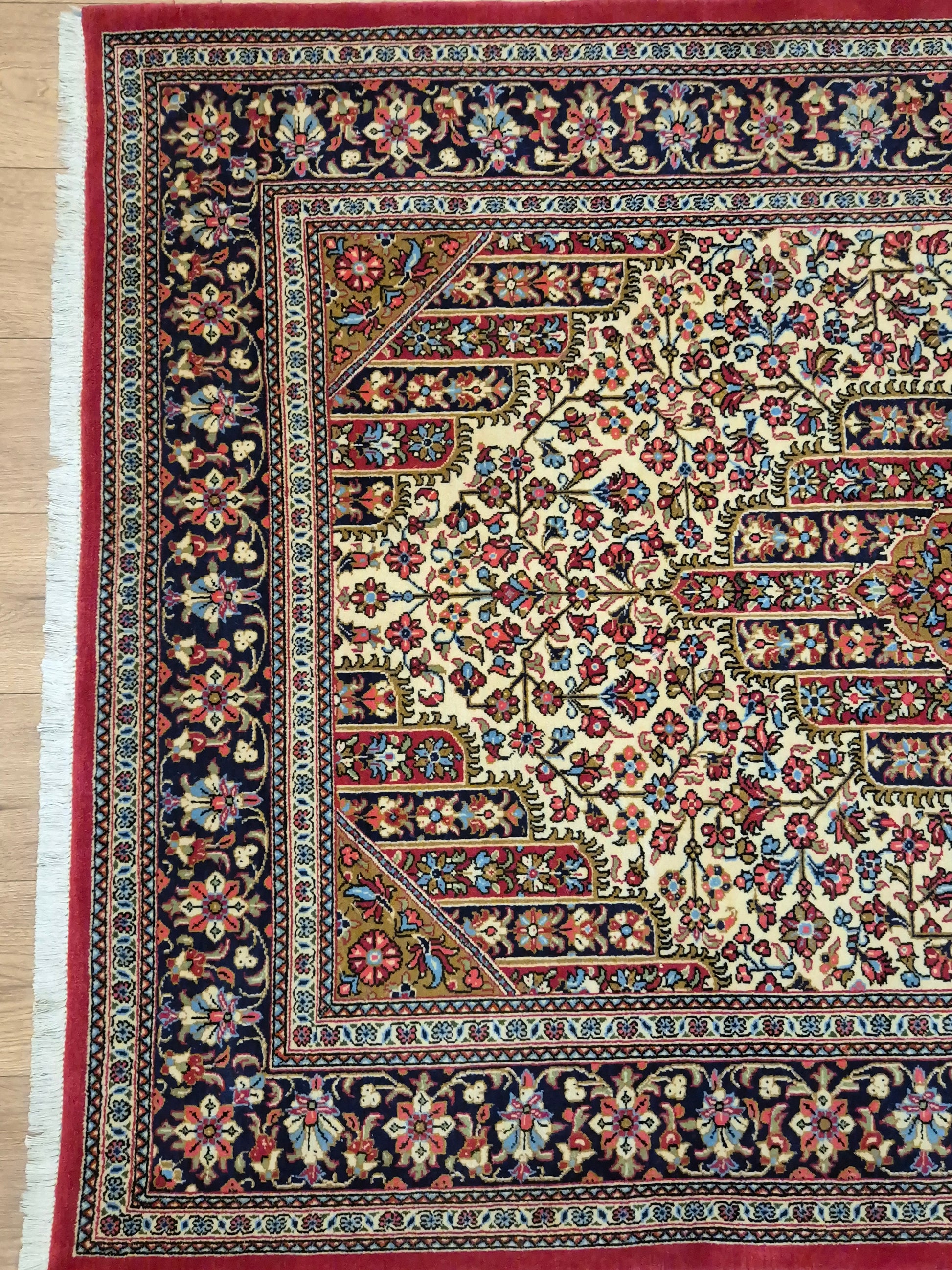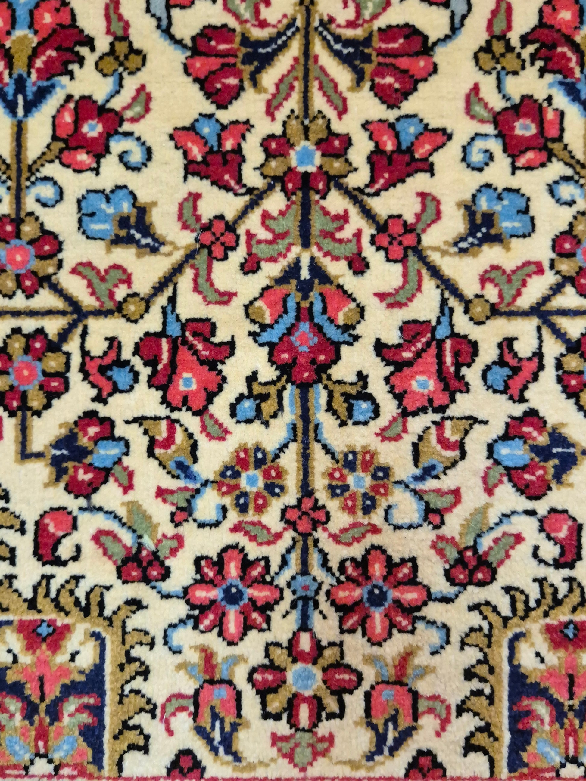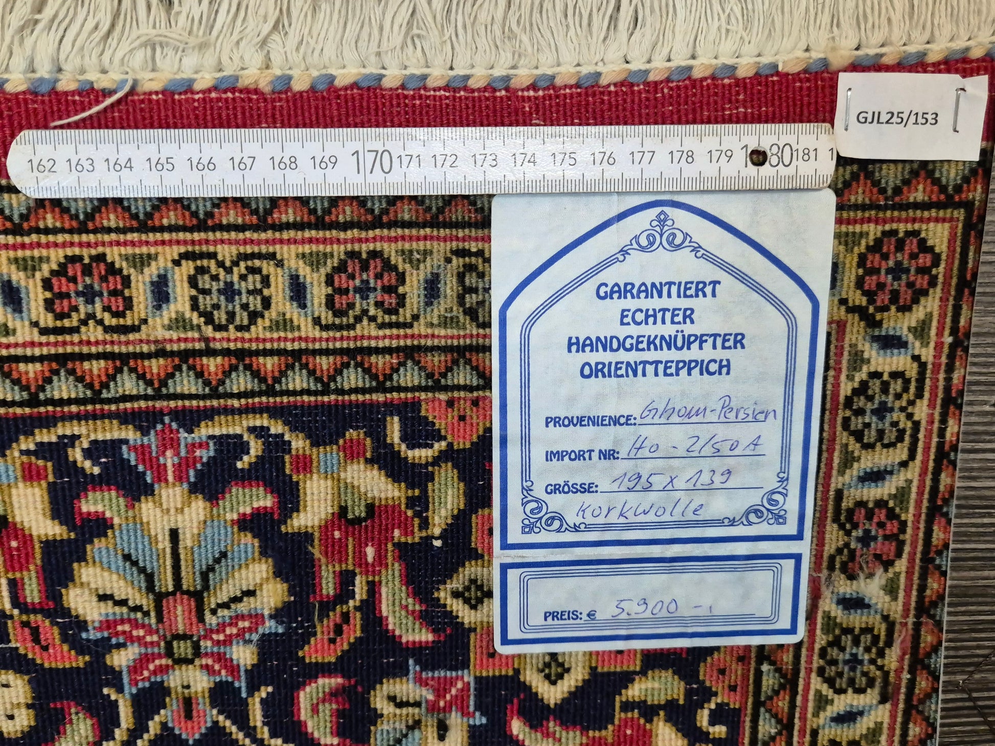 angeboten wird ein edler Ghom Teppich aus feiner Korkwolle, handgeknüpft in detailreicher Ausführung. Das zentrale Medaillon ist floral ausgearbeitet und wird von einem reich geschmückten Fond aus Ranken und Blüten begleitet. Die elegante Komposition aus klarer Symmetrie, kunstvollen Eckzwickeln und einer fein gemusterten Bordüre unterstreicht die meisterhafte Knüpfkunst dieses Teppichs.
