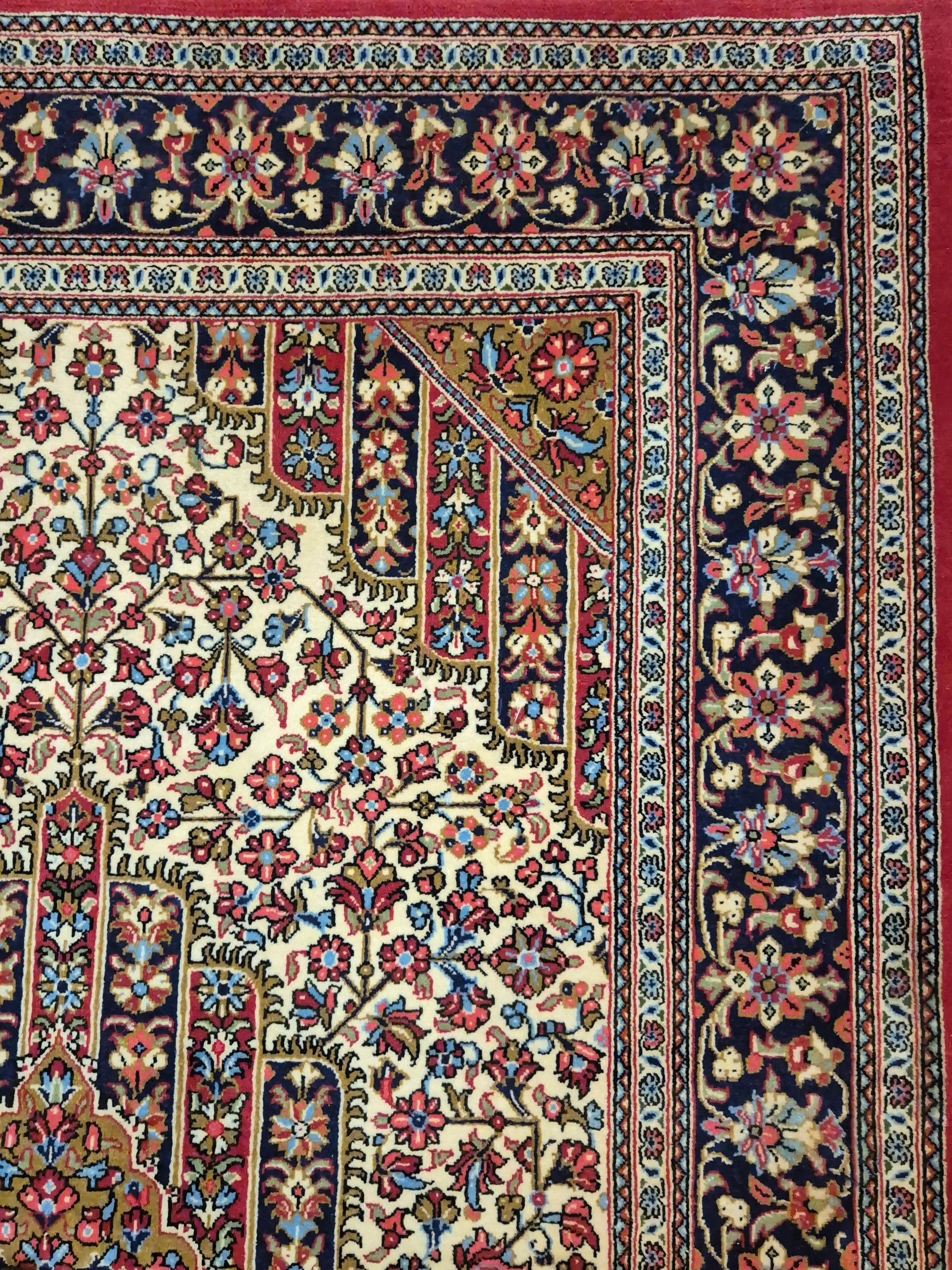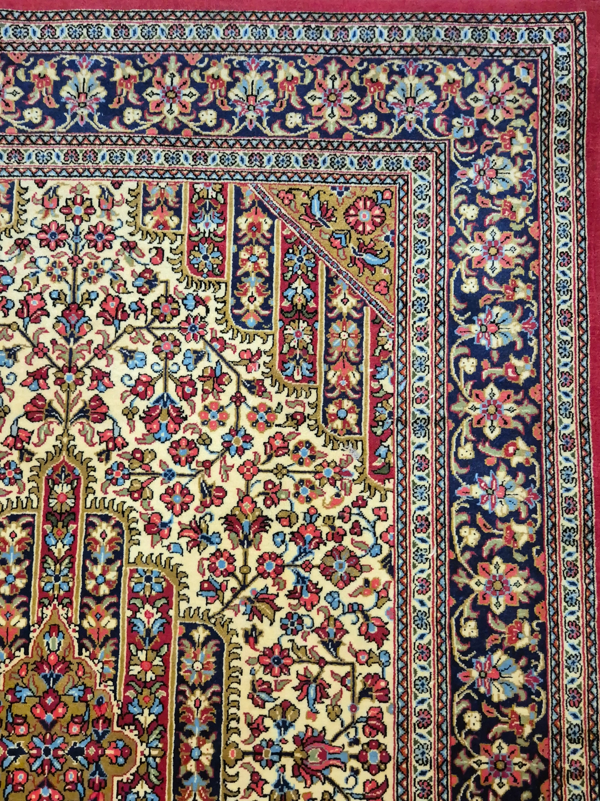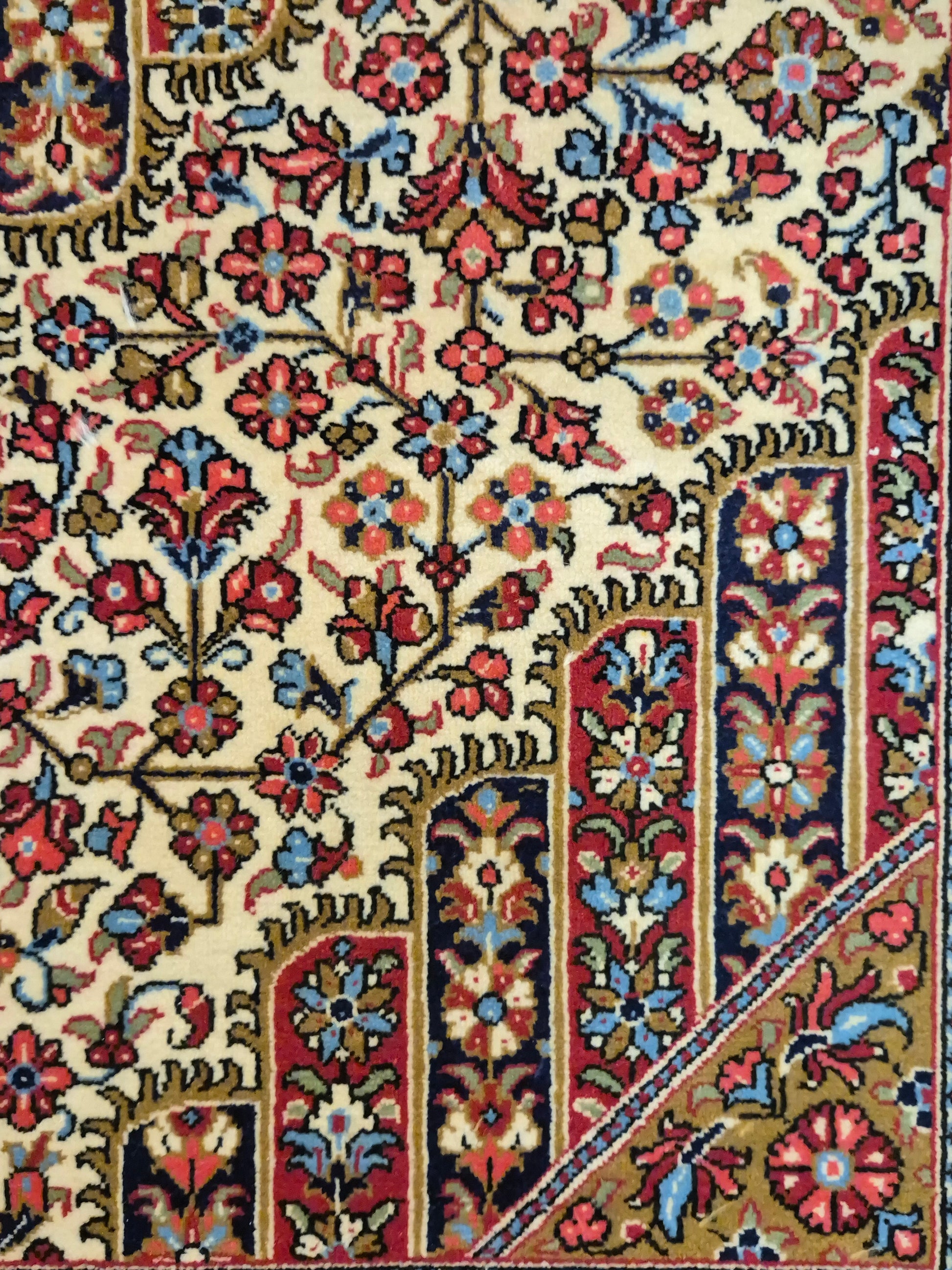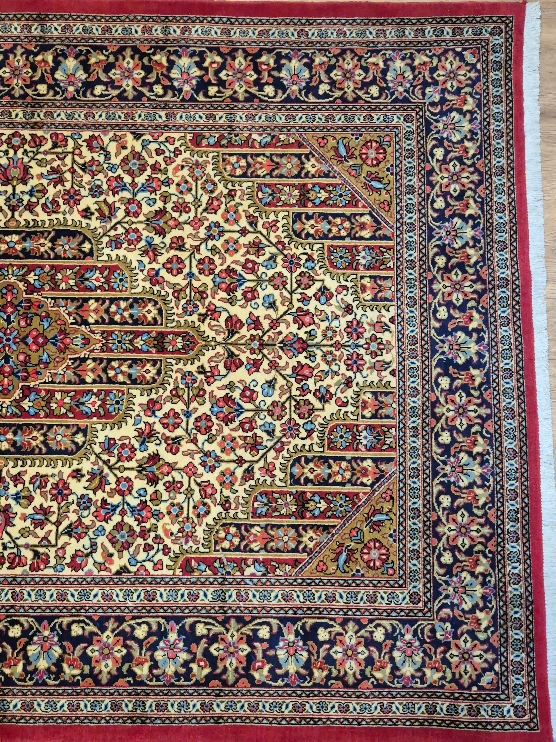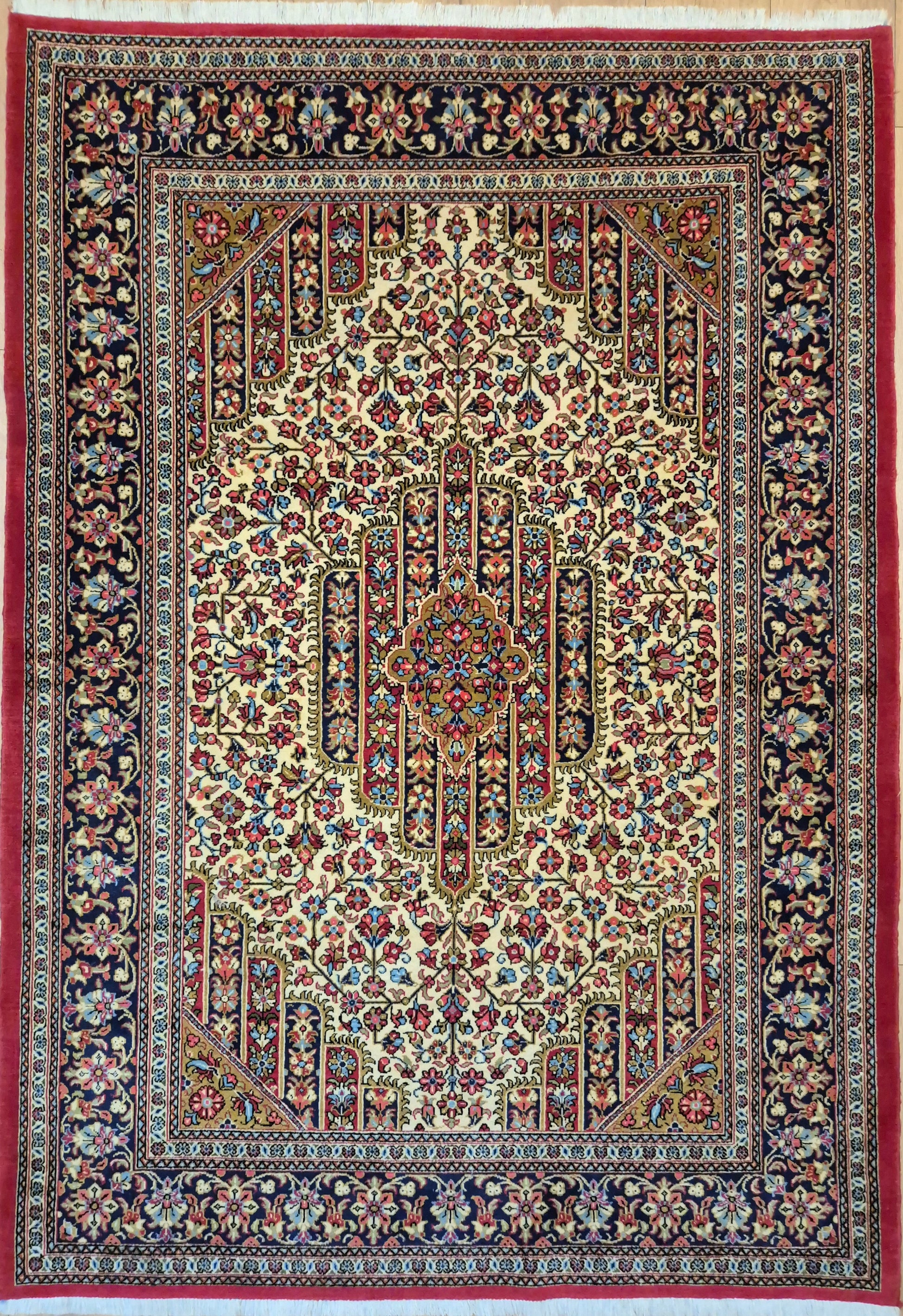 angeboten wird ein edler Ghom Teppich aus feiner Korkwolle, handgeknüpft in detailreicher Ausführung. Das zentrale Medaillon ist floral ausgearbeitet und wird von einem reich geschmückten Fond aus Ranken und Blüten begleitet. Die elegante Komposition aus klarer Symmetrie, kunstvollen Eckzwickeln und einer fein gemusterten Bordüre unterstreicht die meisterhafte Knüpfkunst dieses Teppichs.