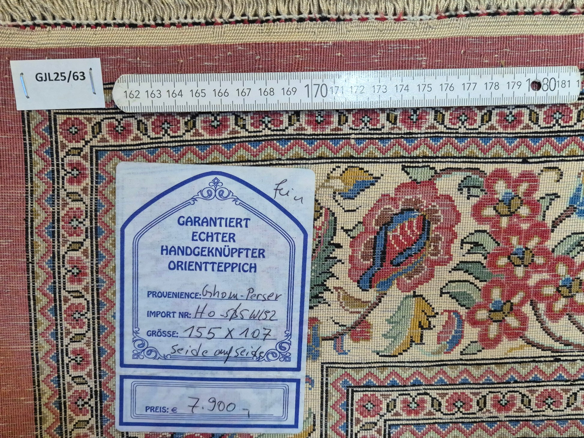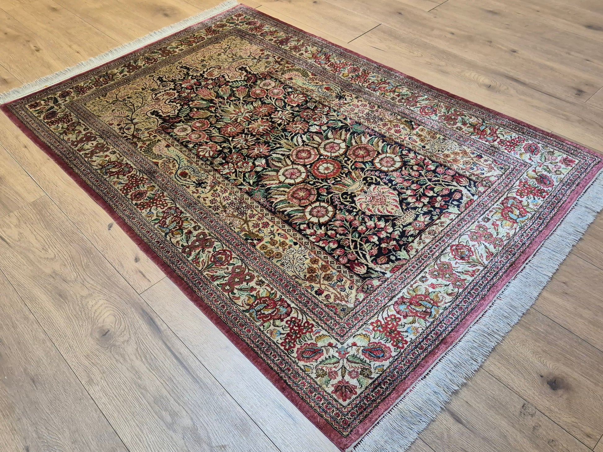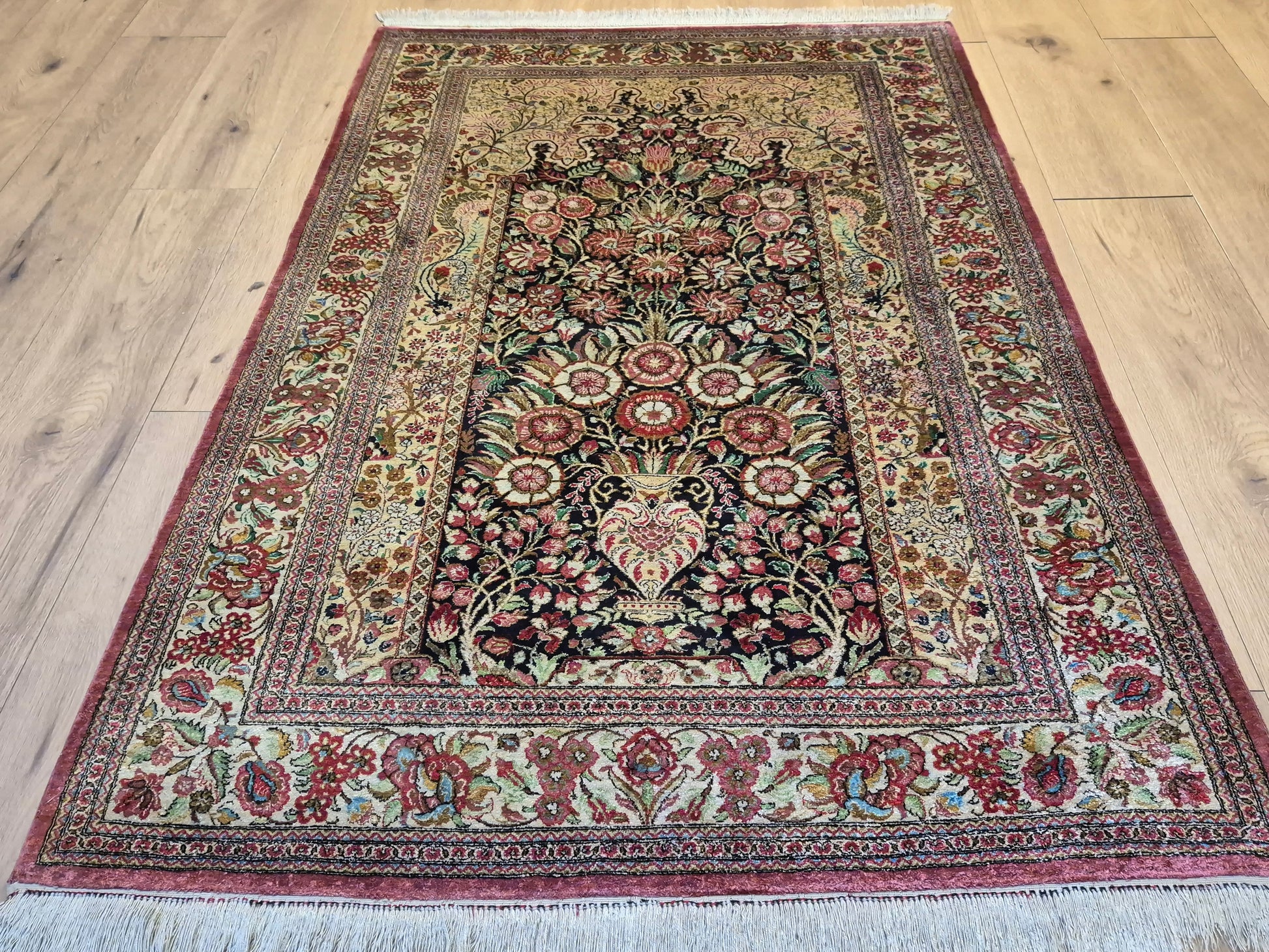 angeboten wird ein prächtiger Ghom Teppich aus reiner Seide auf Seide, handgeknüpft in außergewöhnlich feiner Qualität. Das Design zeigt ein klassisches Vasendesign, aus dem sich ein üppiger Strauß mit Blütenranken emporhebt. Die filigranen Ornamente und die reiche Bordürengestaltung unterstreichen die künstlerische Meisterschaft dieser Arbeit und verleihen dem Teppich seine edle Ausstrahlung.