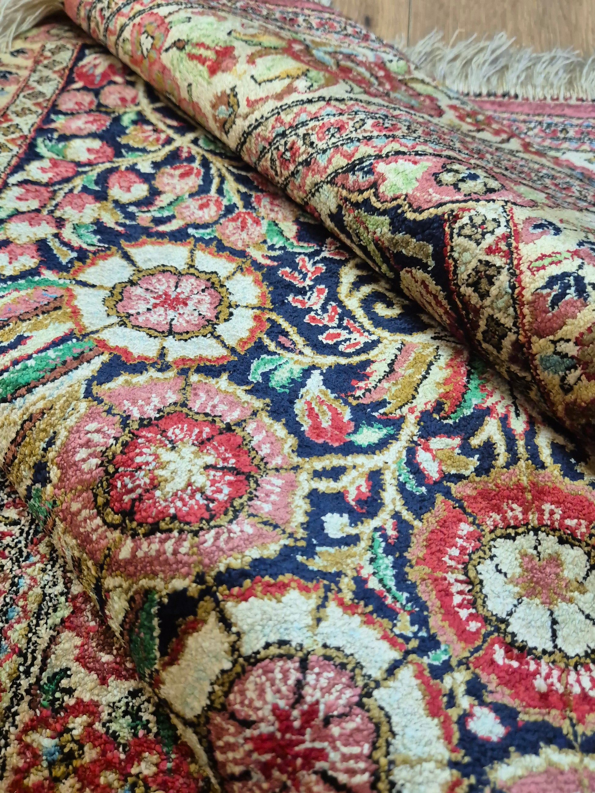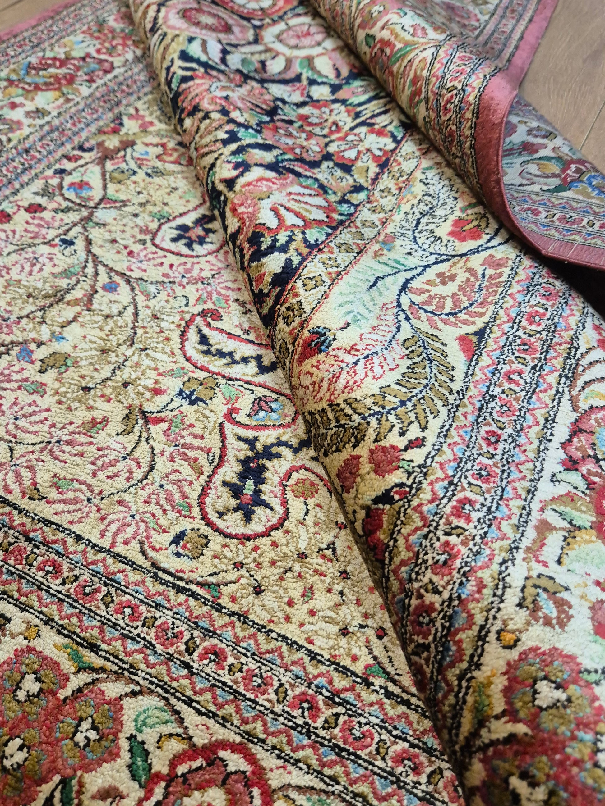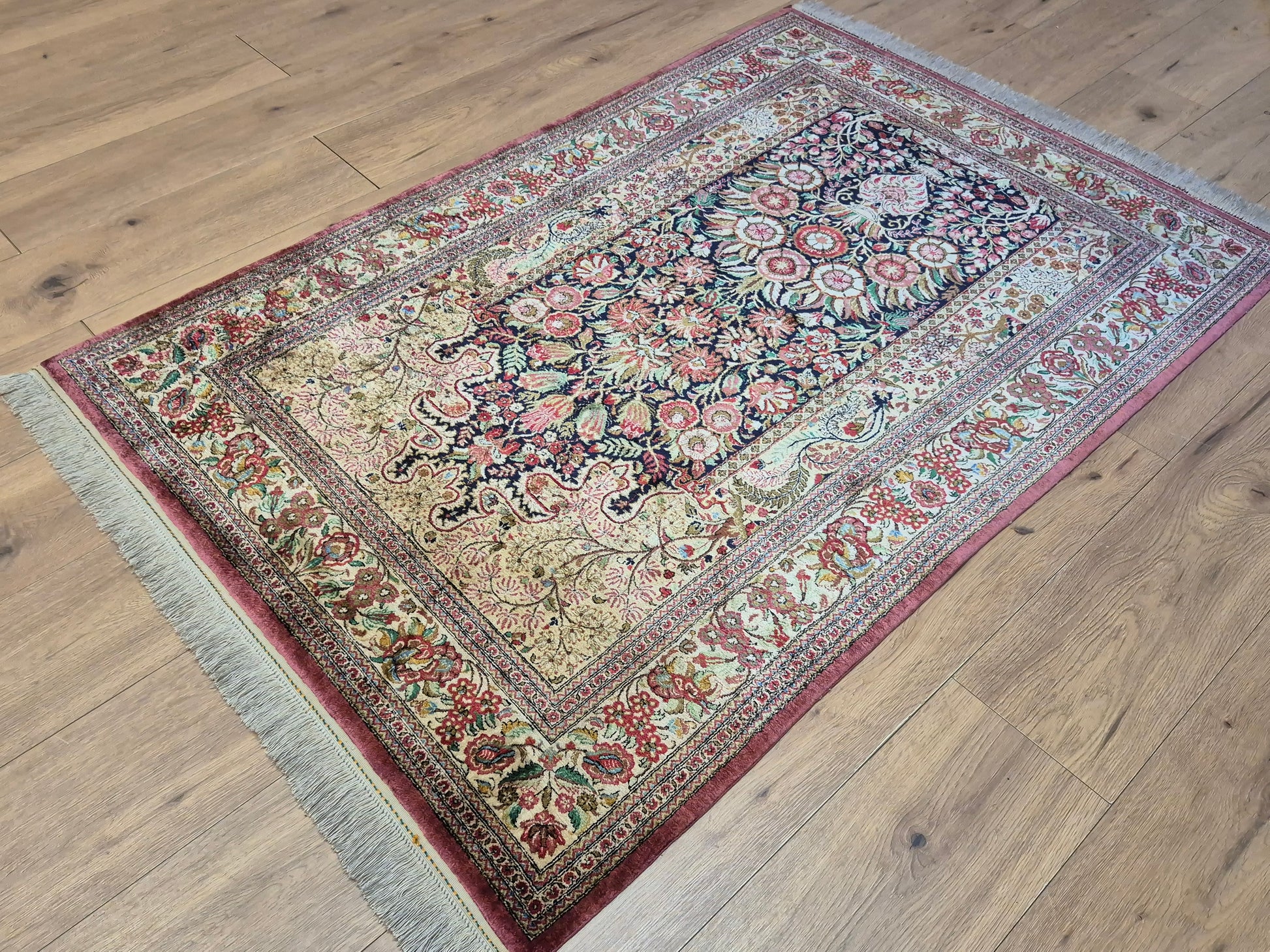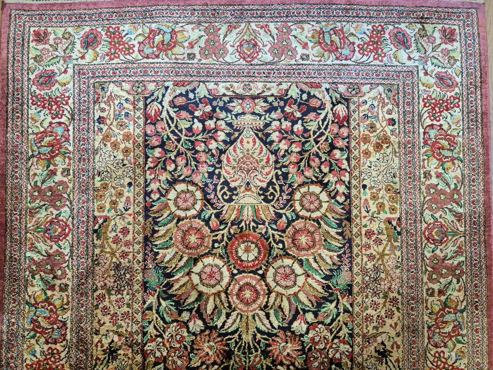 angeboten wird ein prächtiger Ghom Teppich aus reiner Seide auf Seide, handgeknüpft in außergewöhnlich feiner Qualität. Das Design zeigt ein klassisches Vasendesign, aus dem sich ein üppiger Strauß mit Blütenranken emporhebt. Die filigranen Ornamente und die reiche Bordürengestaltung unterstreichen die künstlerische Meisterschaft dieser Arbeit und verleihen dem Teppich seine edle Ausstrahlung.