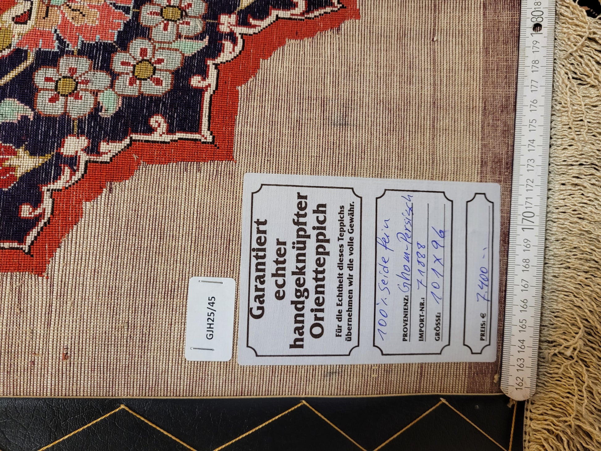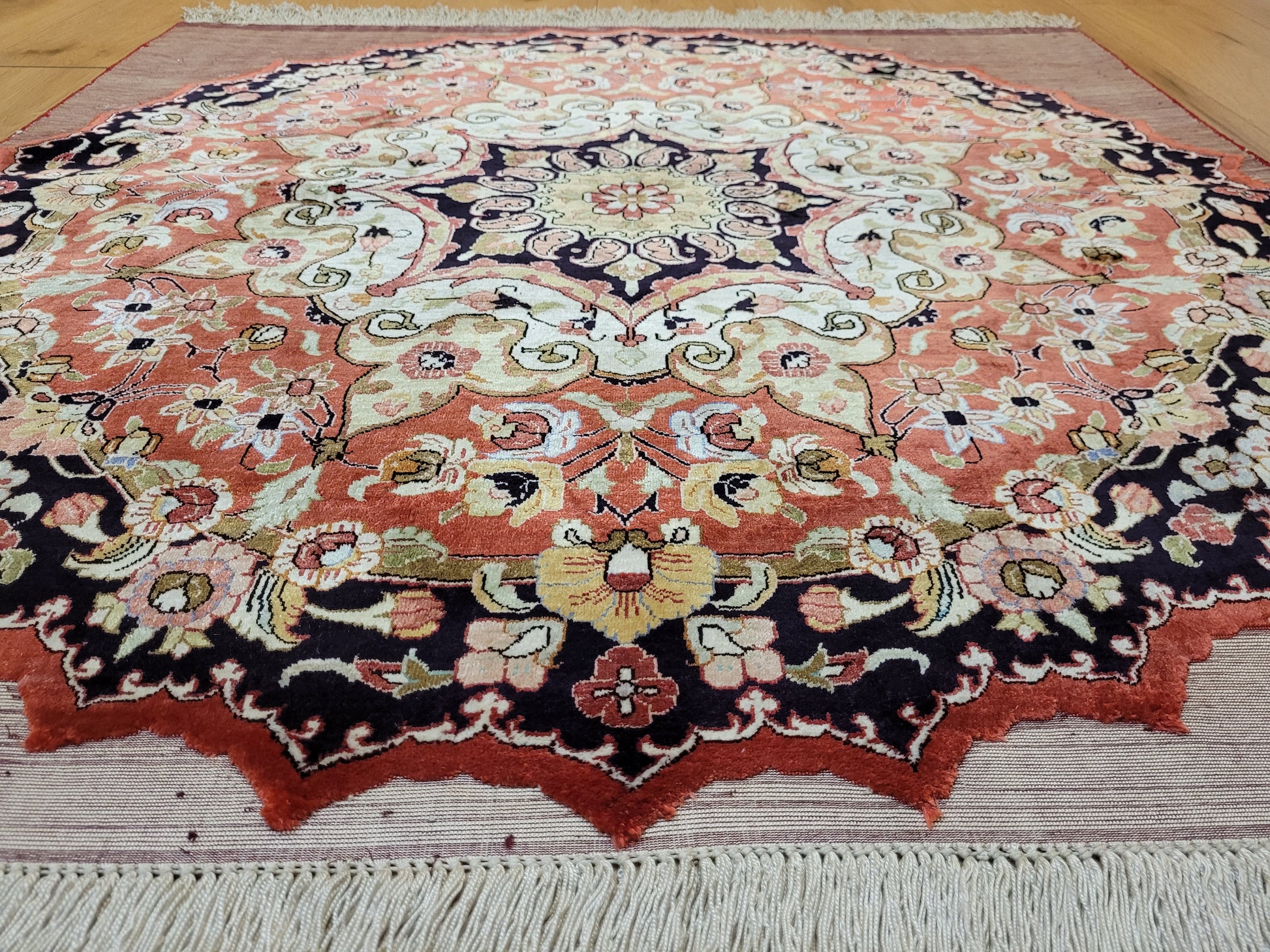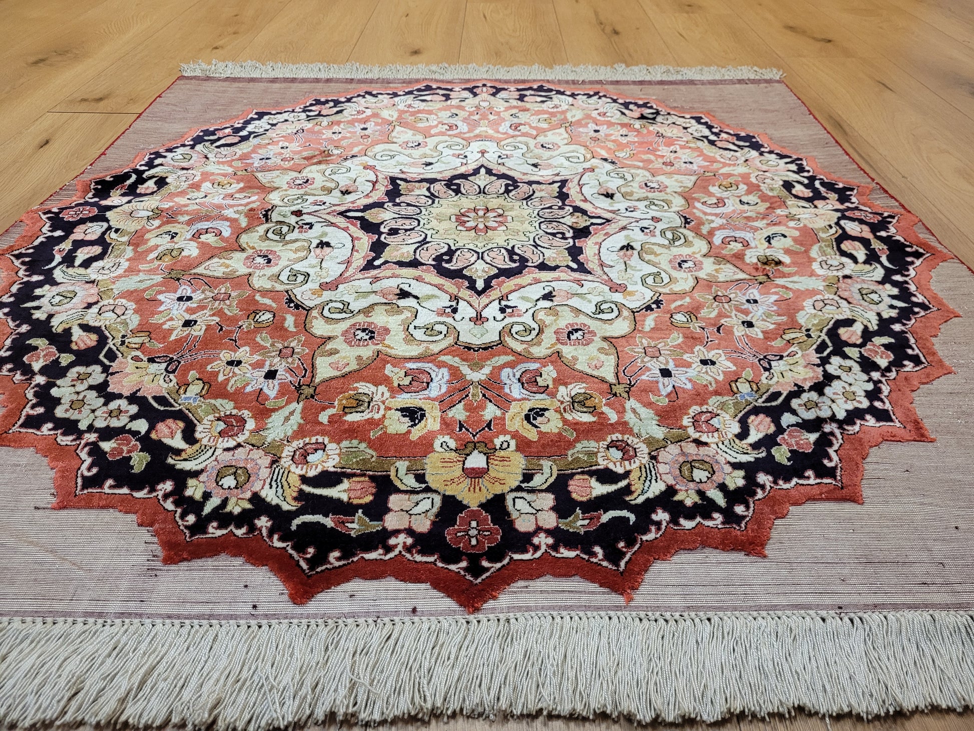 angeboten wird ein erlesener Ghom Teppich aus 100 % reiner Seide, fein handgeknüpft mit außergewöhnlicher Präzision. Das Design wird von einem großen, runden Zentralmedaillon geprägt, das sich wie eine kunstvolle Blüte entfaltet. Filigrane Blüten- und Rankenmotive in leuchtenden Farben schmücken das gesamte Feld, während der seidige Glanz den Teppich je nach Lichteinfall in unterschiedlichen Nuancen erstrahlen lässt.