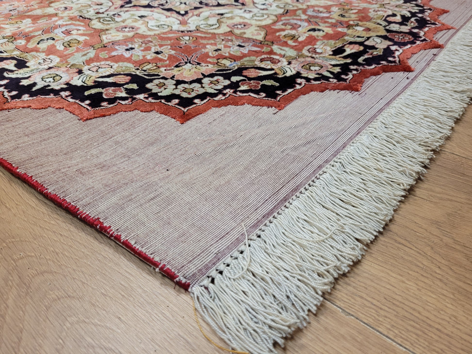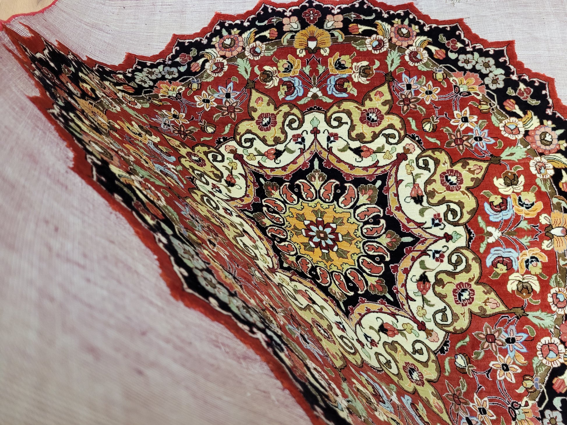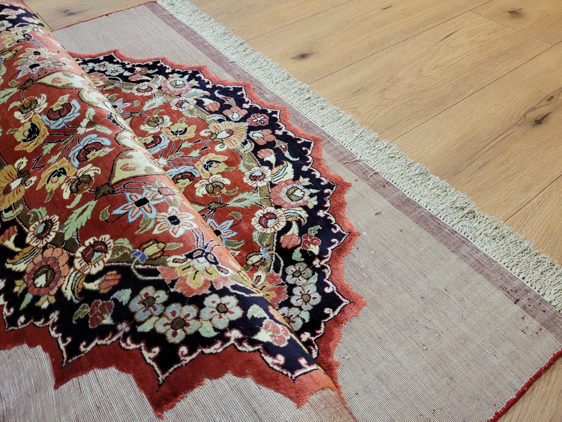 angeboten wird ein erlesener Ghom Teppich aus 100 % reiner Seide, fein handgeknüpft mit außergewöhnlicher Präzision. Das Design wird von einem großen, runden Zentralmedaillon geprägt, das sich wie eine kunstvolle Blüte entfaltet. Filigrane Blüten- und Rankenmotive in leuchtenden Farben schmücken das gesamte Feld, während der seidige Glanz den Teppich je nach Lichteinfall in unterschiedlichen Nuancen erstrahlen lässt.