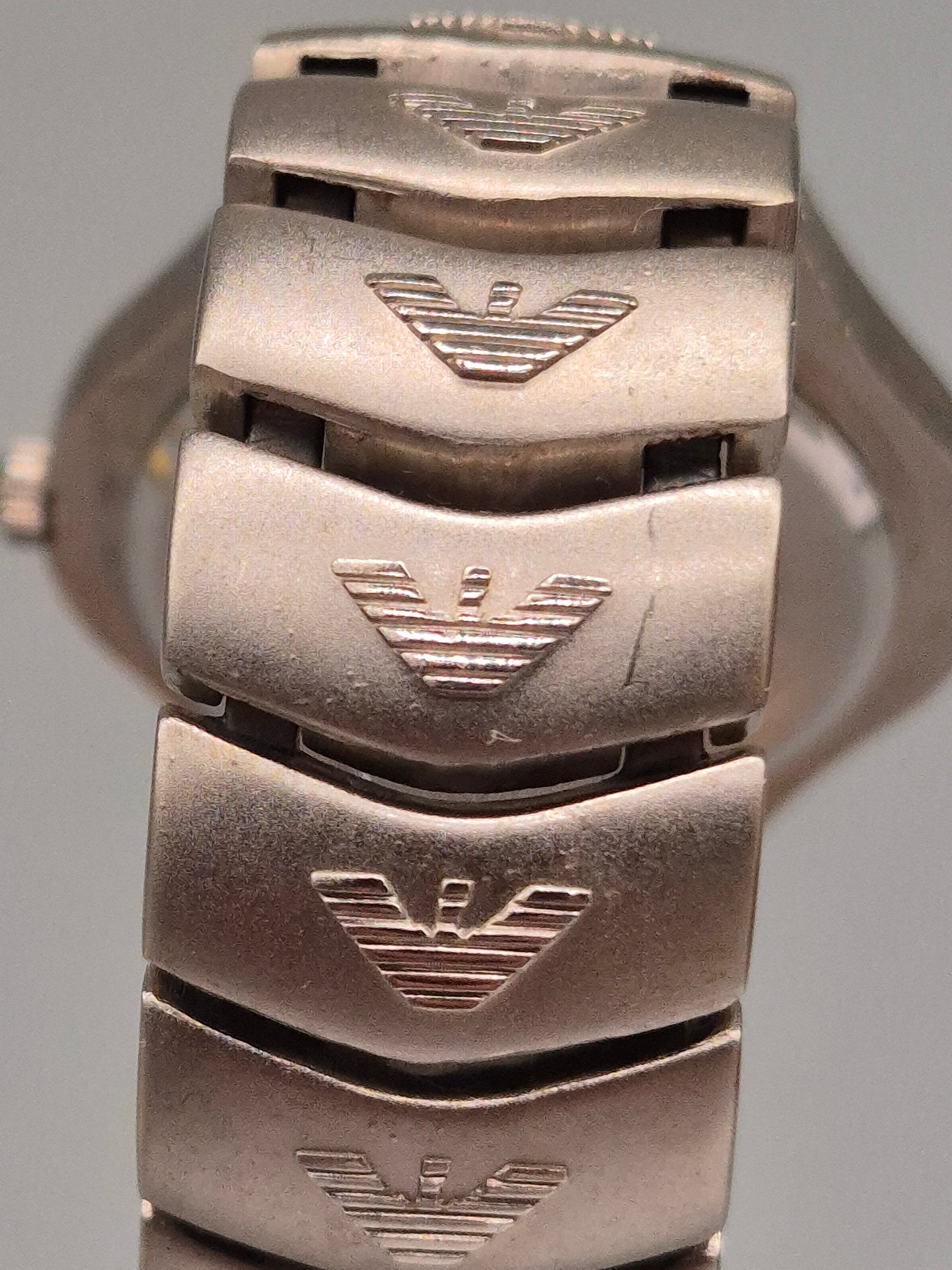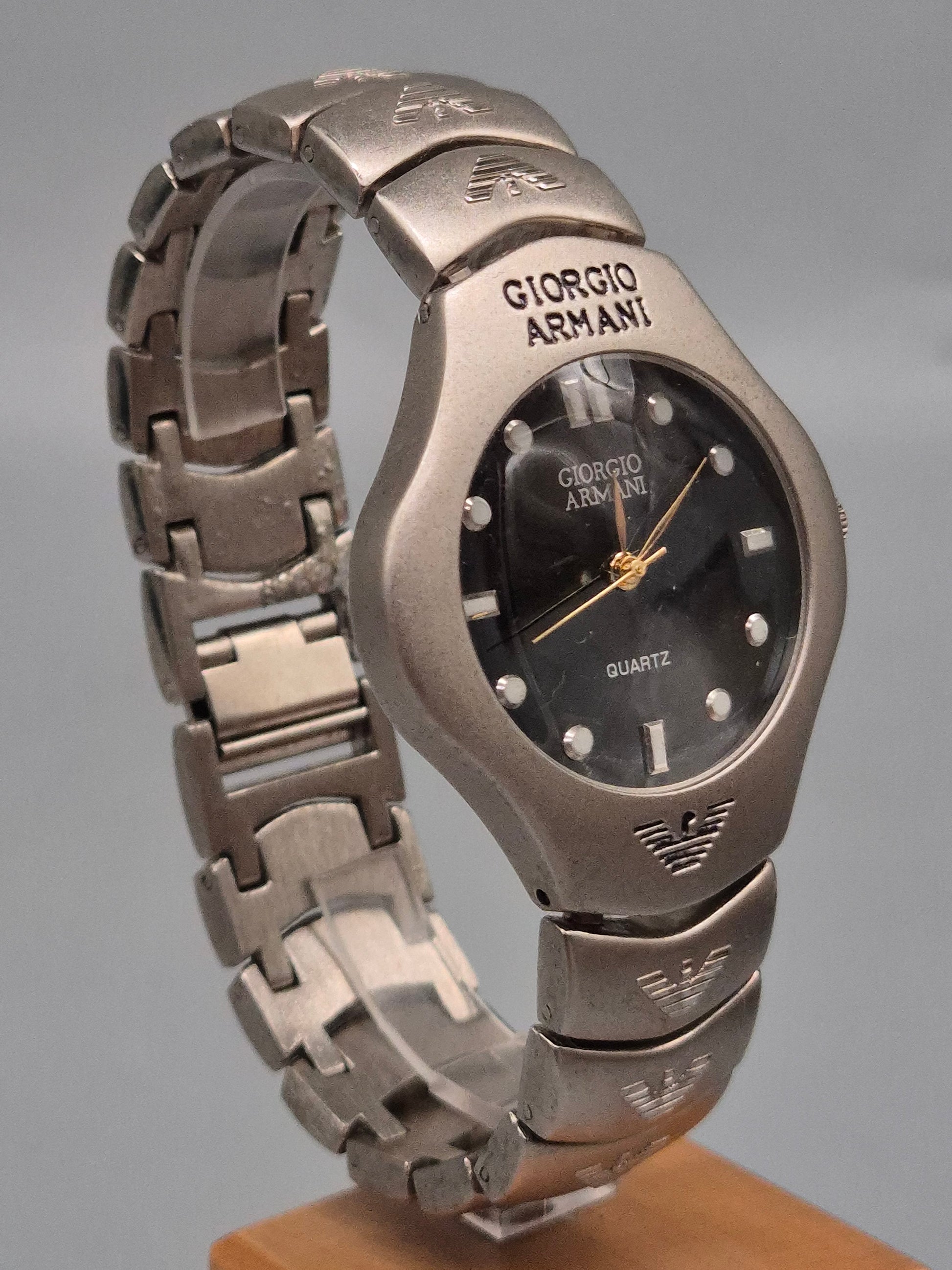 Diese markante Giorgio Armani Herren Uhr präsentiert sich mit einem runden Edelstahlgehäuse und einem stilvollen Gliederarmband, das sowohl polierte als auch satinierte Elemente aufweist und die ikonische Armani-Flügelprägung zeigt. Das schwarze Zifferblatt besticht durch minimalistische Punkt‑ und Stabindizes mit dezenten Leuchtpunkten, elegante goldfarbene Zeiger und das Giorgio Armani-Logo bei 12 Uhr. Die schlichte, aber hochwertige Gestaltung verleiht der Uhr einen eleganten, urbanen Look.