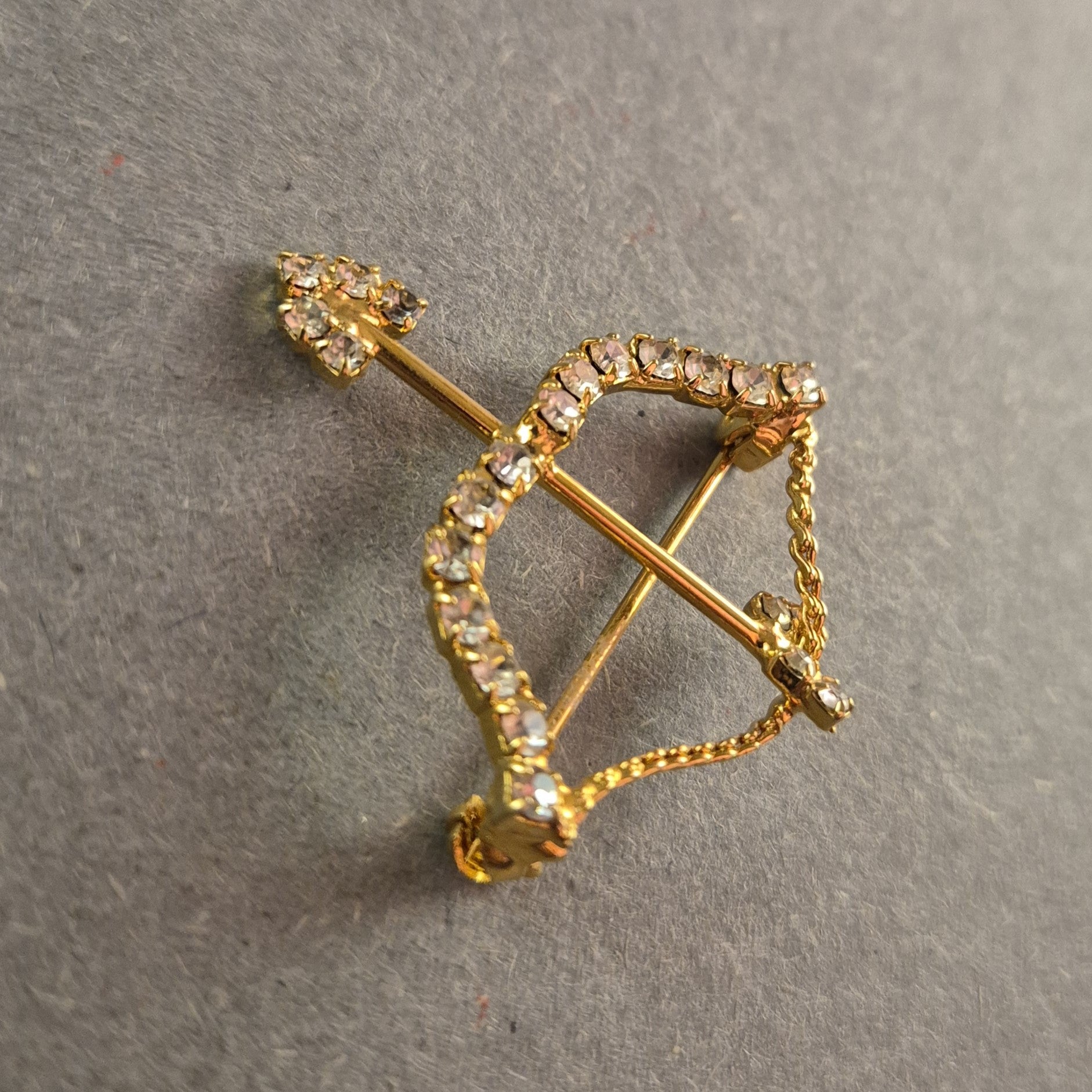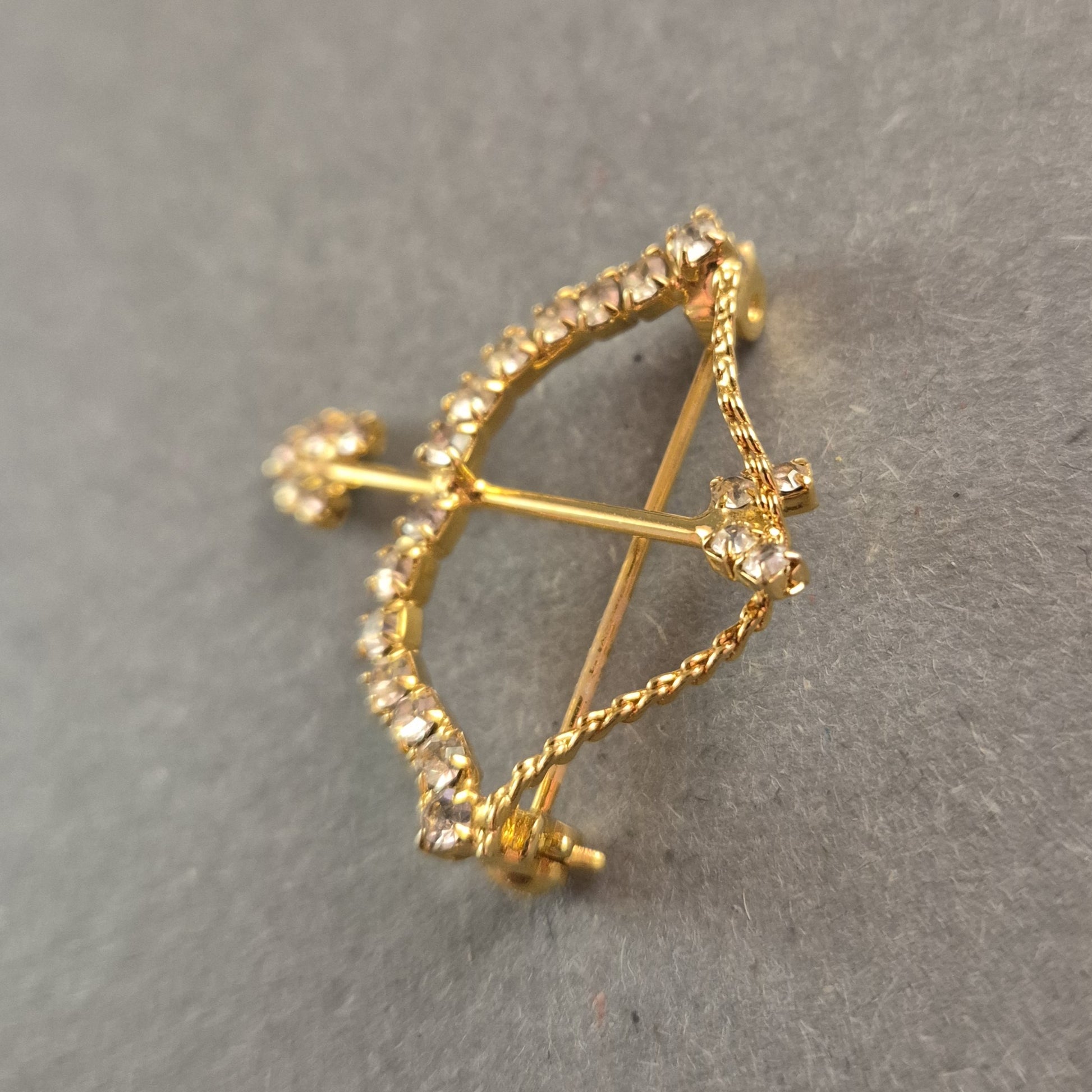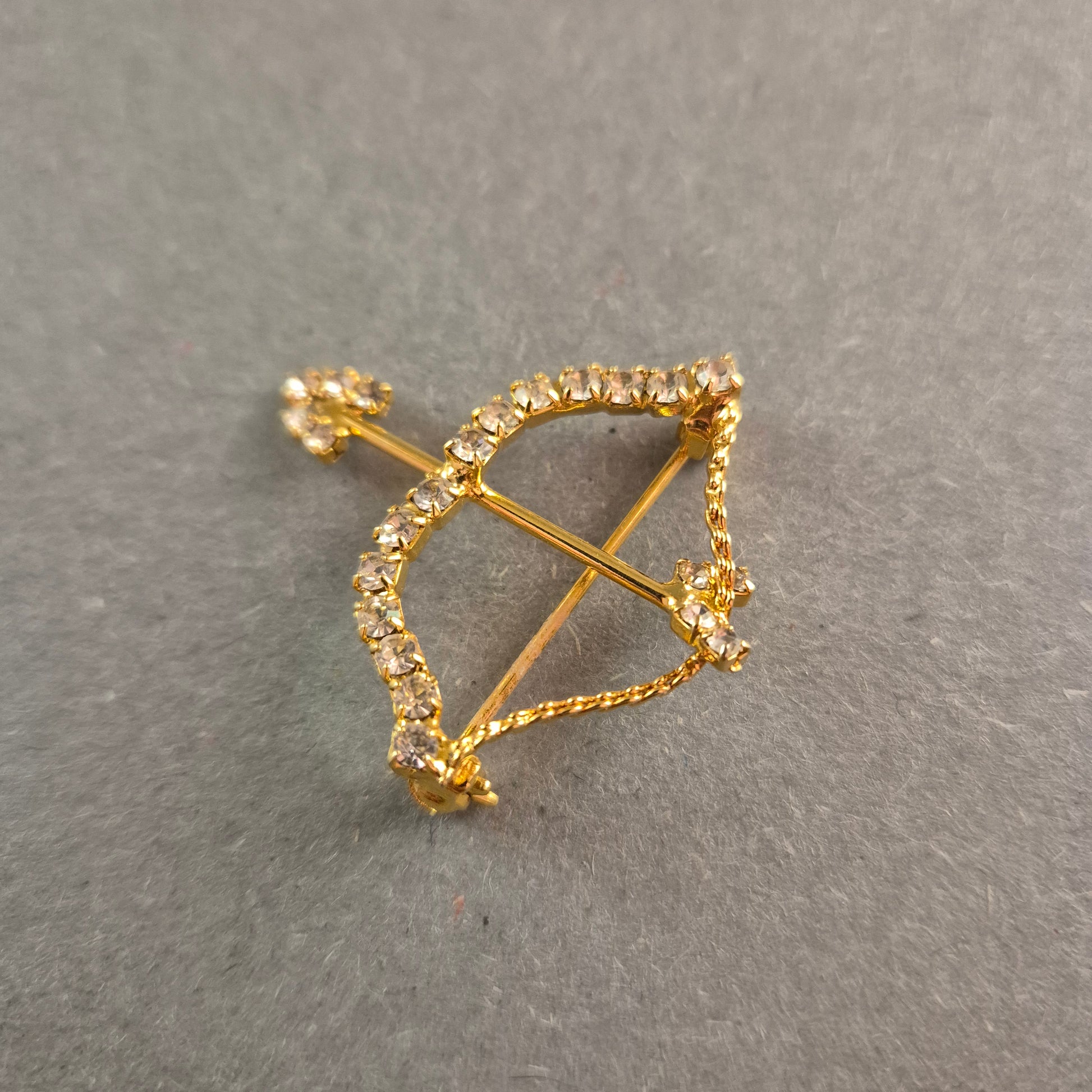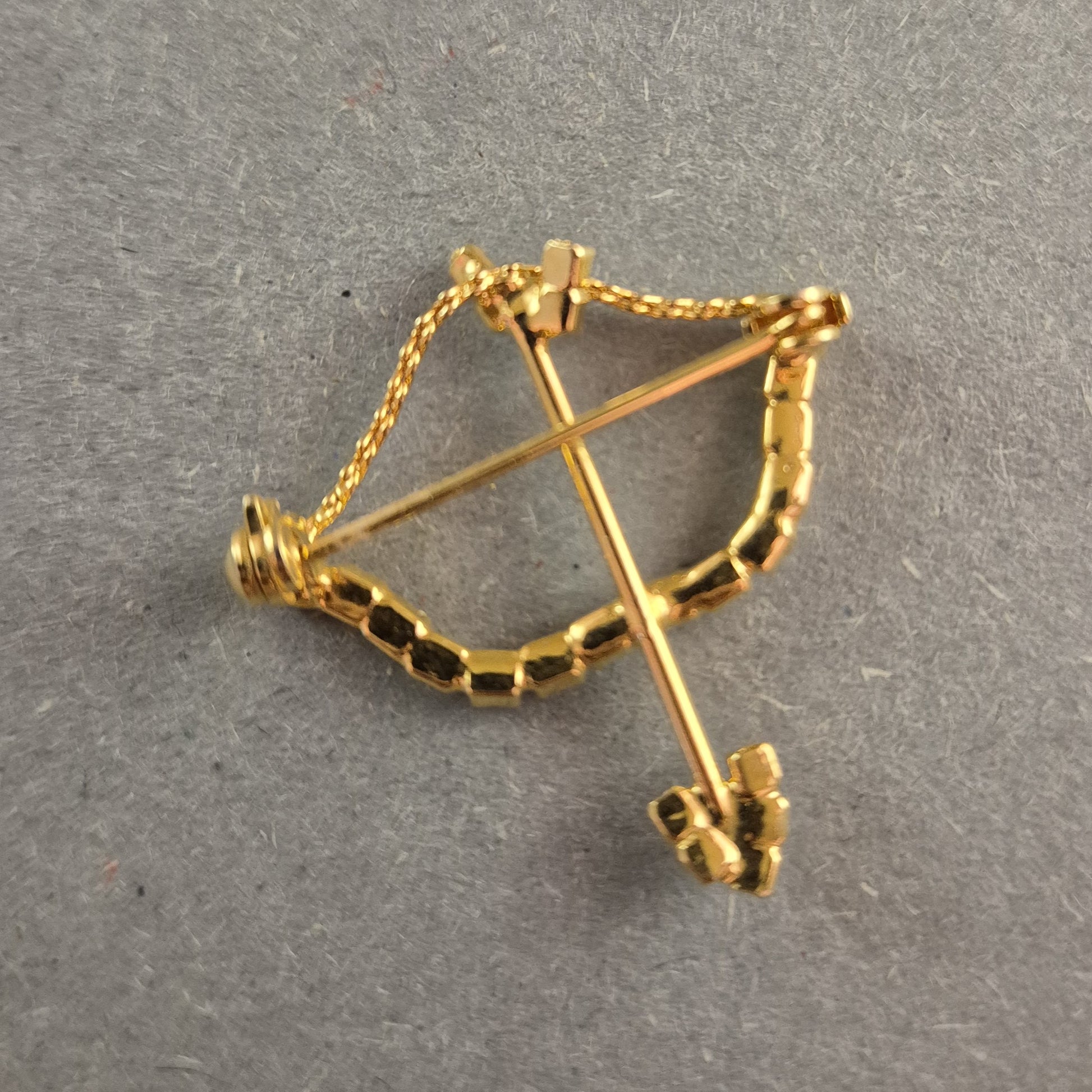 Goldene Brosche Pfeil und Bogen mit funkelnden Strasssteinen
