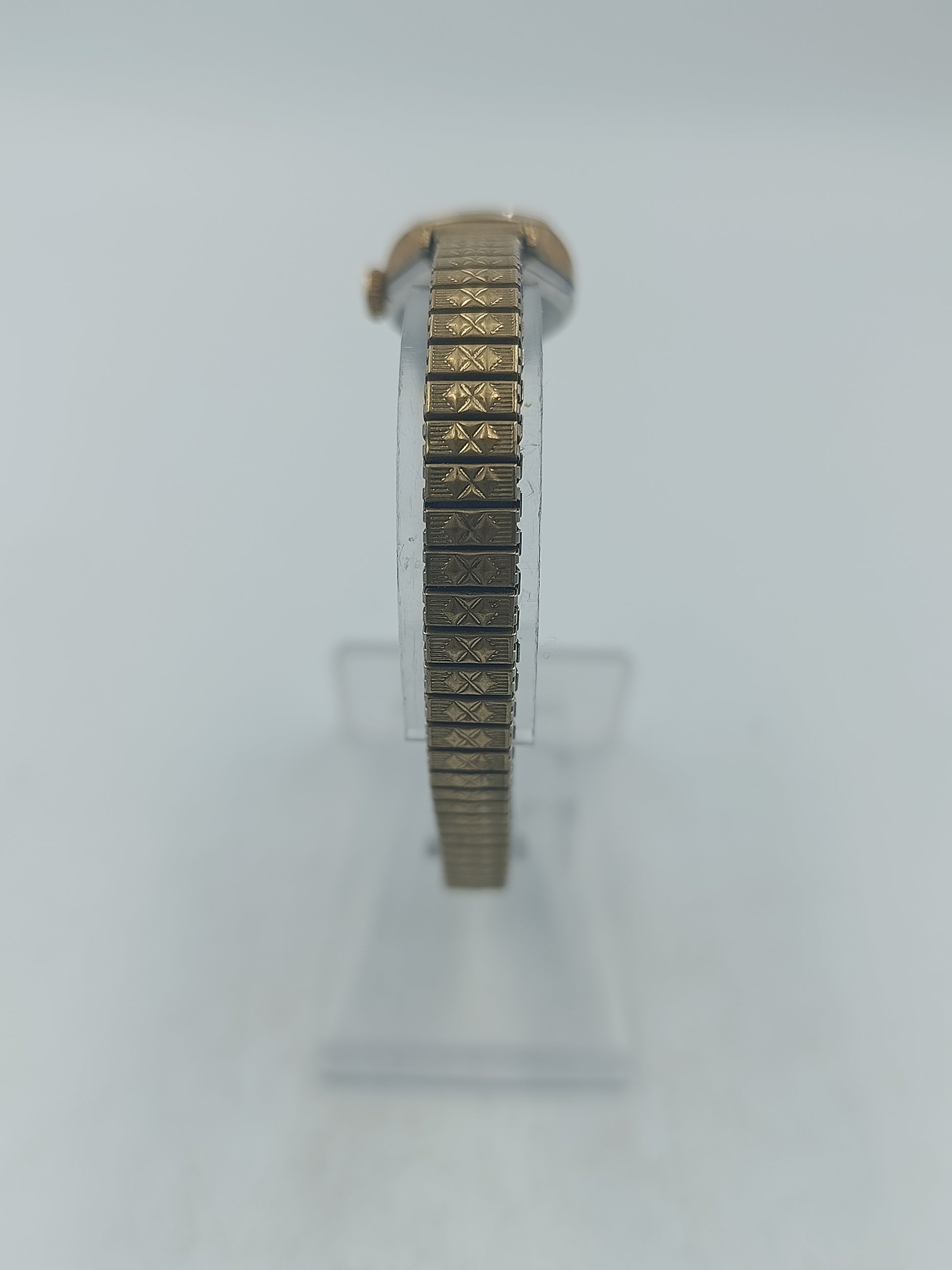 Diese elegante Armbanduhr überzeugt durch ihr warmes goldfarbenes Gehäuse und ein fein gemustertes elastisches Metallarmband. Das übersichtliche Zifferblatt mit gut lesbaren Zahlen verleiht der Uhr einen zeitlosen Vintage Charakter. Durch das flexible Band lässt sich die Uhr bequem tragen und passt sich angenehm dem Handgelenk an. Ein stilvolles Accessoire für Alltag und besondere Anlässe.