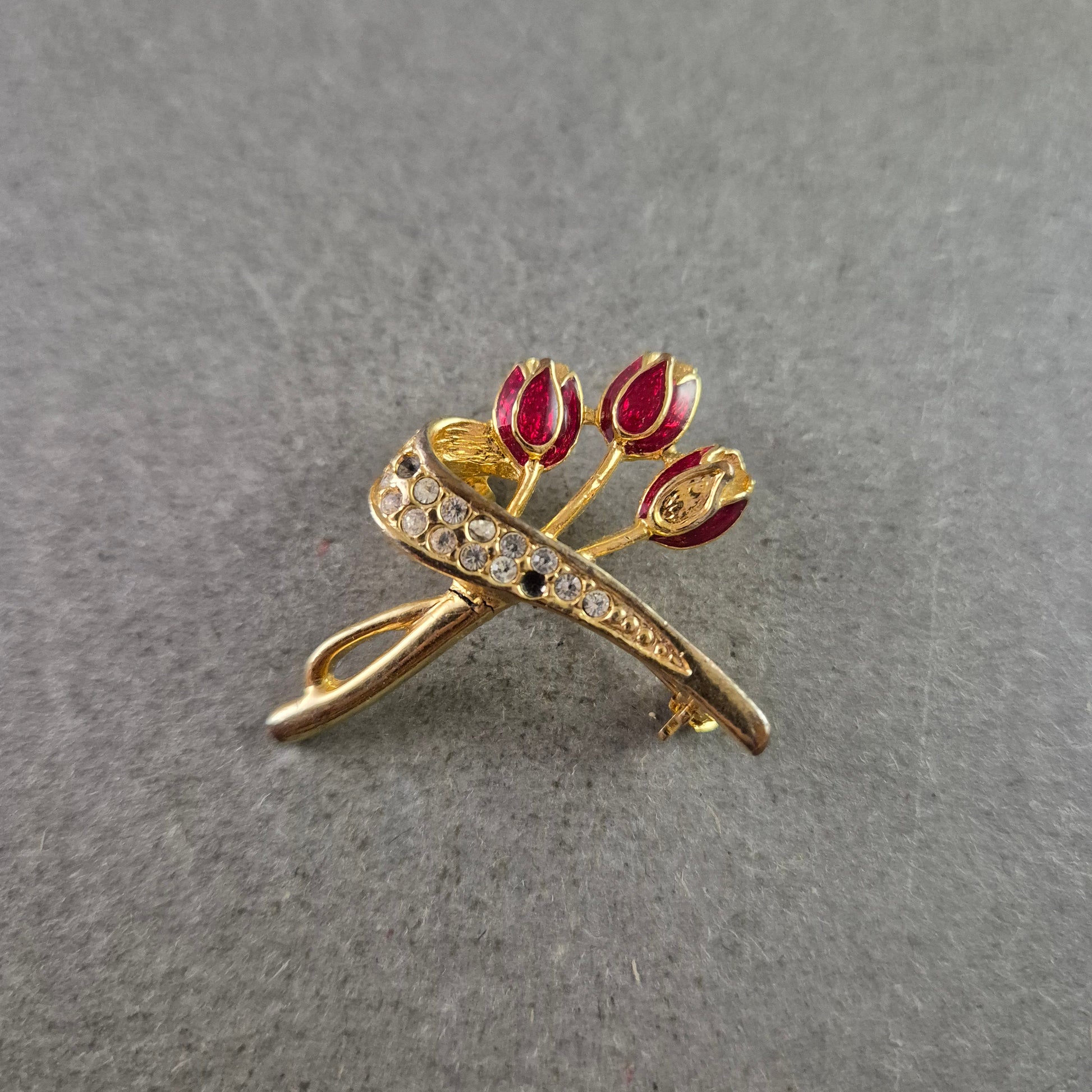 Diese dekorative Brosche in Blumenform vereint goldfarbenes Metall mit leuchtend roten Emaille-Blüten. Der Blütenstrauß wird von einem geschwungenen Band aus funkelnden Strasssteinen geziert, das der Brosche eine elegante und glamouröse Ausstrahlung verleiht. Ein stilvolles Accessoire, das jedes Outfit aufwertet und sowohl im Alltag als auch zu besonderen Anlässen getragen werden kann.