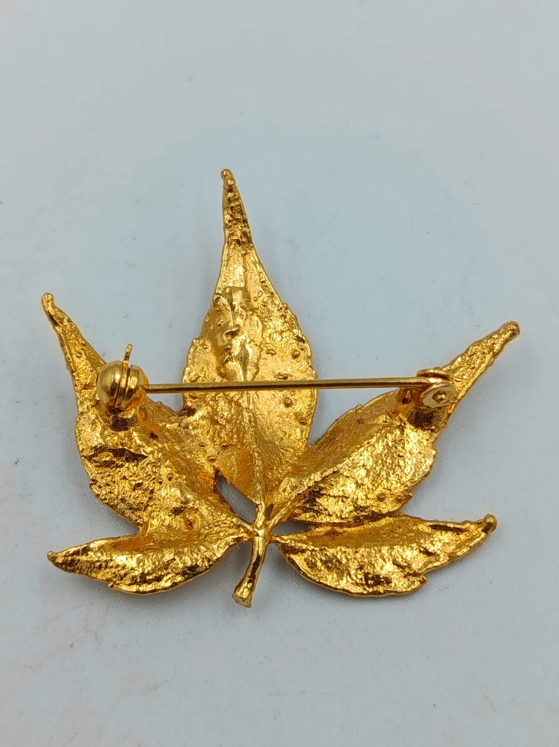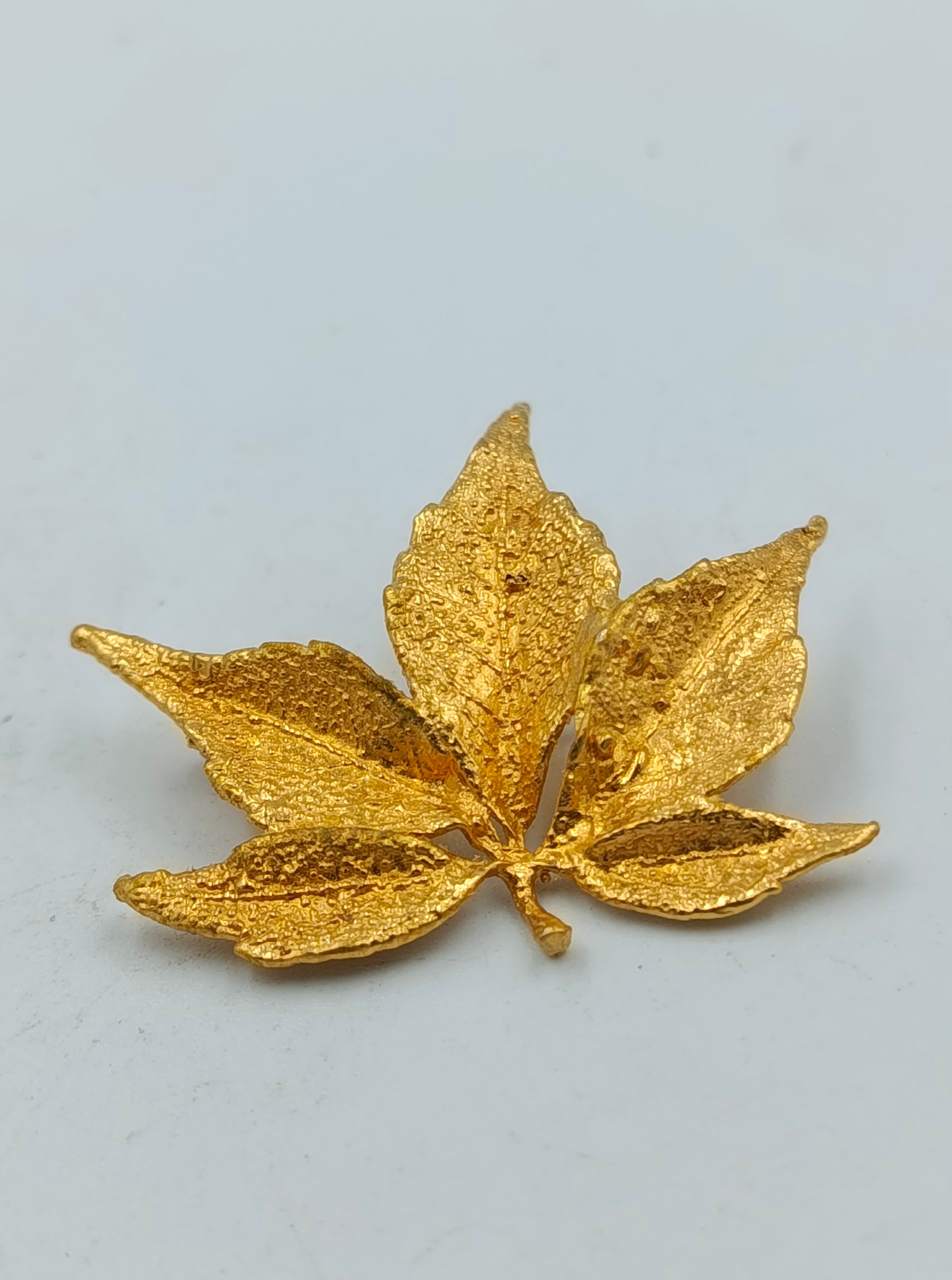 Goldfarbene Brosche in Blattform mit strukturierter Oberfläche
