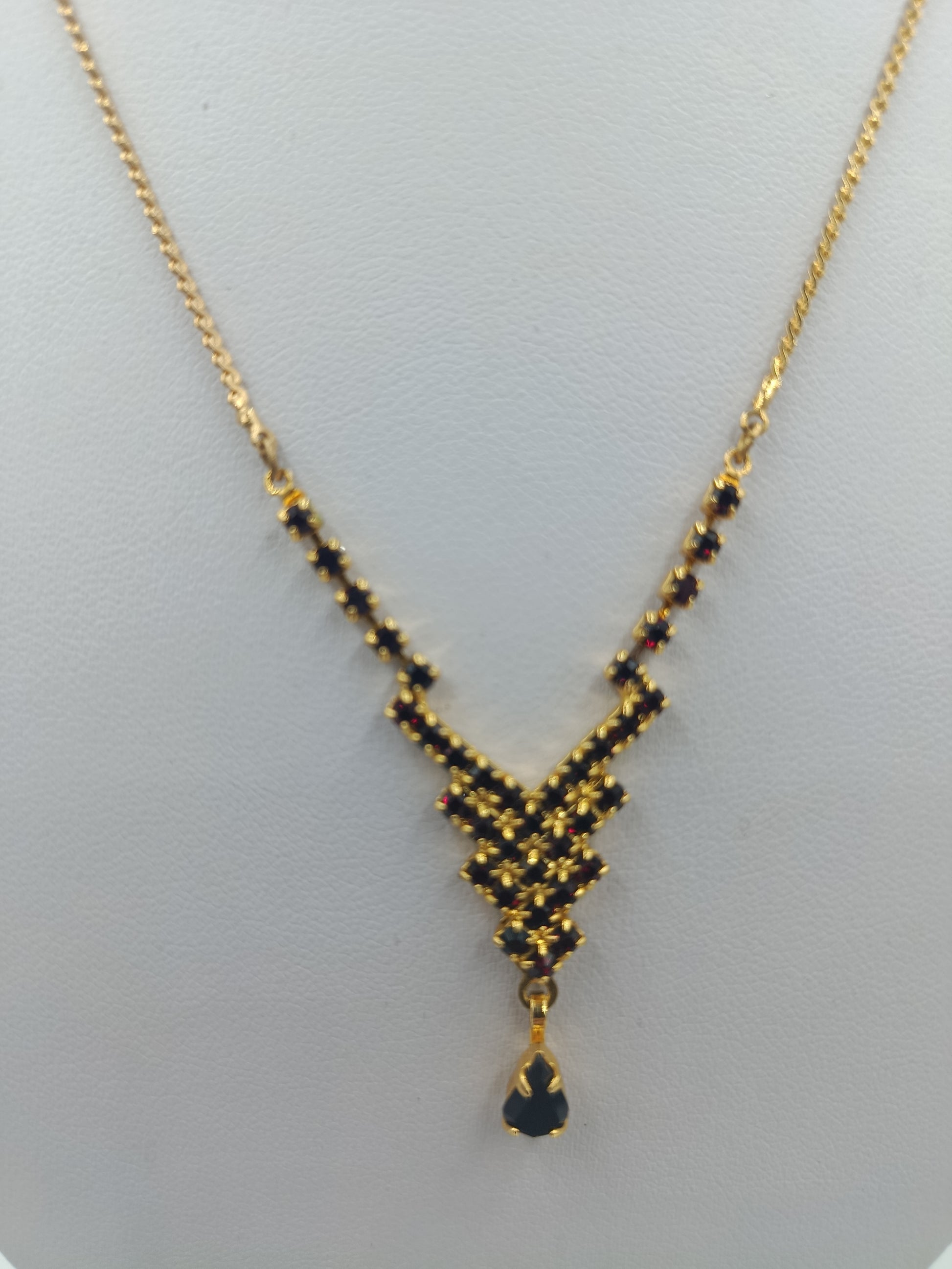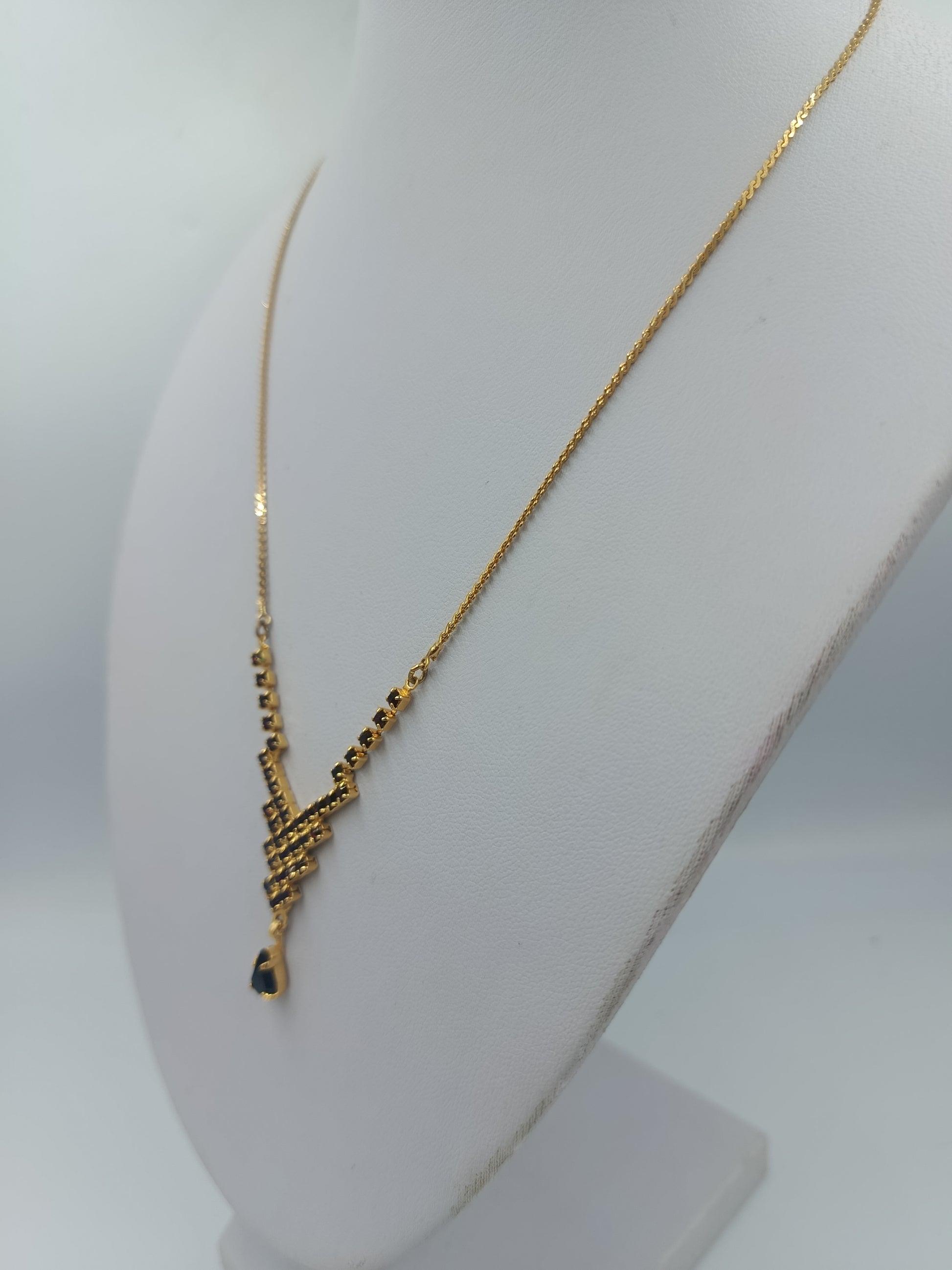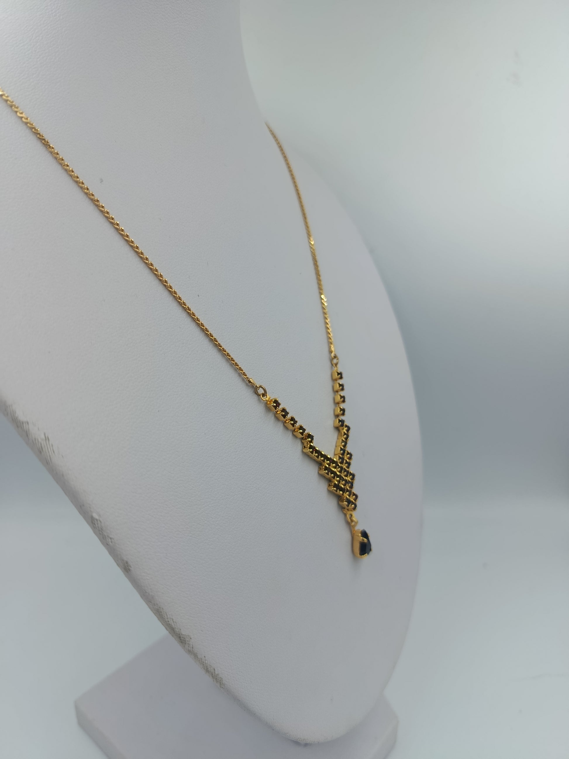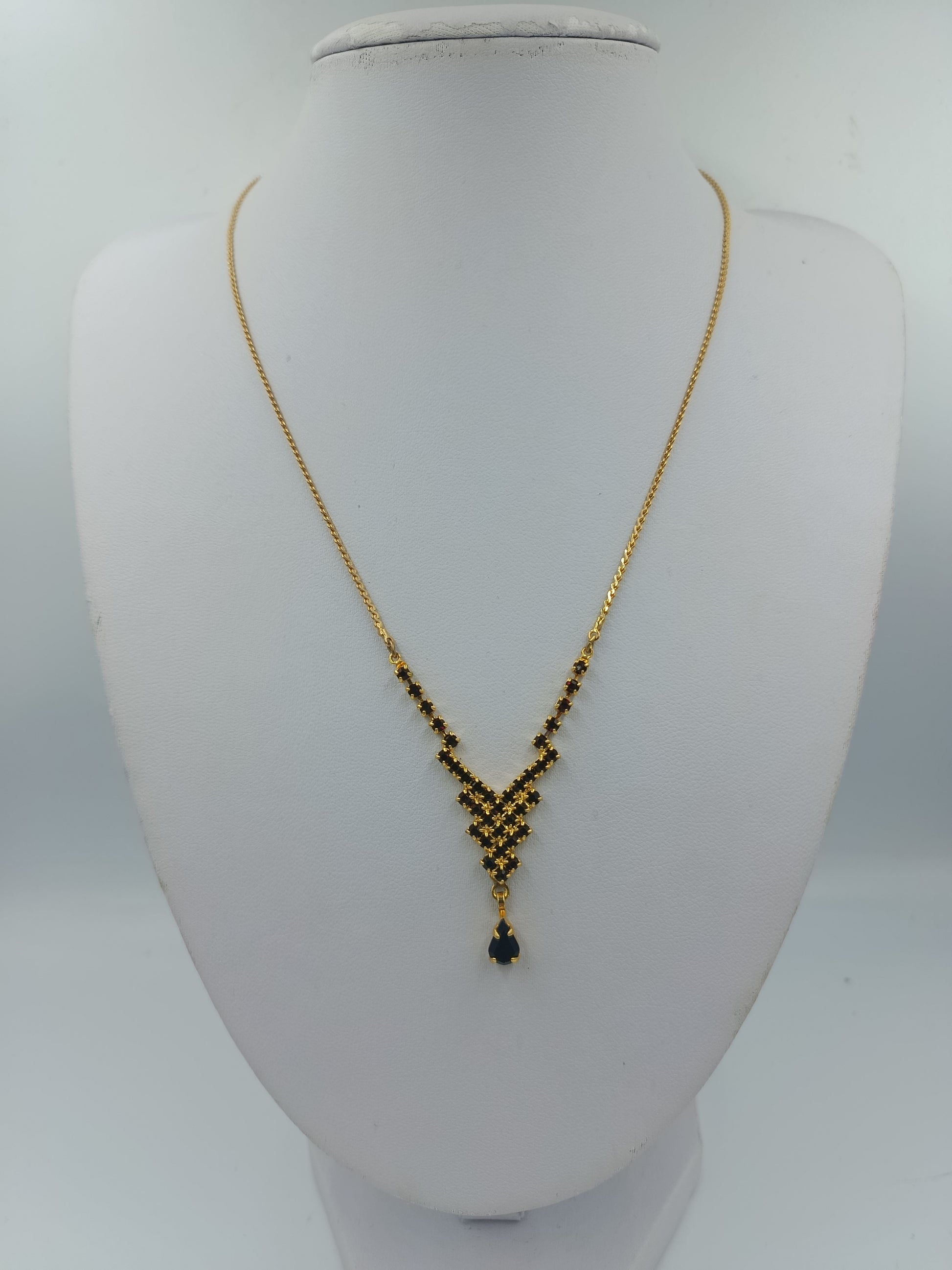 Goldfarbene Halskette mit schwarzen Steinen und Tropfenanhänger