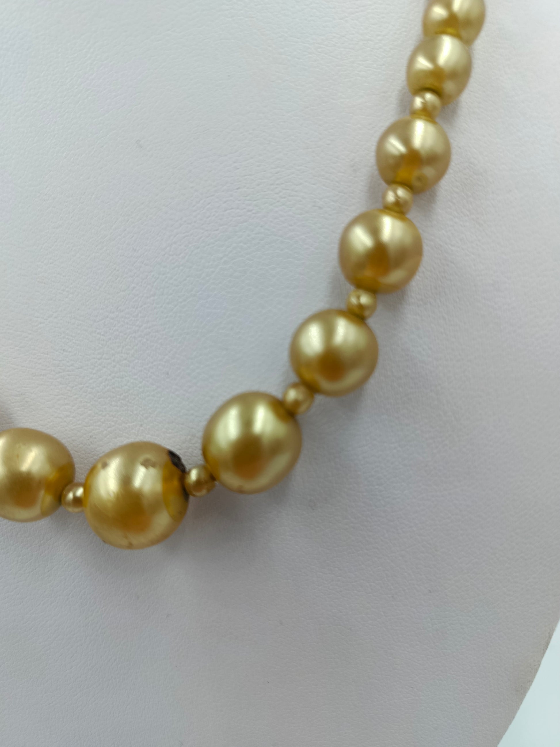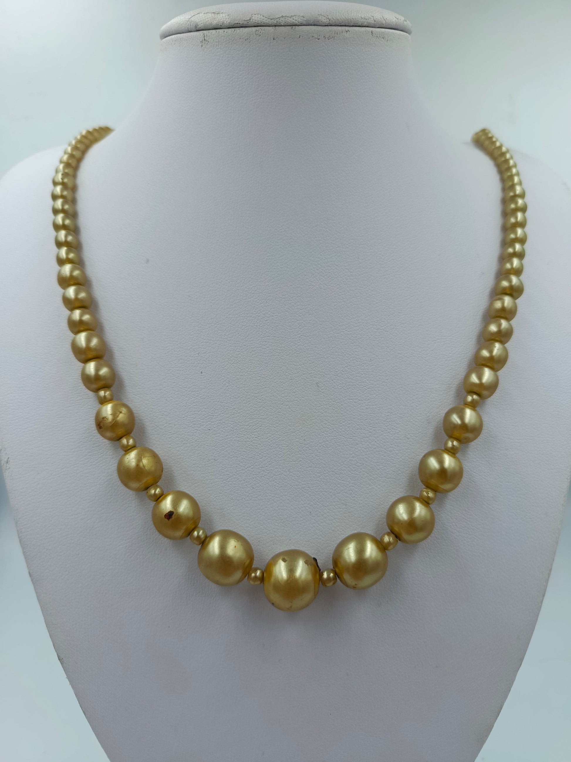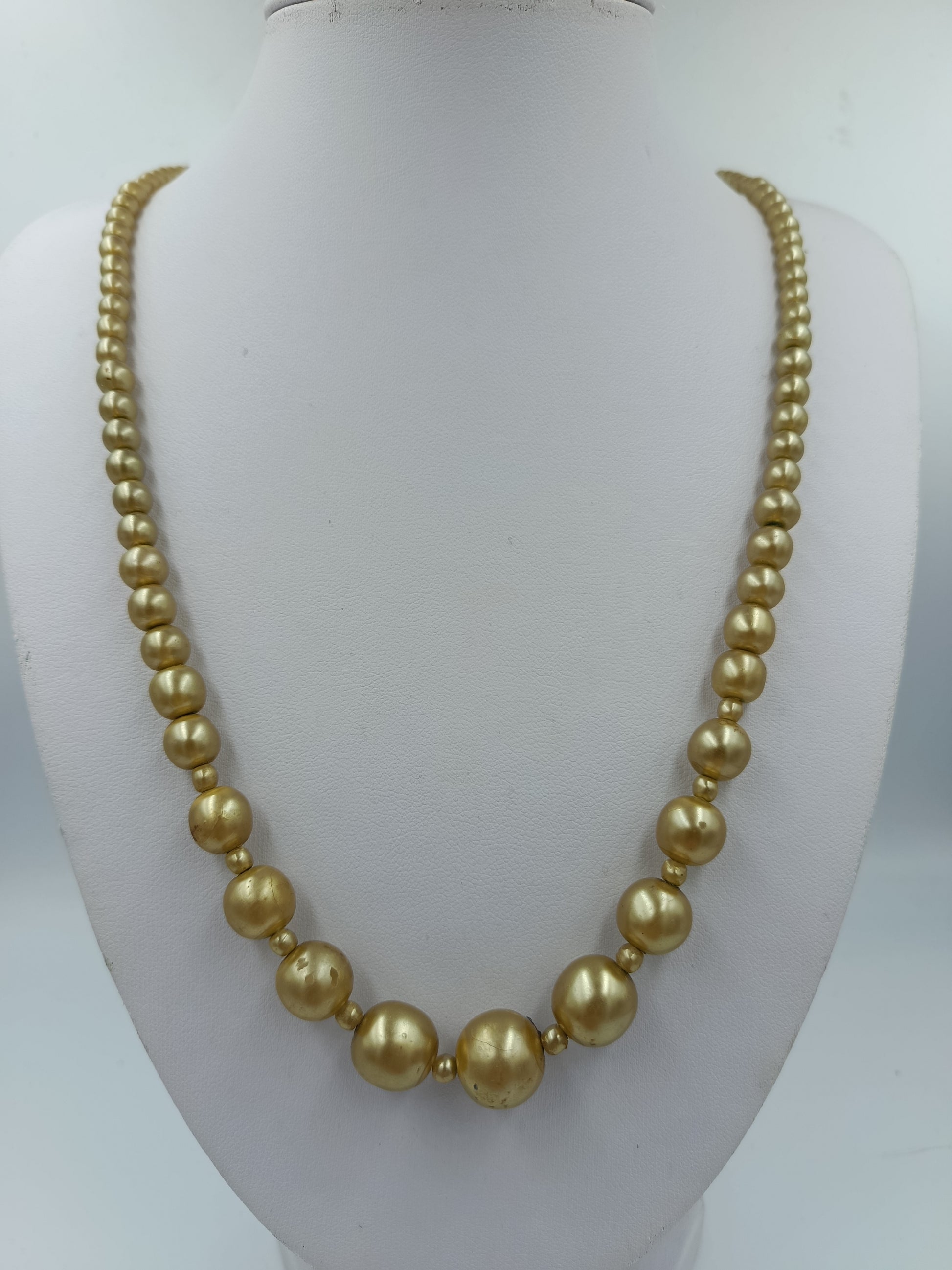 Elegante Perlenkette in edlem Goldton mit sanftem Größenverlauf der Perlen. Die schimmernde Oberfläche verleiht der Kette eine luxuriöse Ausstrahlung – perfekt für festliche Anlässe oder als stilvolles Accessoire im Alltag.