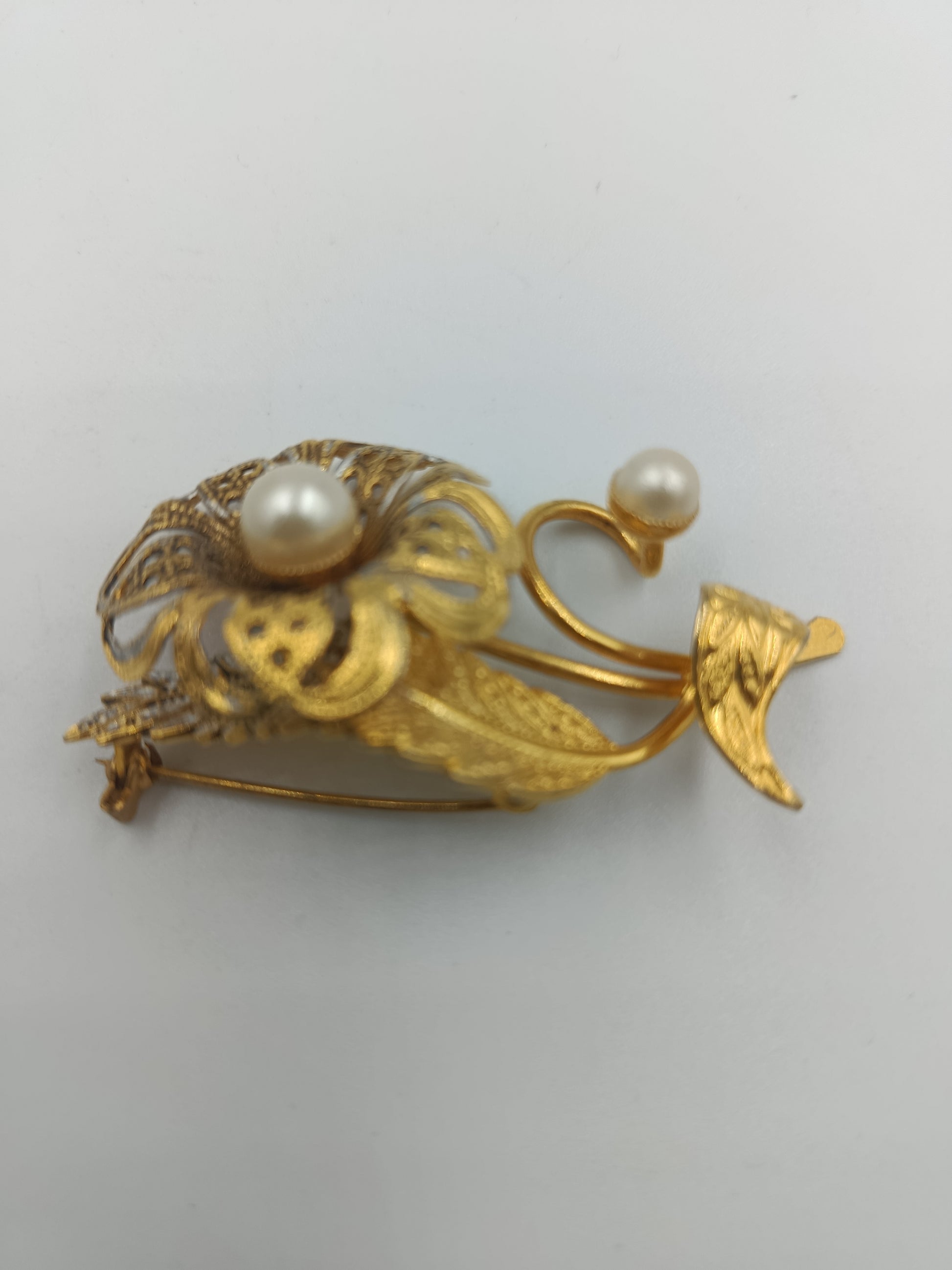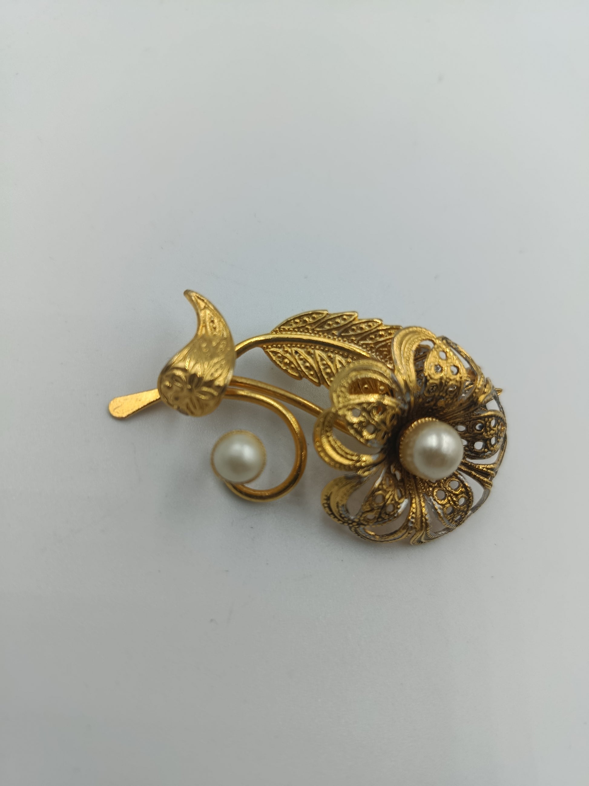 Goldfarbene Vintage-Brosche mit Perlenblüten