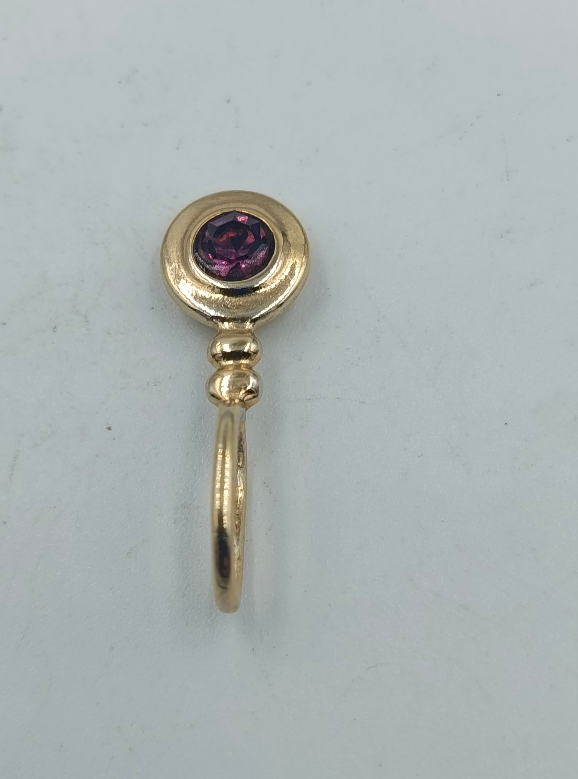 Eleganter goldfarbener Anhänger mit einem wunderschönen violett funkelnden Stein in der Mitte. Das runde Design mit fein gearbeiteten Details verleiht diesem Schmuckstück einen edlen und klassischen Look. Ideal als Blickfang an einer Kette oder einem Armband.