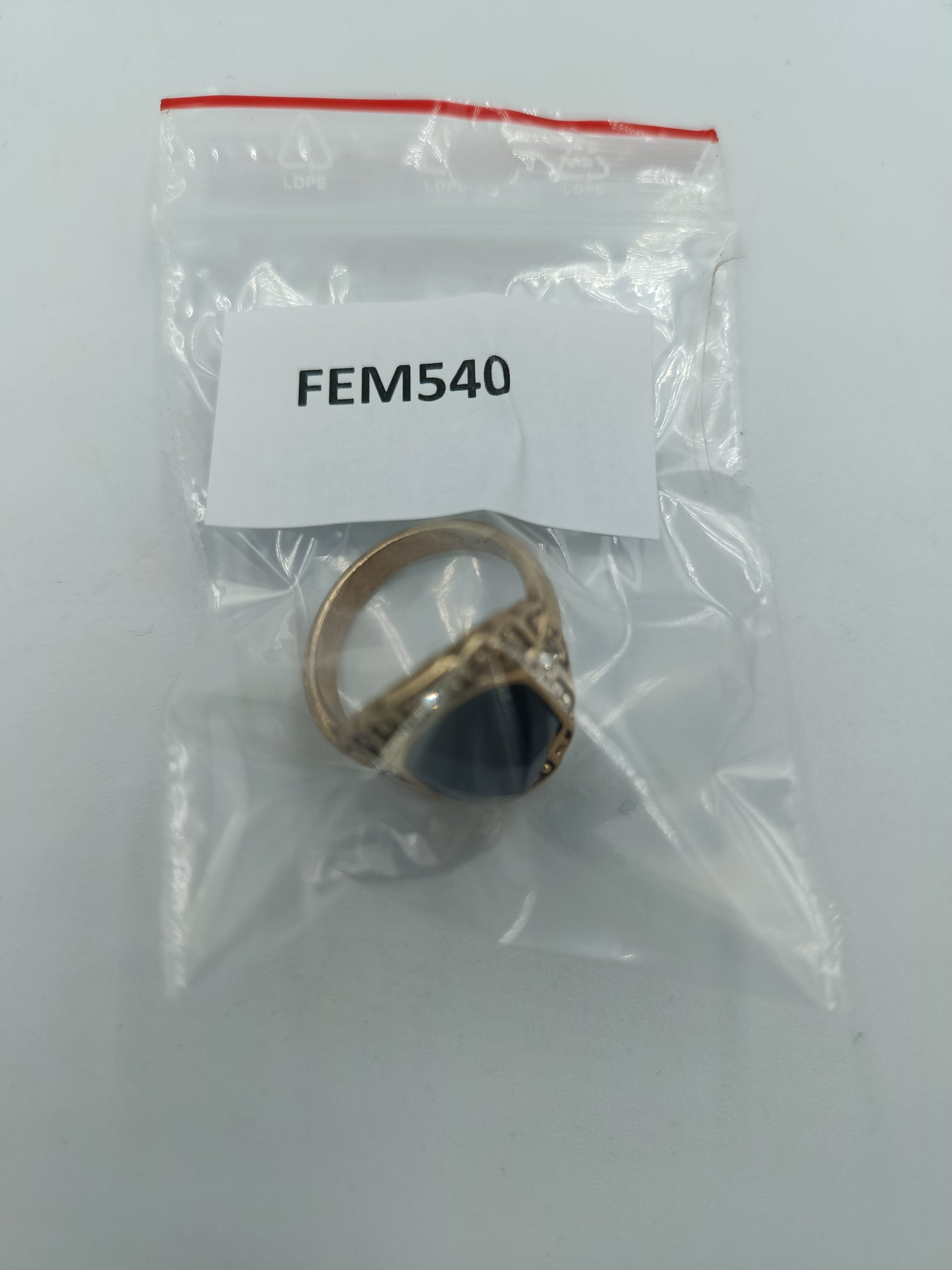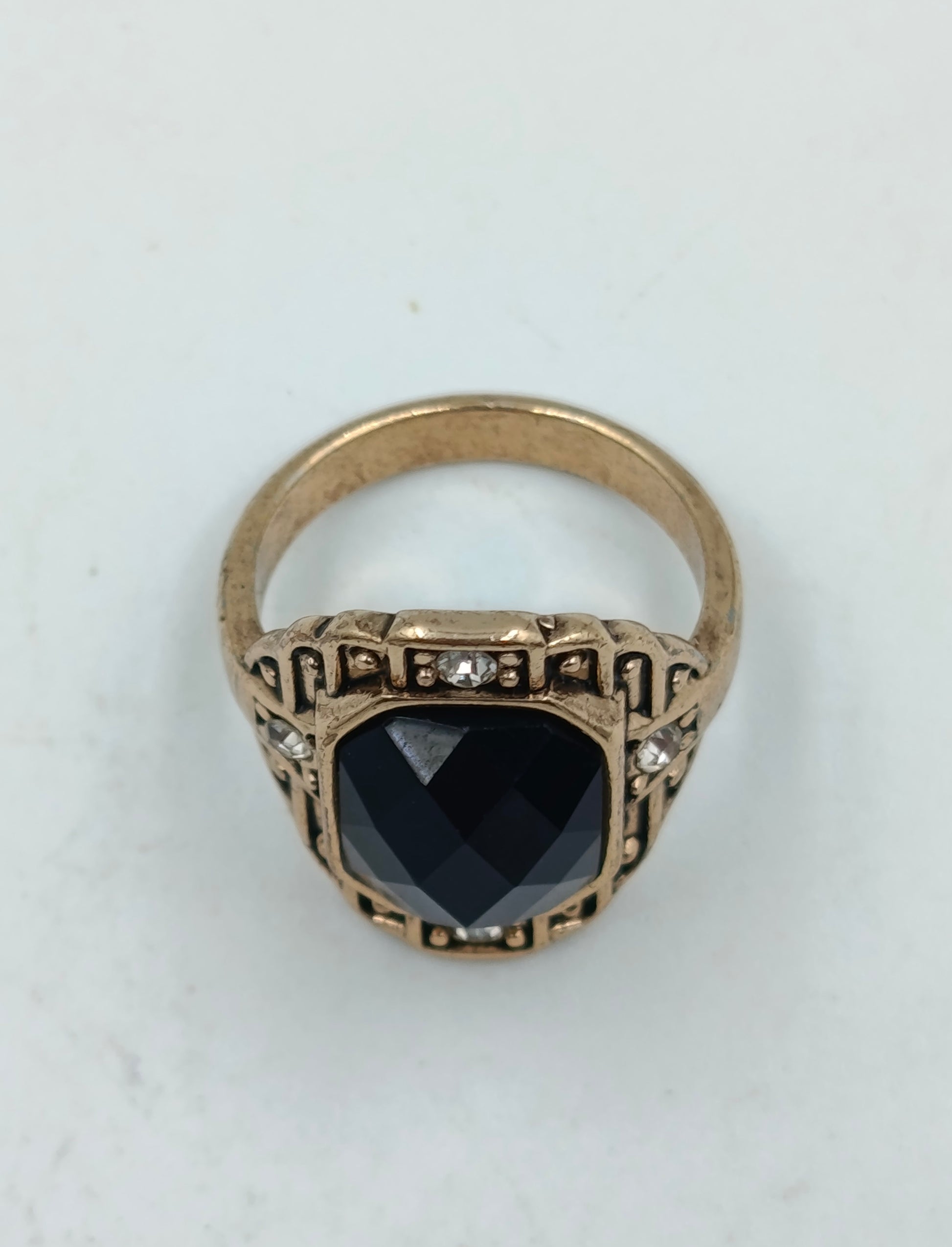 Eleganter Ring im Vintage-Stil mit einem großen schwarzen Facettenstein als Mittelpunkt. Umrahmt wird der Stein von kleinen klaren Strasssteinen und feinen Ornamentdetails, die dem Design einen edlen Charakter verleihen.