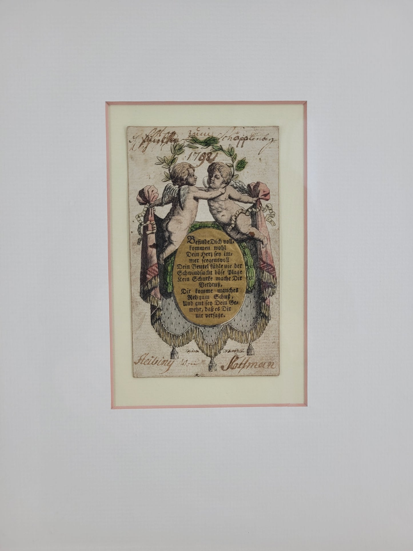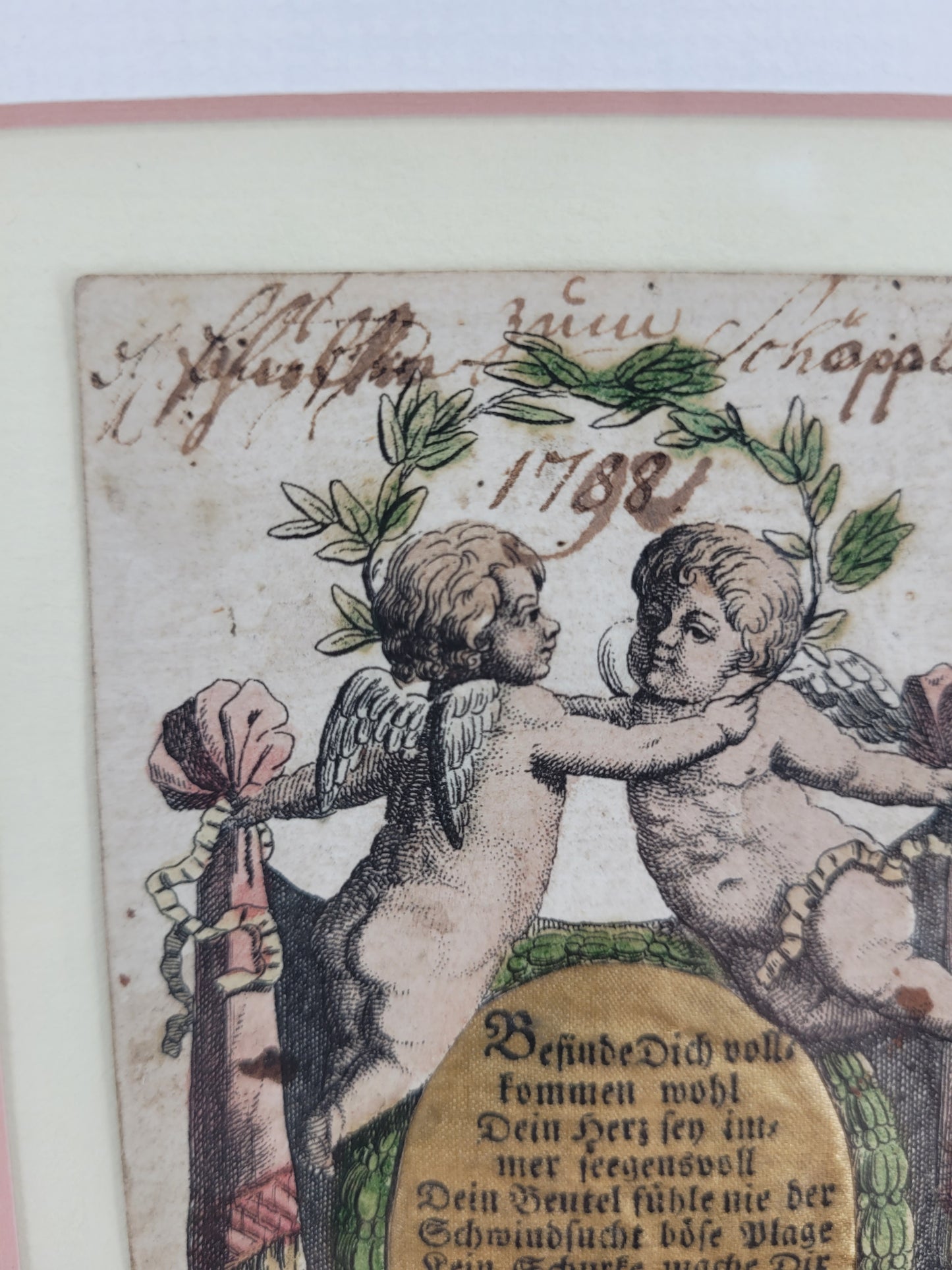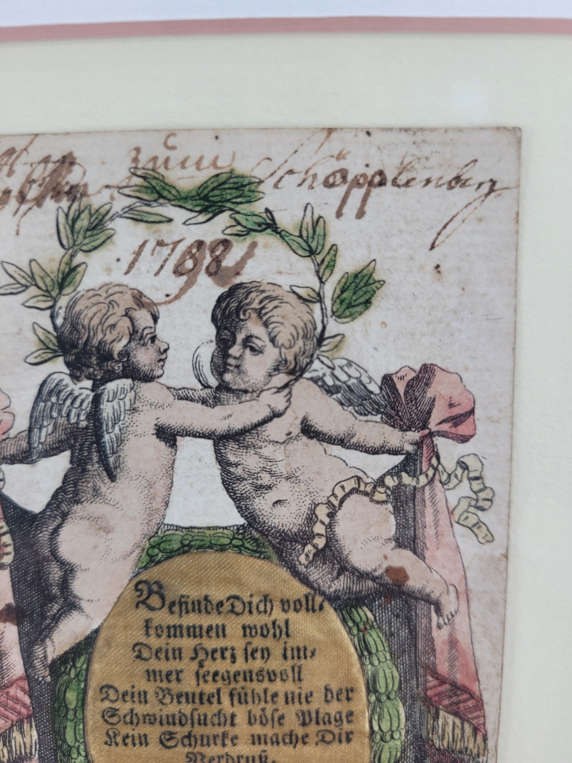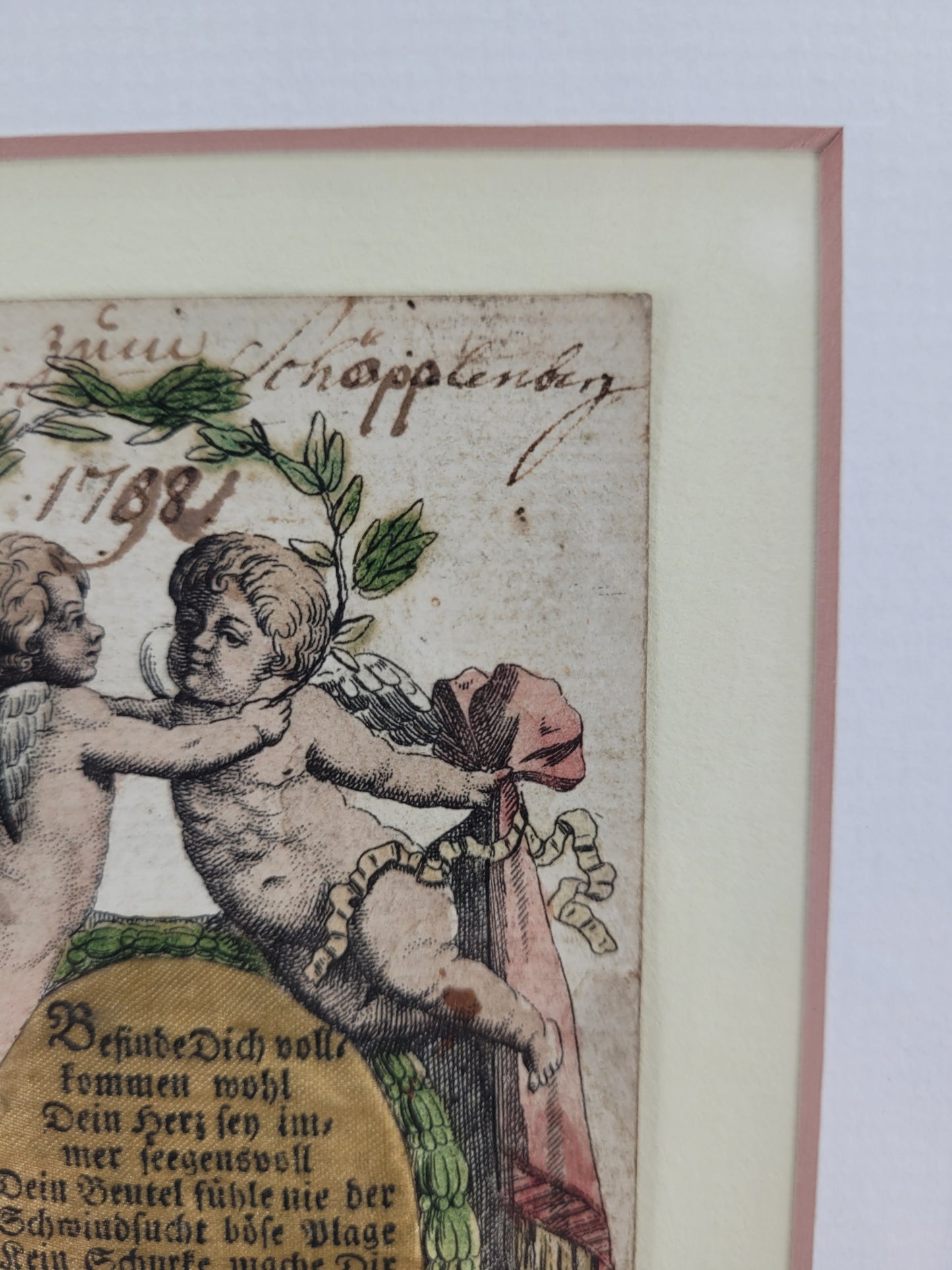 Grafik Farbdruck Grußkarte aus 1788 mit Puttenengeln