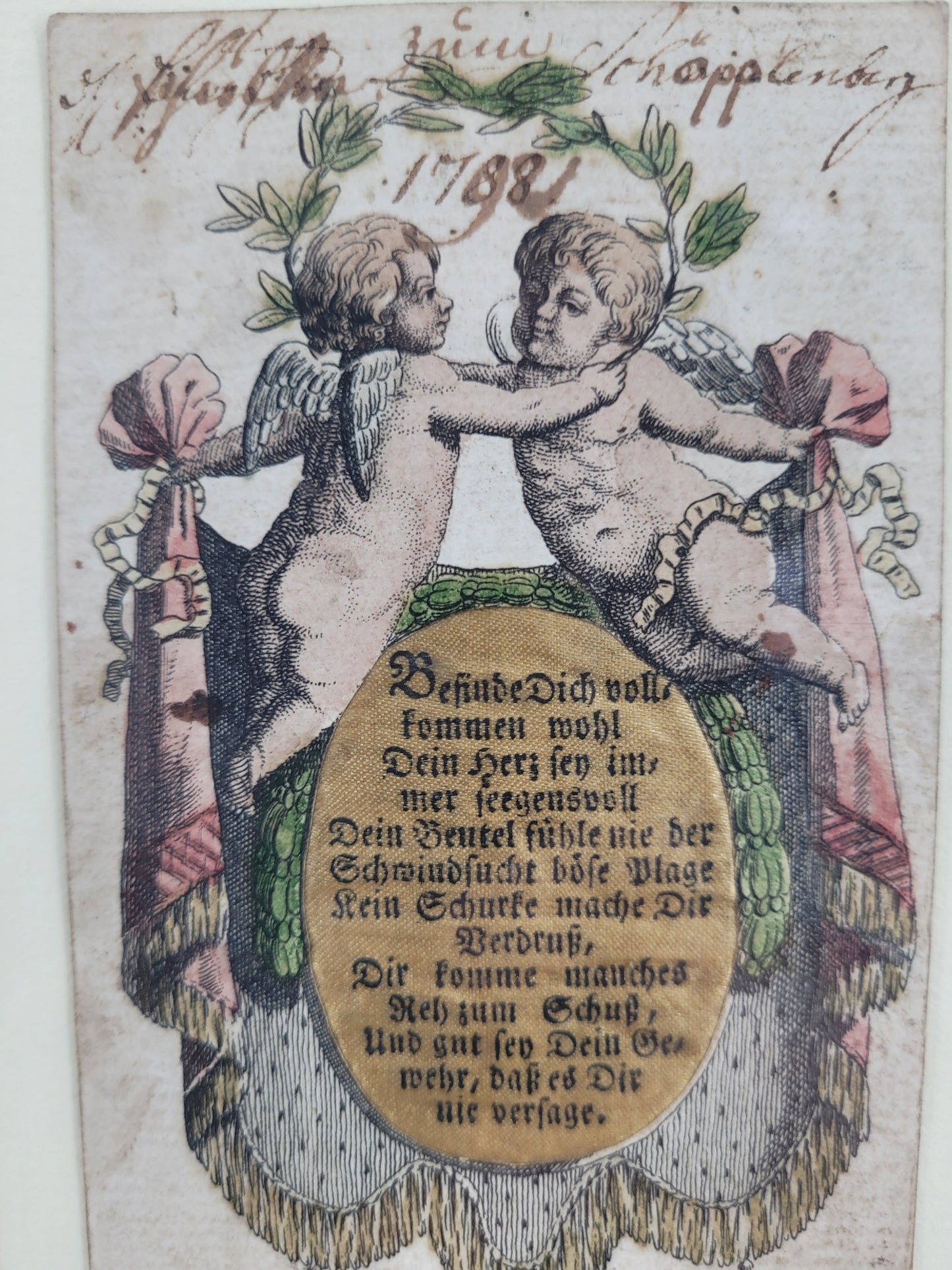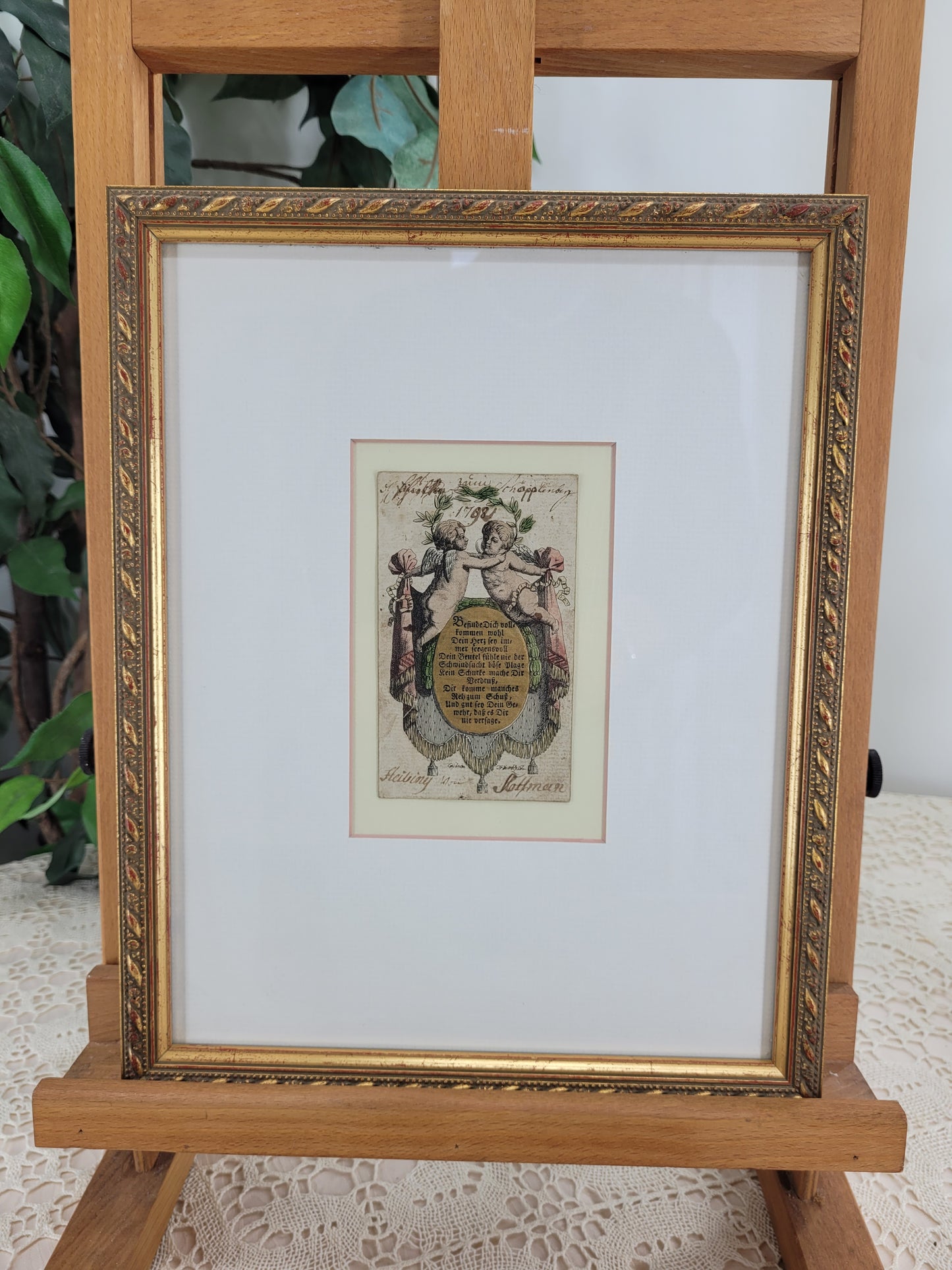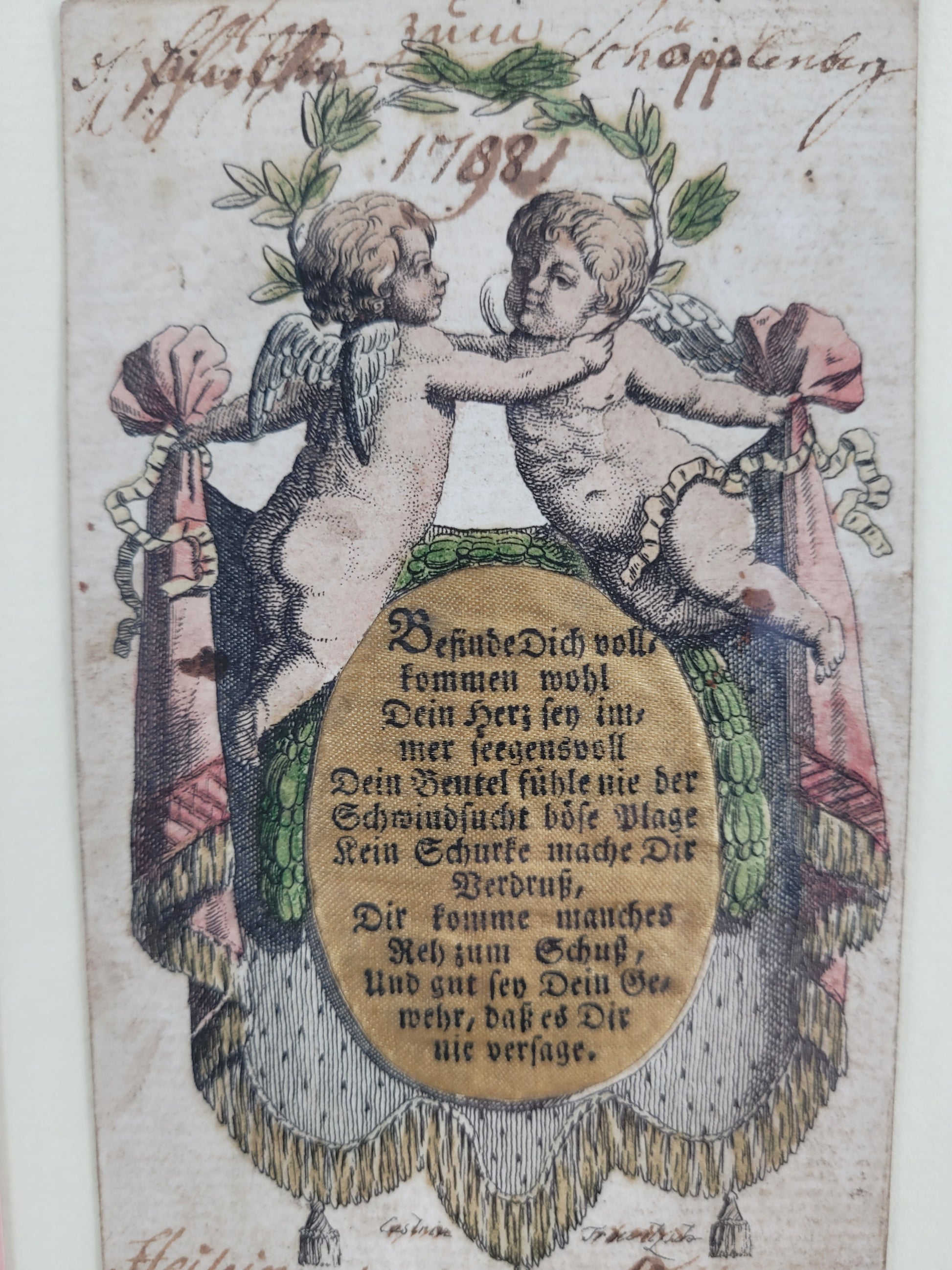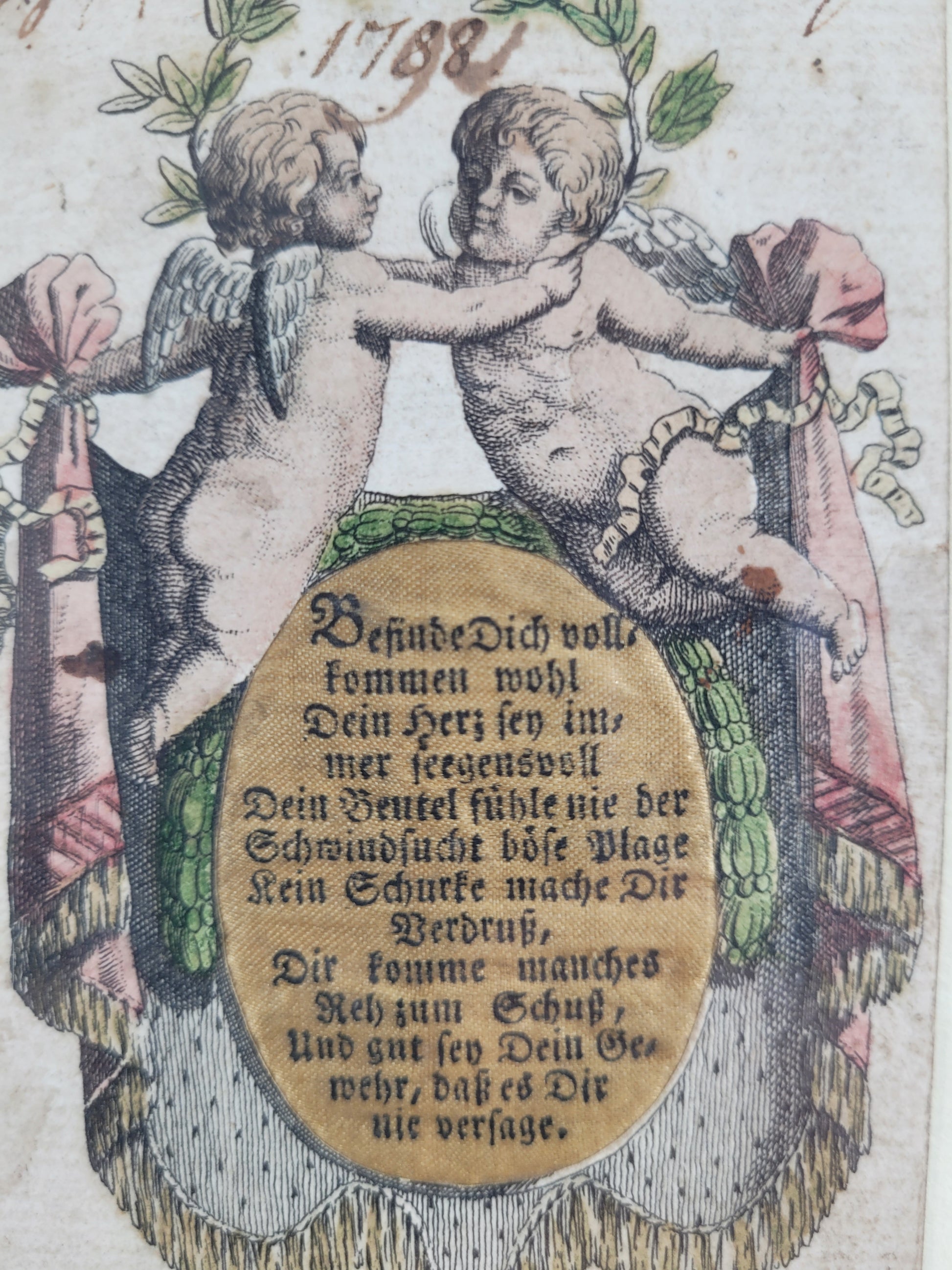 Grafik Farbdruck Grußkarte aus 1788 mit Puttenengeln