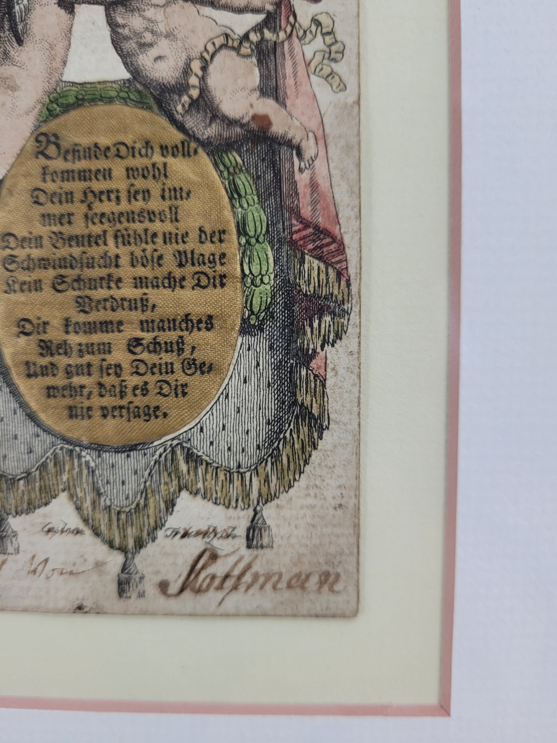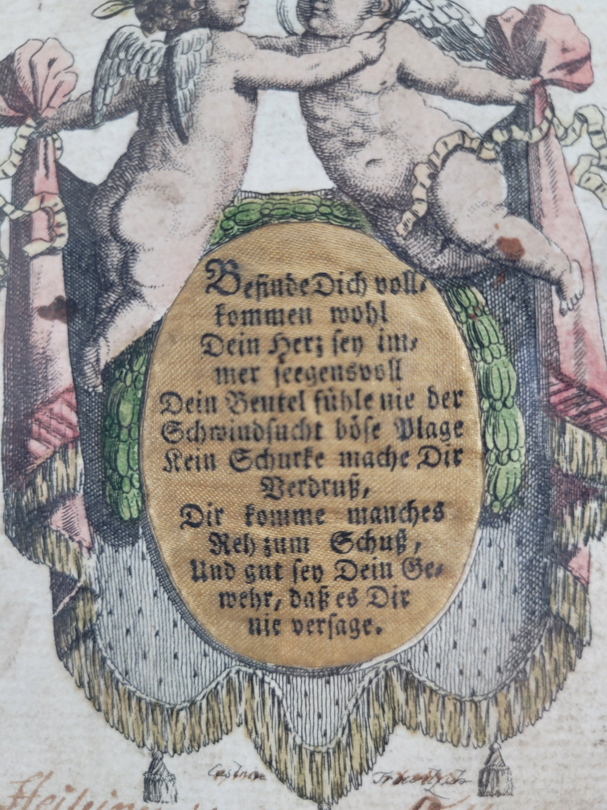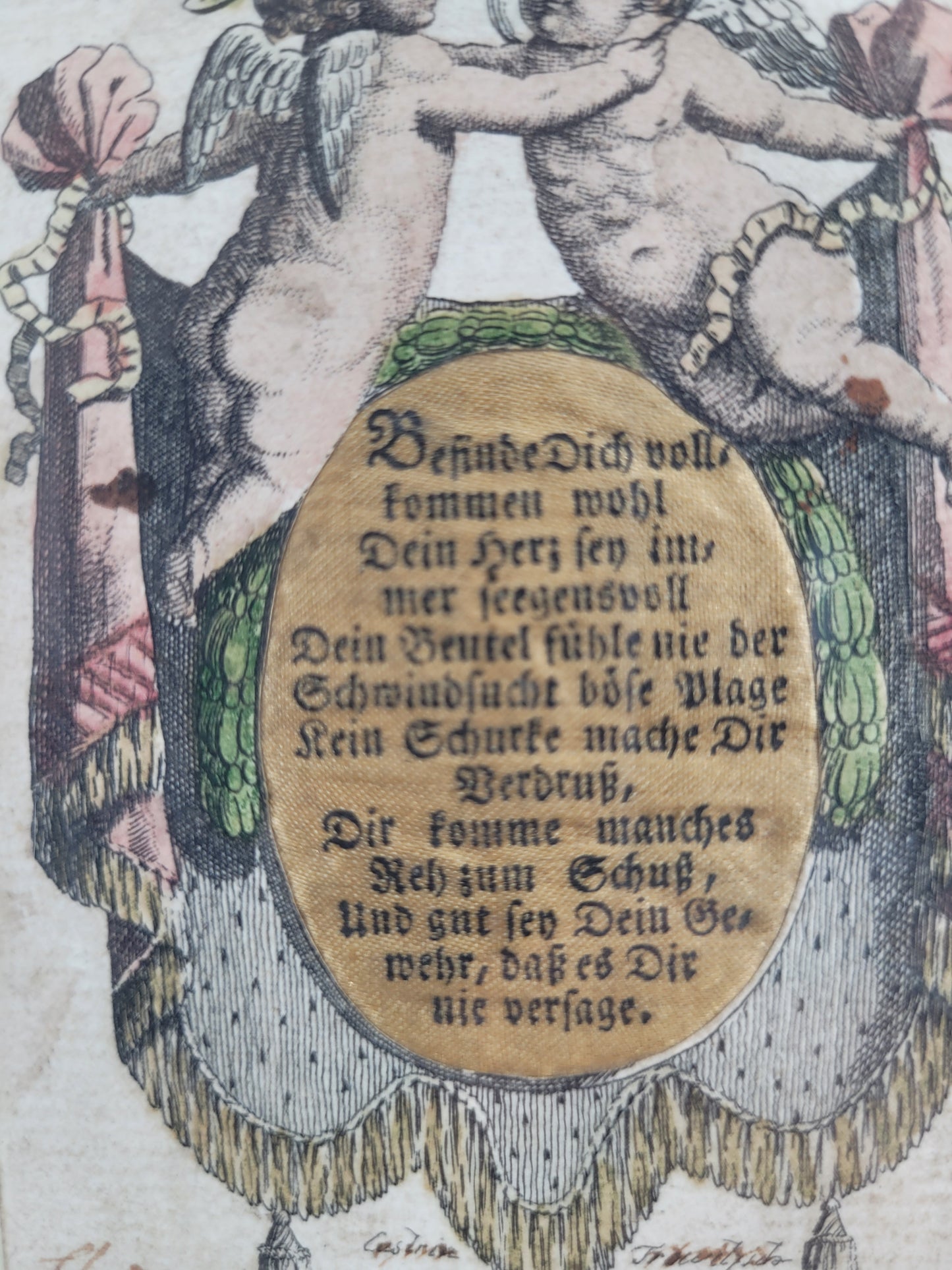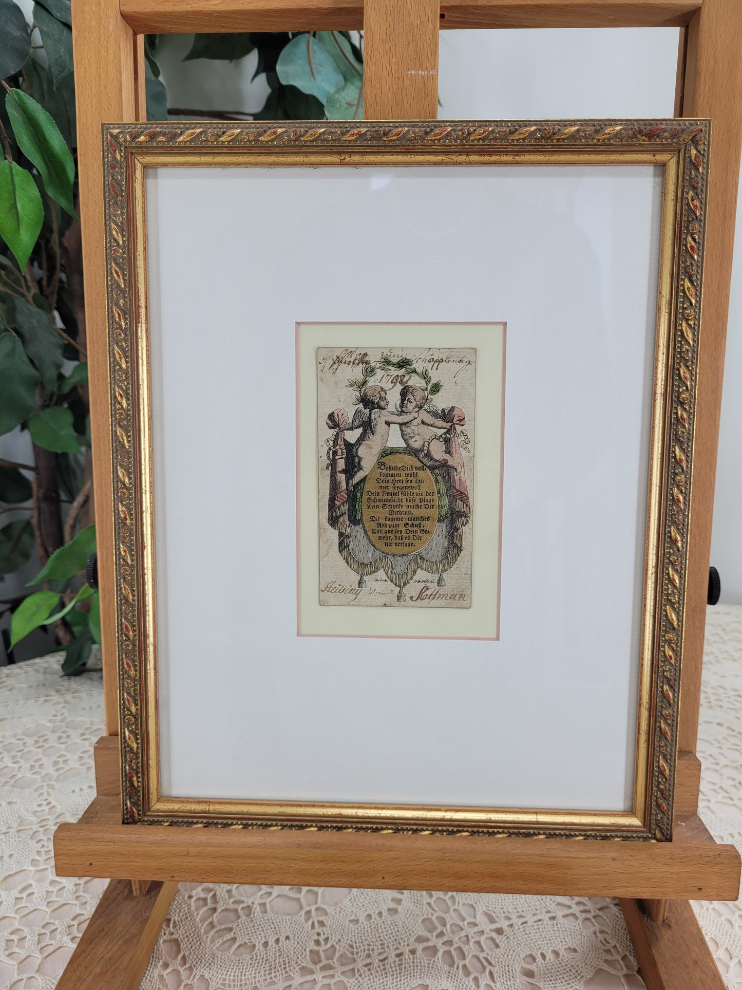 Grafik Farbdruck Grußkarte aus 1788 mit Puttenengeln