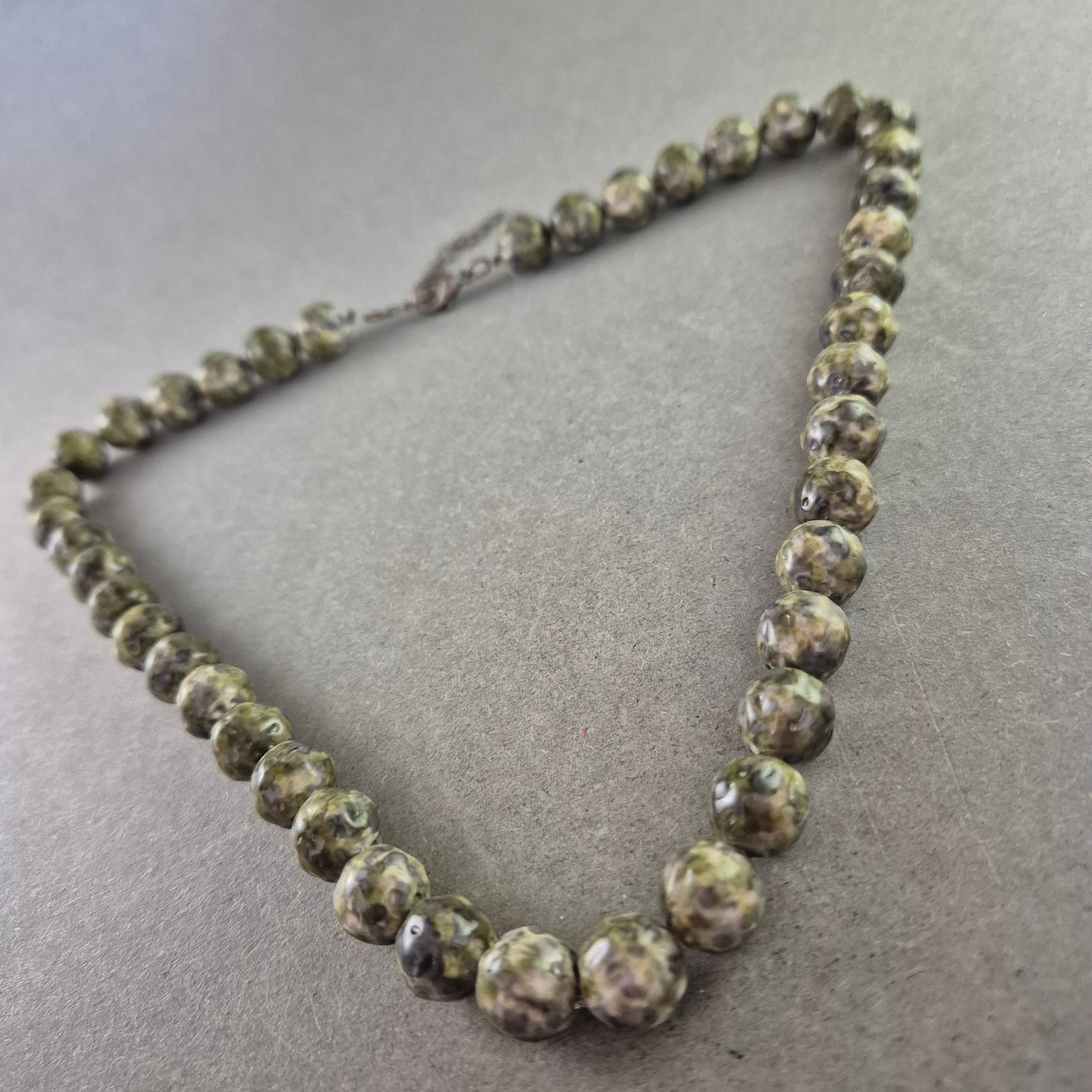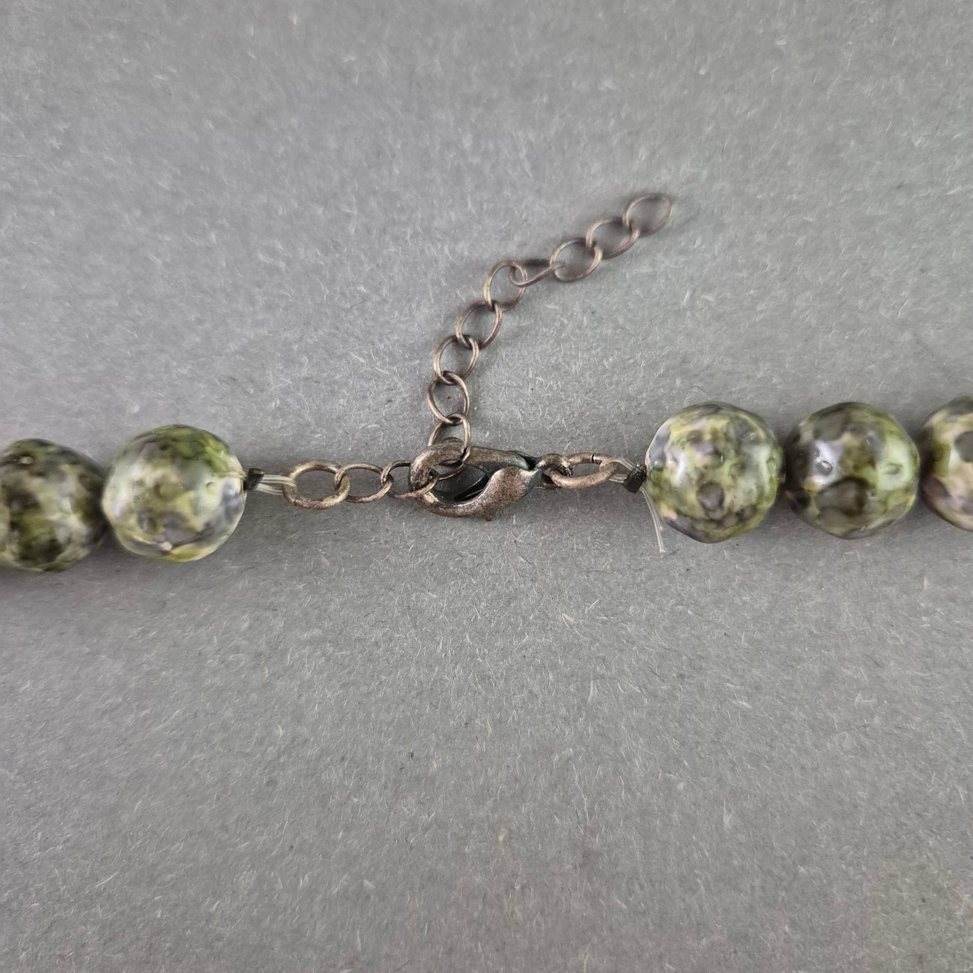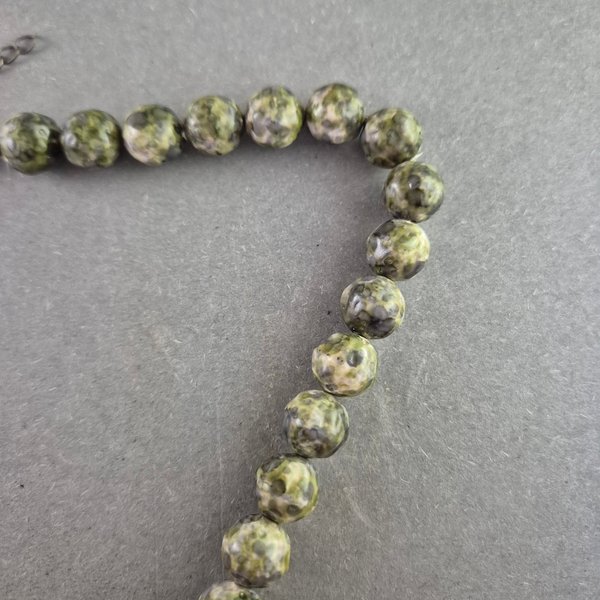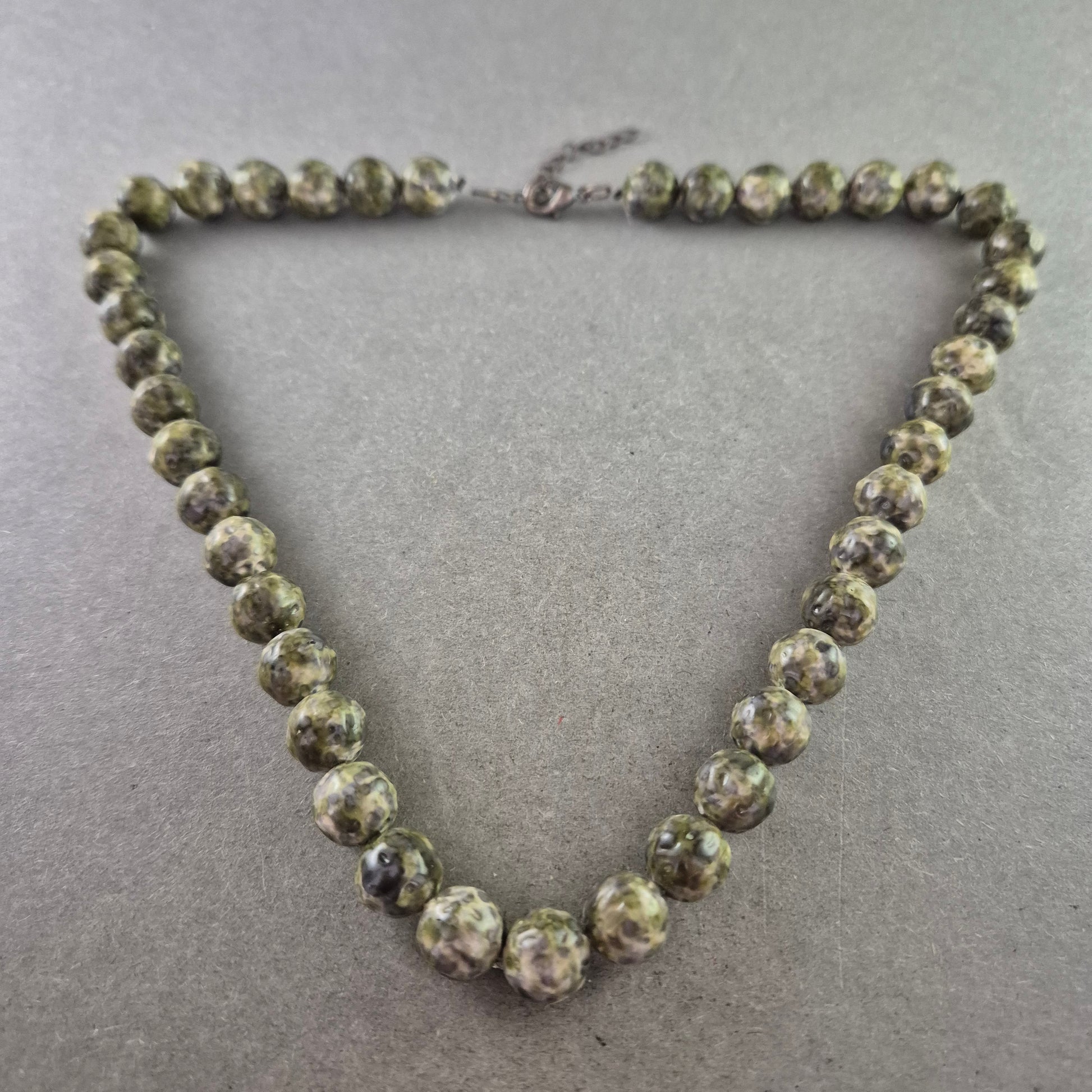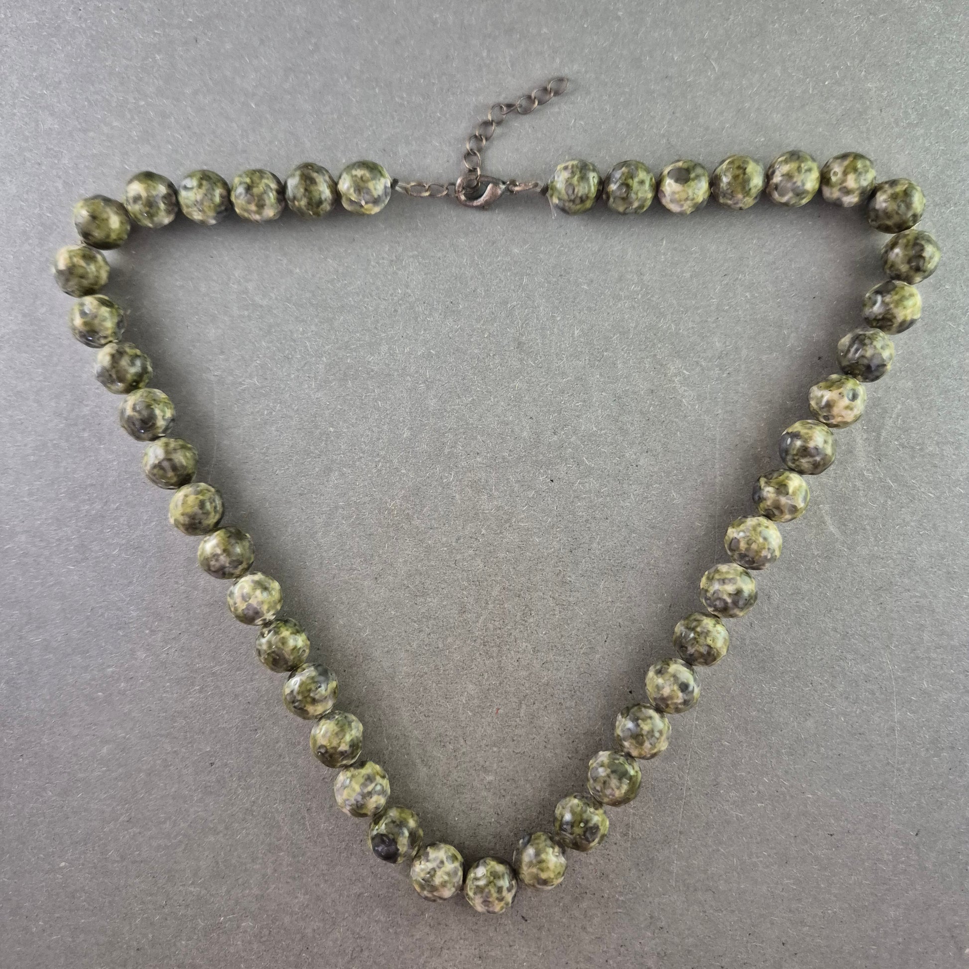 Diese auffällige Halskette besteht aus grünlich marmorierten Kunststoffperlen mit unregelmäßiger Oberfläche, die ihr eine organisch-natürliche Ausstrahlung verleihen. Der dunkle Metallverschluss mit Verlängerungskette ermöglicht eine flexible Längenanpassung. Perfekt für Liebhaber individueller Vintage-Stücke mit Charakter.