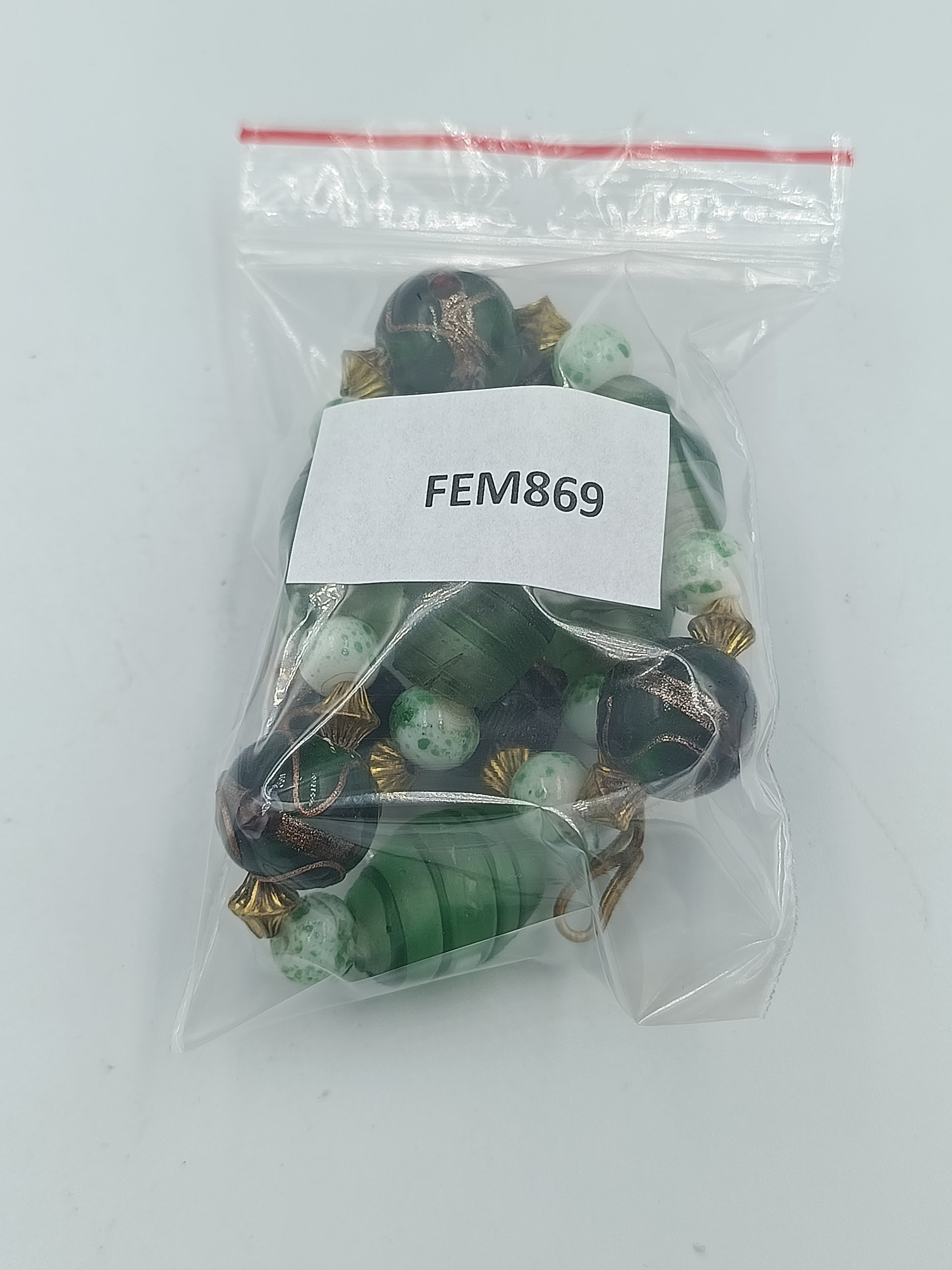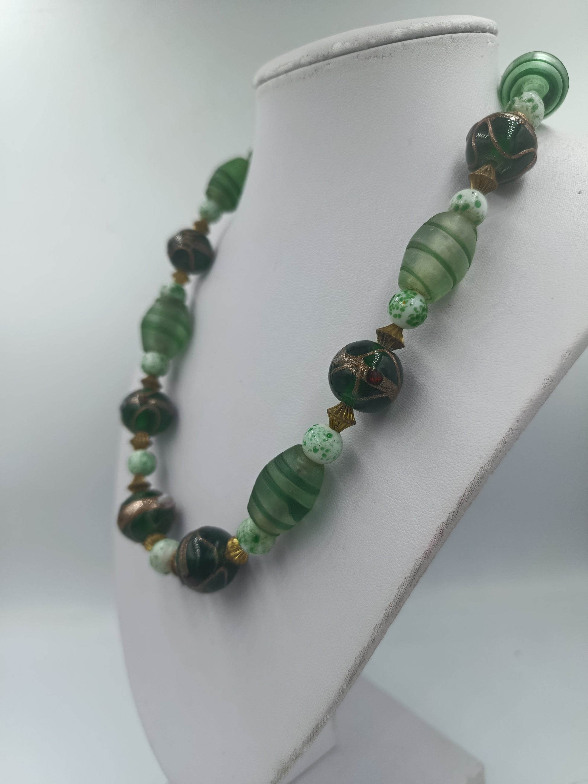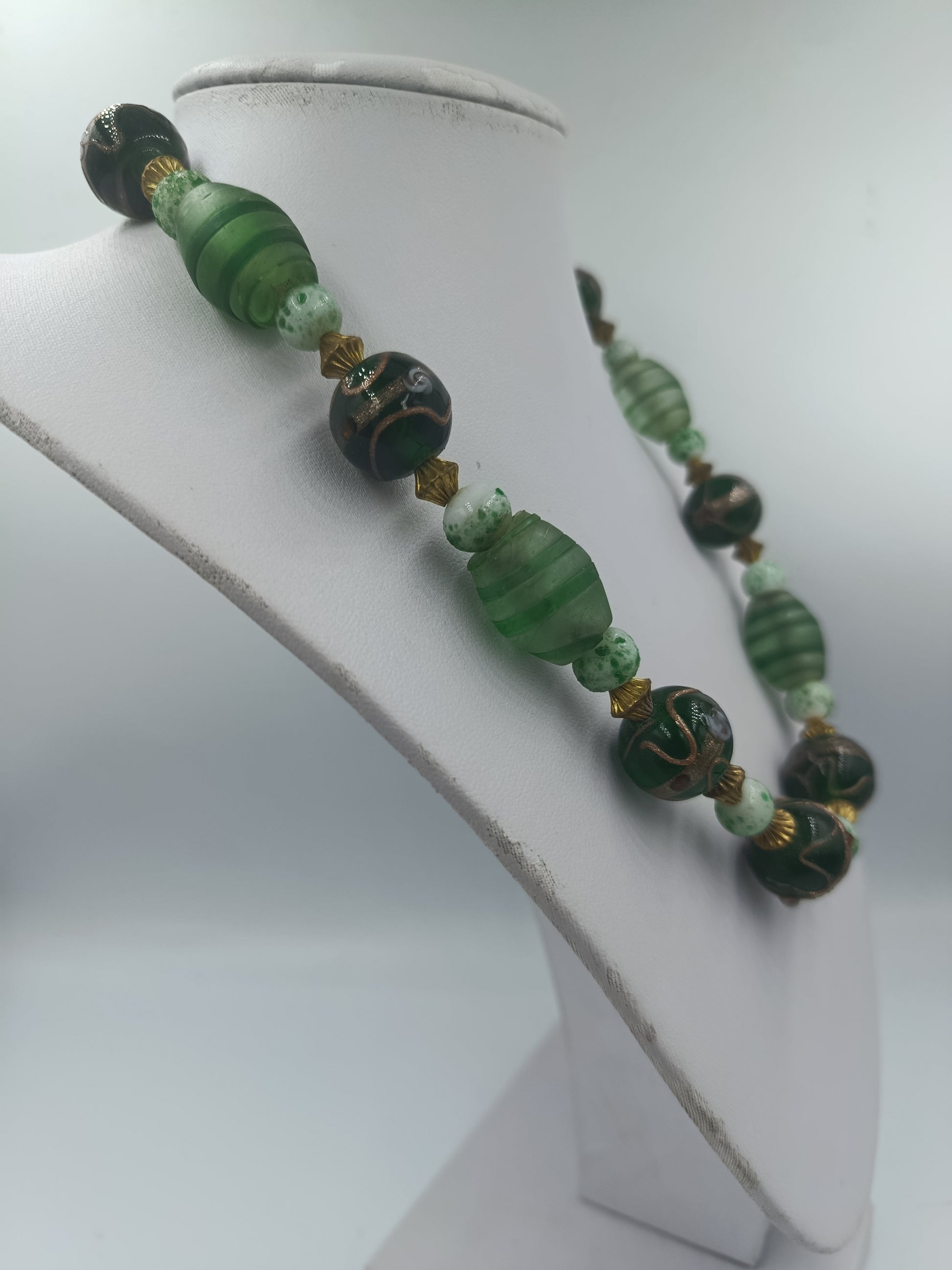 Auffällige Halskette mit großen, unterschiedlich strukturierten Glasperlen in Grüntönen – kombiniert mit goldfarbenen Zwischenperlen. Das Design wirkt edel und leicht orientalisch, ideal für Vintage- oder Boho-Looks. Die verschiedenen Formen und Texturen verleihen der Kette Tiefe und Charakter.