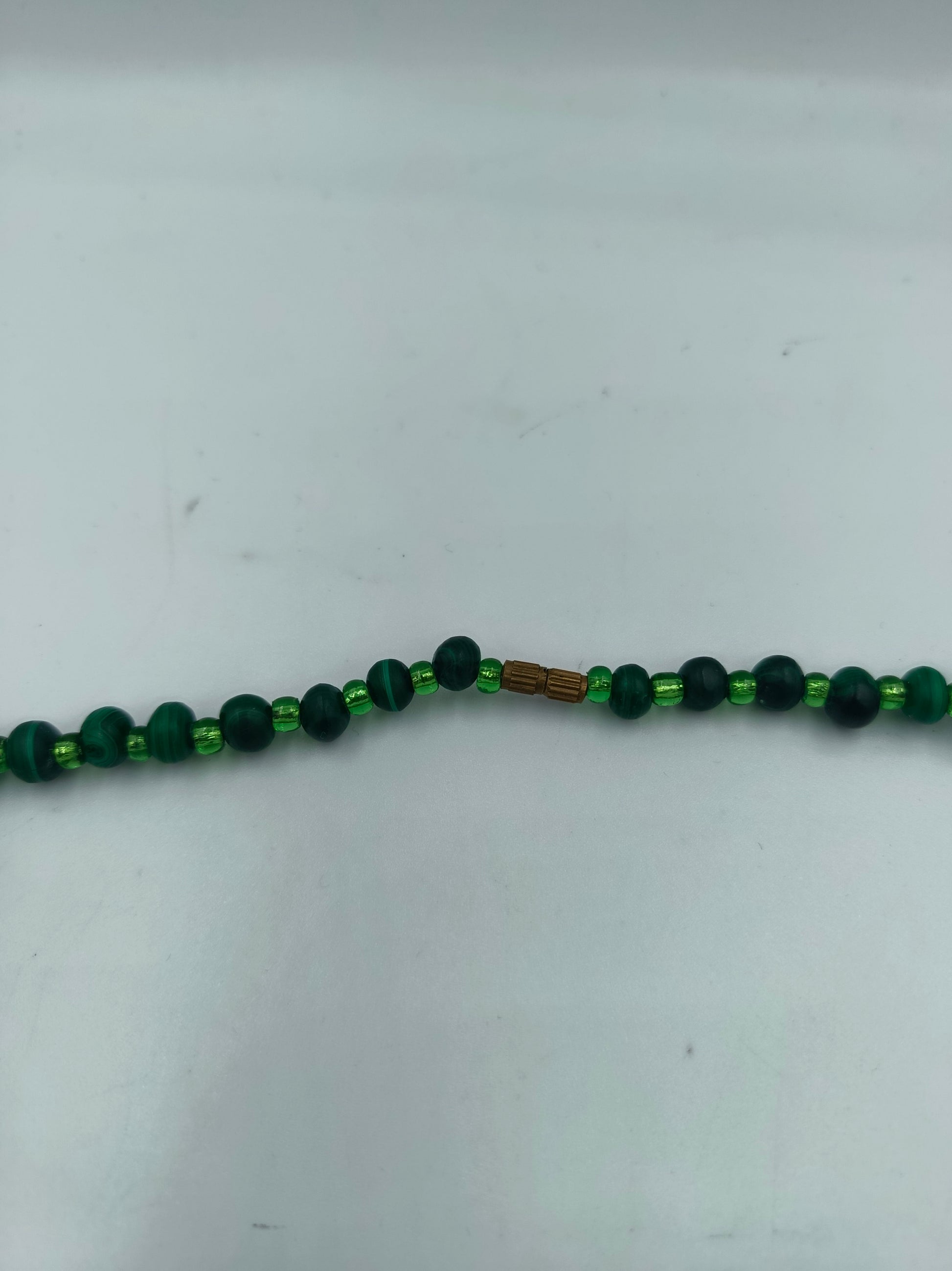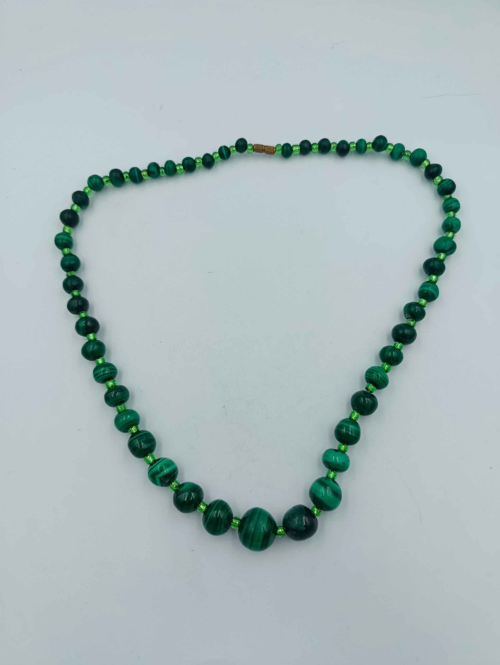 Auffällige Halskette mit wunderschönen grünen Rundperlen in verschiedenen Größen. Die Perlen zeigen eine leicht marmorierte Optik, die an Malachit erinnert, und sind mit kleinen, glänzenden Zwischenperlen abgestimmt. Eine kräftige Farbkombination, die jedem Outfit einen eleganten und zugleich natürlichen Touch verleiht.