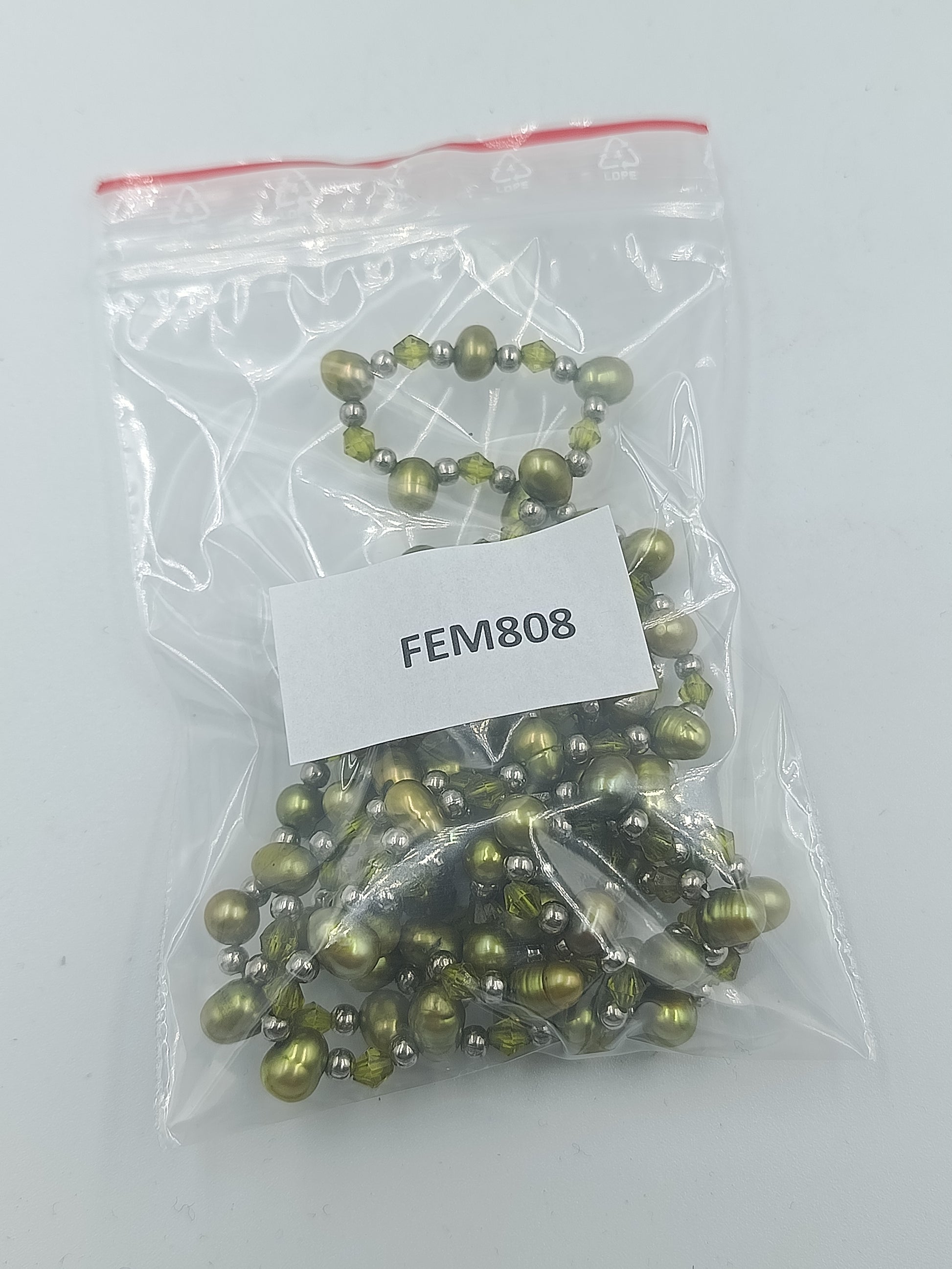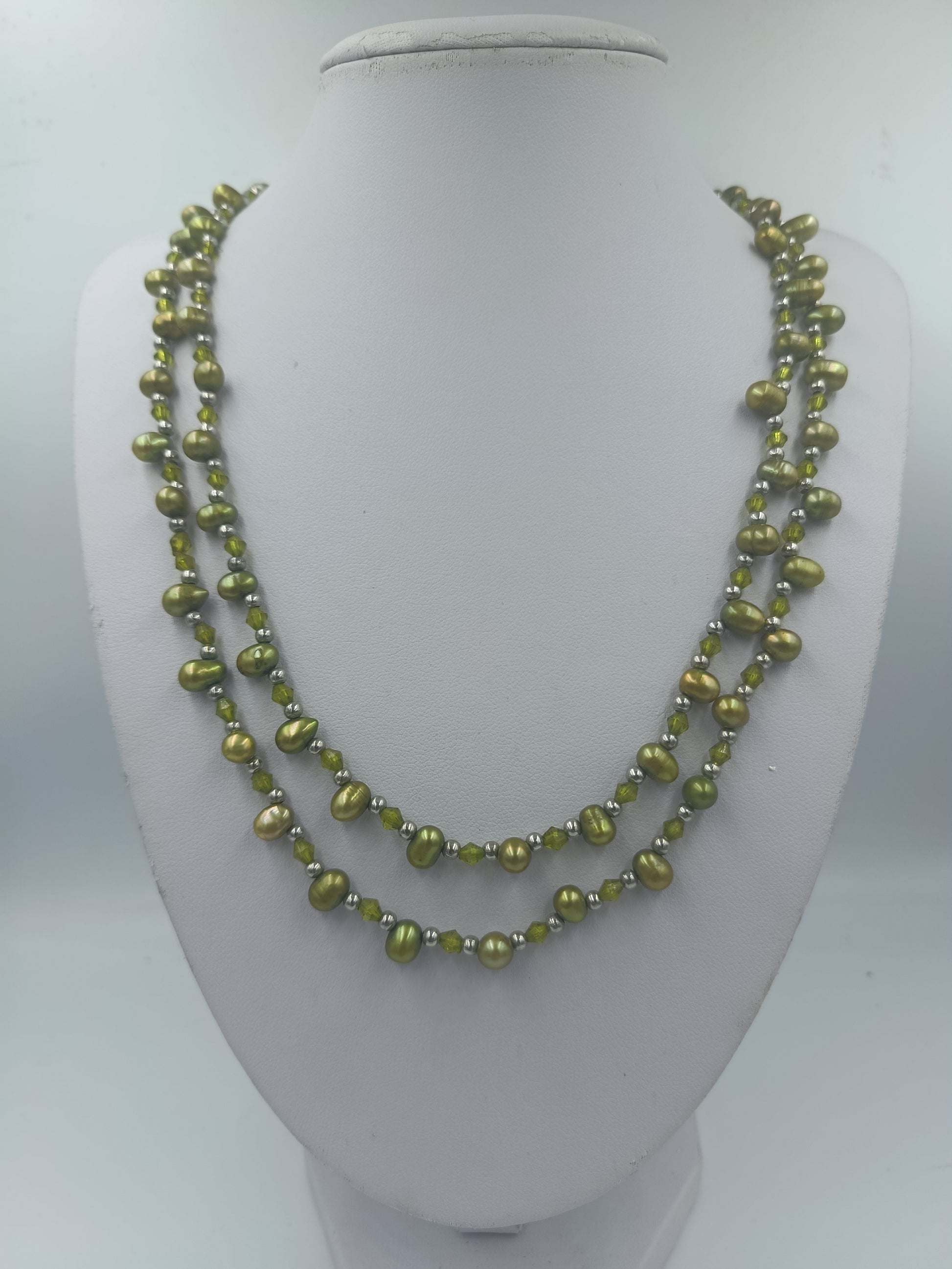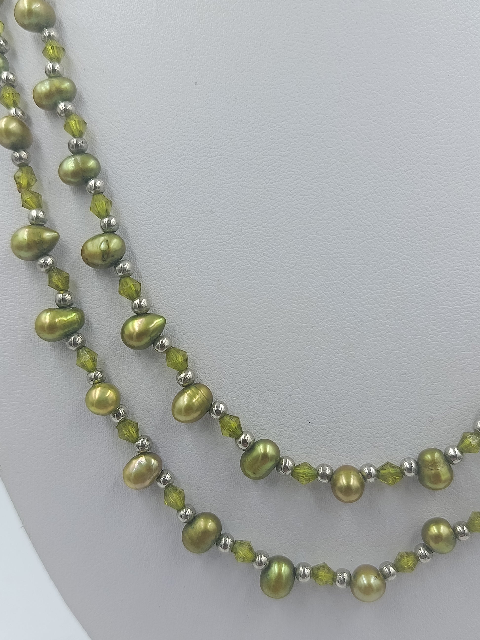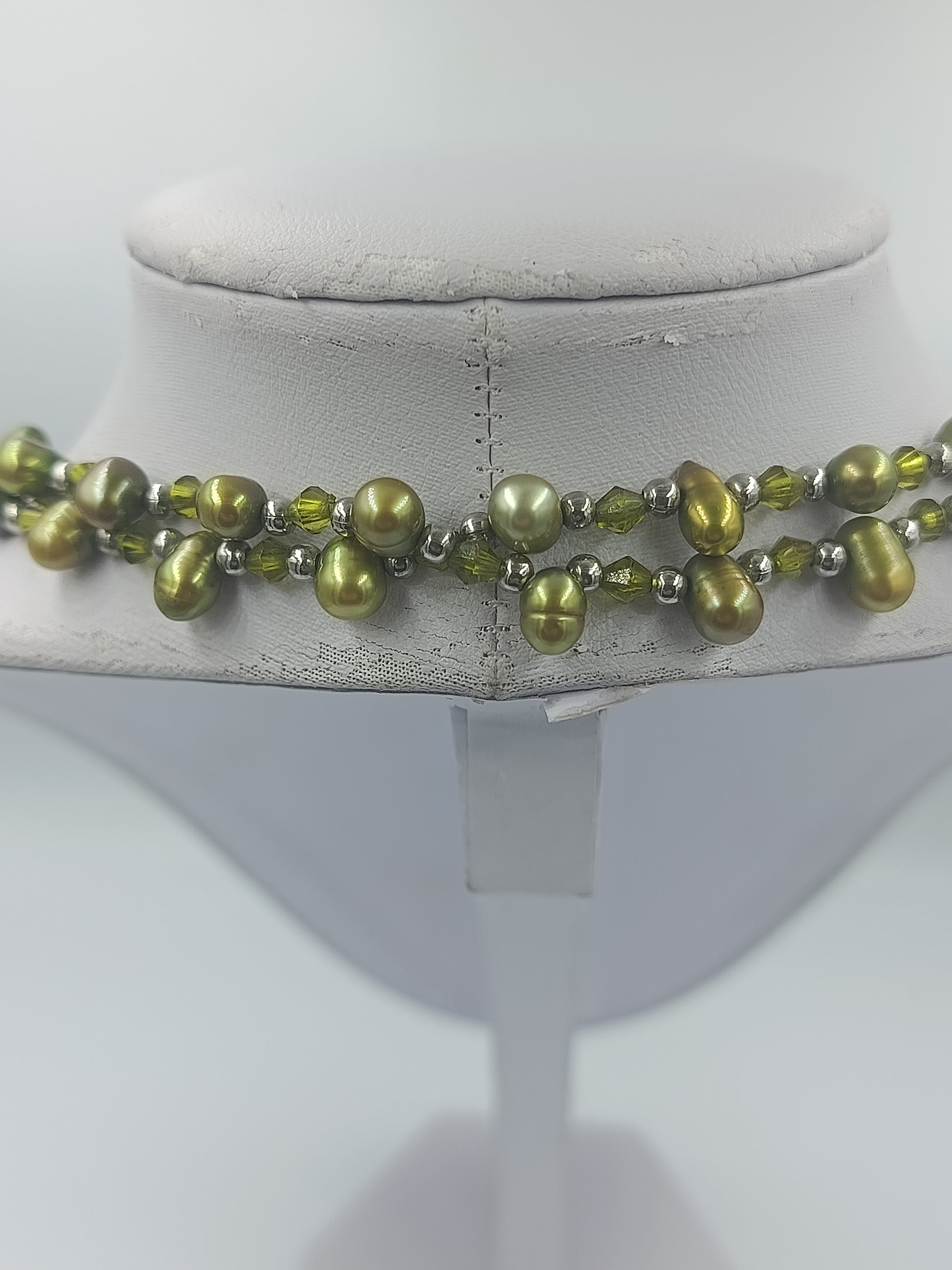 Schöne zweireihige Perlenkette in einem eleganten Olivgrün. Die Kombination aus schimmernden Glasperlen, kleinen silberfarbenen Zwischenelementen und facettierten Kristallperlen verleiht der Kette ein edles, modernes Aussehen. Ein stilvolles Accessoire, das zu vielen Outfits passt – ob festlich oder lässig.