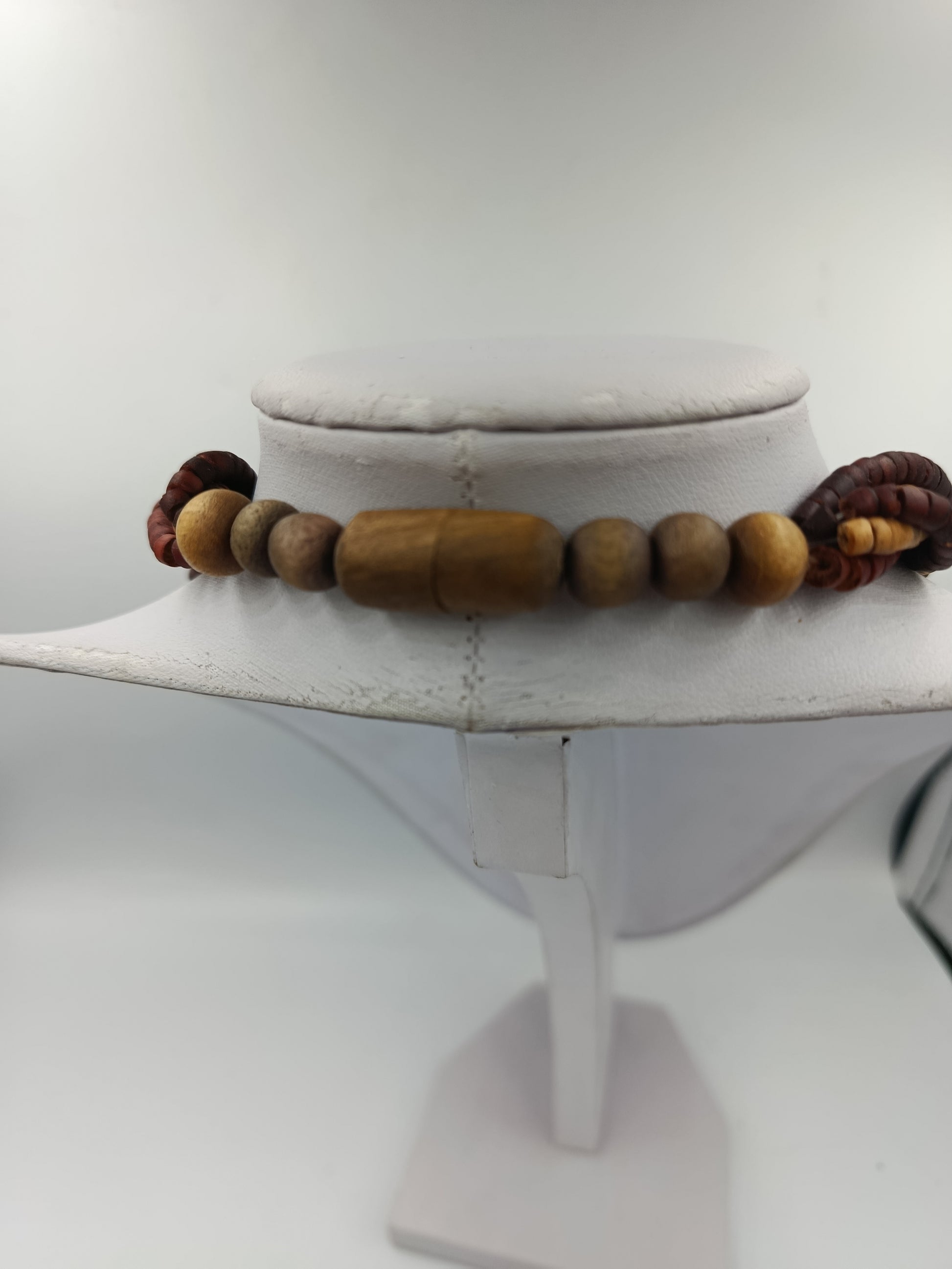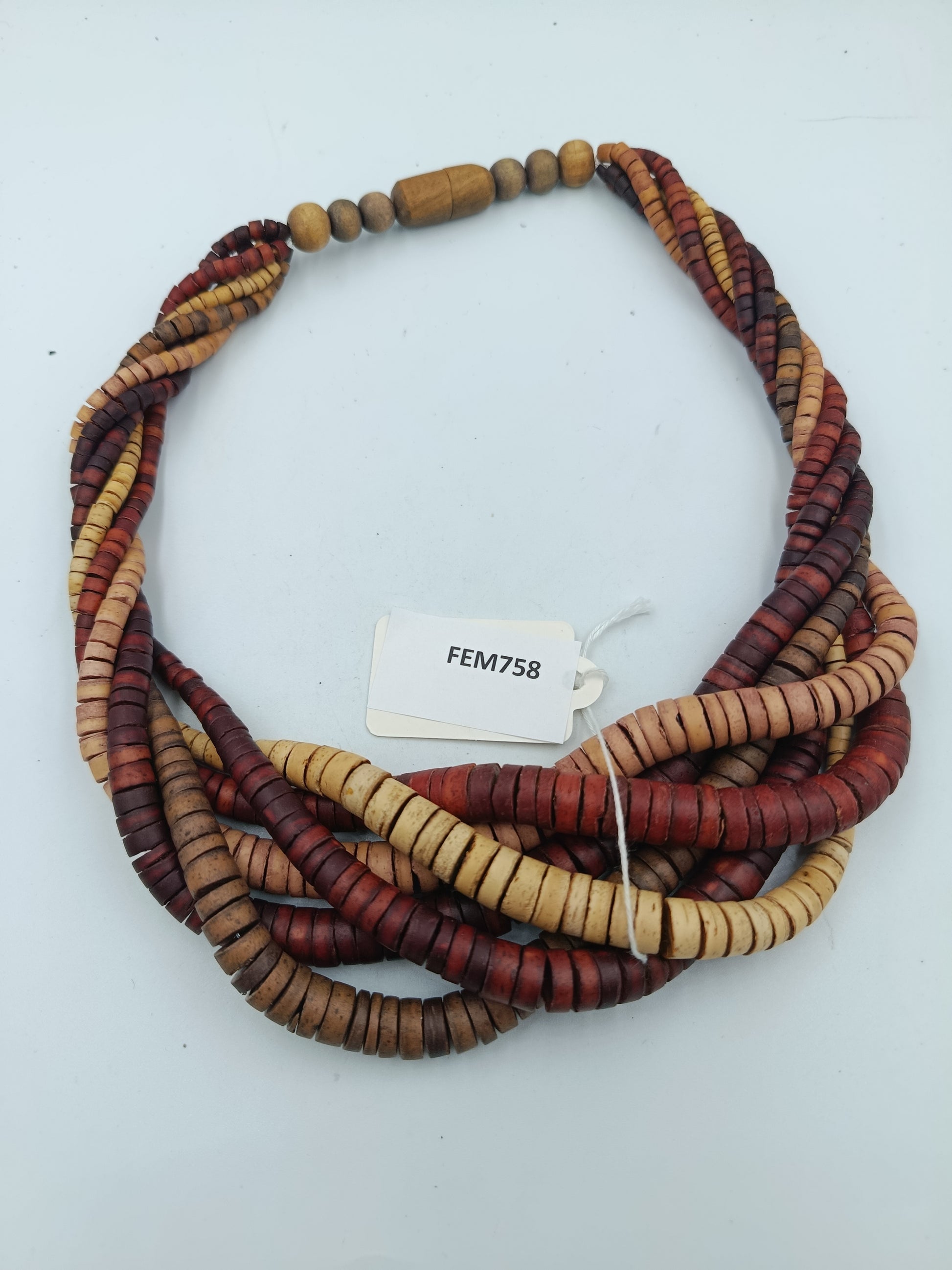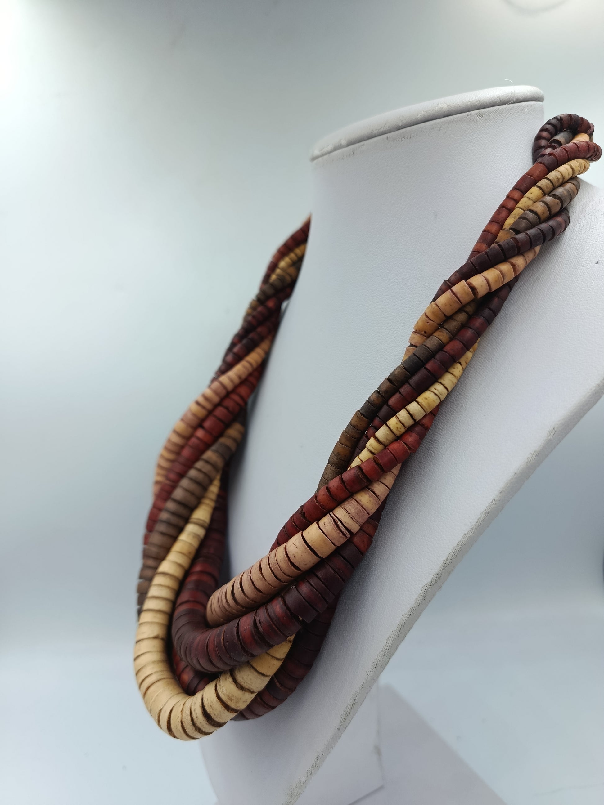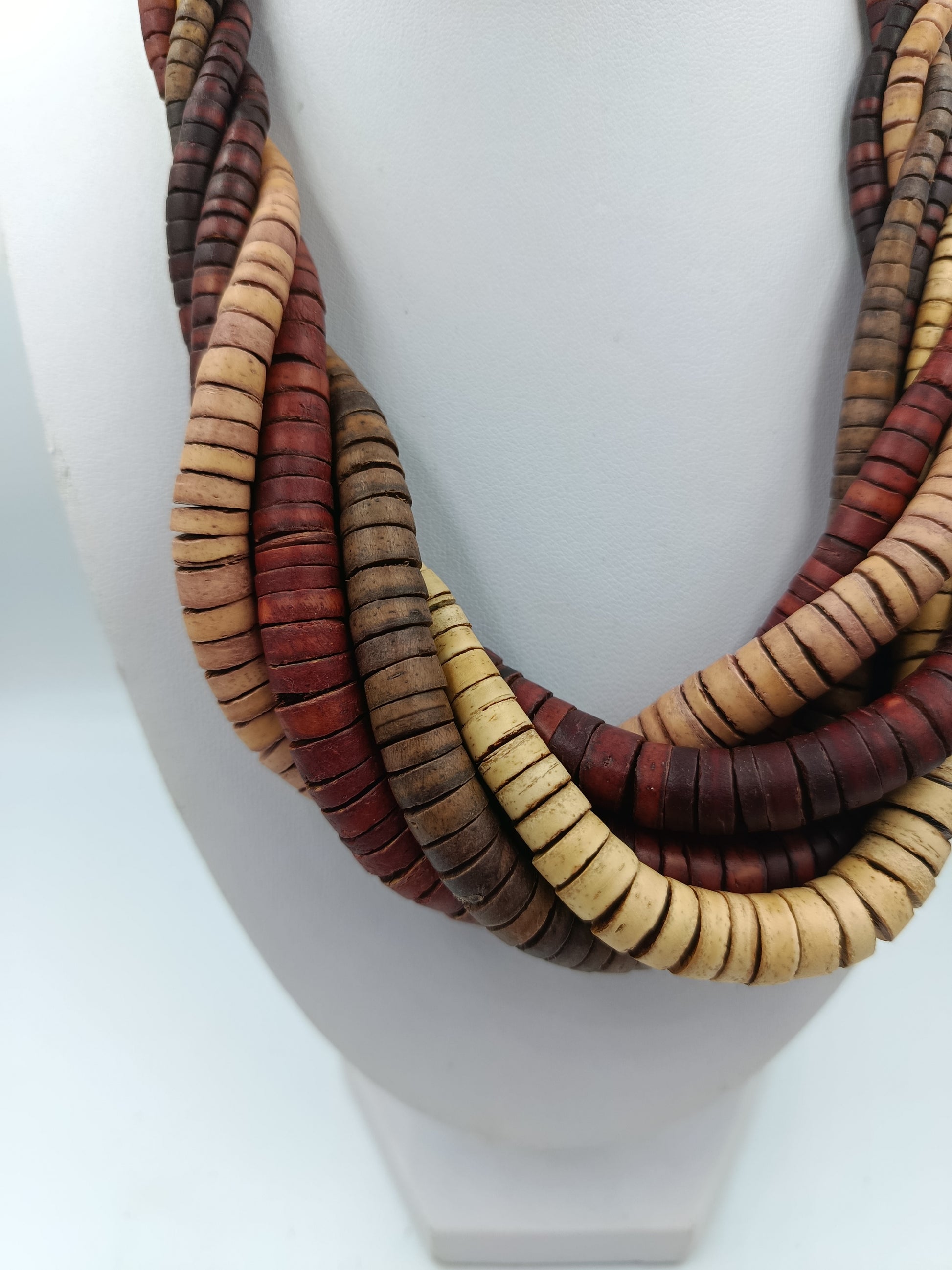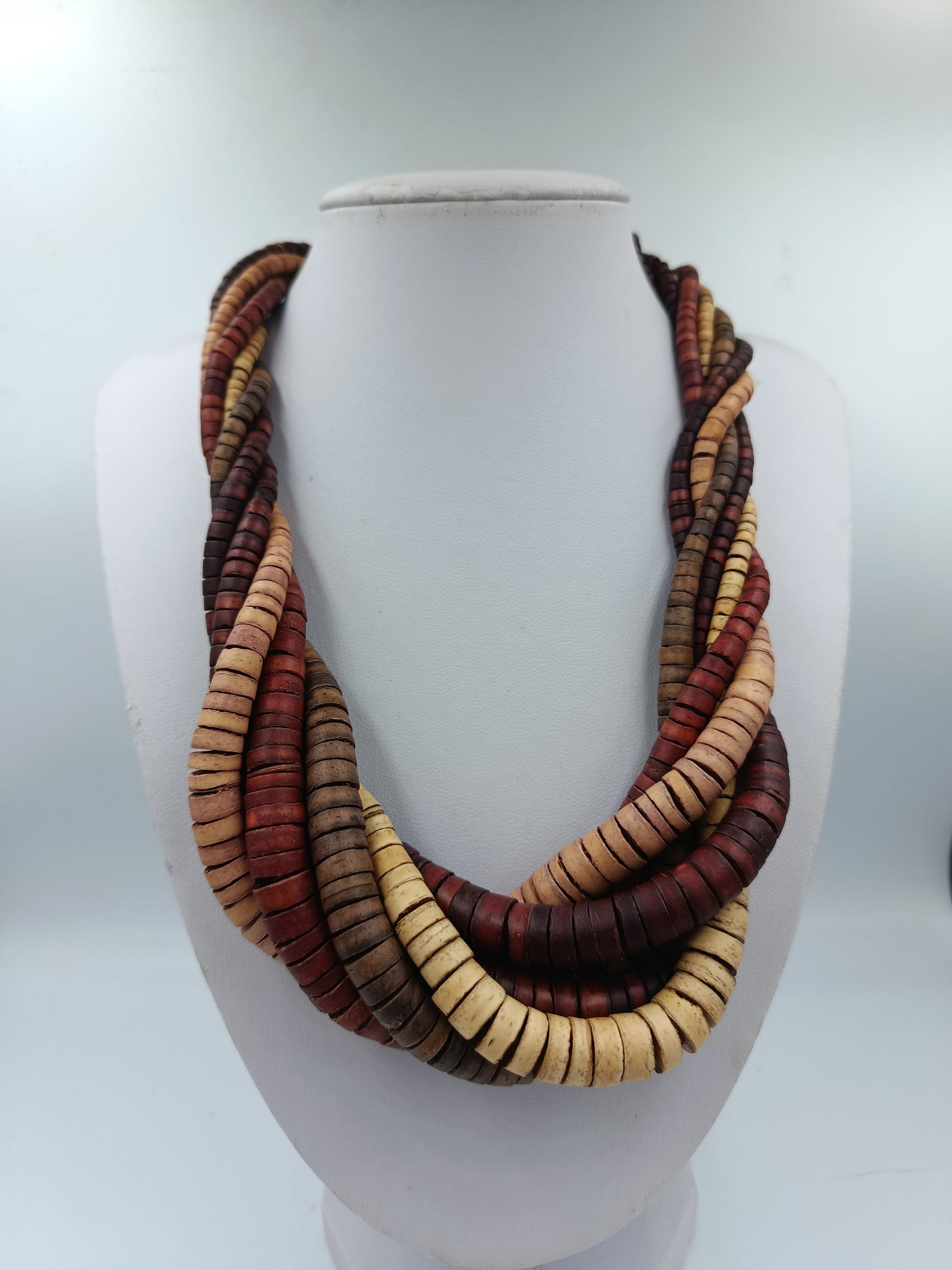 Wunderschöne mehrreihige Holzkette aus runden, flachen Holzscheiben in warmen Natur- und Erdtönen. Die Stränge sind elegant ineinander gedreht und ergeben einen ausdrucksstarken, natürlichen Look – perfekt für Boho-, Ethno- oder Vintage-Stile.