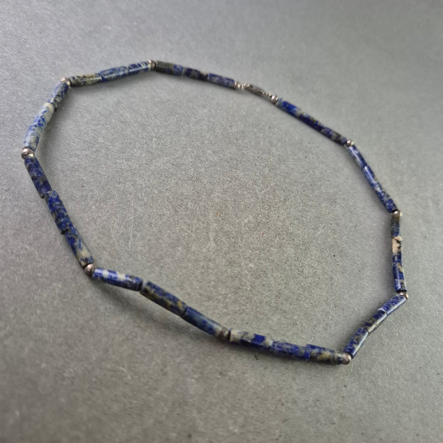 Diese außergewöhnliche Halskette besteht aus länglichen Röhrenperlen aus natürlichem Lapislazuli, deren tiefblaue Maserung stilvolle Akzente setzt. Zwischen den Steinen sorgen kleine silberfarbene Abstandselemente für eine dezente Gliederung. Das Design wirkt modern und gleichzeitig naturverbunden – perfekt für Liebhaber:innen individueller Schmuckstücke.
