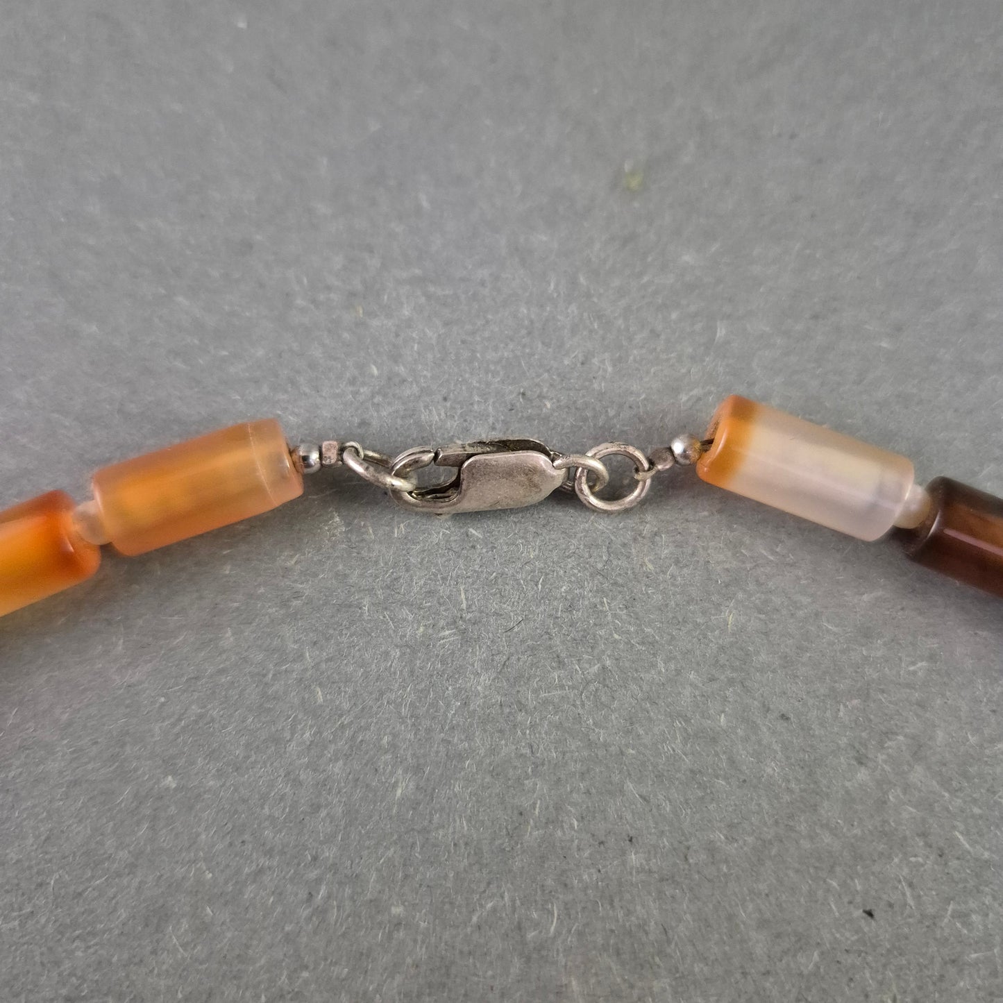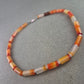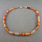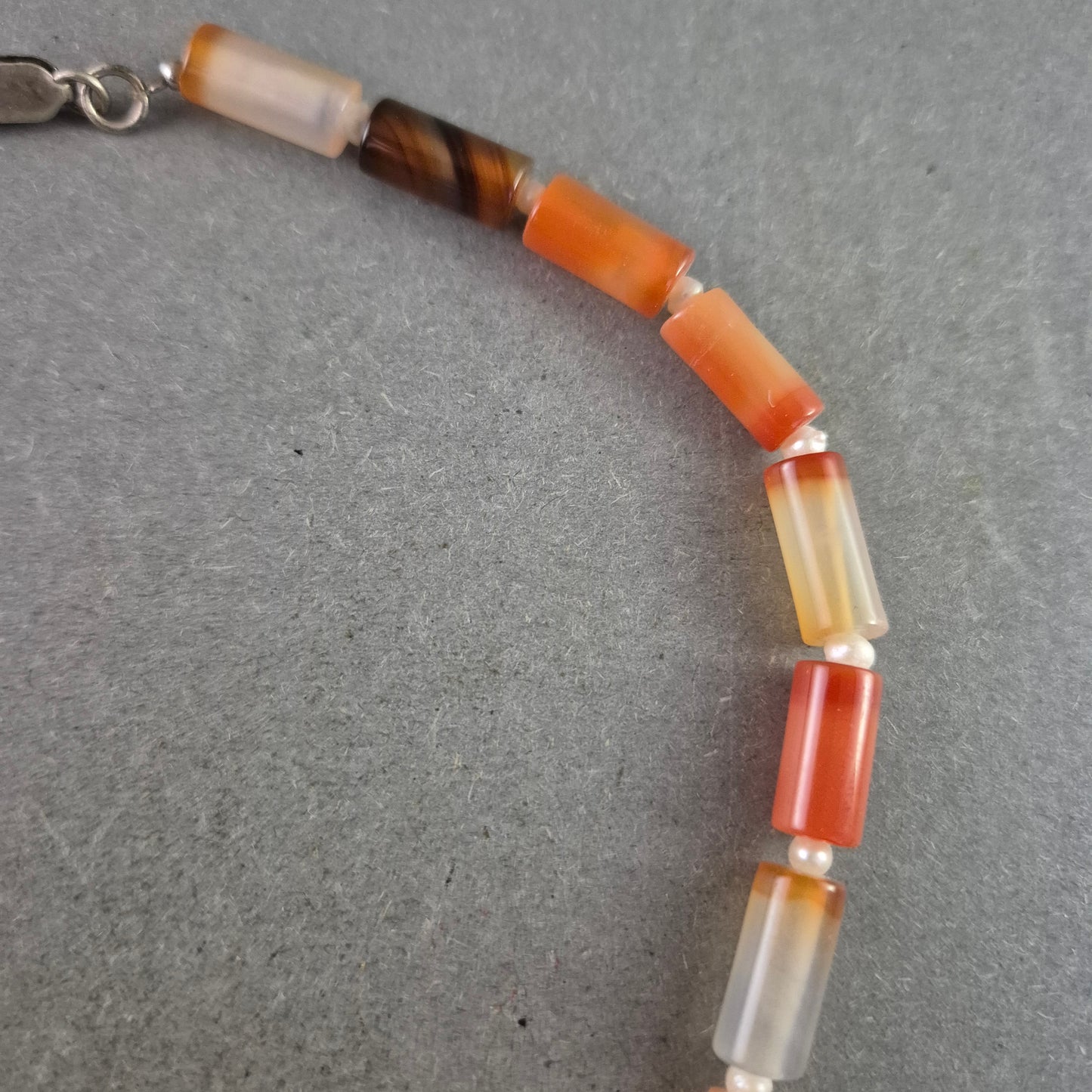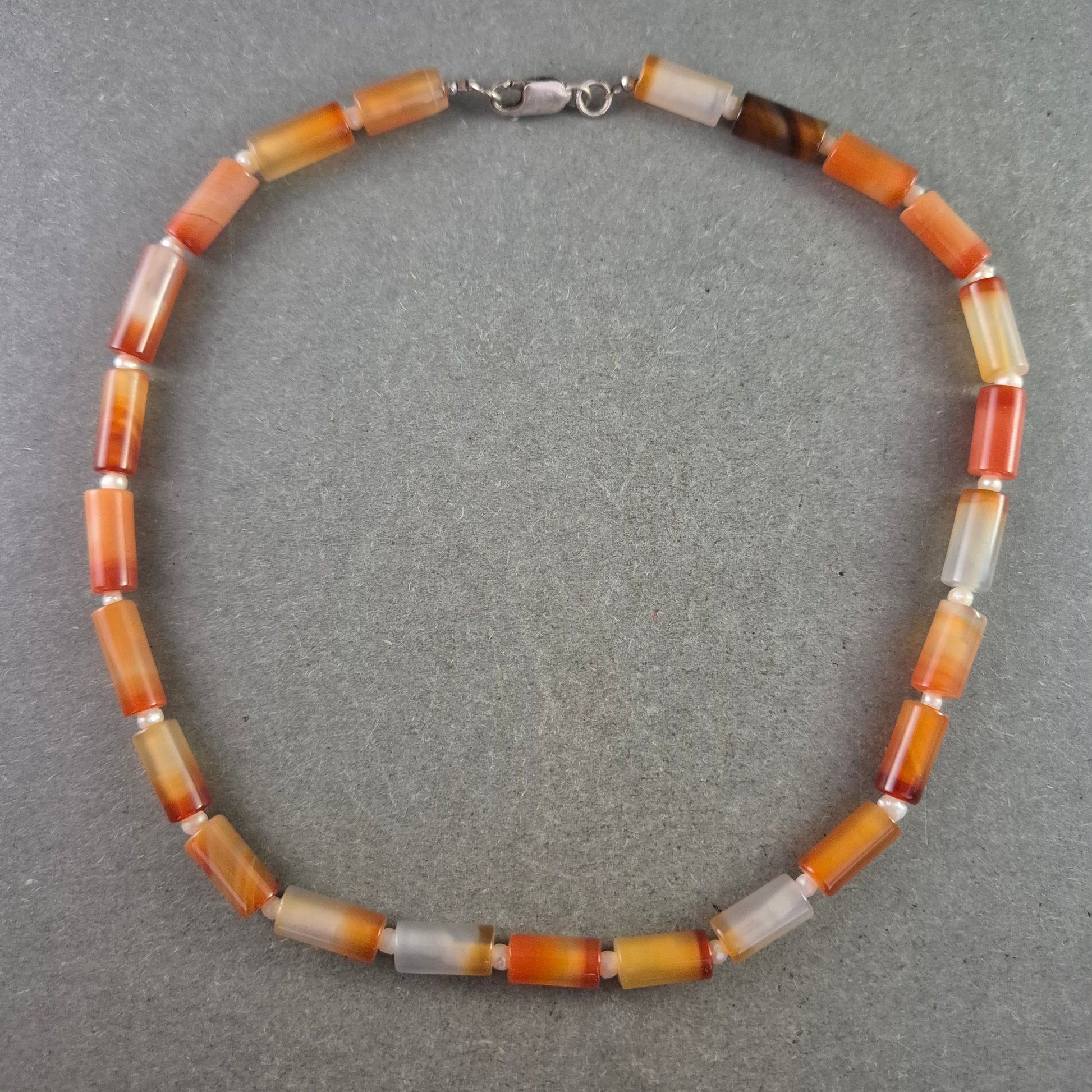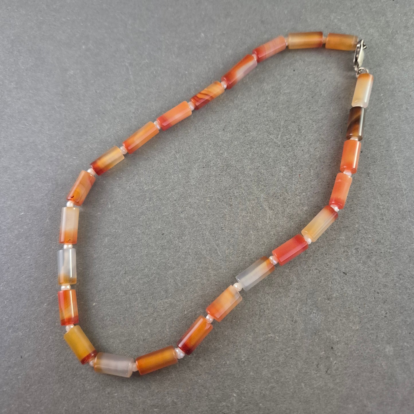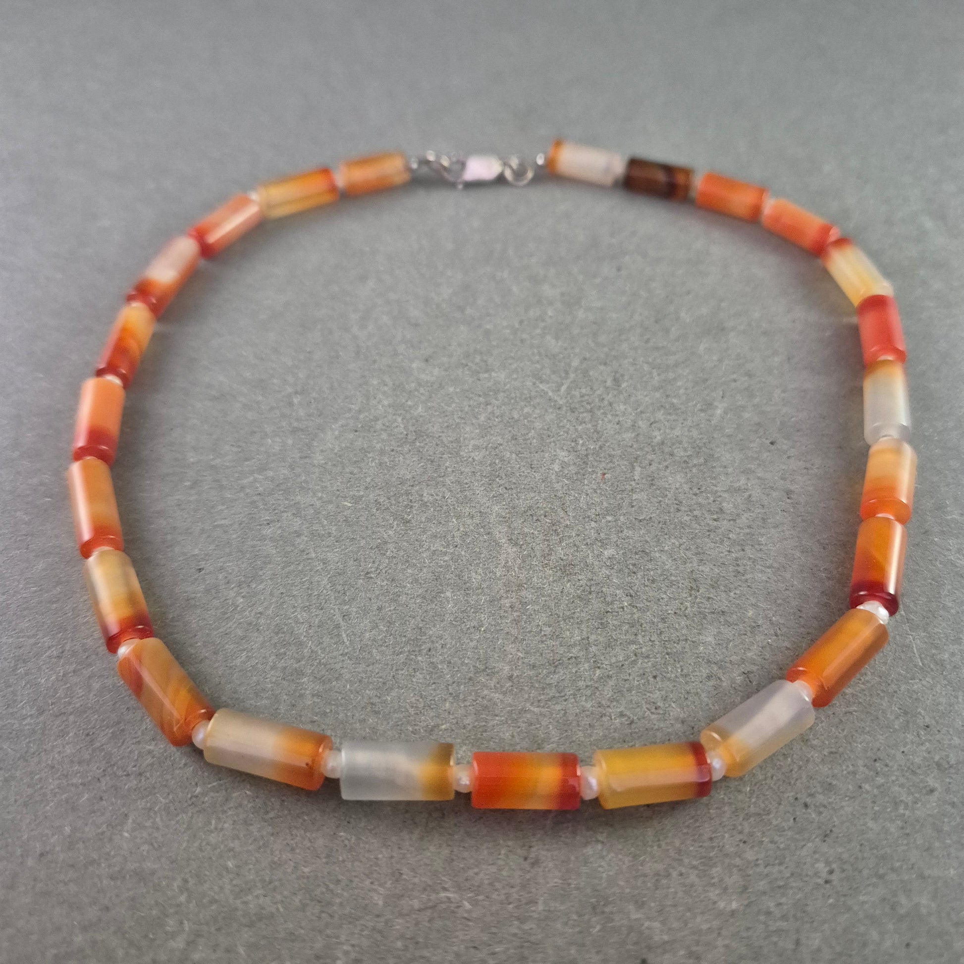 Eine elegante Halskette, die mit facettierten, zylindrischen Achatscheiben in warmen Orange-, Rot- und Weißtönen besetzt ist. Das harmonische Farbspiel und die sanften Facetten machen diese Kette zu einem besonderen Schmuckstück.