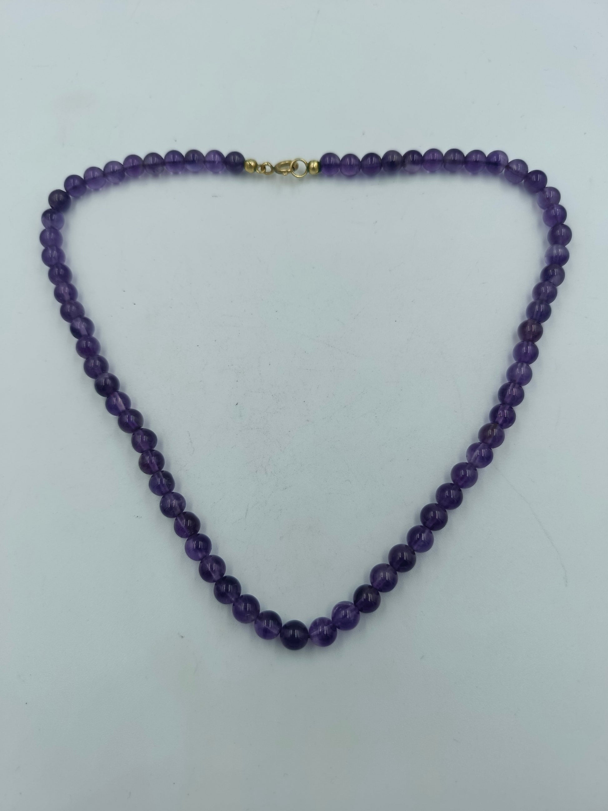 Diese edle Halskette besteht aus runden, violetten Amethystperlen, die für ihre beruhigende Wirkung und ihr elegantes Farbspiel bekannt sind. Die gleichmäßig geschliffenen Steine verleihen der Kette ein harmonisches Gesamtbild – ideal für festliche Anlässe oder als stilvolles Accessoire im Alltag.