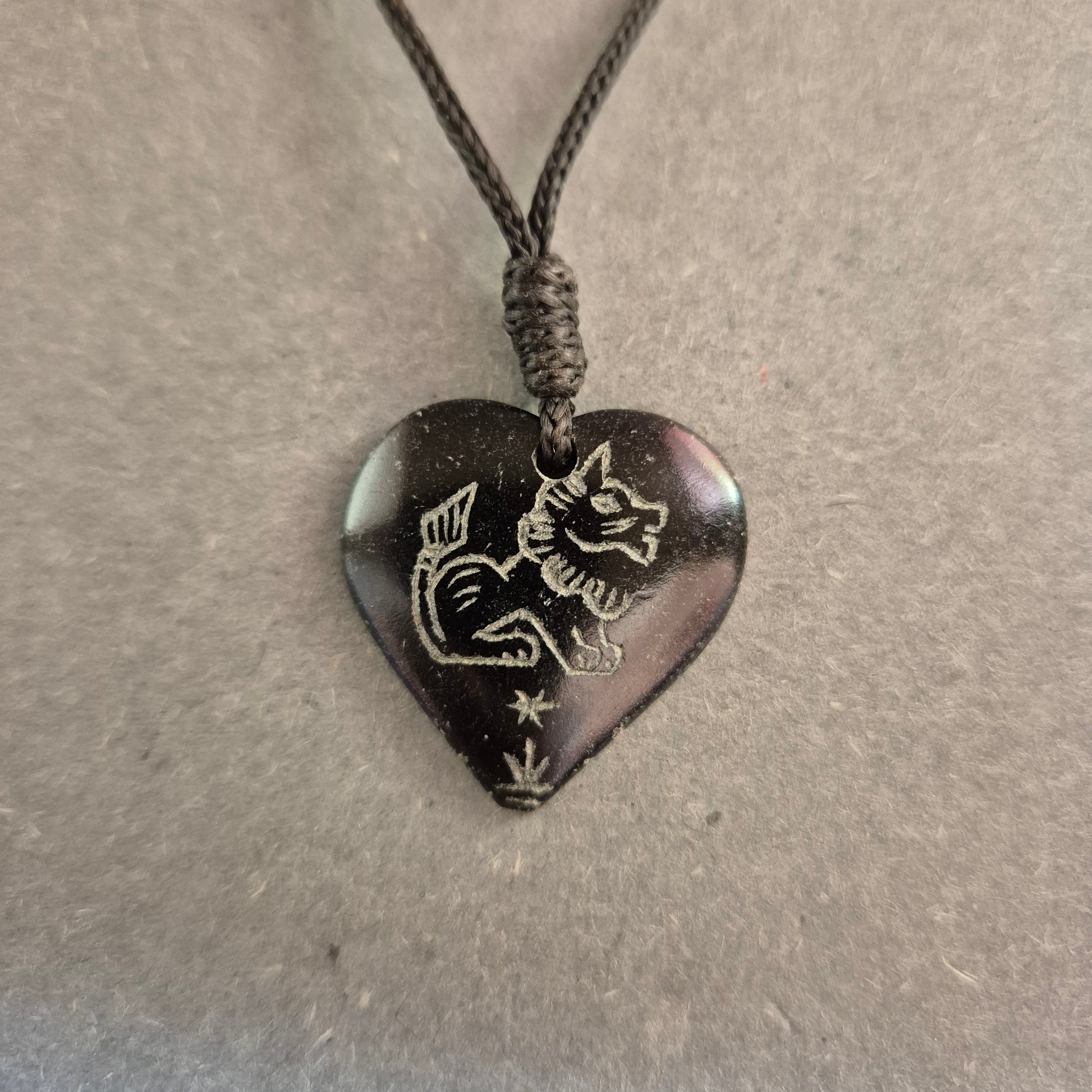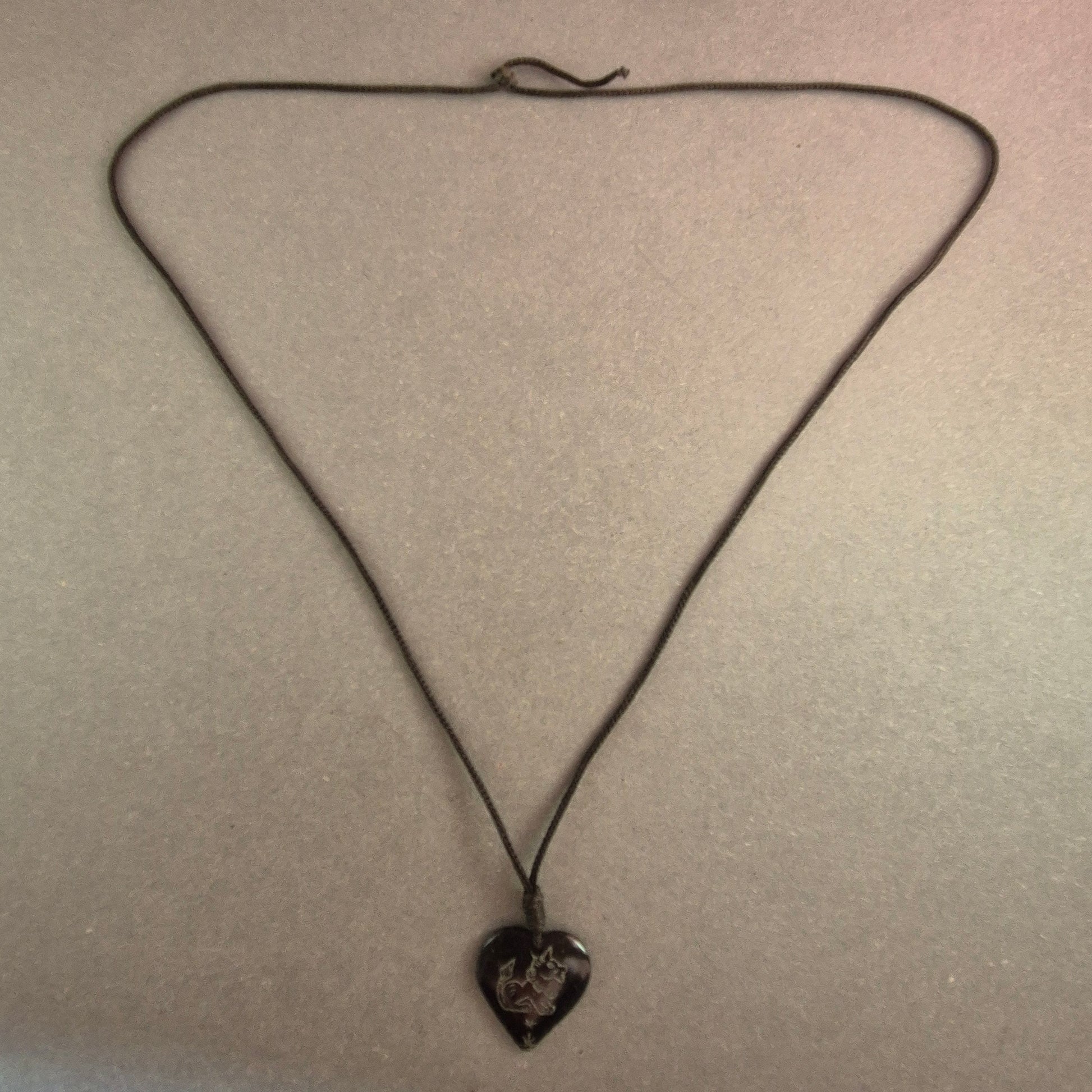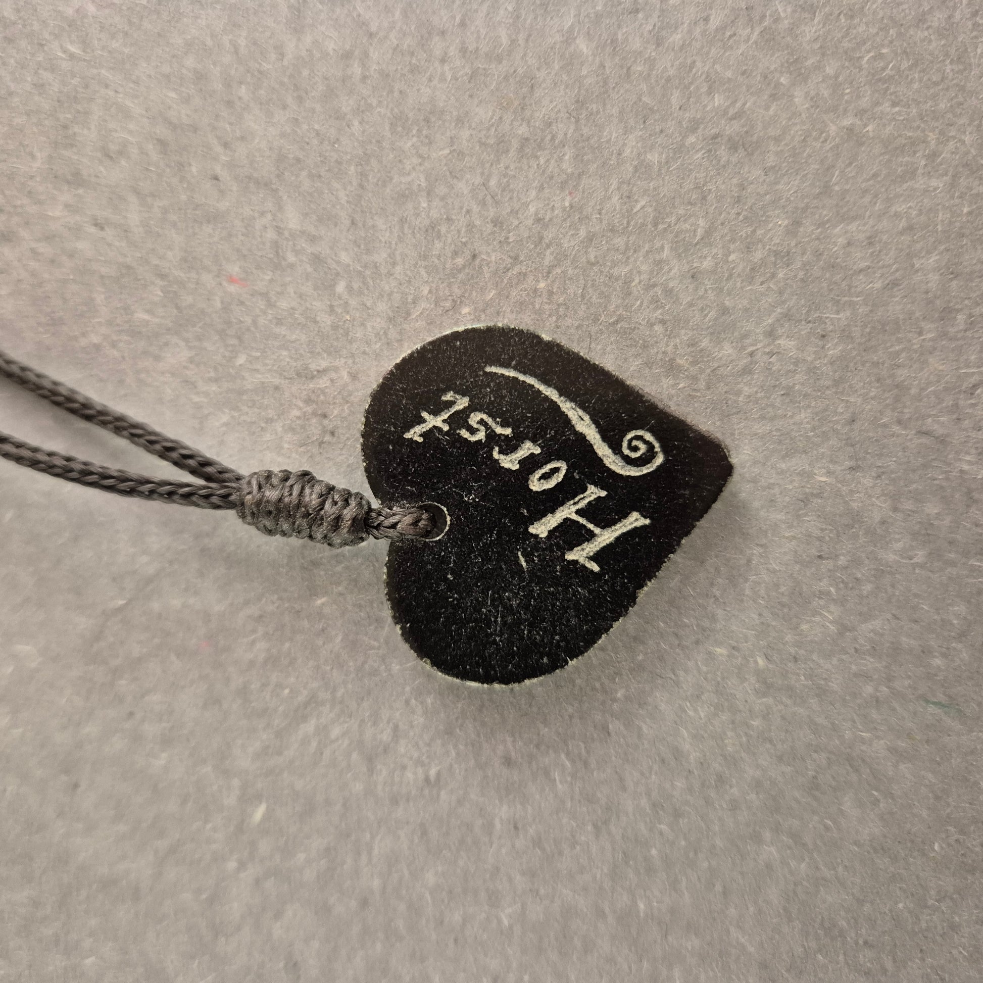 Diese einzigartige Halskette besticht durch ihren handgefertigten Look und die persönliche Note. Der herzförmige Anhänger aus dunklem Material ist mit einer Gravur verziert, die dem Schmuckstück eine rustikale und nostalgische Ausstrahlung verleiht. Das verstellbare schwarze Band sorgt für einen angenehmen Tragekomfort und macht die Kette zu einem individuellen Accessoire mit besonderer Bedeutung.