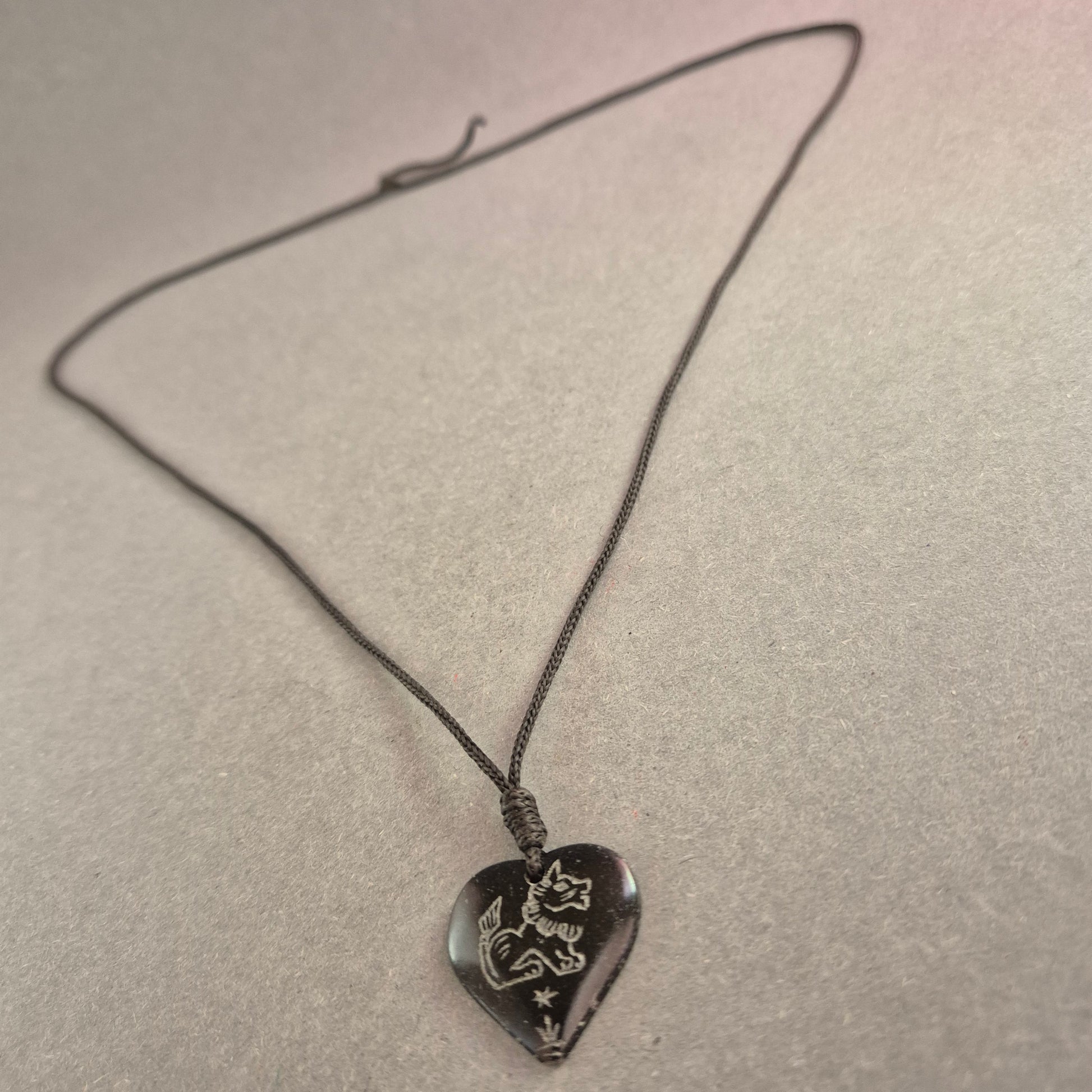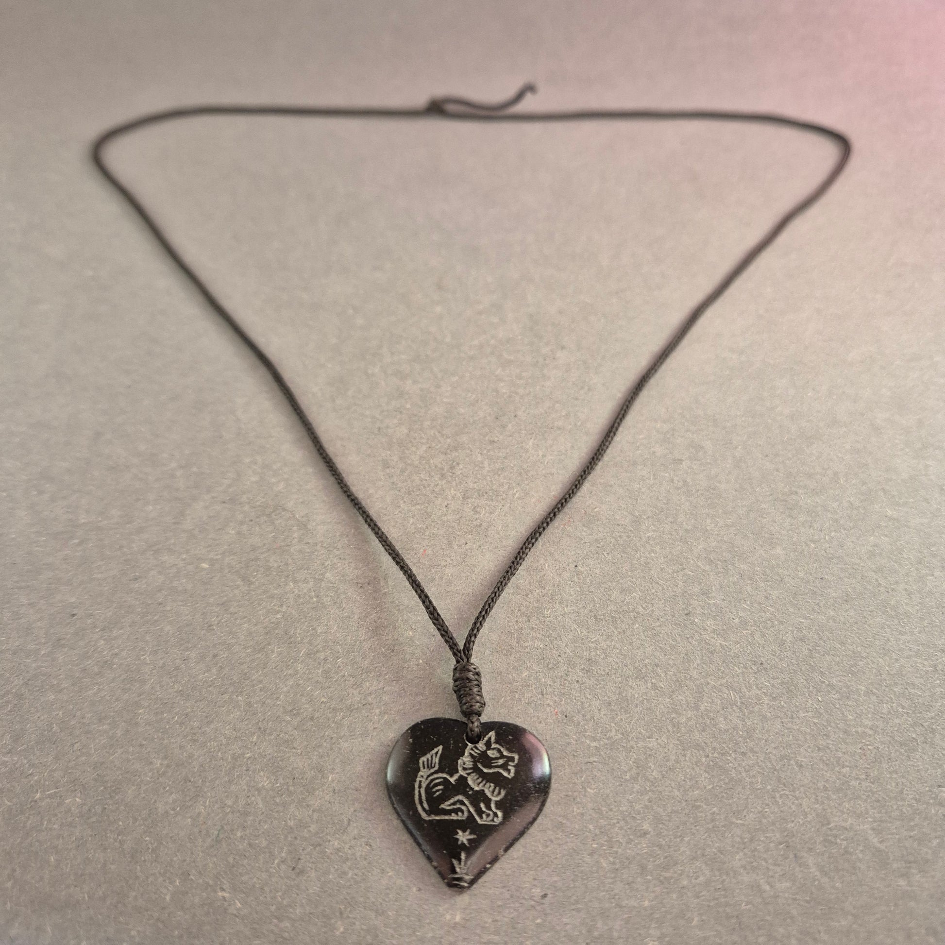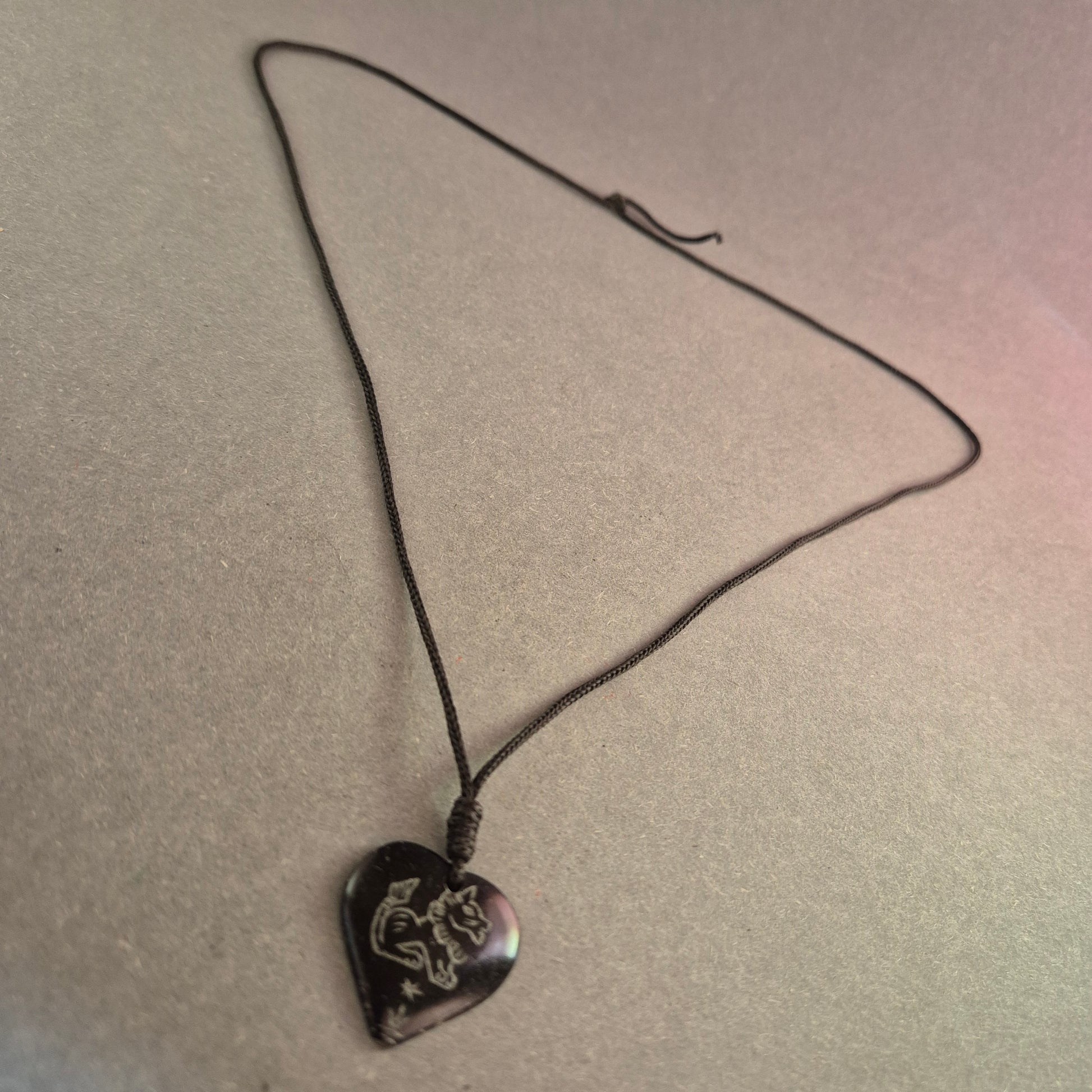 Diese einzigartige Halskette besticht durch ihren handgefertigten Look und die persönliche Note. Der herzförmige Anhänger aus dunklem Material ist mit einer Gravur verziert, die dem Schmuckstück eine rustikale und nostalgische Ausstrahlung verleiht. Das verstellbare schwarze Band sorgt für einen angenehmen Tragekomfort und macht die Kette zu einem individuellen Accessoire mit besonderer Bedeutung.