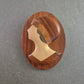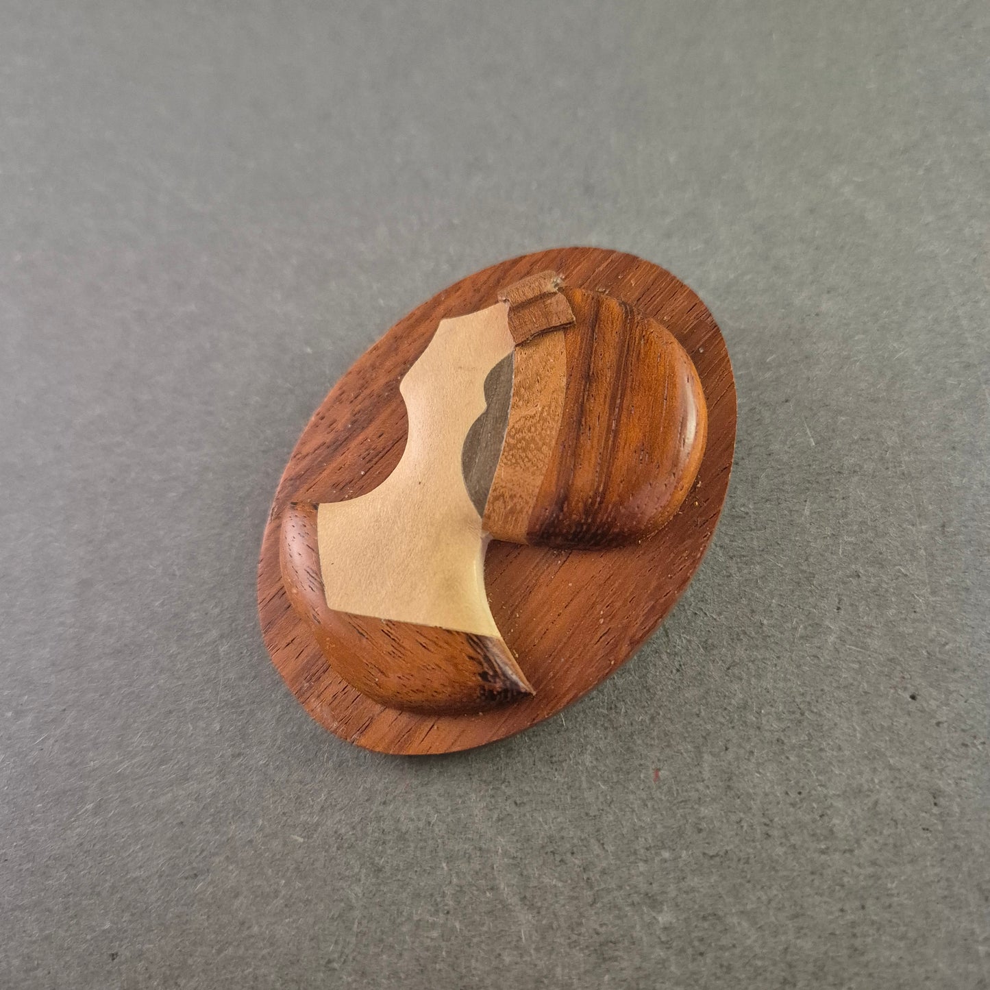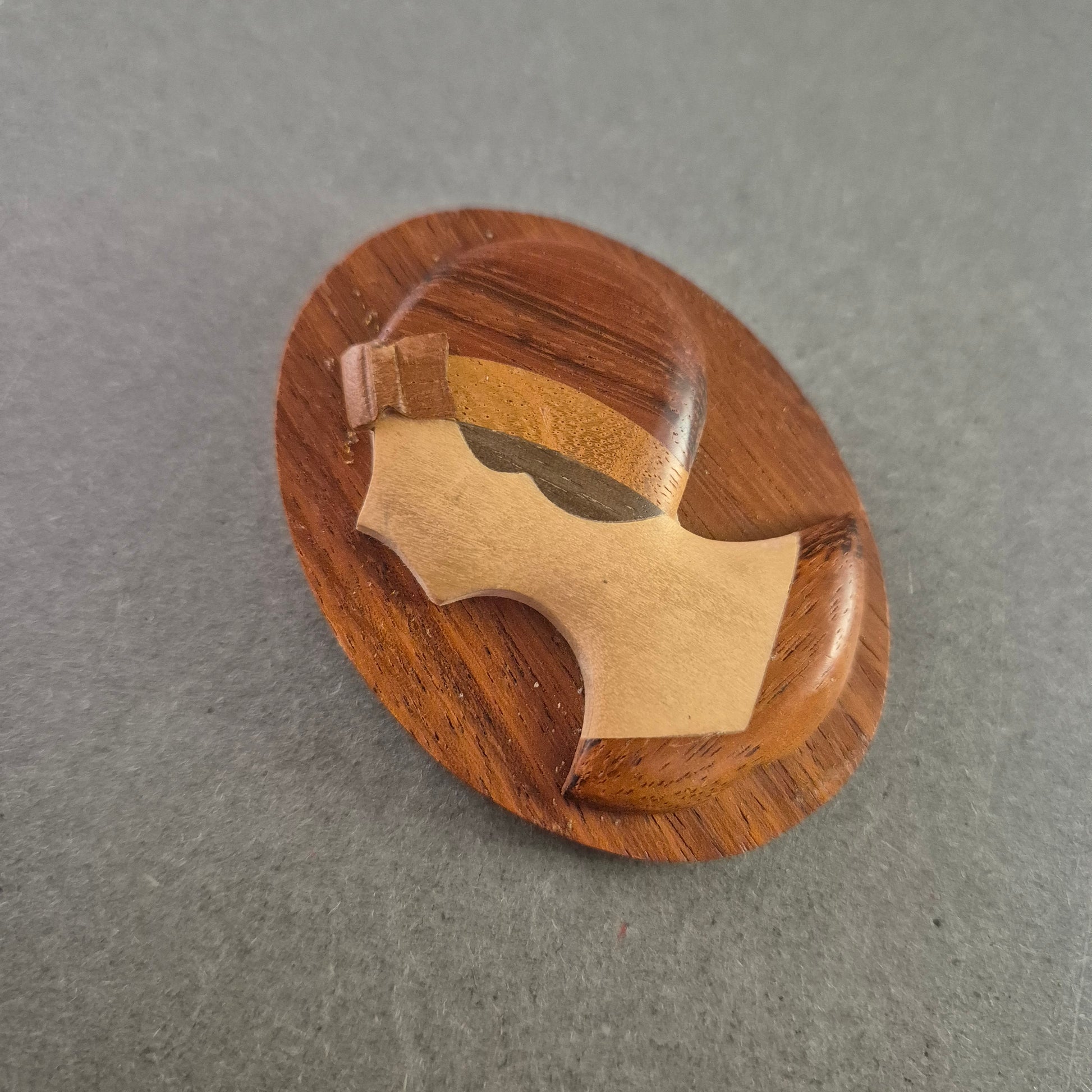 Diese außergewöhnliche Brosche aus verschiedenen Holzarten zeigt eine stilisierte Frauen-Silhouette im Profil. Das Motiv ist kunstvoll in Intarsientechnik gearbeitet und hebt sich in Kontrastfarben vom runden Träger ab. Ein einzigartiges Accessoire für Liebhaber natürlicher Materialien und individueller Statement-Stücke – ideal zu Leinen, Wolle oder anderen Naturstoffen.