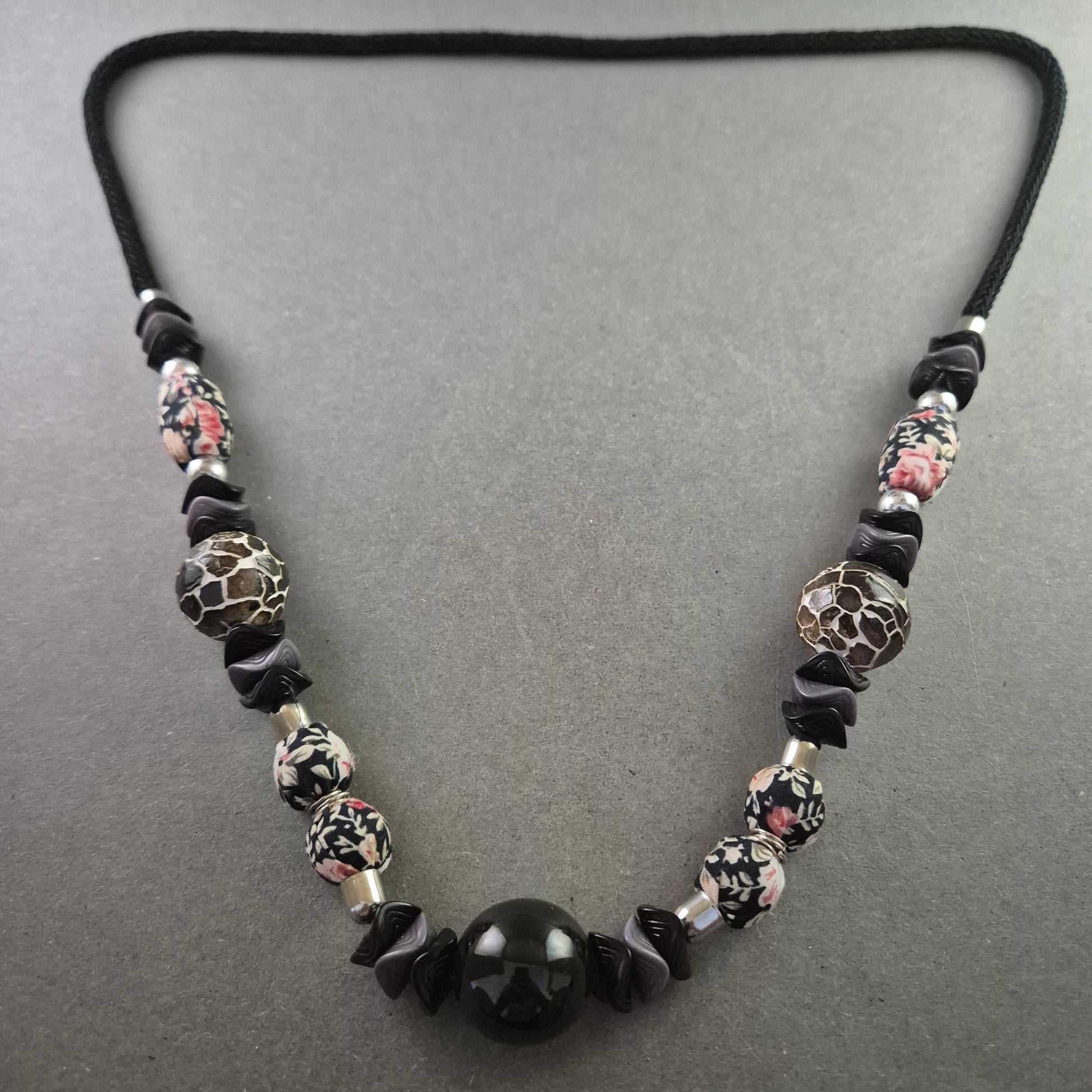 Diese kunstvoll gestaltete Statement-Kette verbindet florale Romantik mit exotischem Flair. Schwarze Stoffkordeln tragen ein Arrangement aus handverzierten Perlen in Blumenmuster, ergänzt durch auffällige, tierfellartige Kugeln sowie eine große zentrale schwarze Glaskugel. Die harmonische Farbkomposition aus Schwarz, Rosa und Beige macht dieses Stück zum idealen Accessoire für kreative Looks oder schlichte Outfits mit einem Hauch Extravaganz.