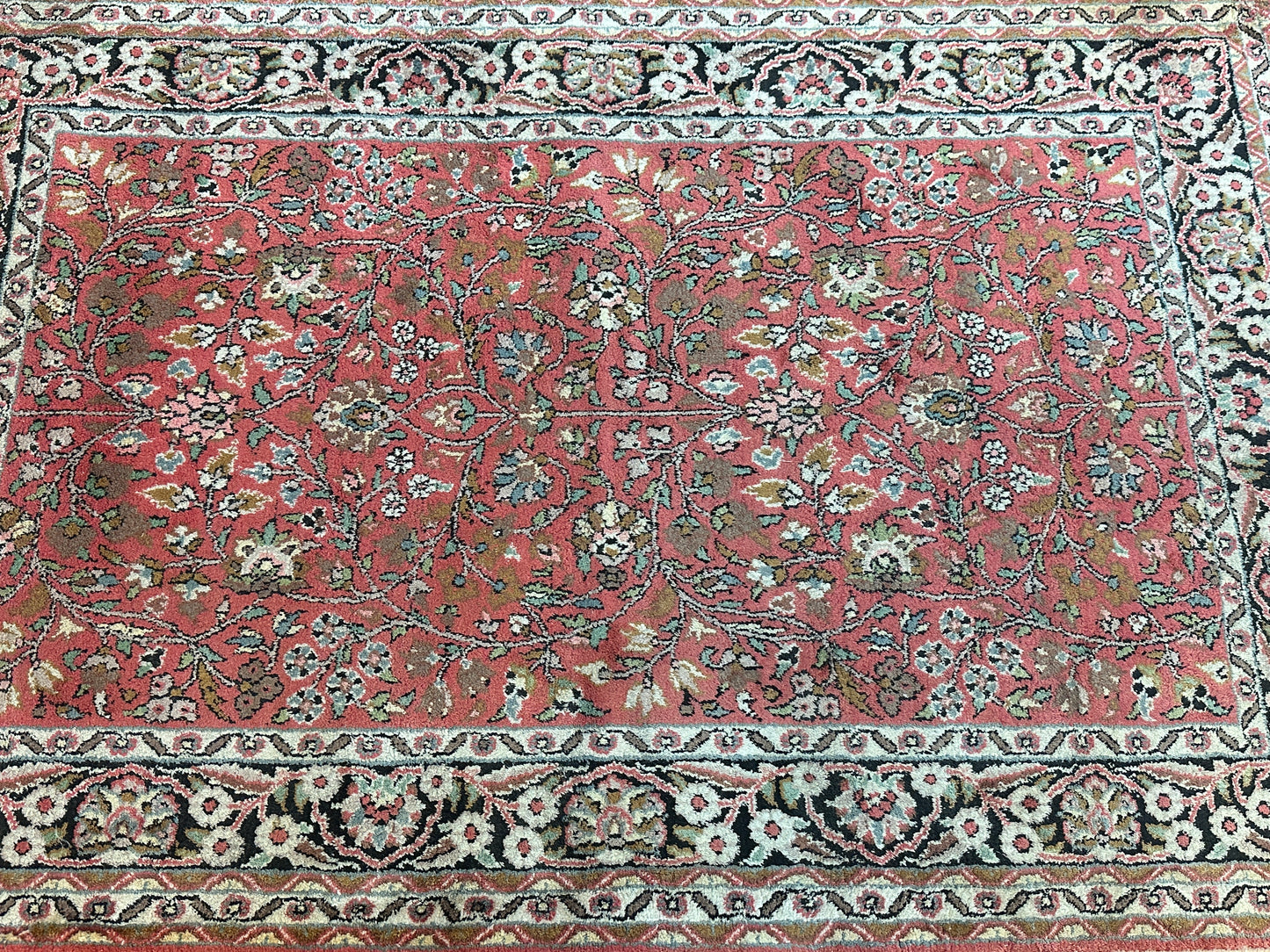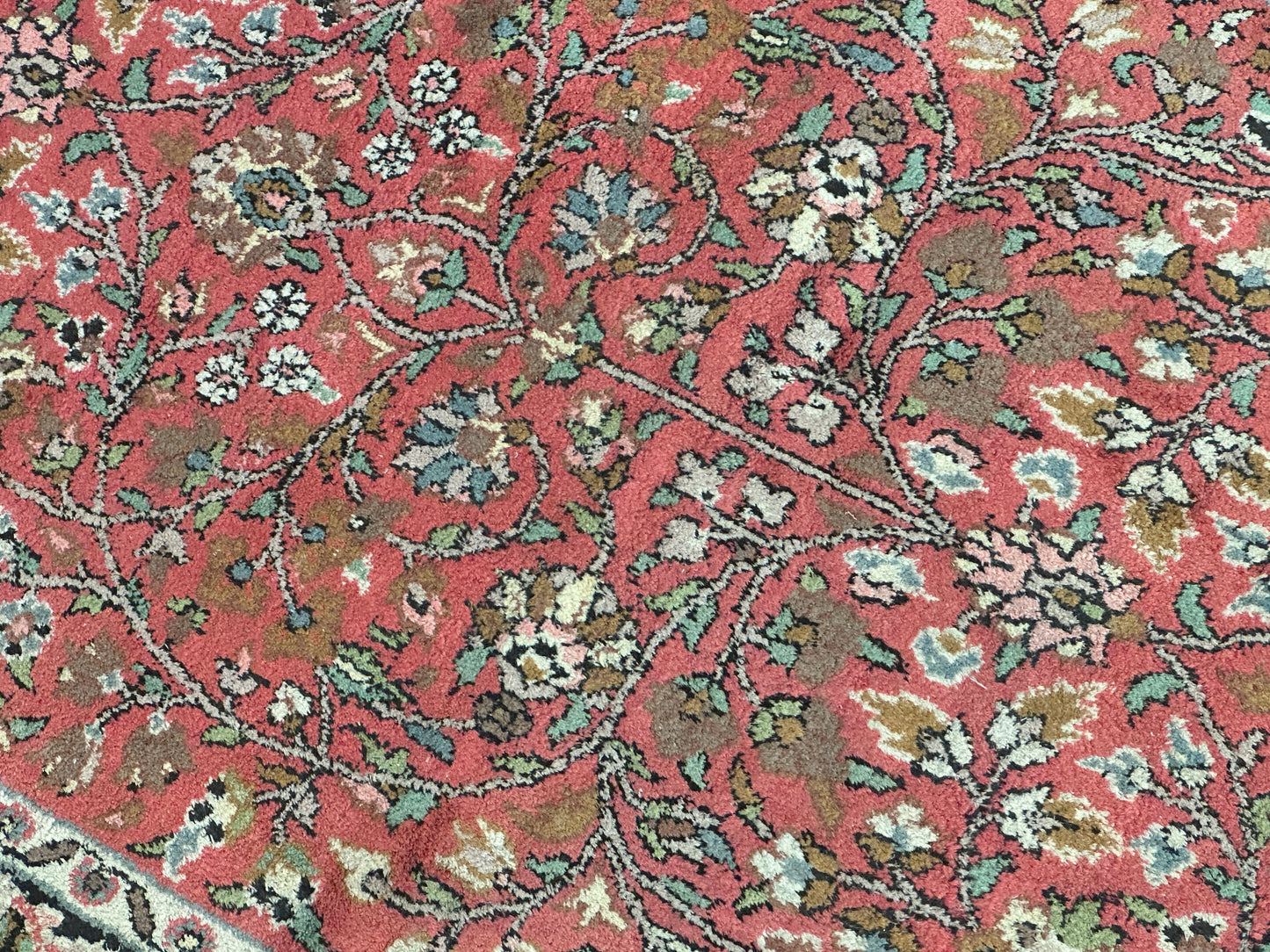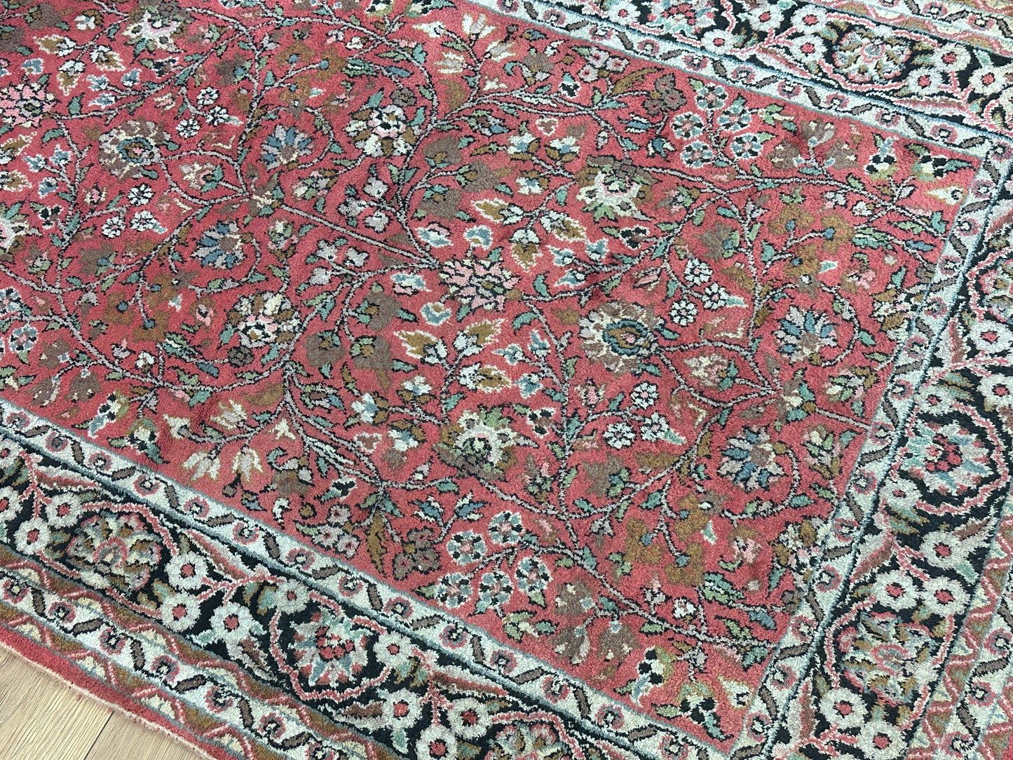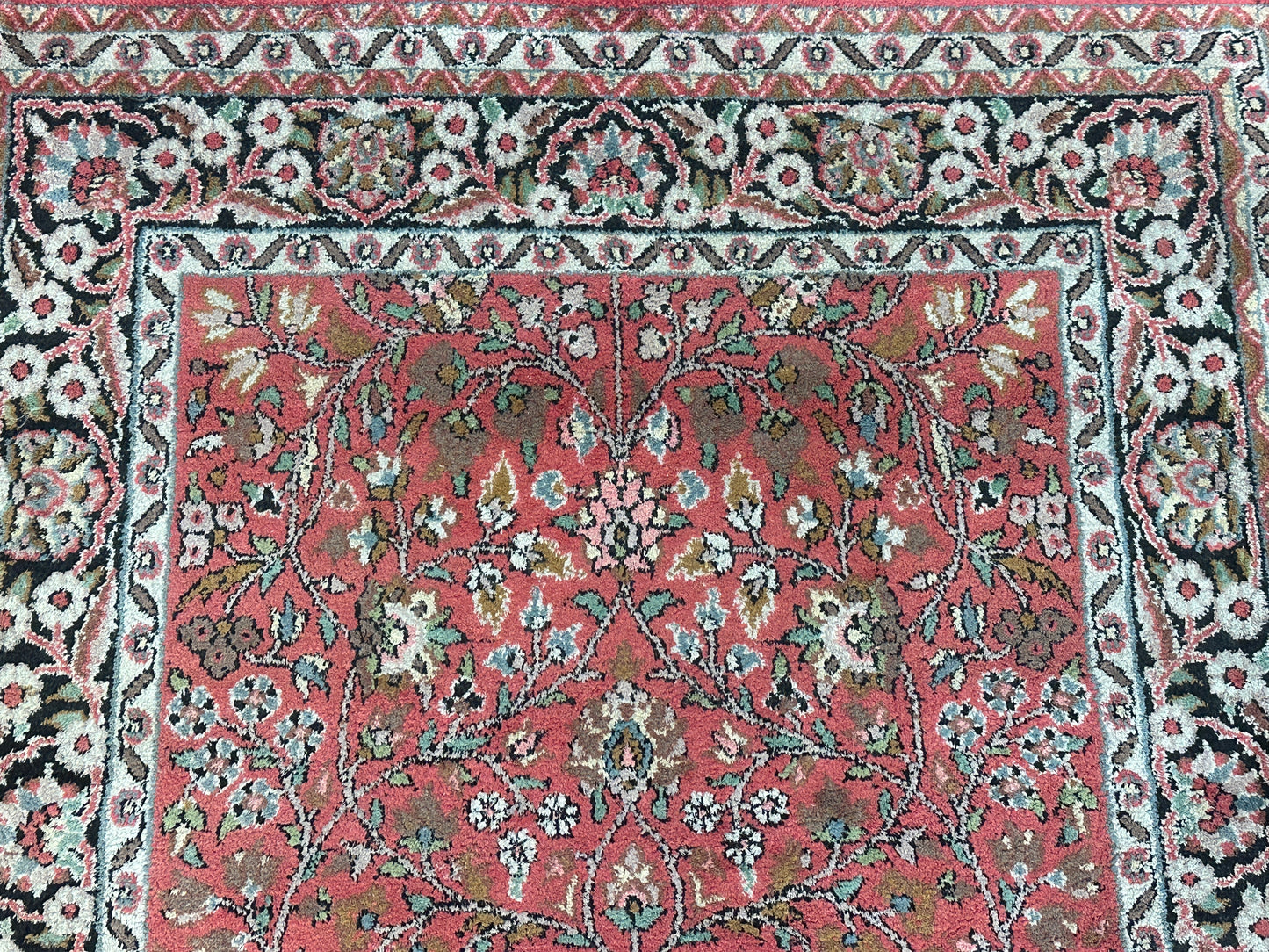 • Zustand gut: Dieser Teppich befindet sich in einem guten Zustand, was auf seine hochwertige Verarbeitung und Pflege hinweist. Die geschickte Kombination von Kaschmir und Seide macht ihn zu einem besonderen Schmuckstück.
